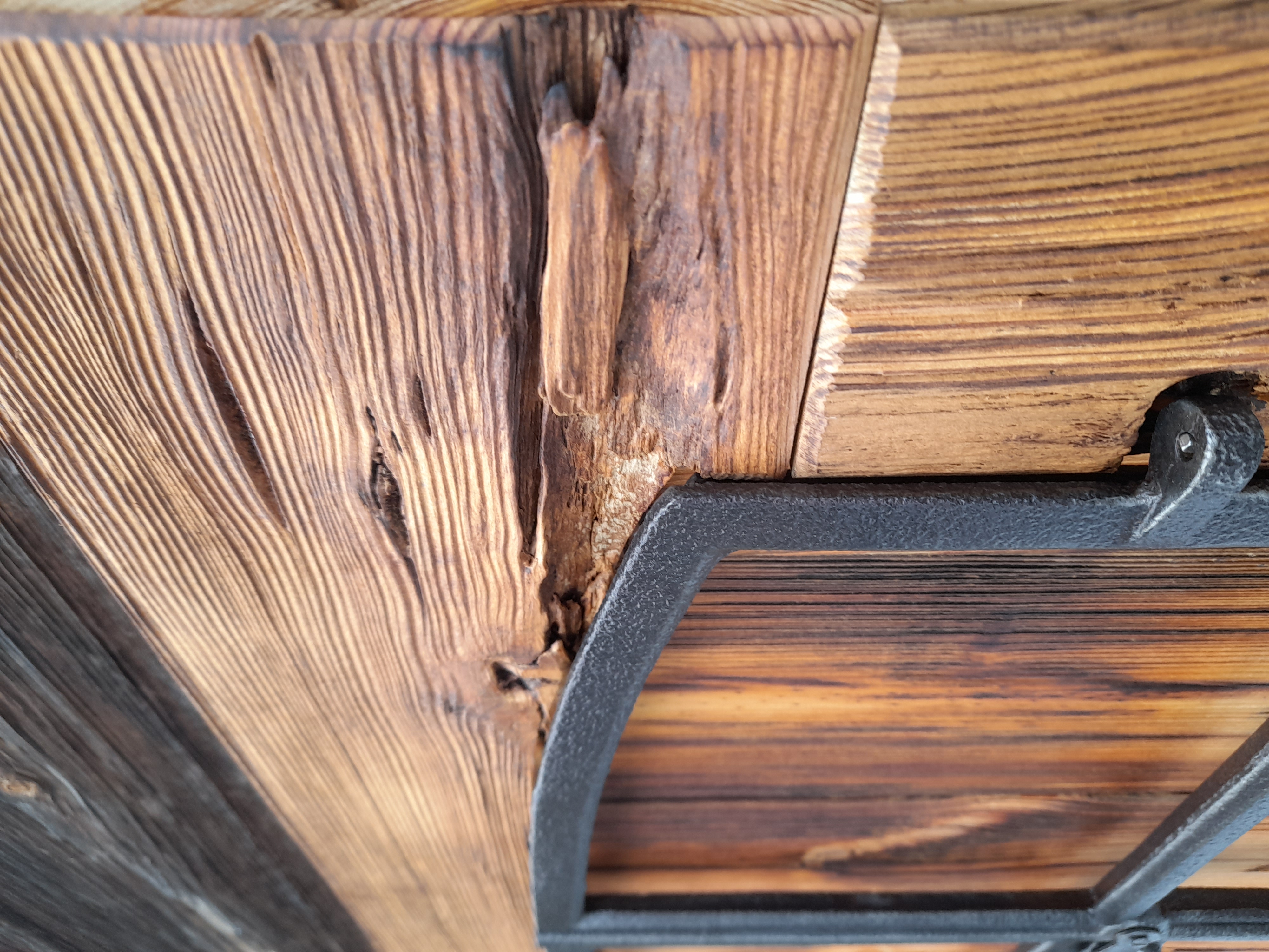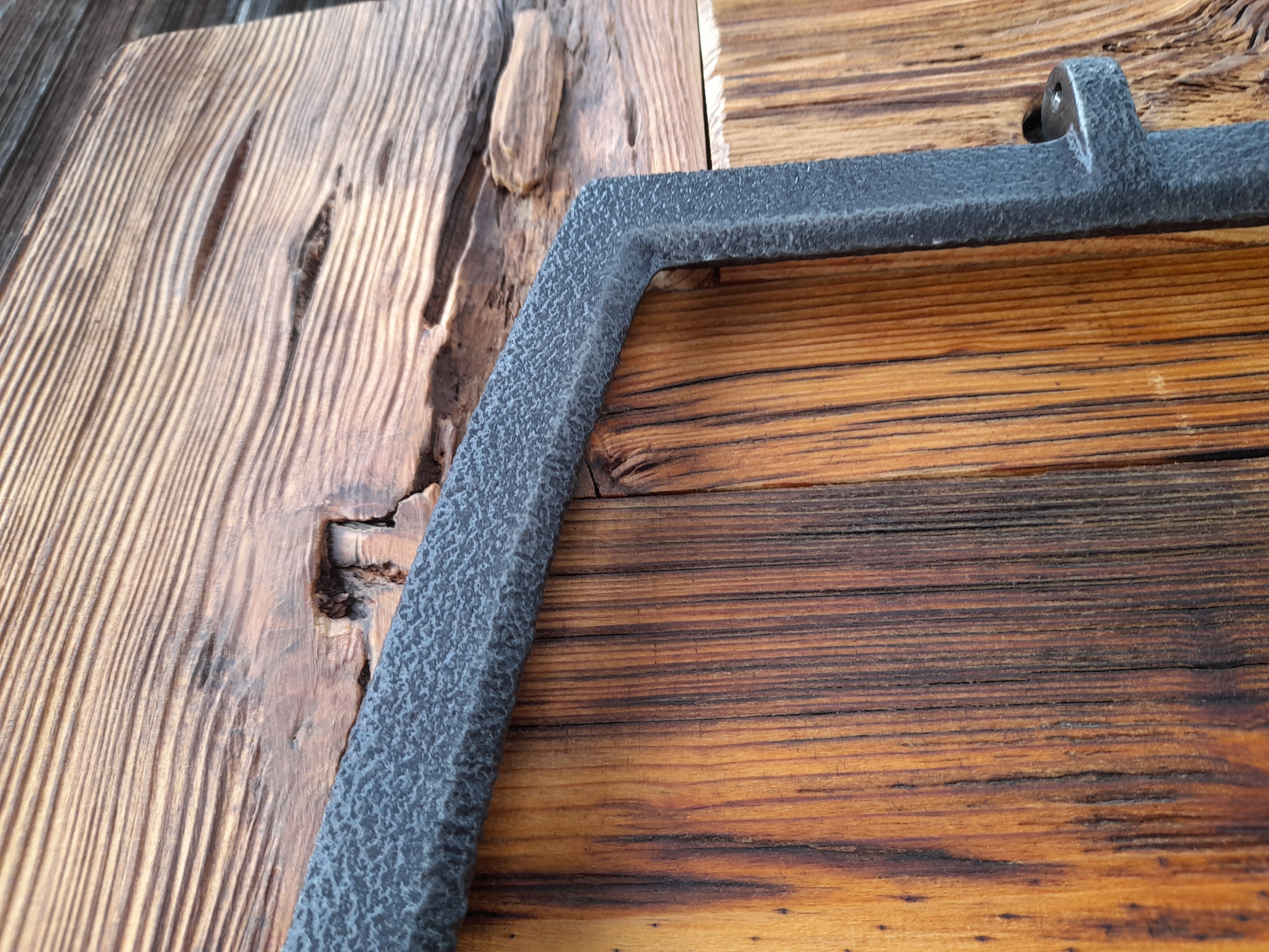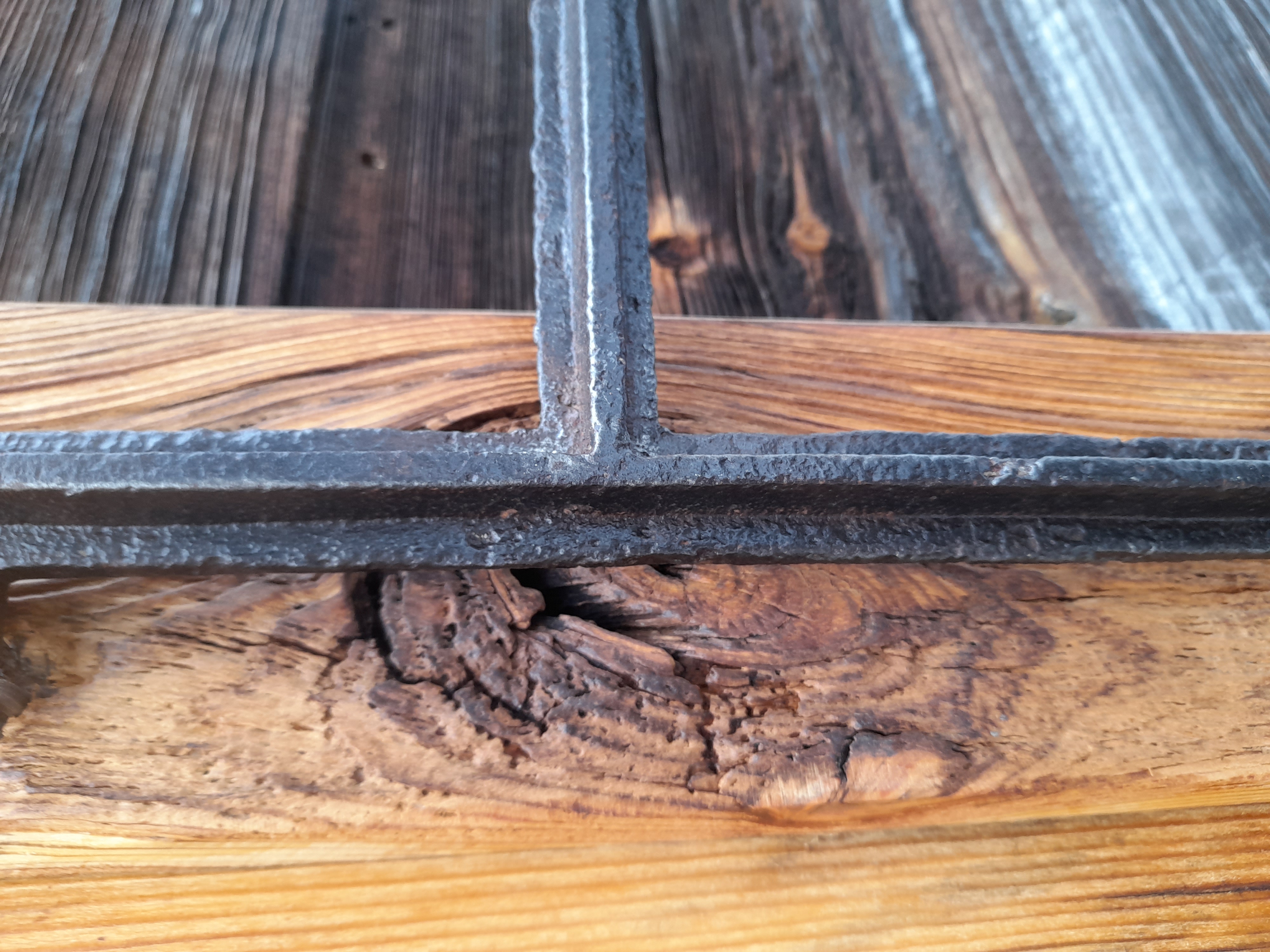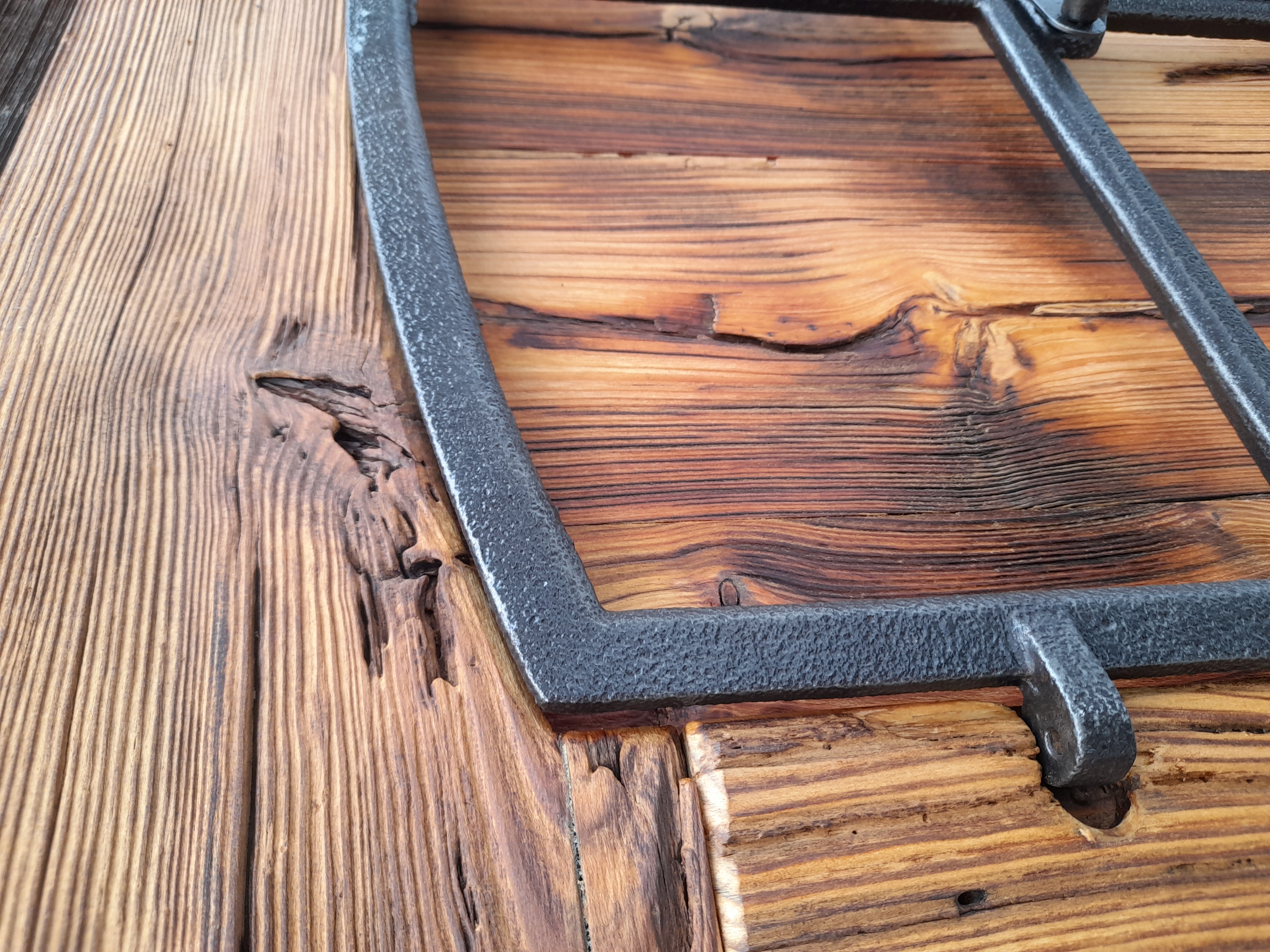 Solidna żeliwna rama została połączona z naturalnym, starym drewnem, zachowując jego unikalną strukturę, słoje, pęknięcia i ślady czasu. Zarówno drewno, jak i żeliwna rama zostały dokładnie oczyszczone, a następnie odpowiednio zabezpieczone, aby podkreślić ich autentyczny charakter.