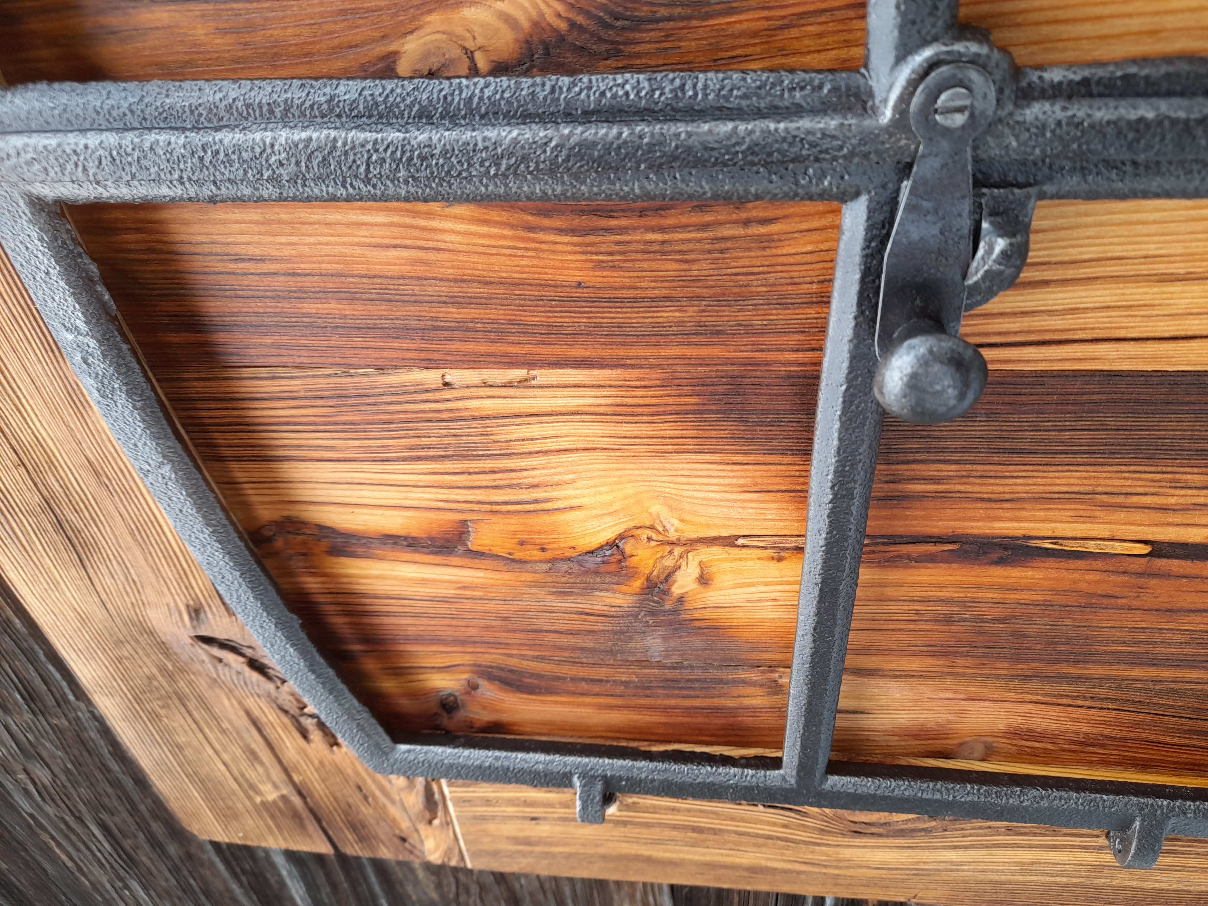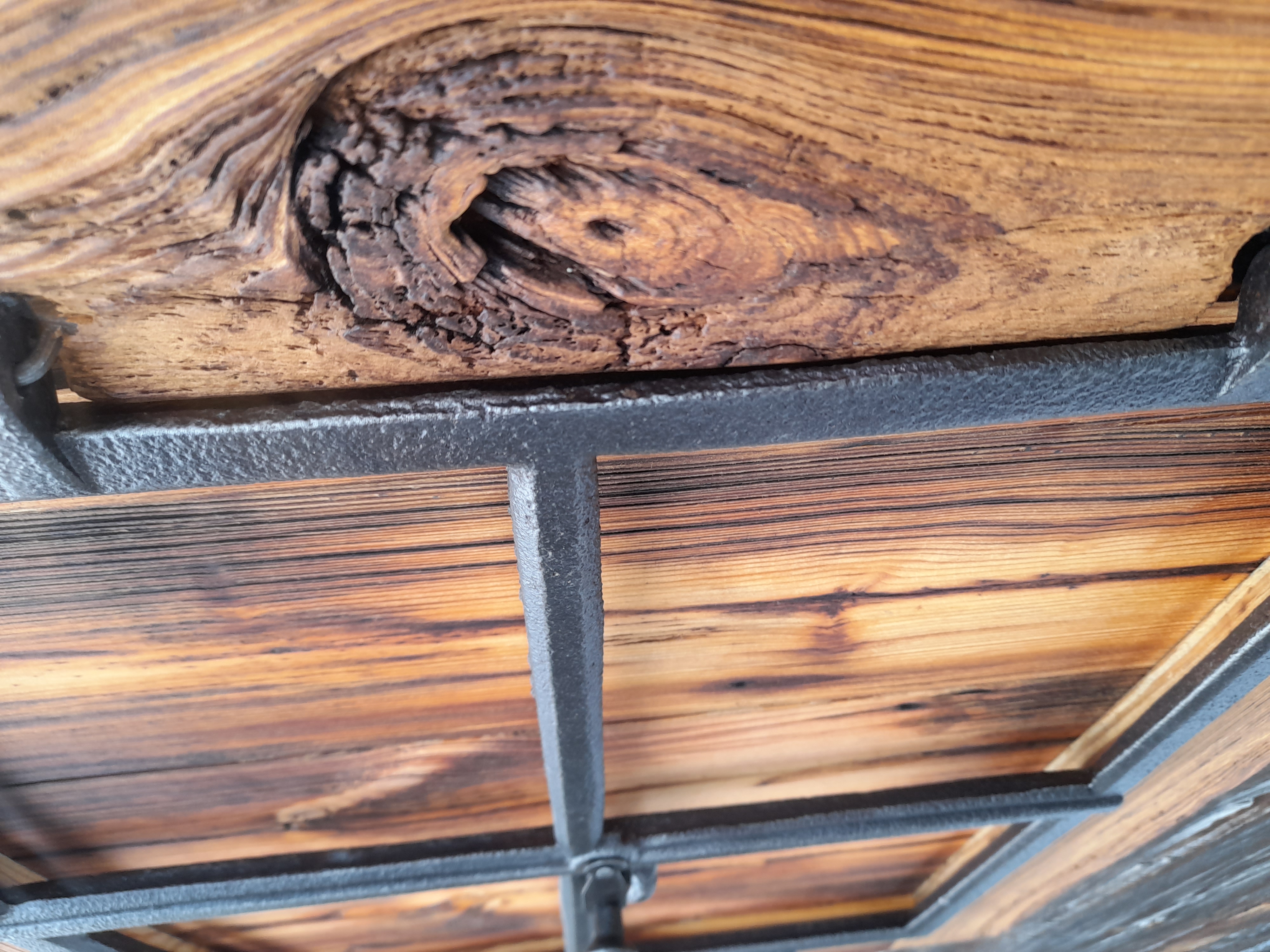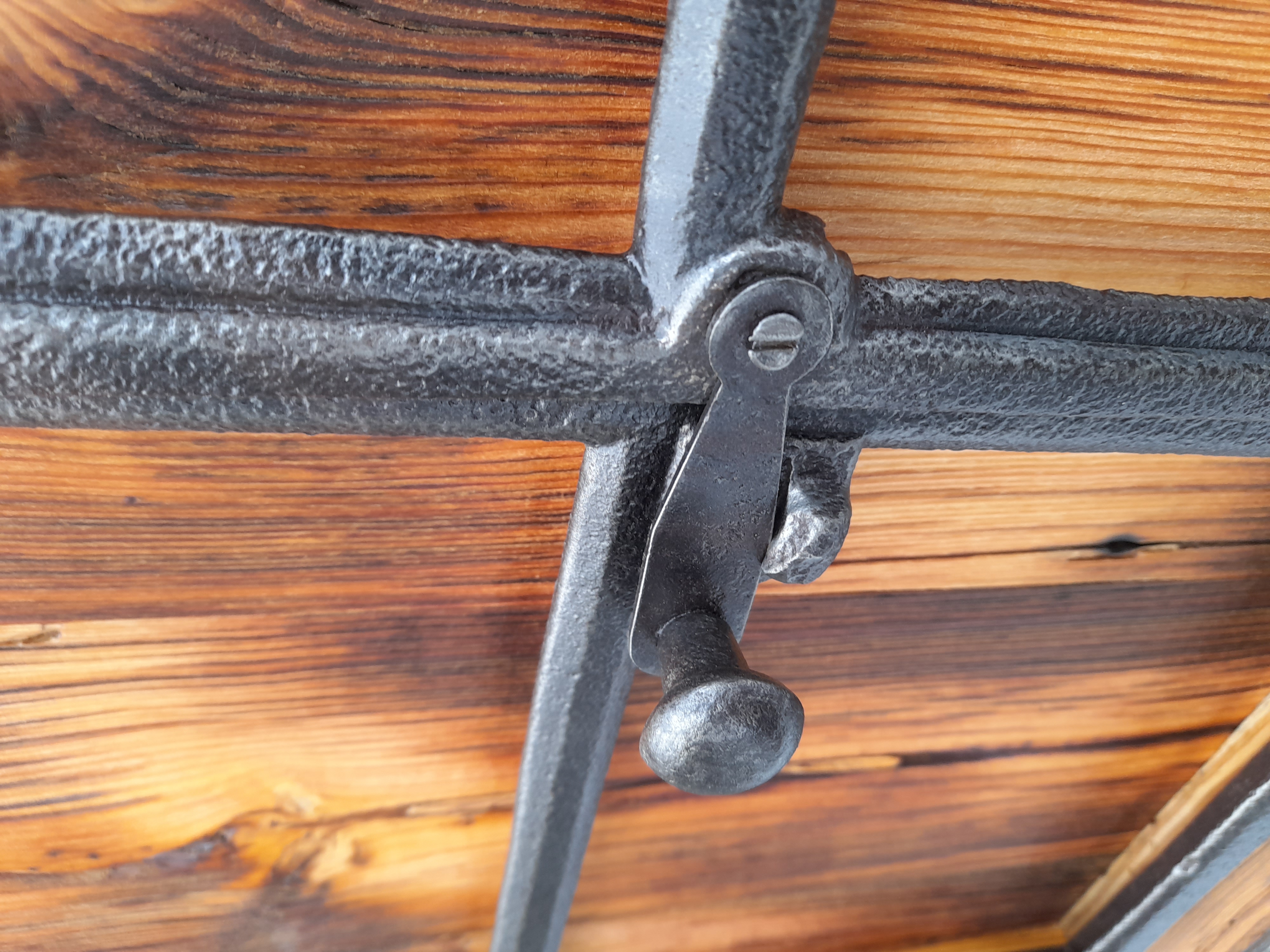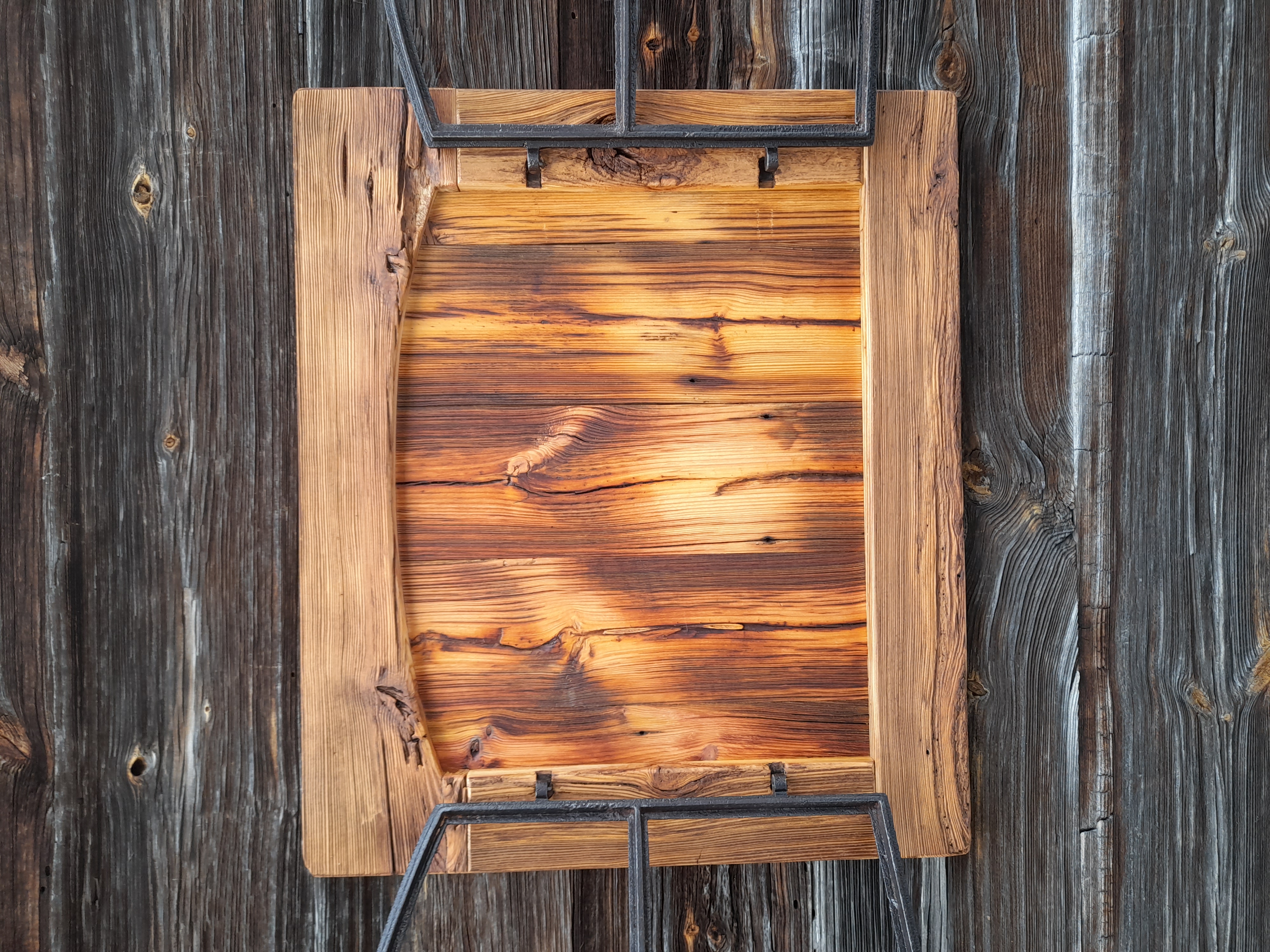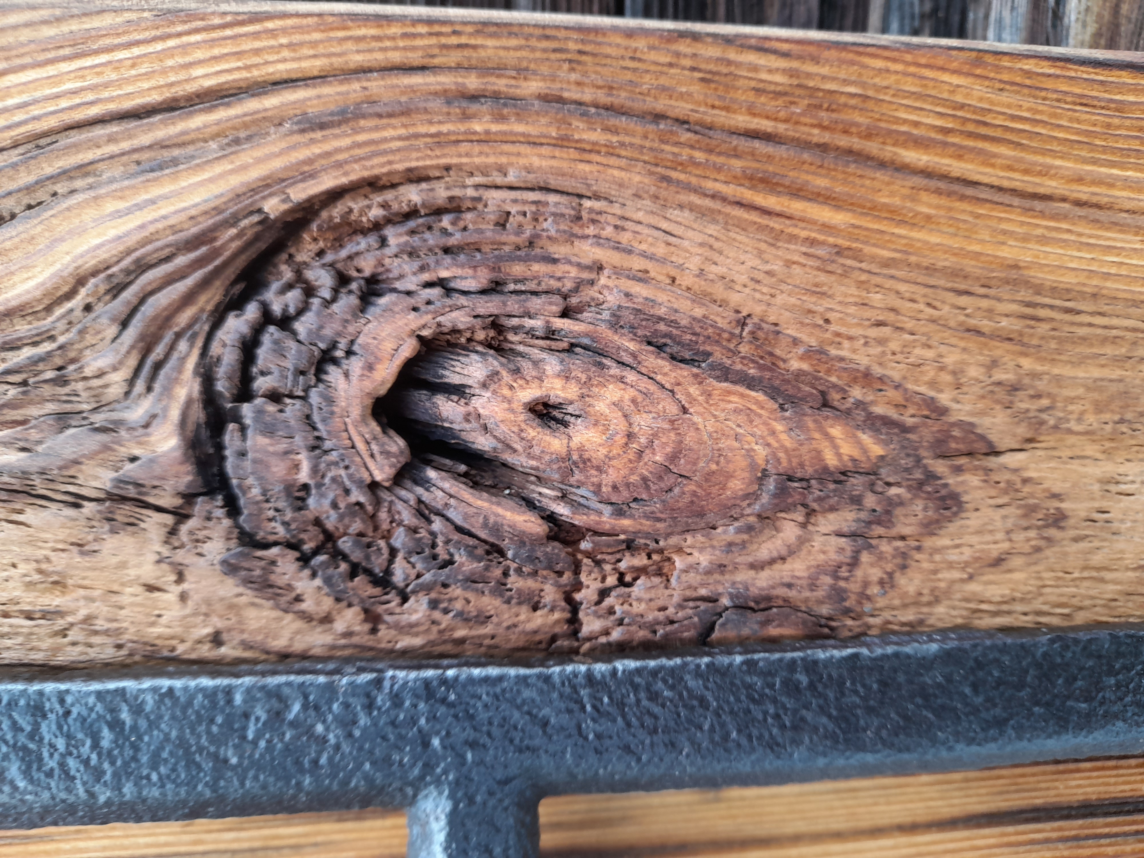 Solidna żeliwna rama została połączona z naturalnym, starym drewnem, zachowując jego unikalną strukturę, słoje, pęknięcia i ślady czasu. Zarówno drewno, jak i żeliwna rama zostały dokładnie oczyszczone, a następnie odpowiednio zabezpieczone, aby podkreślić ich autentyczny charakter.