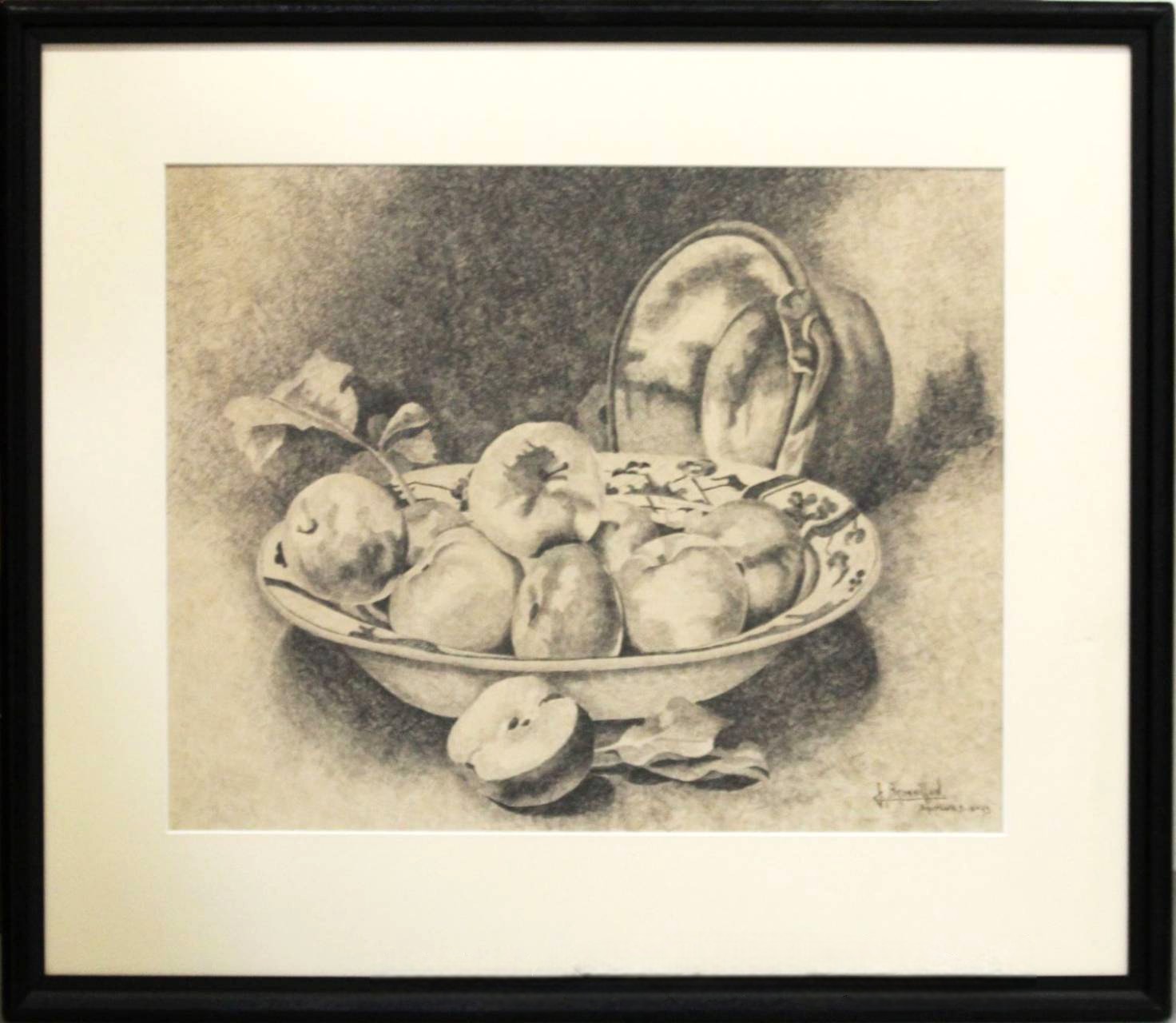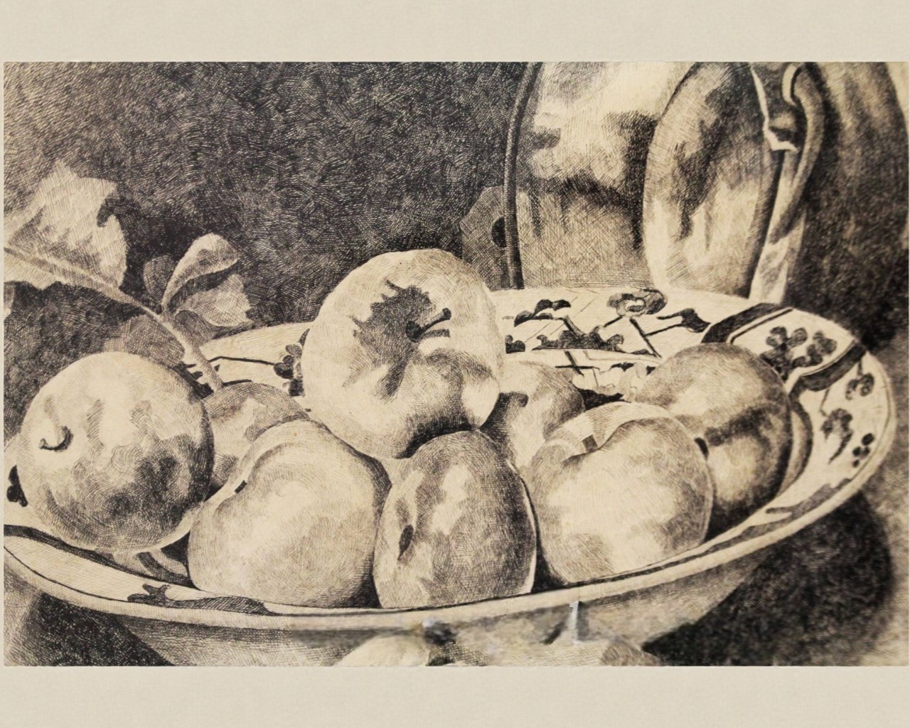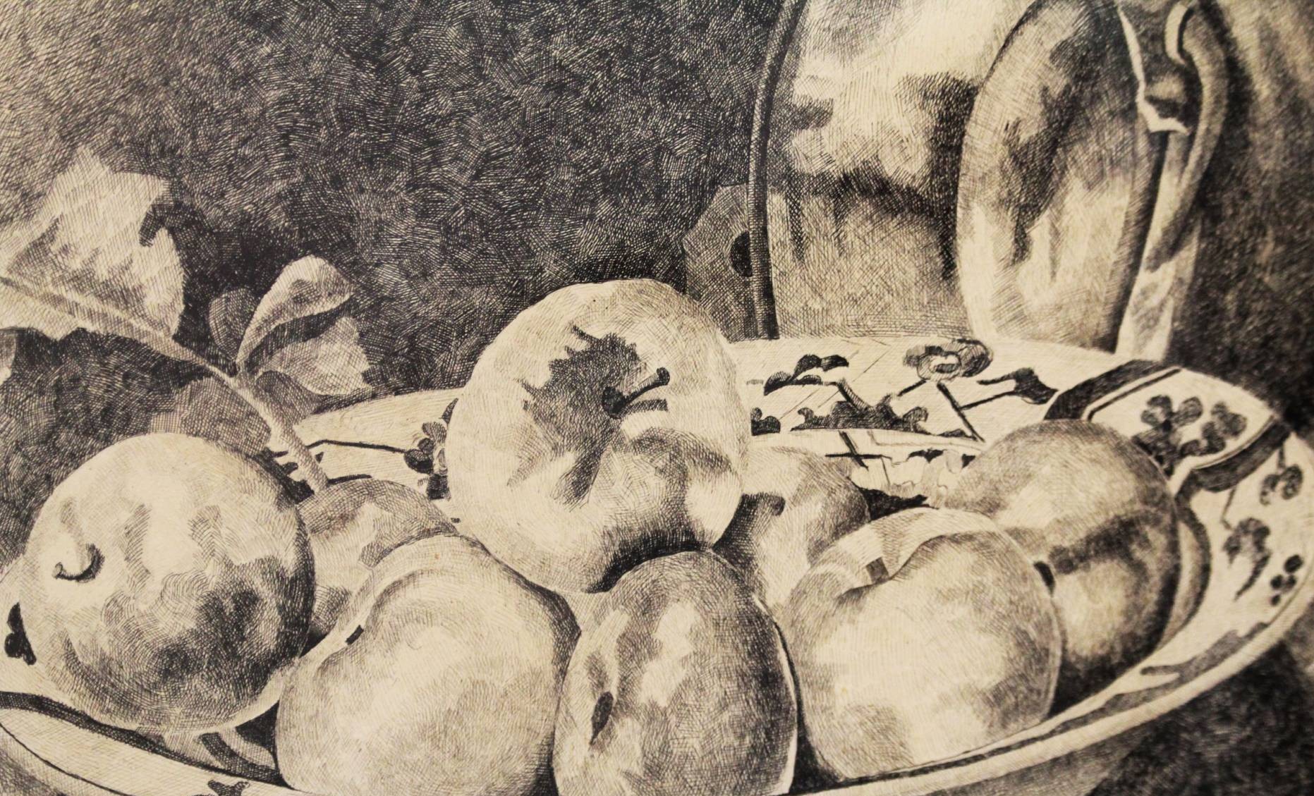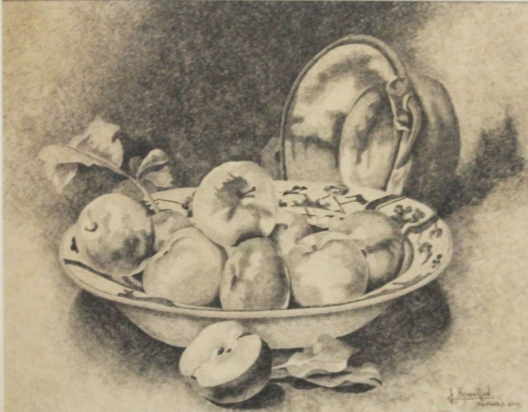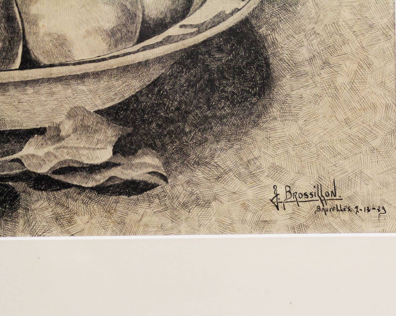 Rysunek piórkiem martwa natura - owoce w misie, podpisana J. Brossillon Bruxelles datowanie 7/12/29
