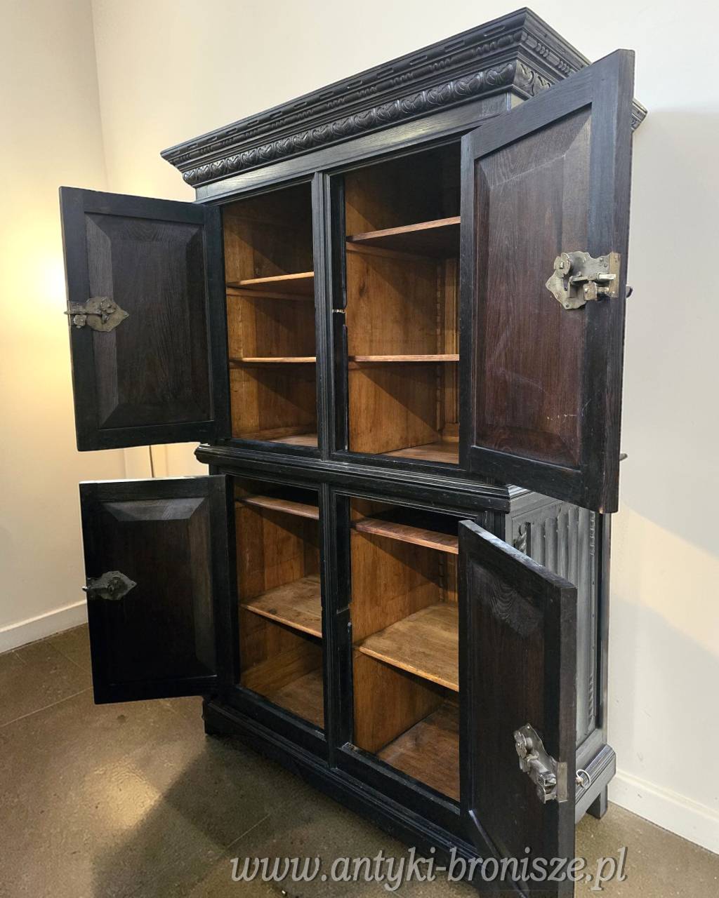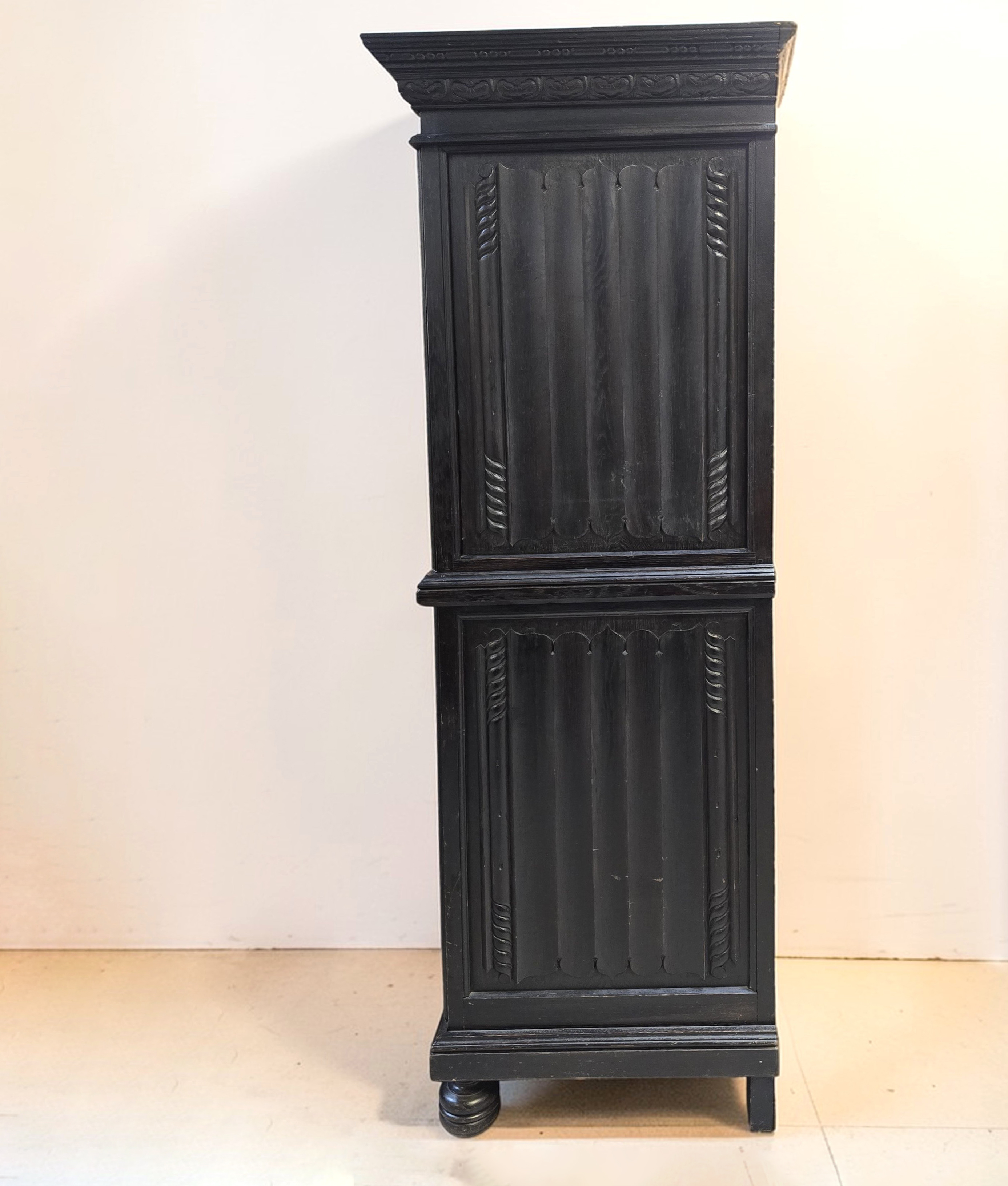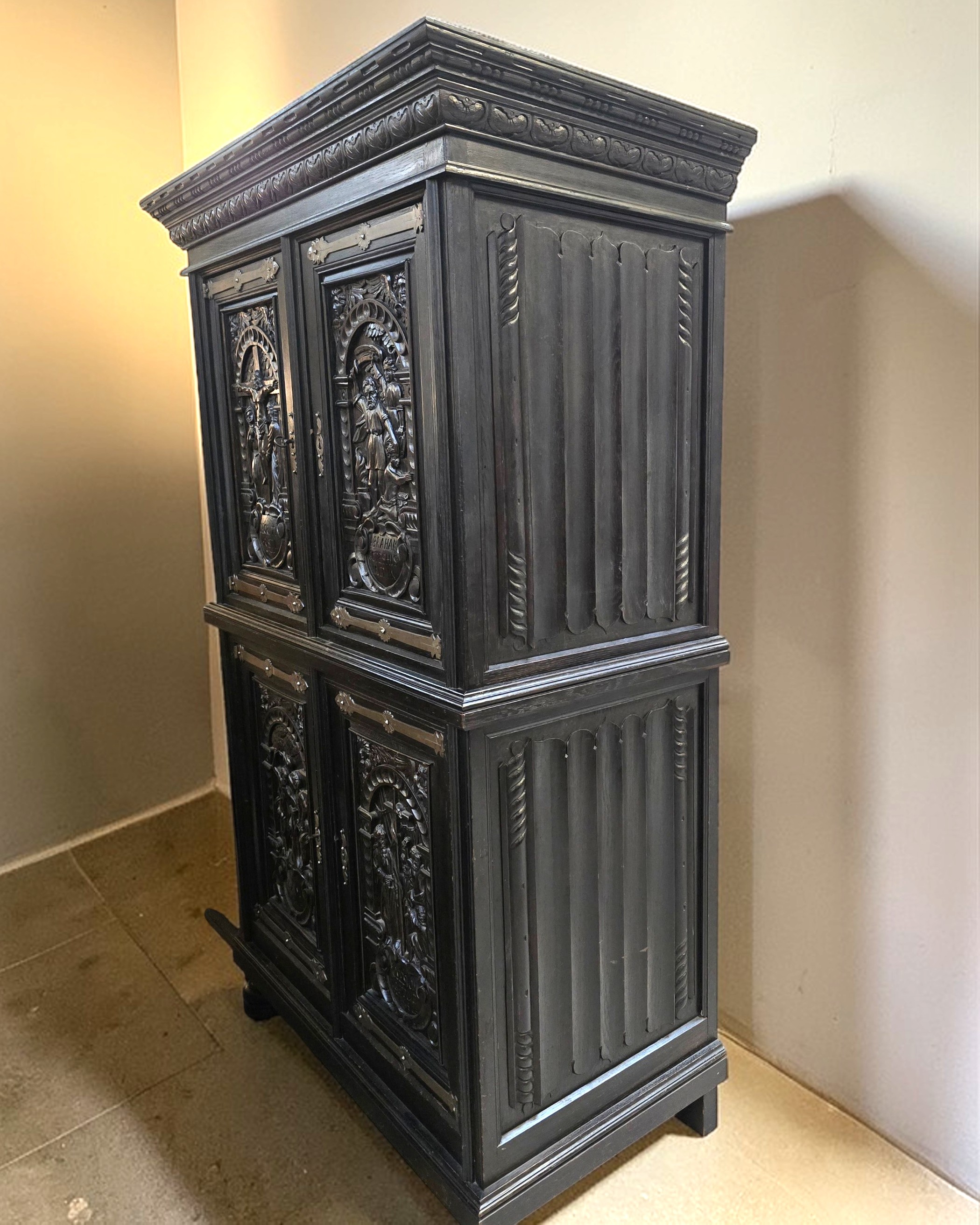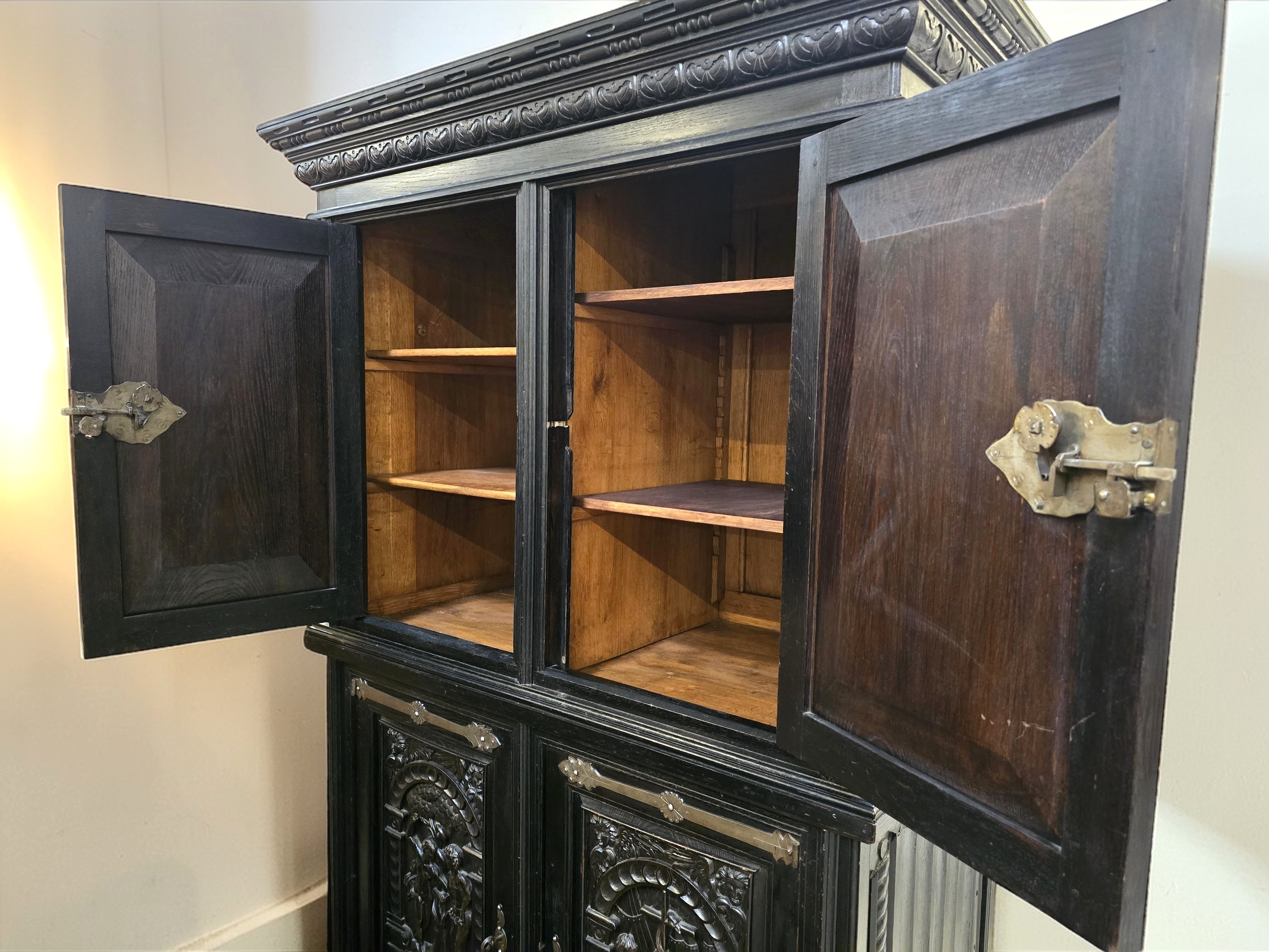 Konstrukcja dwuczęściowa, podzielona poziomo typowo dla XIX wiecznych kredensów (kabinetów).