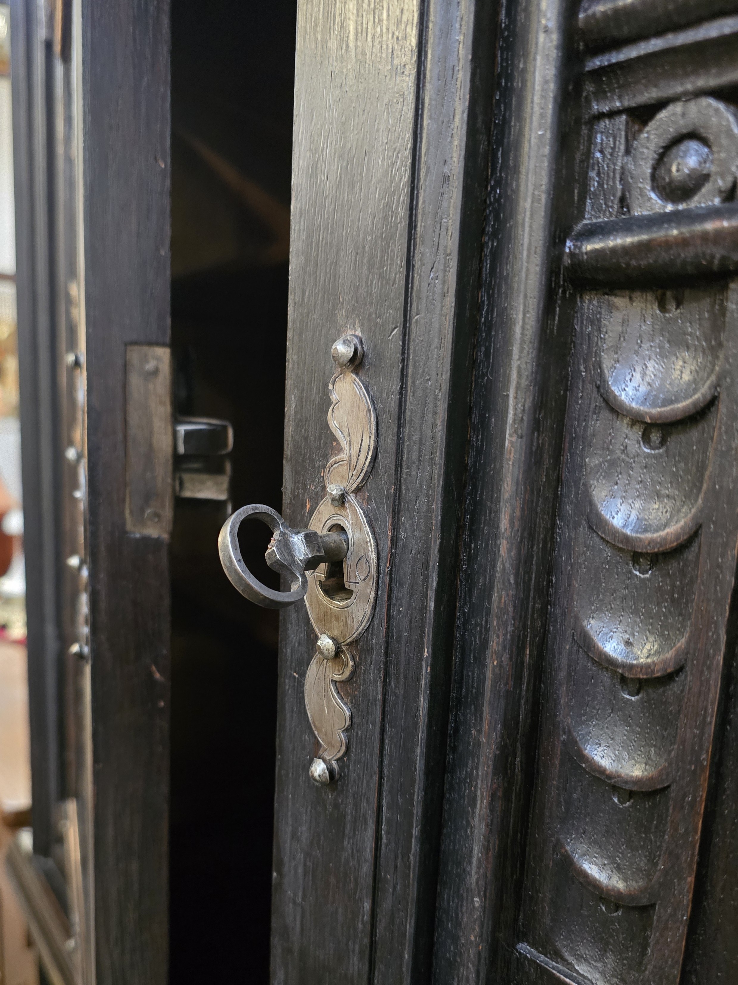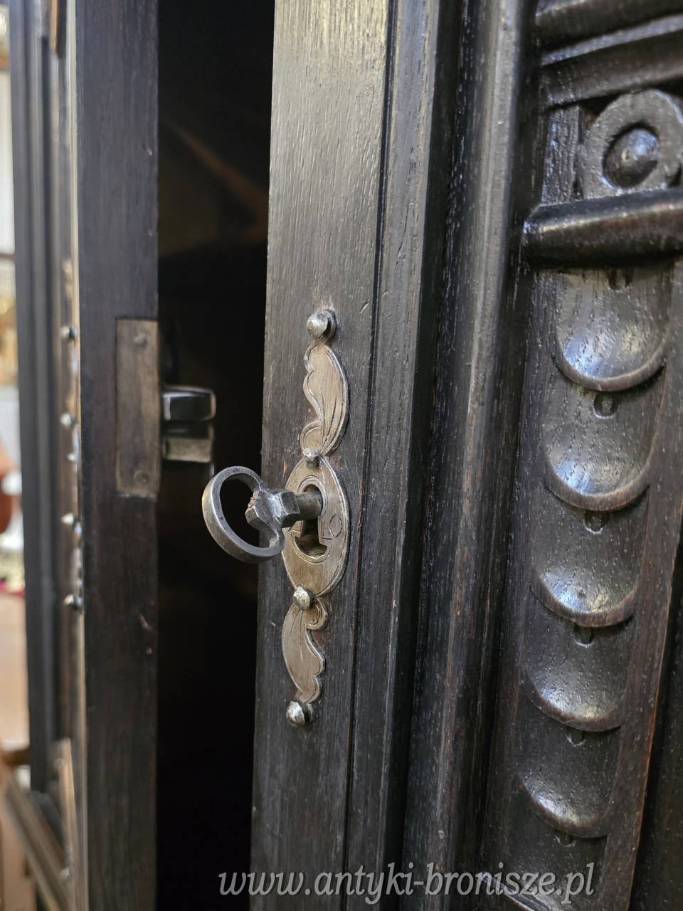 Ozdobny gzyms, boczne ryflowania (pionowe żłobienia), oryginalne mosiężne okucia, zawiasy, szyldy zamków i unikalne klucze.