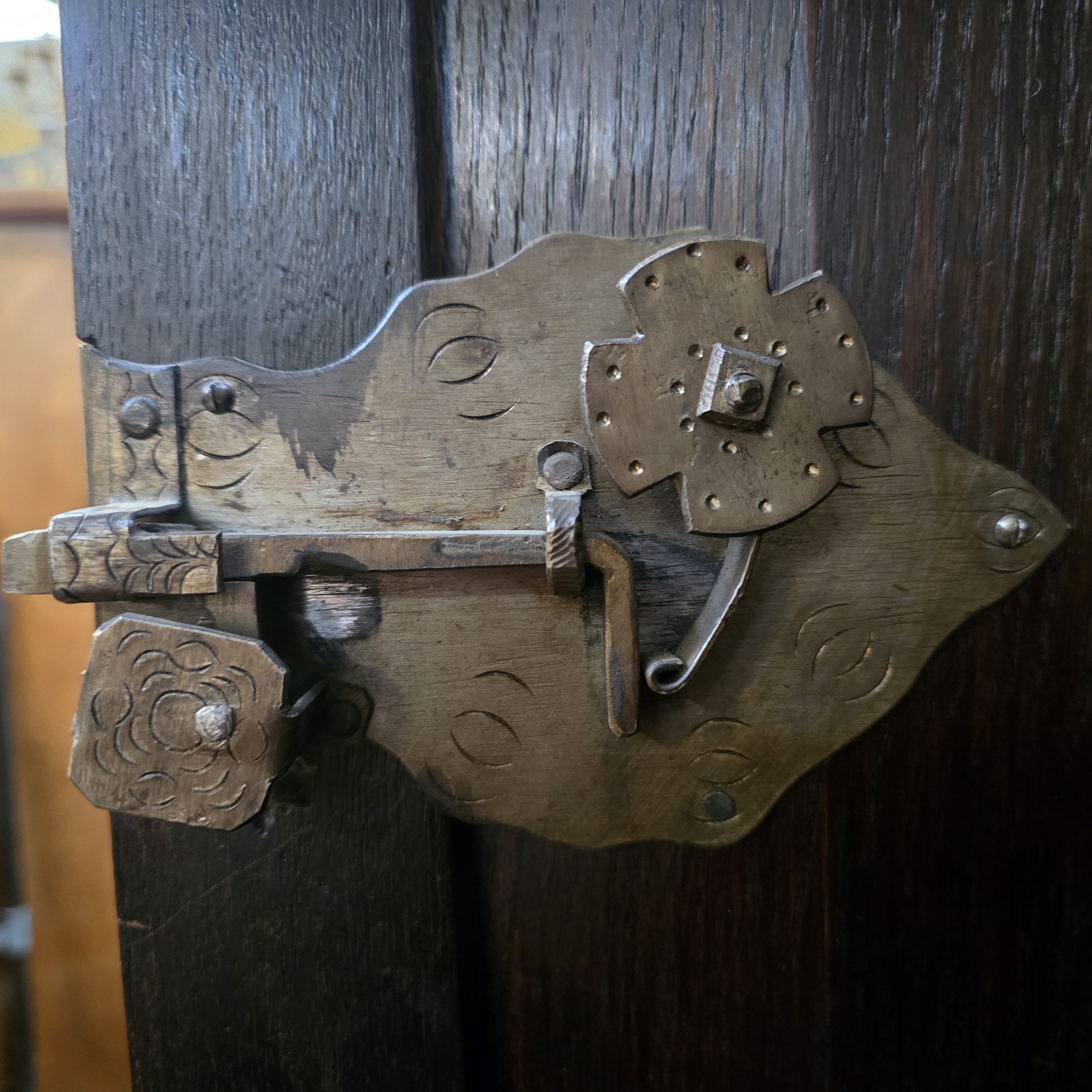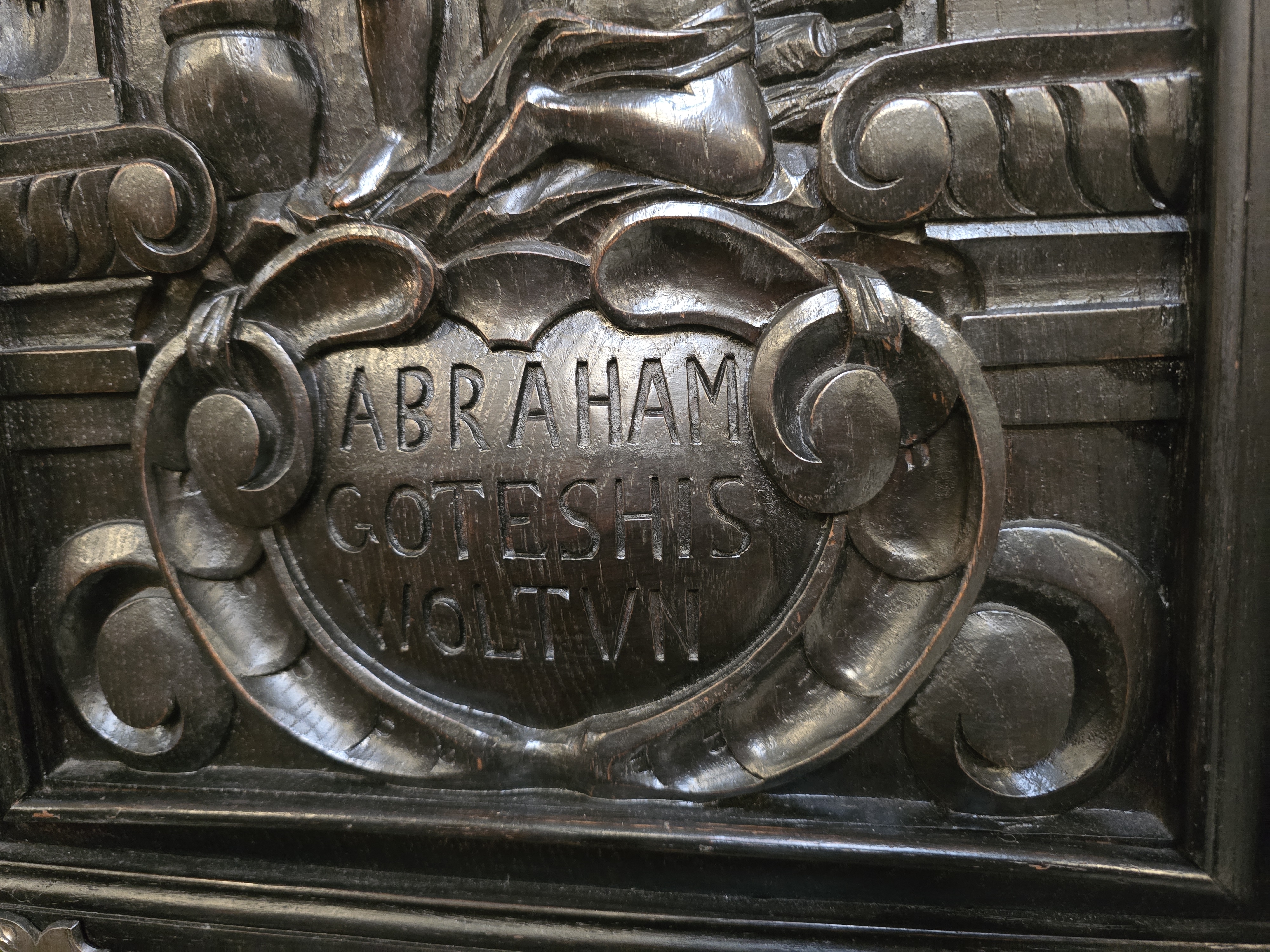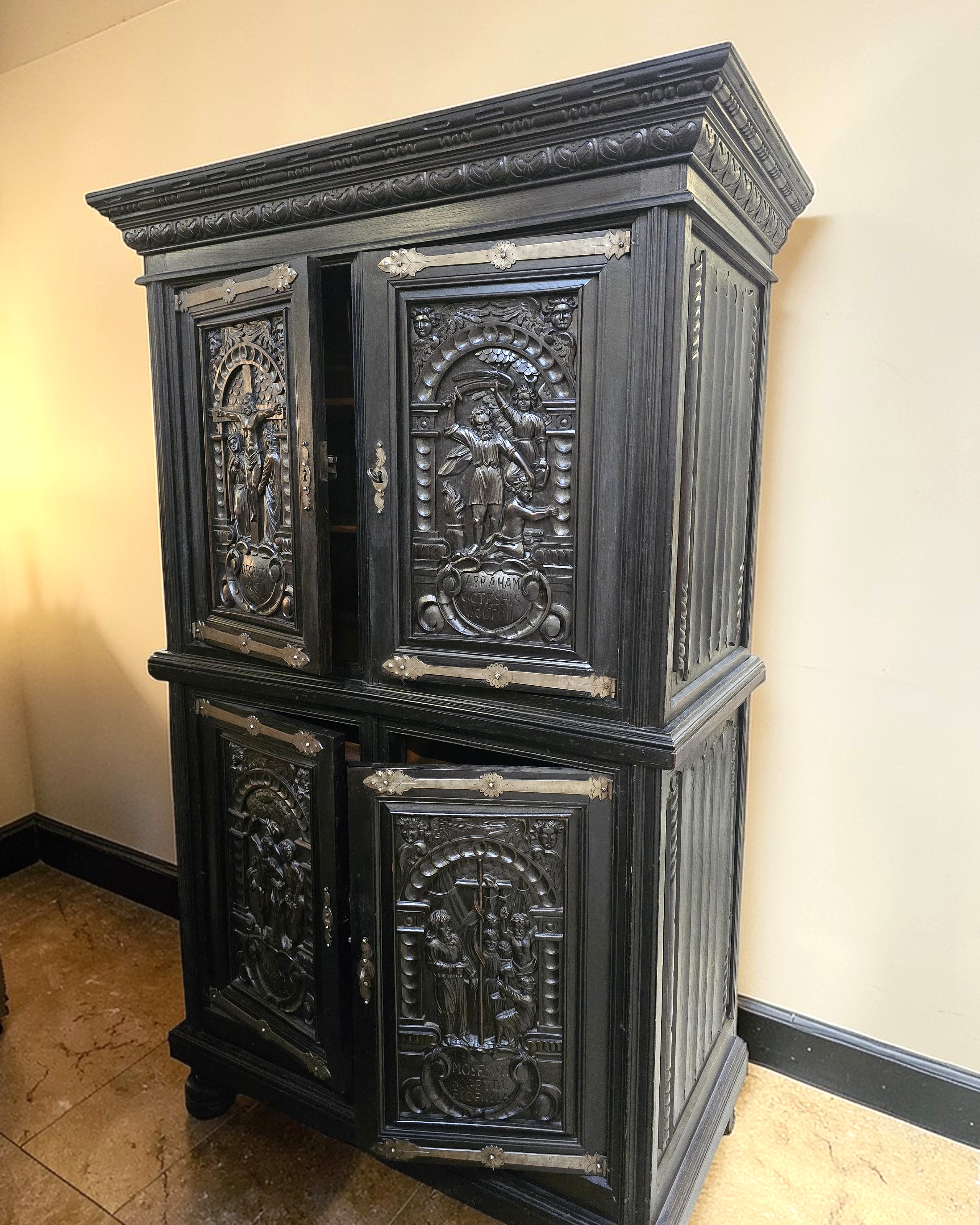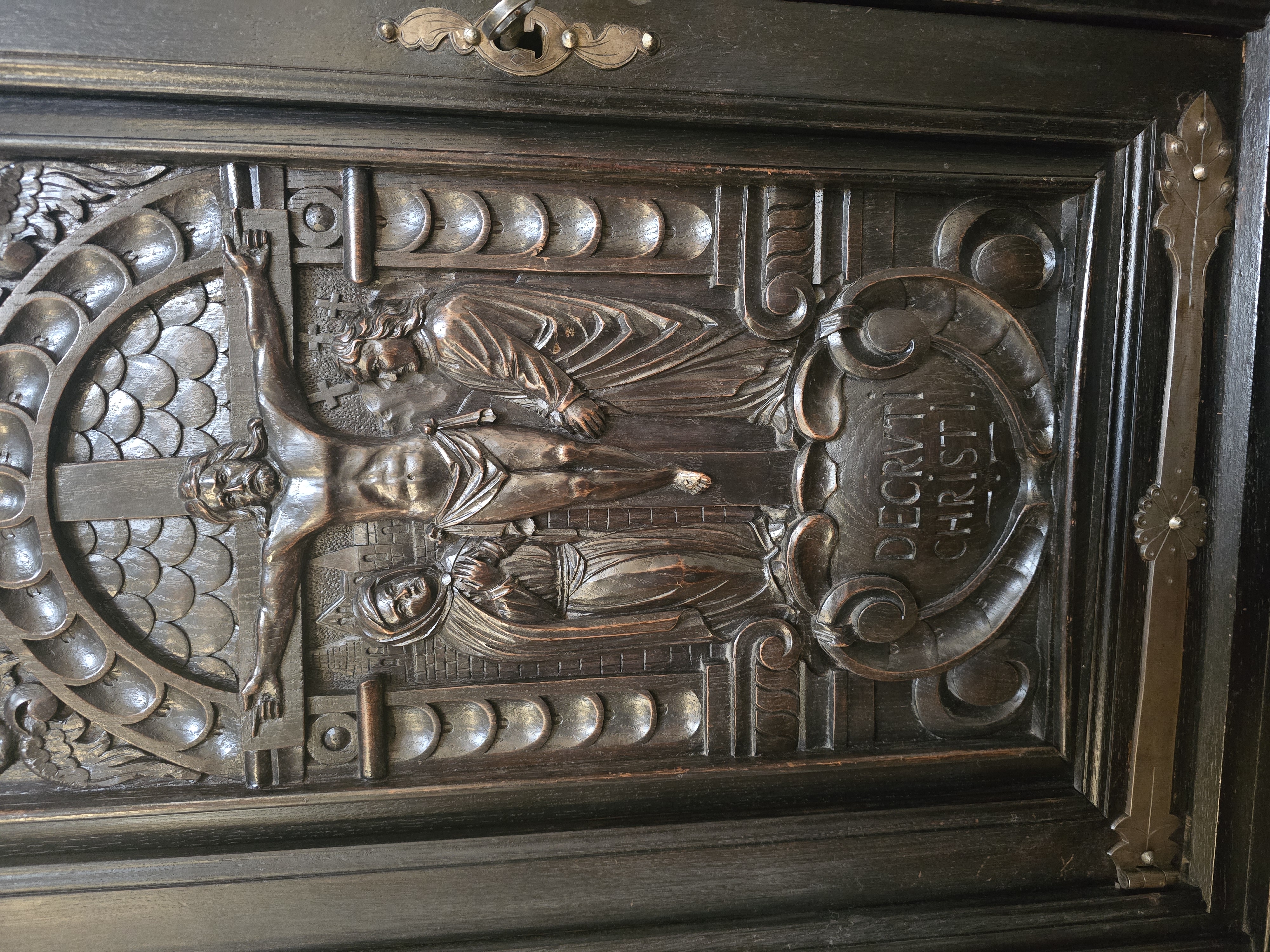 Fronty drzwi bogato rzeźbione, przedstawiają sceny biblijne, pod każdą sceną kartusz z inskrypcją, nawiązują do europejskiego rzemiosła artystycznego z XVII wieku (barok) lub późniejszego historyzmu.