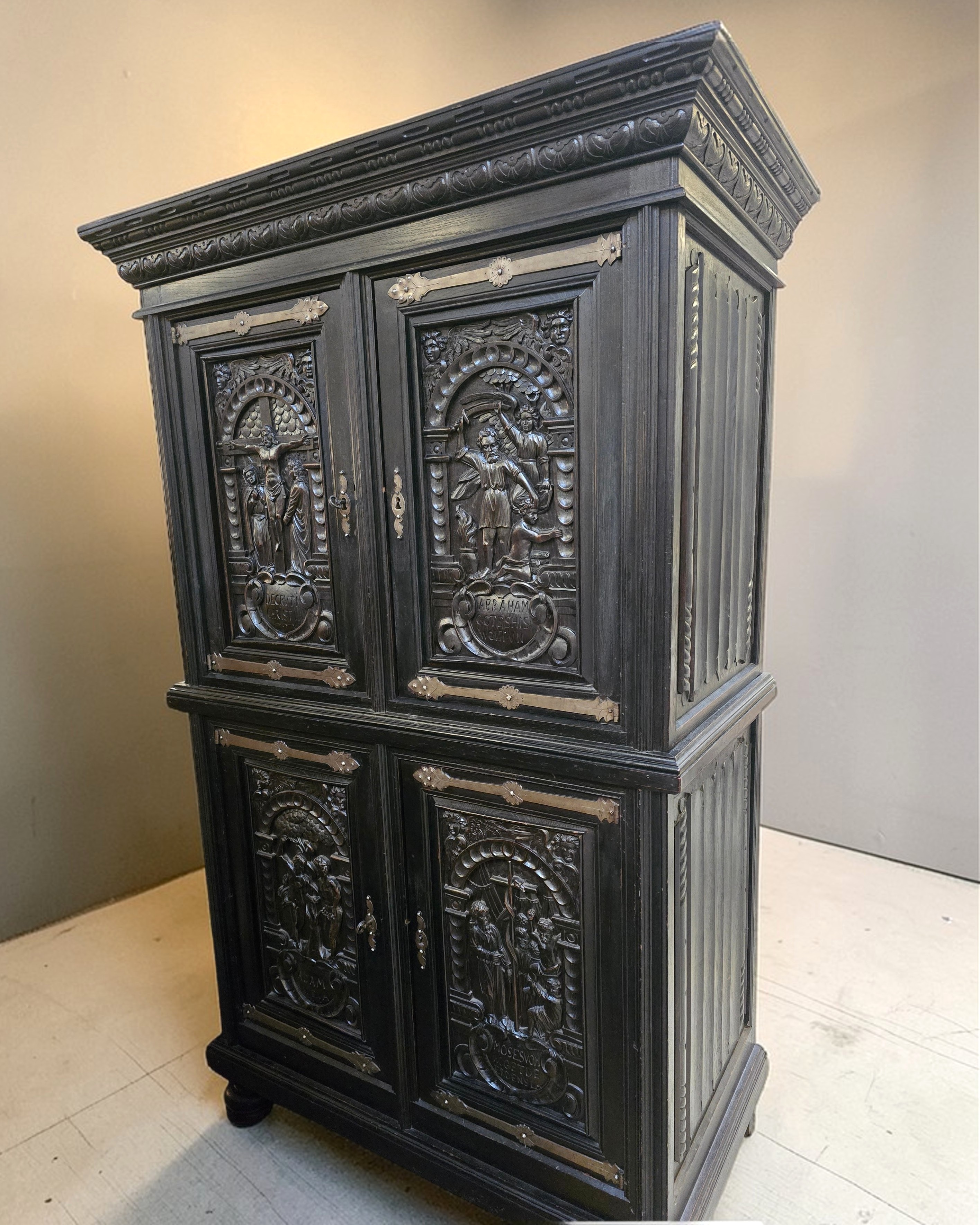 Niepowtarzalny mebel pałacowy, w stylu neorenesansowym, wykonany z drewna dębowego, ozdobiony bogatymi, misternie rzeźbionymi detalami. Całość wykończona w ciemnym kolorze podkreśla głębię rzeźbień.