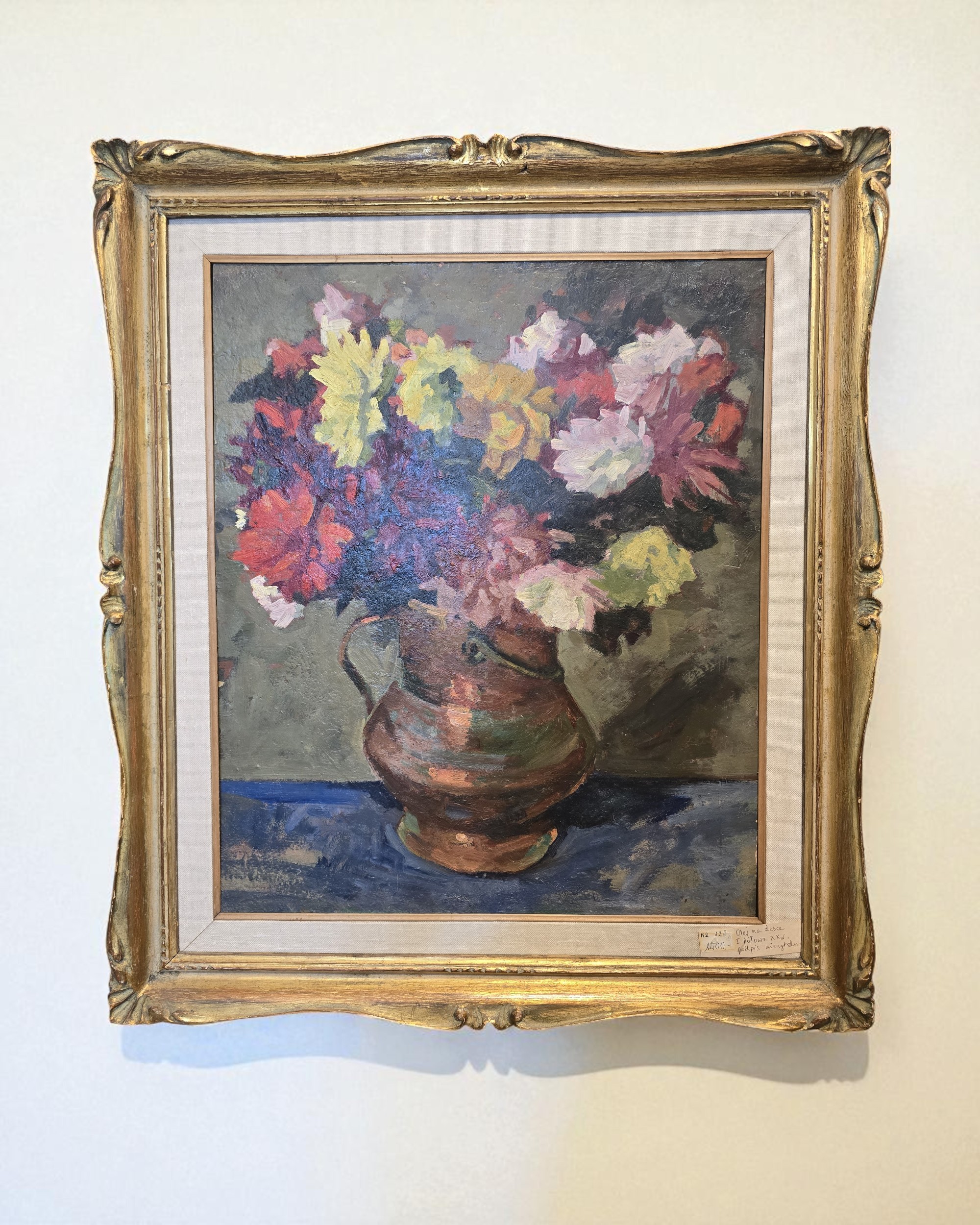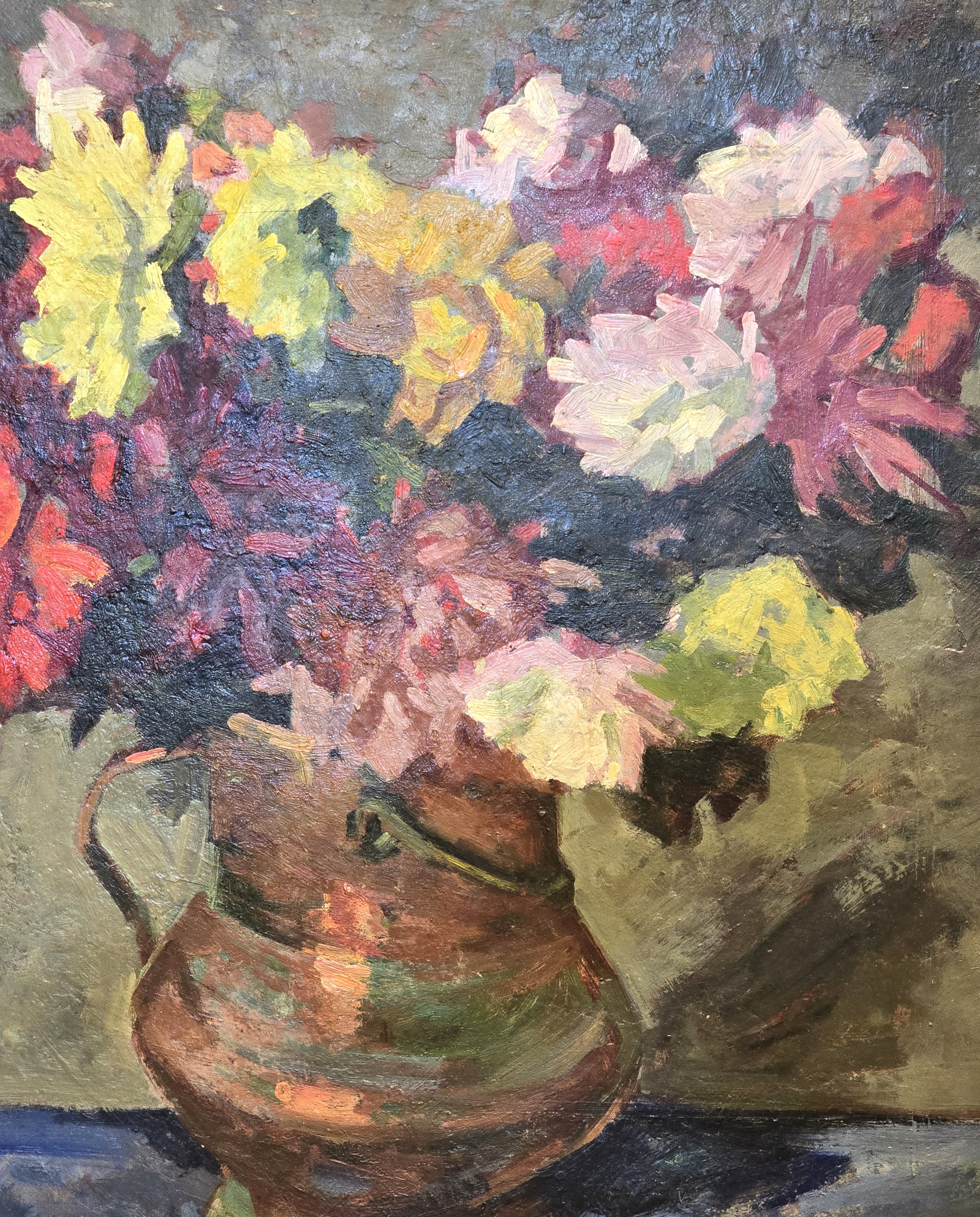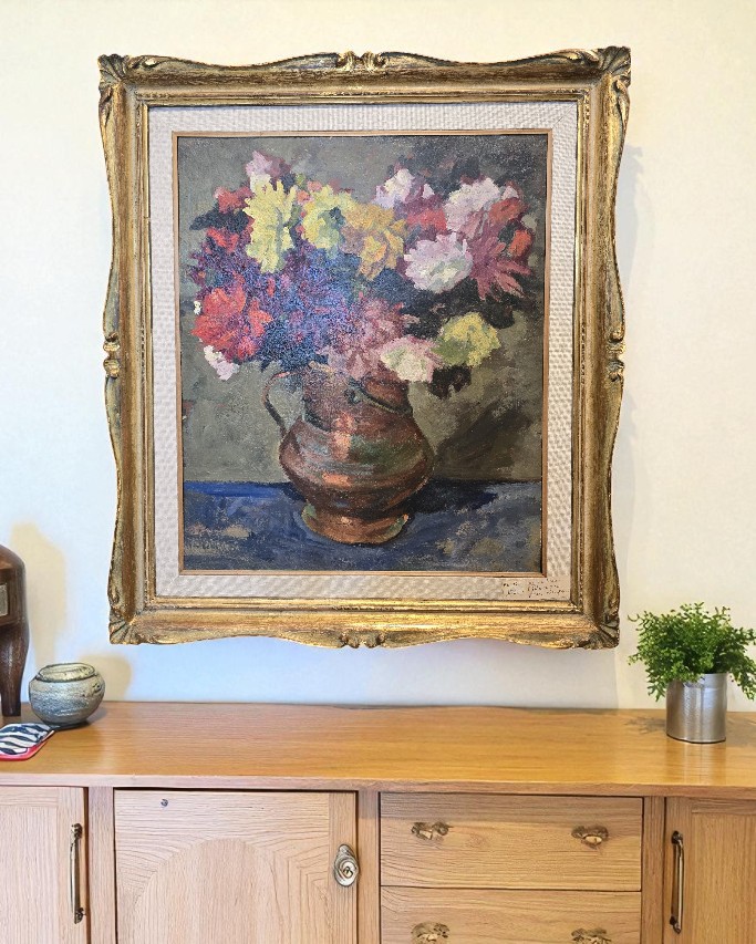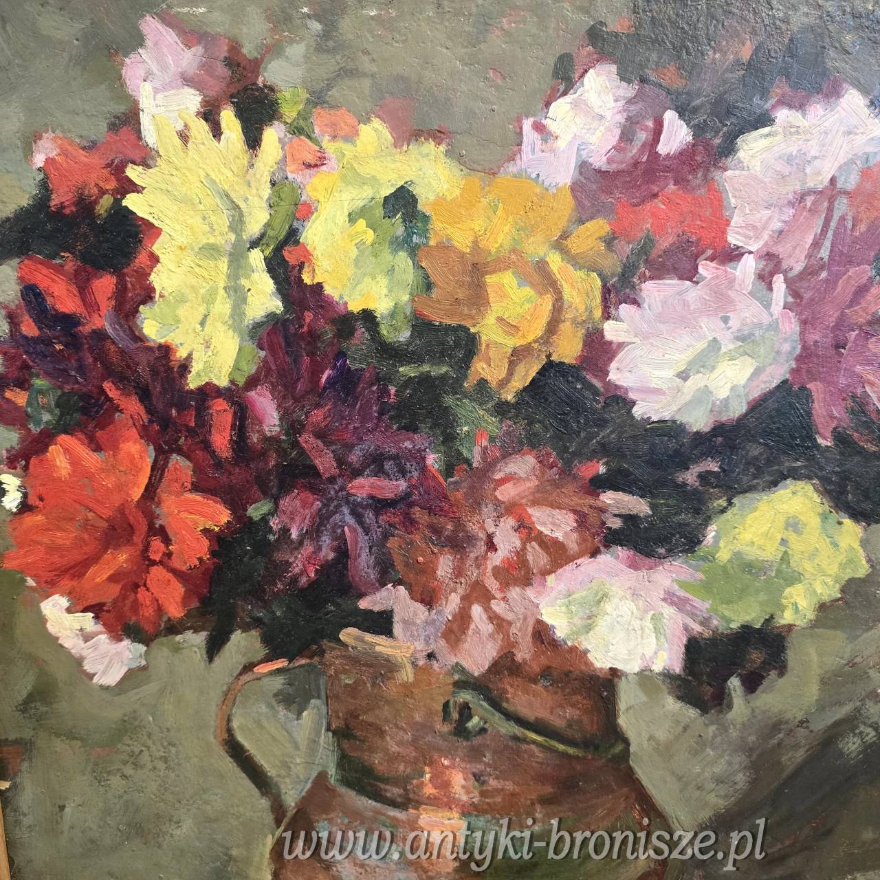 Klimatyczna praca , martwa natura Belgia, Francja ? I poł. XXw, podpis nieczytelny. Bukiet kolorowych kwiatów w miedzianym, stylowym naczyniu zamiast wazonu. Olej na desce oprawiony w dekoracyjną, drewnianą, złoconą ramę . Wymiary 75/45cm stan bardzo ładny.