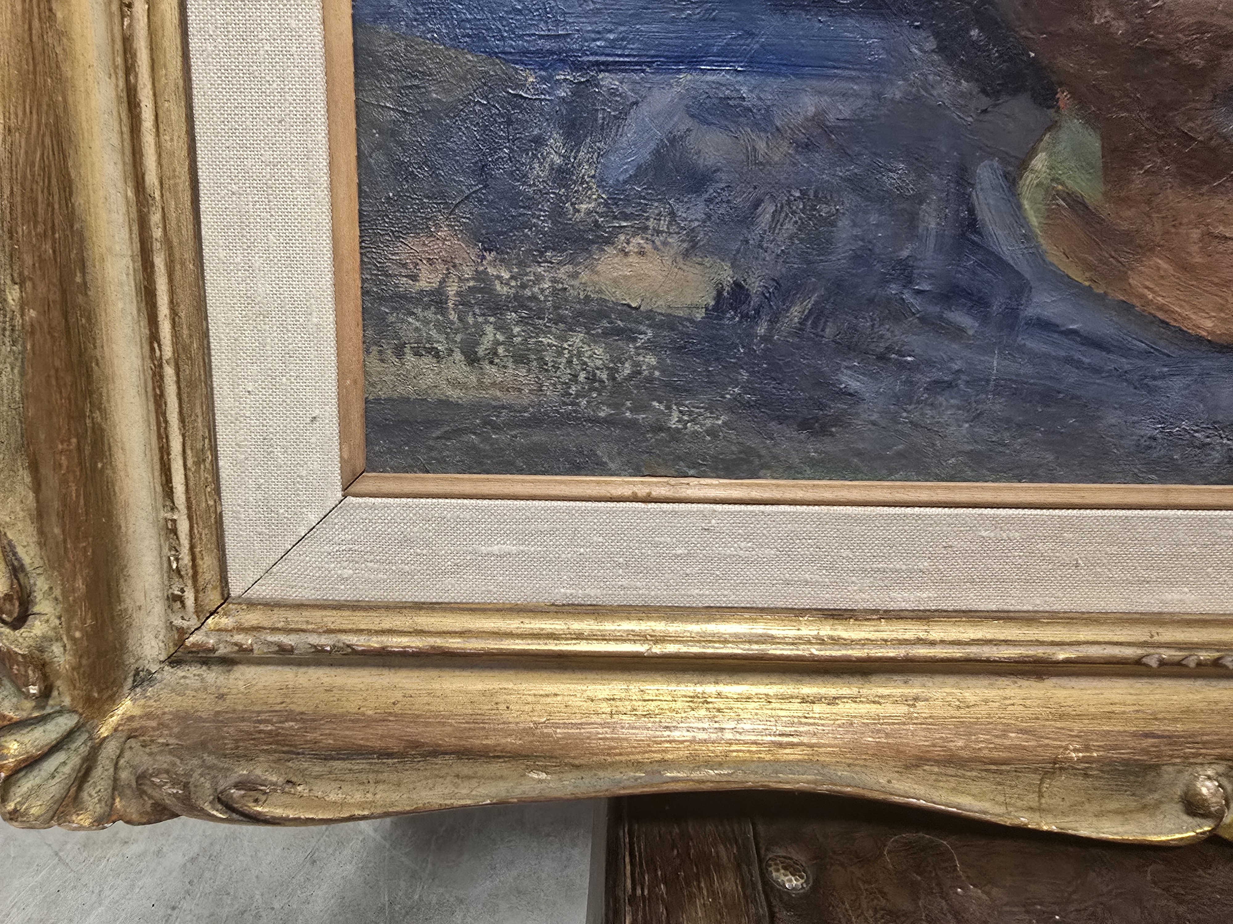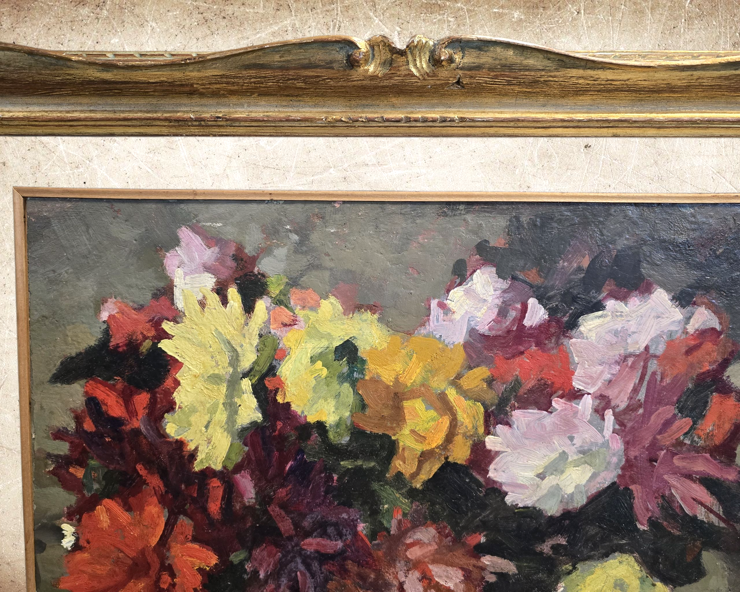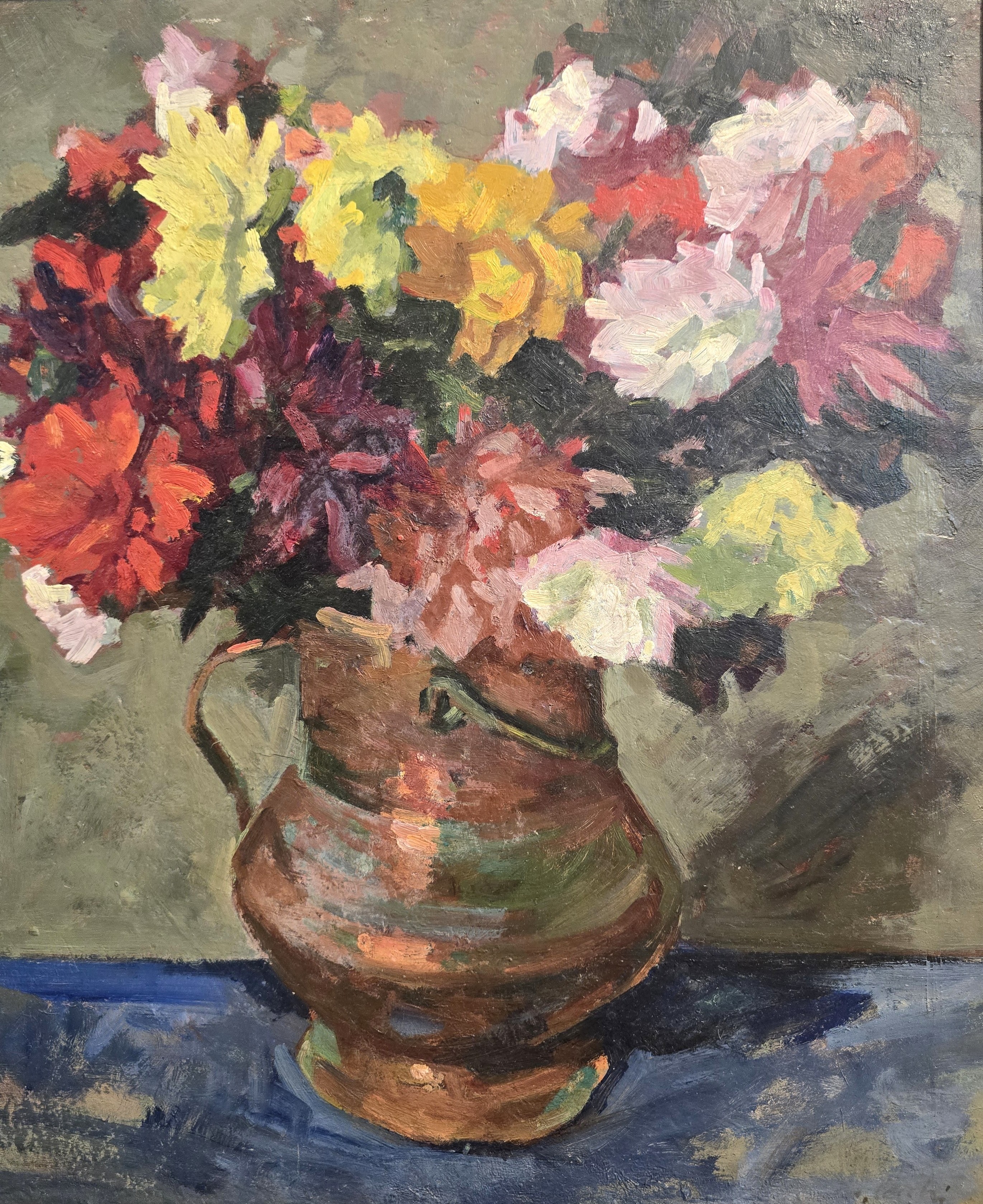 Klimatyczna praca , martwa natura Belgia, Francja ? I poł. XXw, podpis nieczytelny. Bukiet kolorowych kwiatów w miedzianym, stylowym naczyniu zamiast wazonu. Olej na desce oprawiony w dekoracyjną, drewnianą, złoconą ramę . Wymiary 75/45cm stan bardzo ładny.