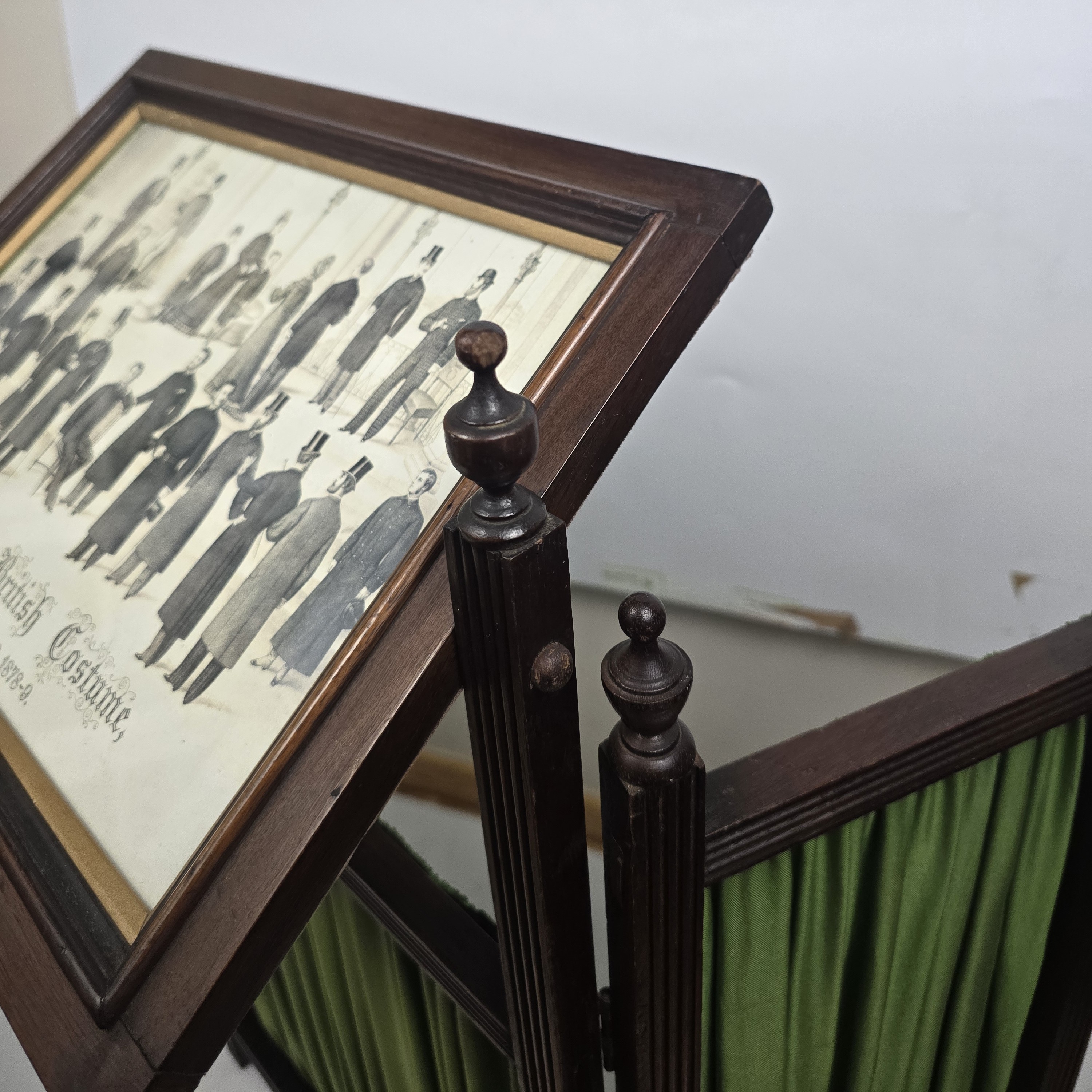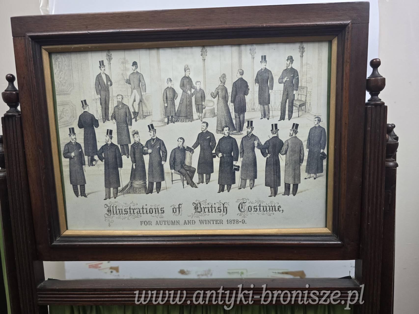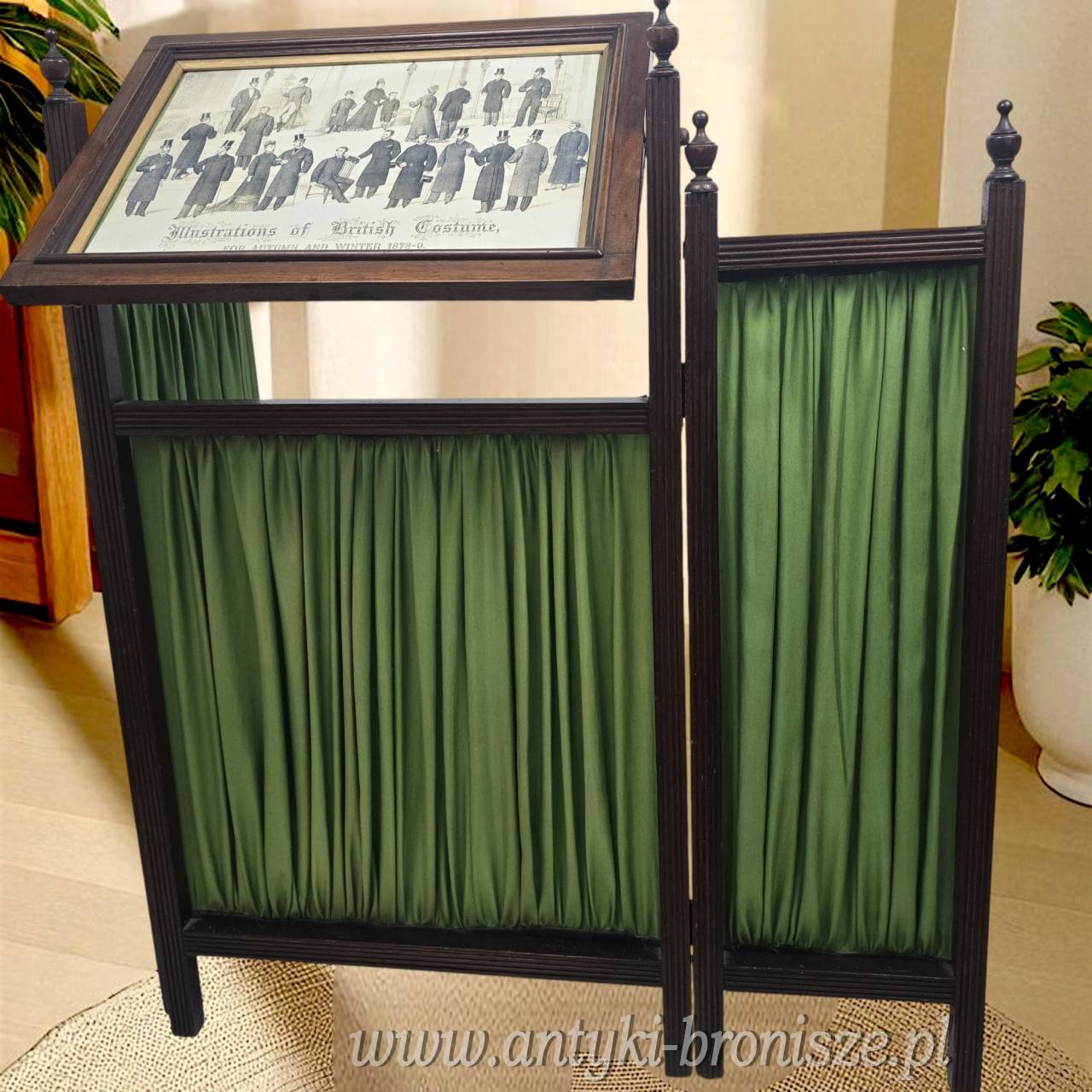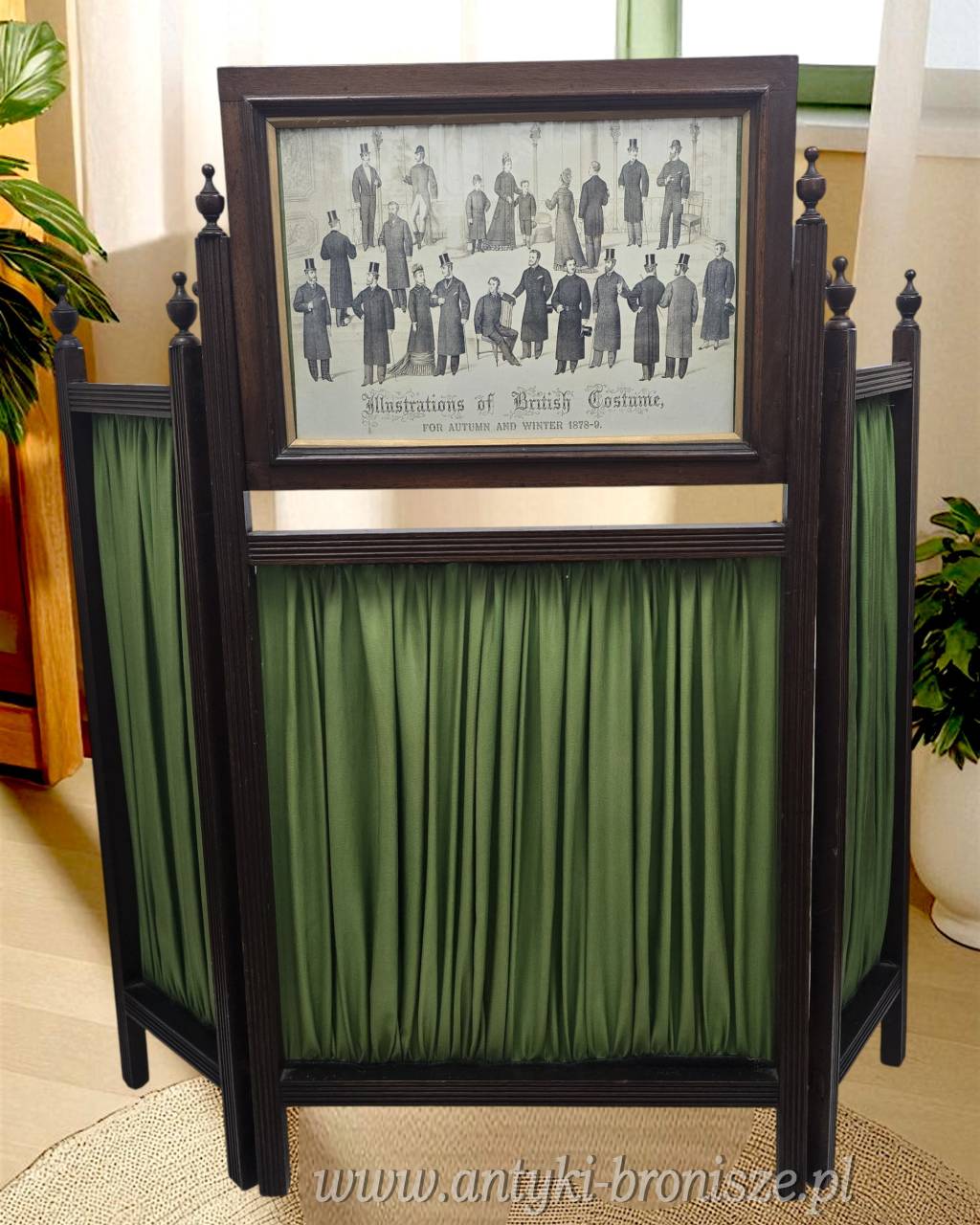 Prostokątny parawan kominkowy w drewnianej ramce, z trzema skrzydłami wypełnionymi plisowaną zieloną tkaniną. W środkowym skrzydle uchylna drewniana ramka z ilustracją - brytyjska moda z epoki wiktoriańskiej. Przedwojenny, angielski zachowany w bardzo dobrym stanie