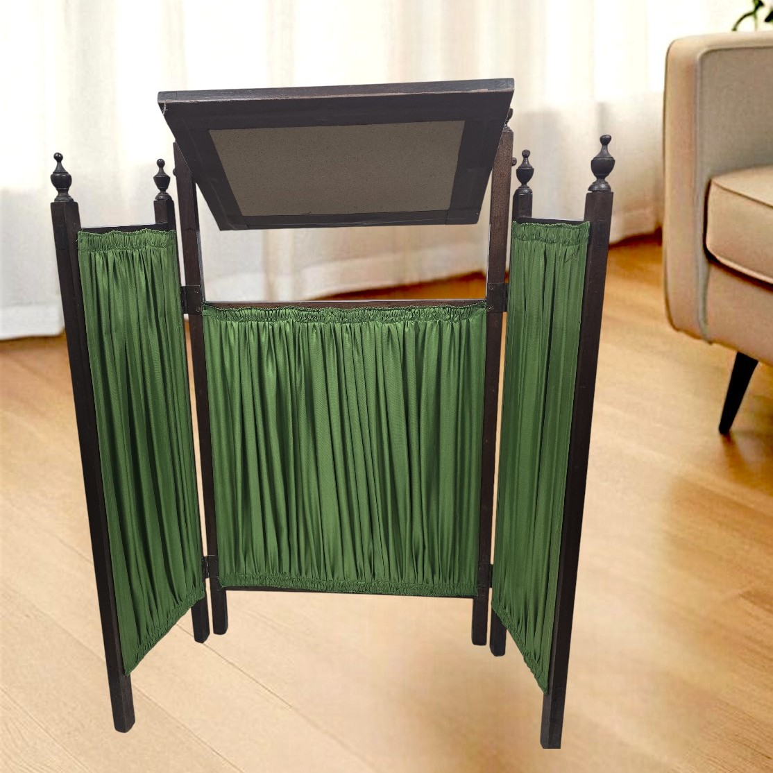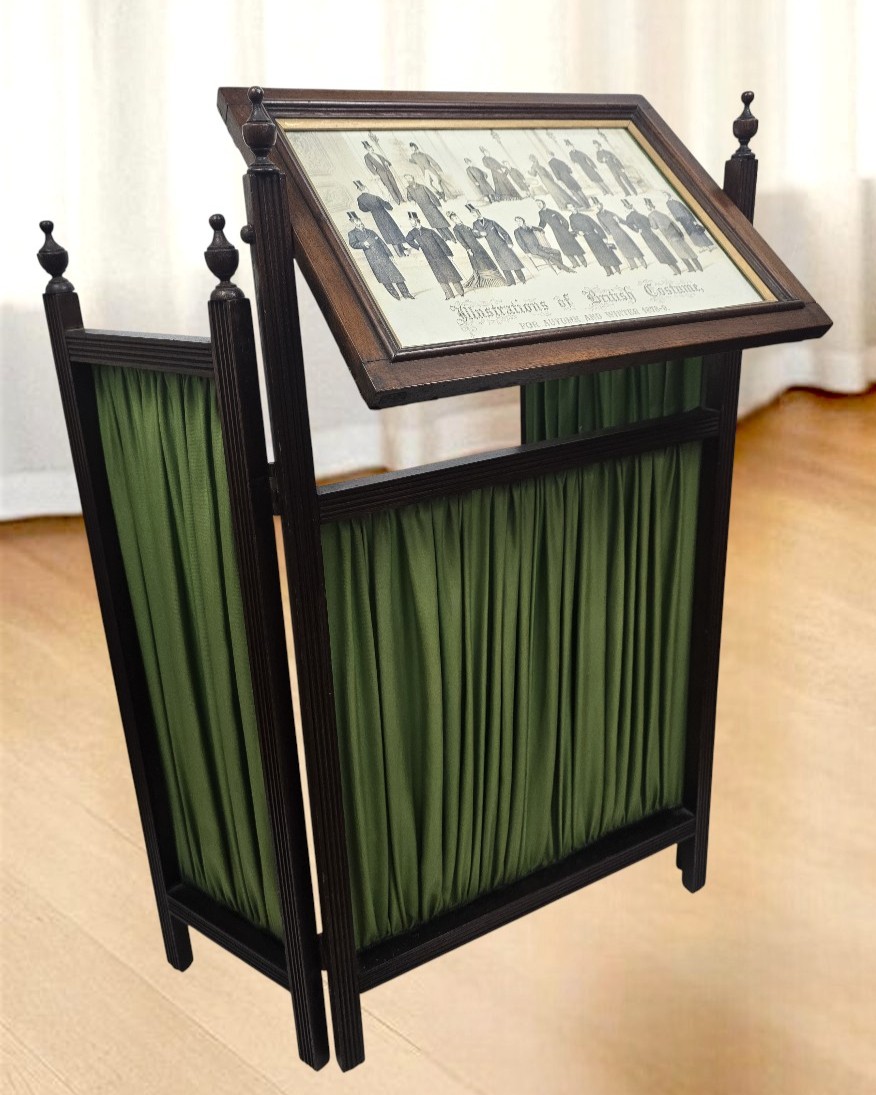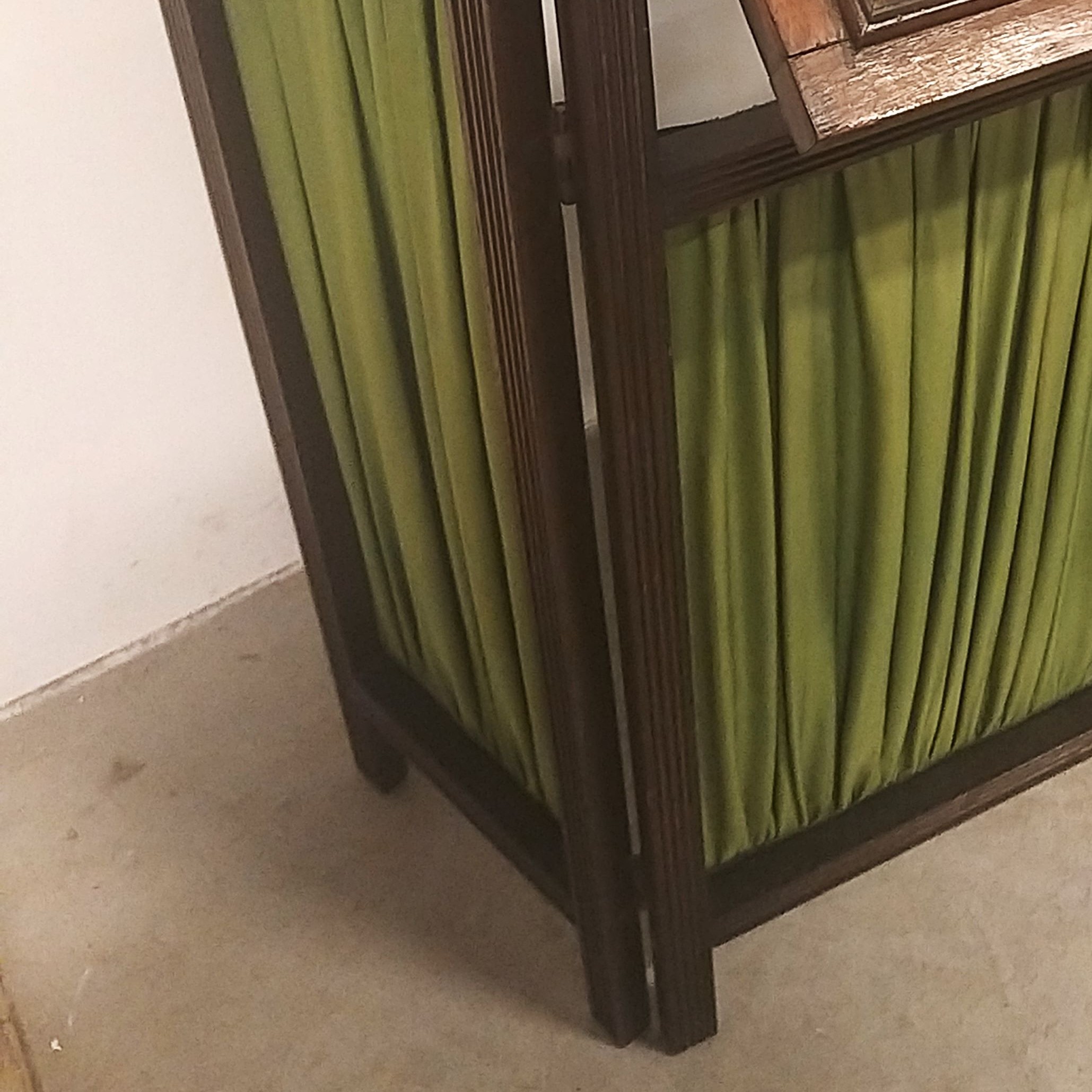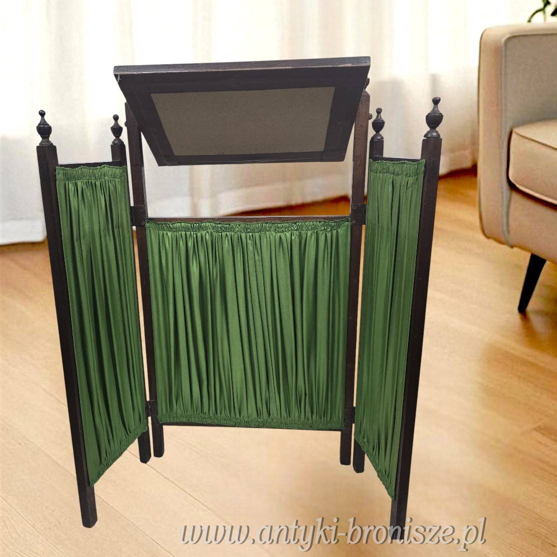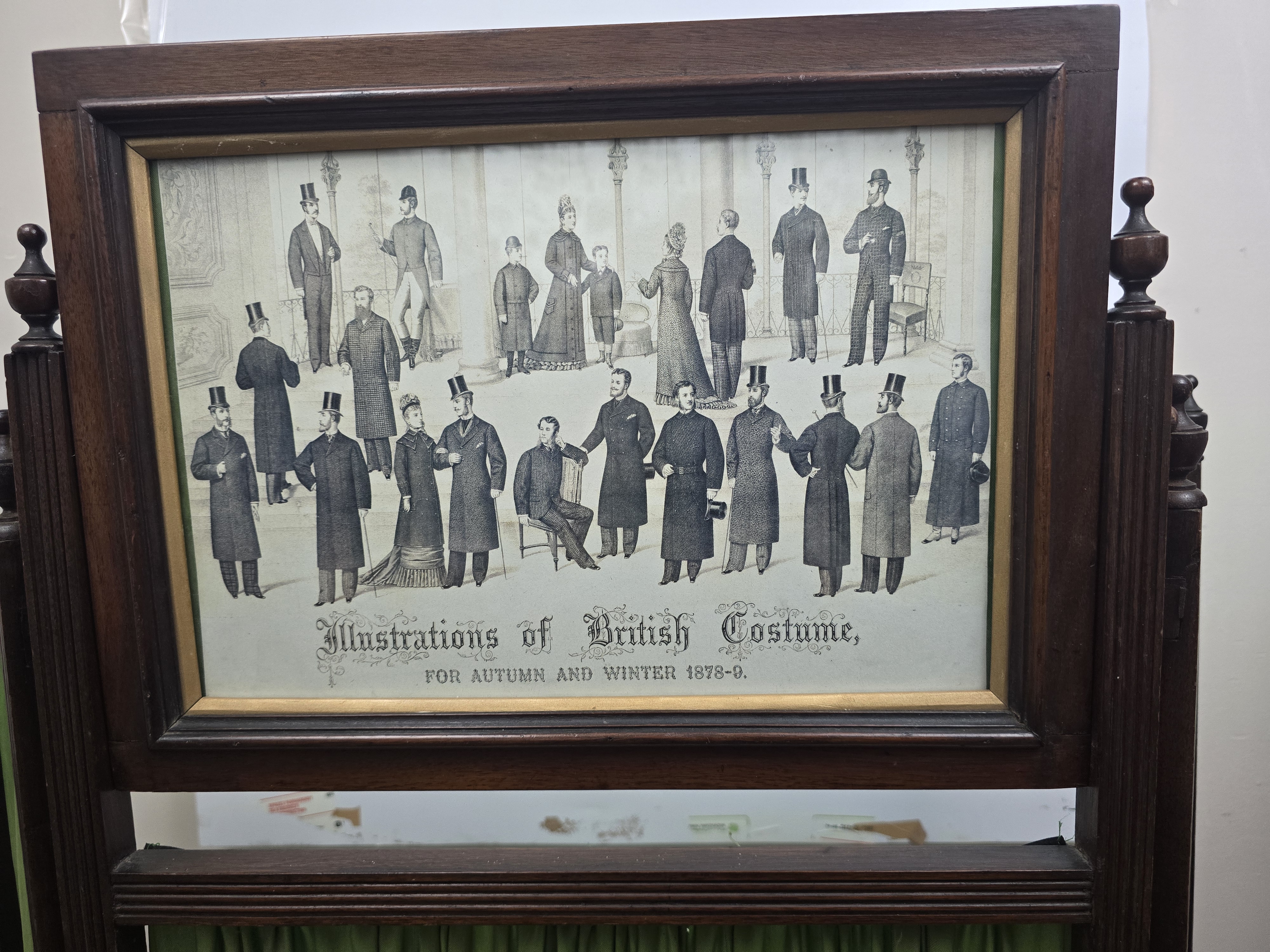 Prostokątny parawan kominkowy w drewnianej ramce, z trzema skrzydłami wypełnionymi plisowaną zieloną tkaniną. W środkowym skrzydle uchylna drewniana ramka z ilustracją - brytyjska moda z epoki wiktoriańskiej. Przedwojenny, angielski zachowany w bardzo dobrym stanie