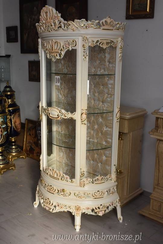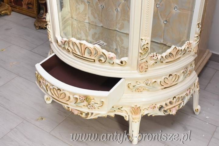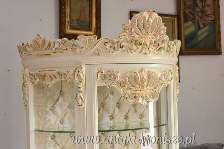 Na sprzedaż reprezentacyjna witryna w stylu barokowym, bogato zdobiona rzeźbieniami i dekoracyjnymi ornamentami. Mebel o wyjątkowo eleganckiej formie, idealny do klasycznych i luksusowych wnętrz.