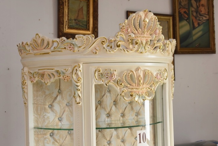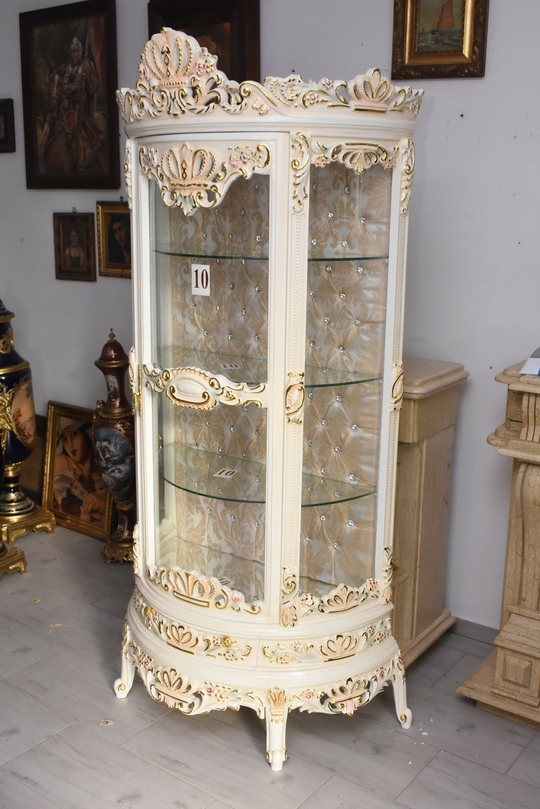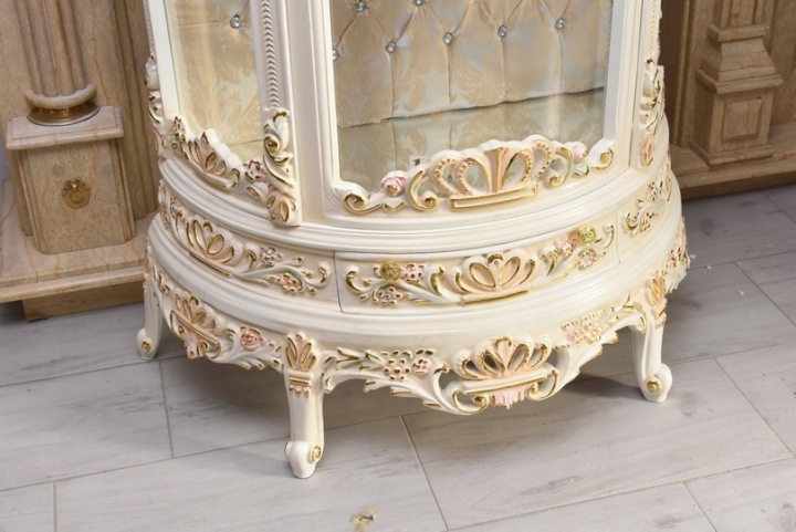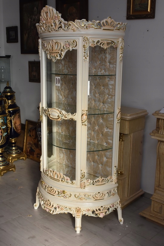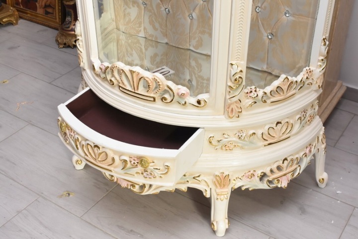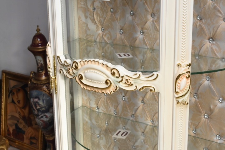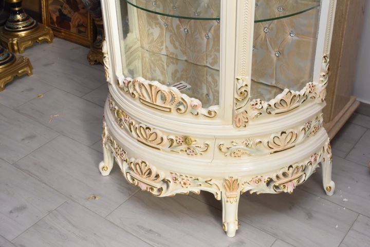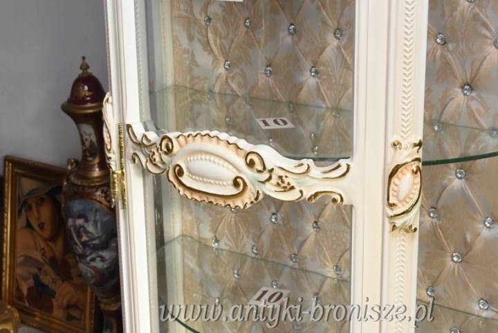Witryna wykonana z drewna, w kolorze kremowym z subtelnymi złoceniami. Front oraz boki przeszklone, wewnątrz szklane półki umożliwiające efektowną ekspozycję porcelany, kryształów, figurek lub kolekcji. Tylna ścianka wykończona dekoracyjną tapicerką z pikowaniem i kryształkami, co nadaje całości wyjątkowego charakteru.