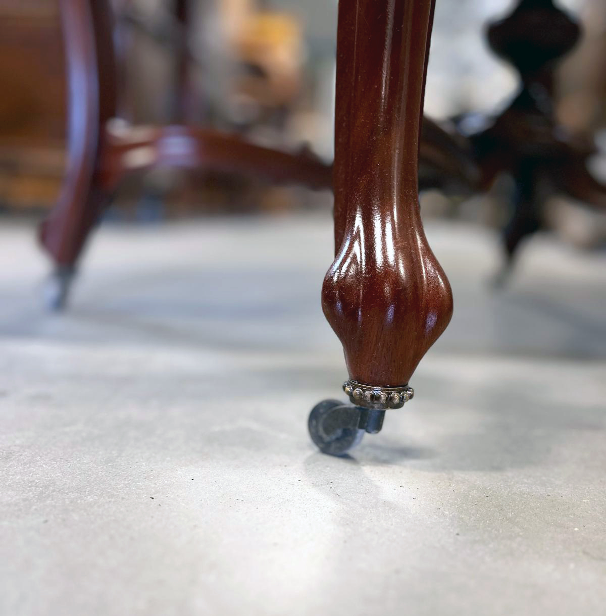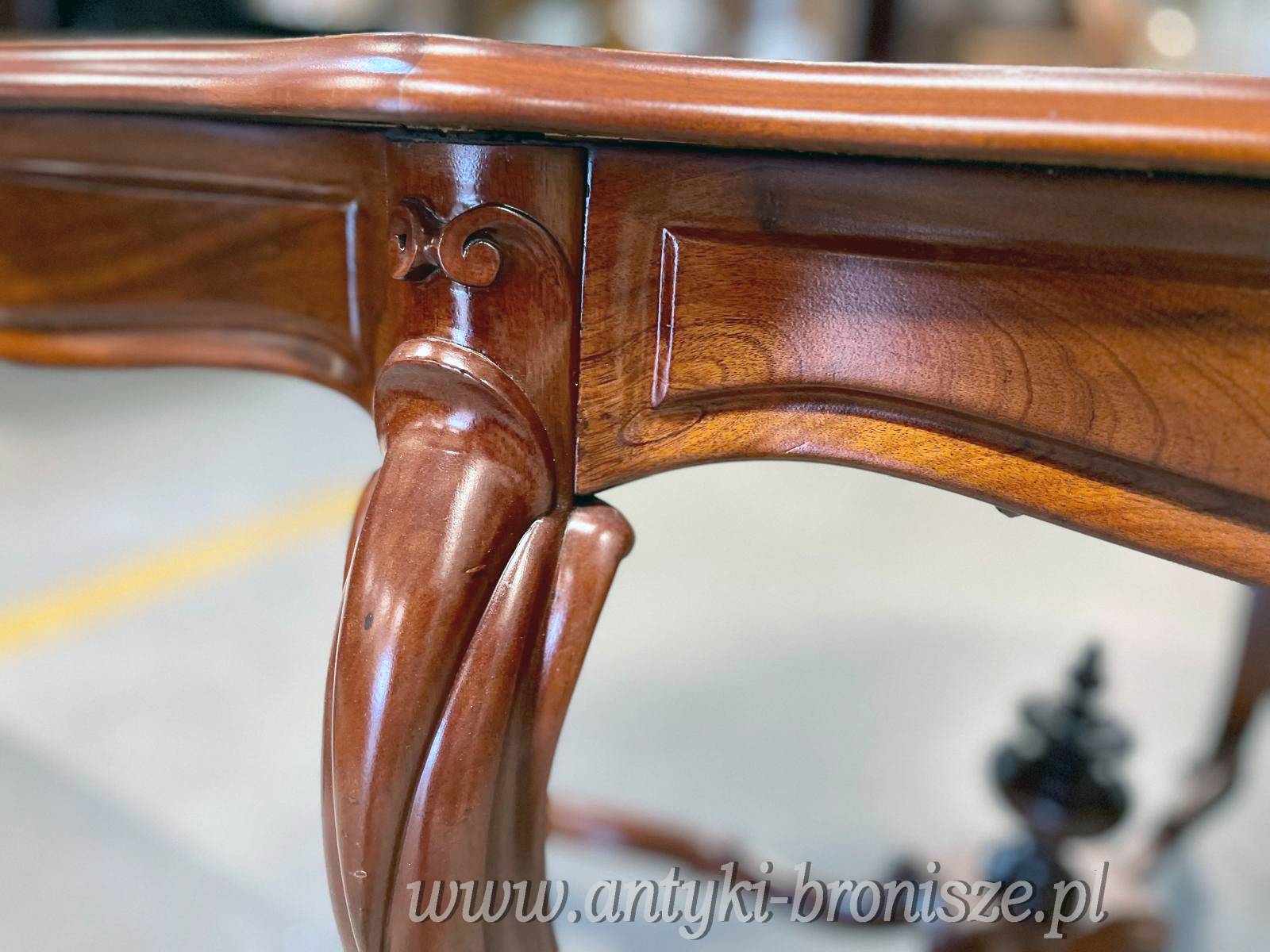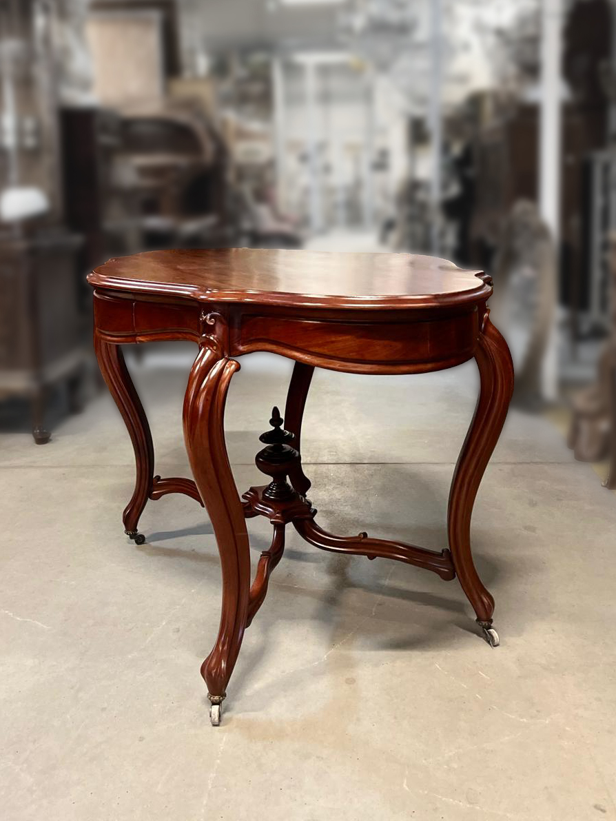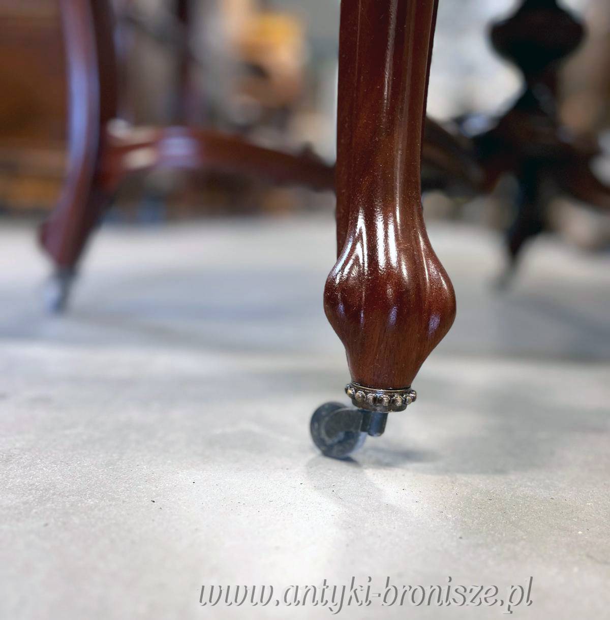 Mebel jest wykonany z mahoniu. Blat stołom jest o miękkiej falistej linii nadającej całości lekkości i elegancji. Smukłe nogi zakończone są kółkami, co ułatwia przestawianie stołu.