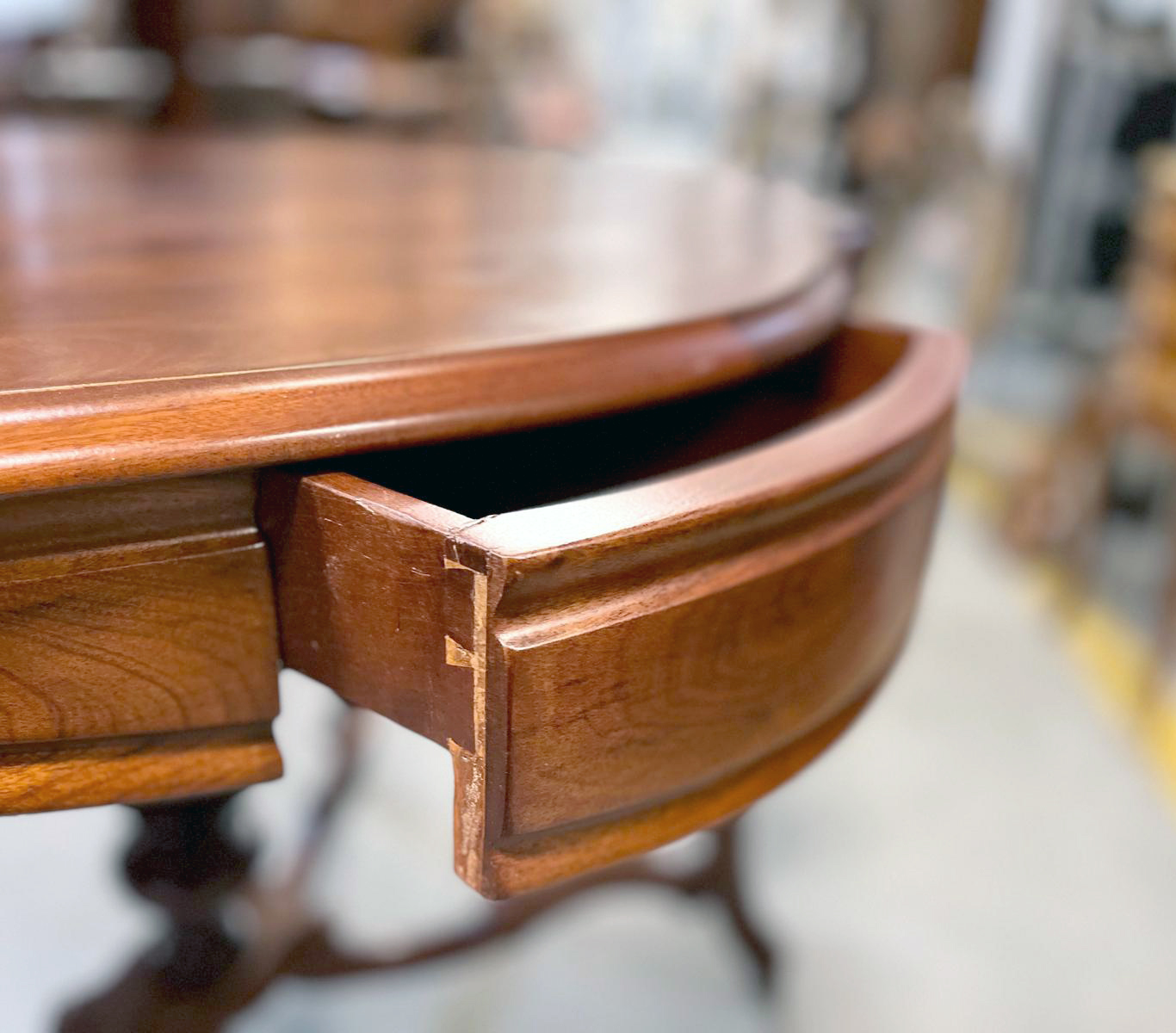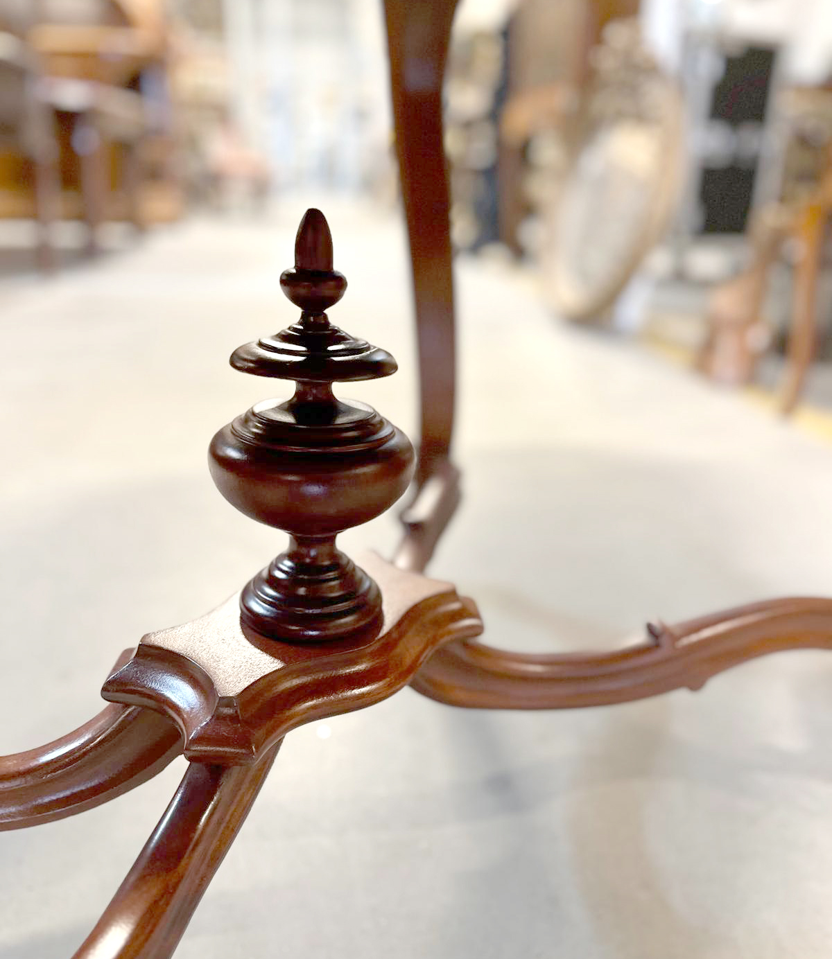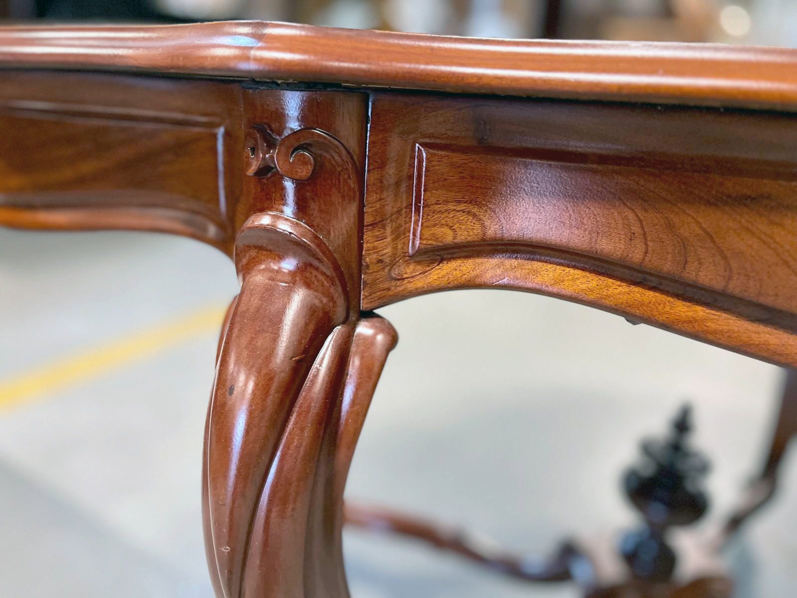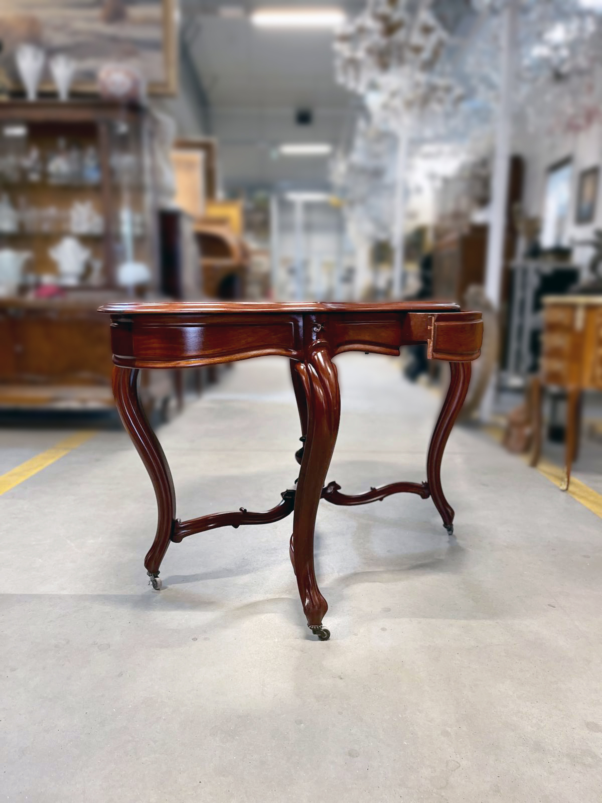 Mebel jest wykonany z mahoniu. Blat stołom jest o miękkiej falistej linii nadającej całości lekkości i elegancji. Smukłe nogi zakończone są kółkami, co ułatwia przestawianie stołu.