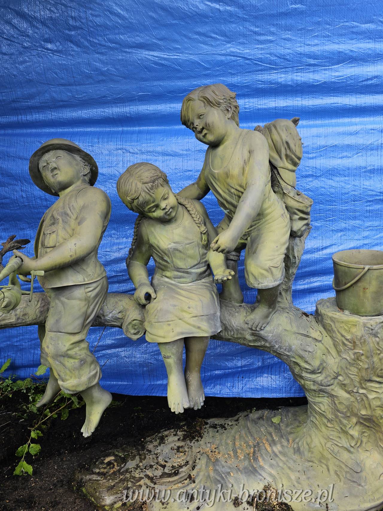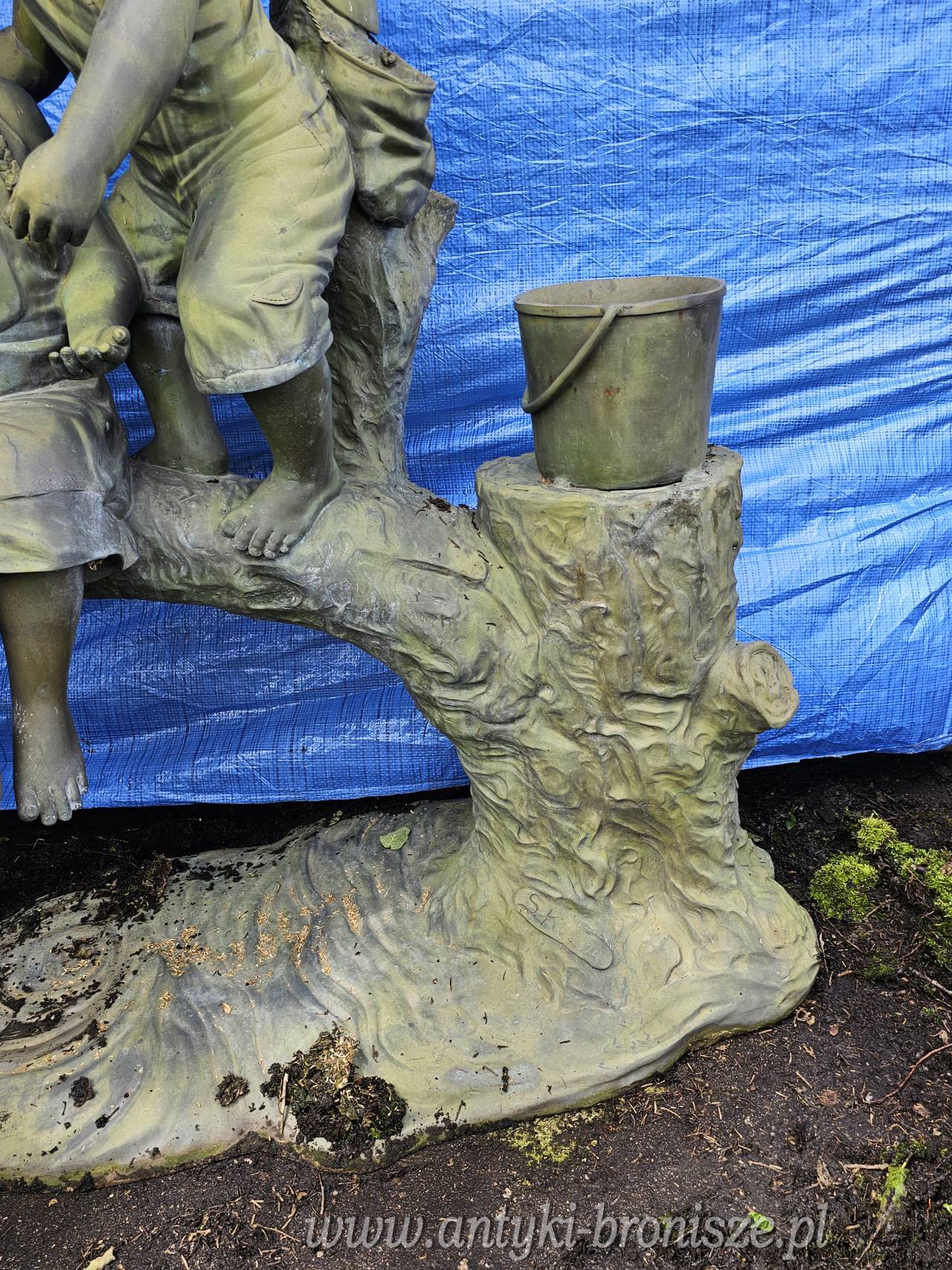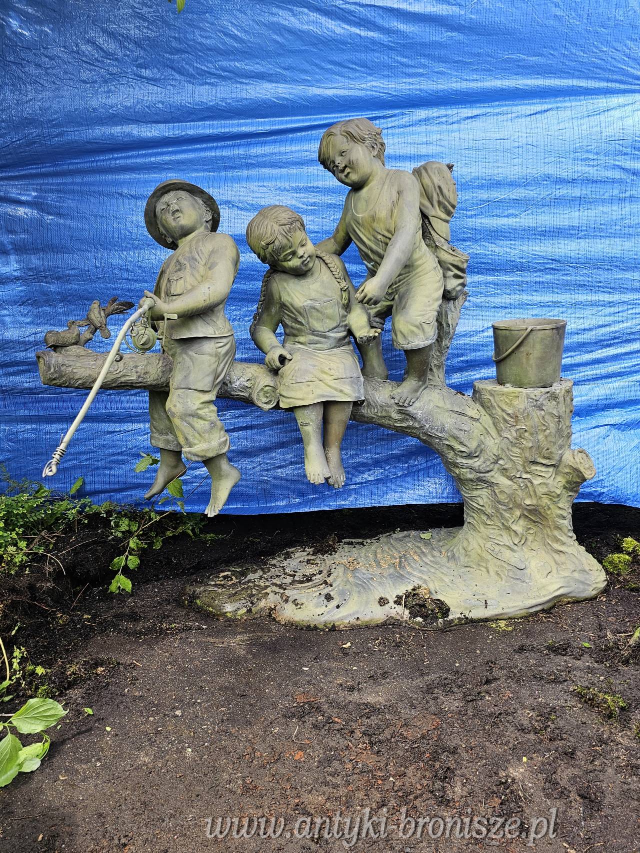 Przedstawiamy urokliwą fontannę „Dziecięca opowieść” — trójka dzieci na drzewie z radością łowi ryby, wprowadzając w ogród atmosferę radości, ciepła i beztroskiego szczęścia!
