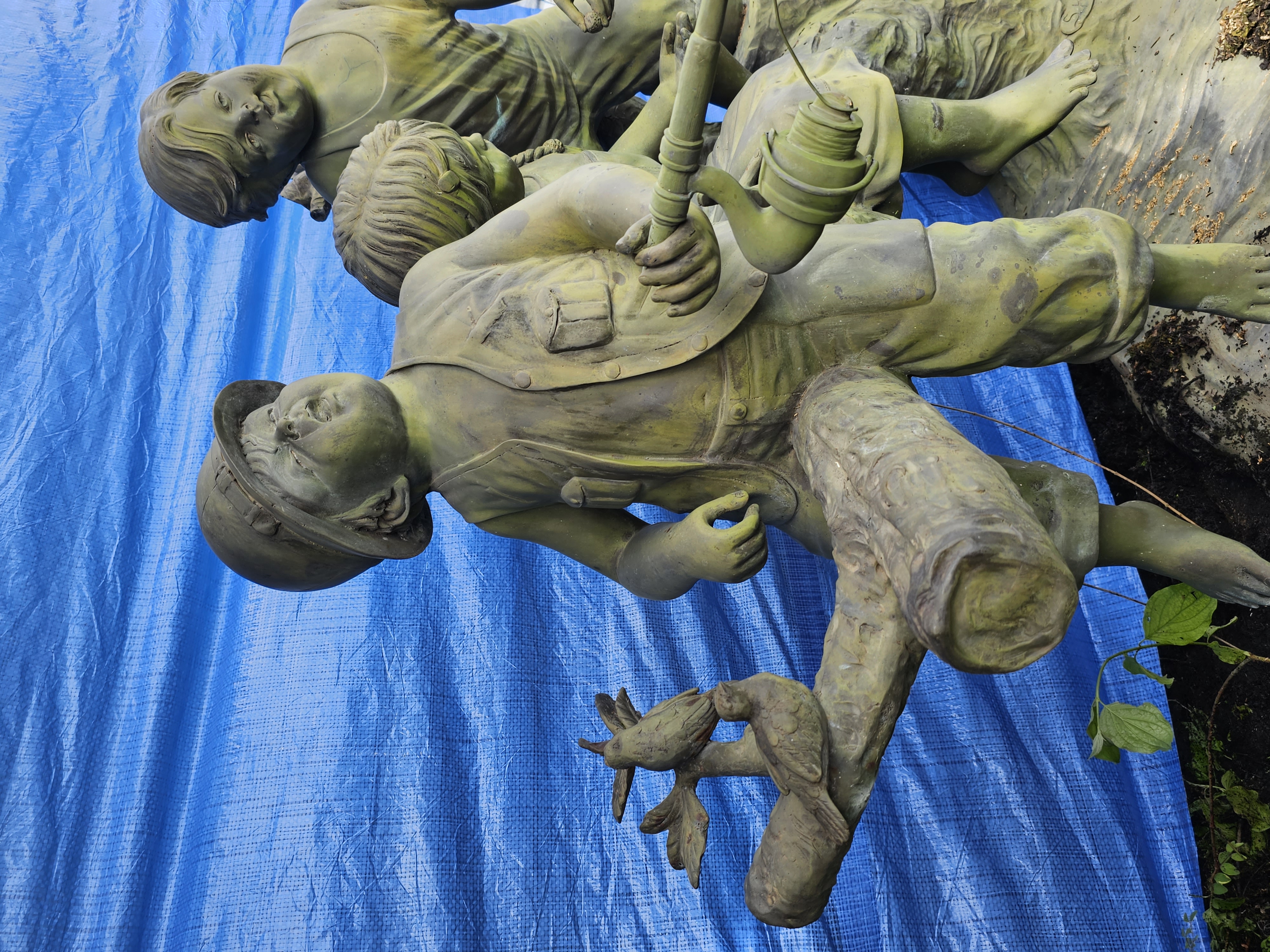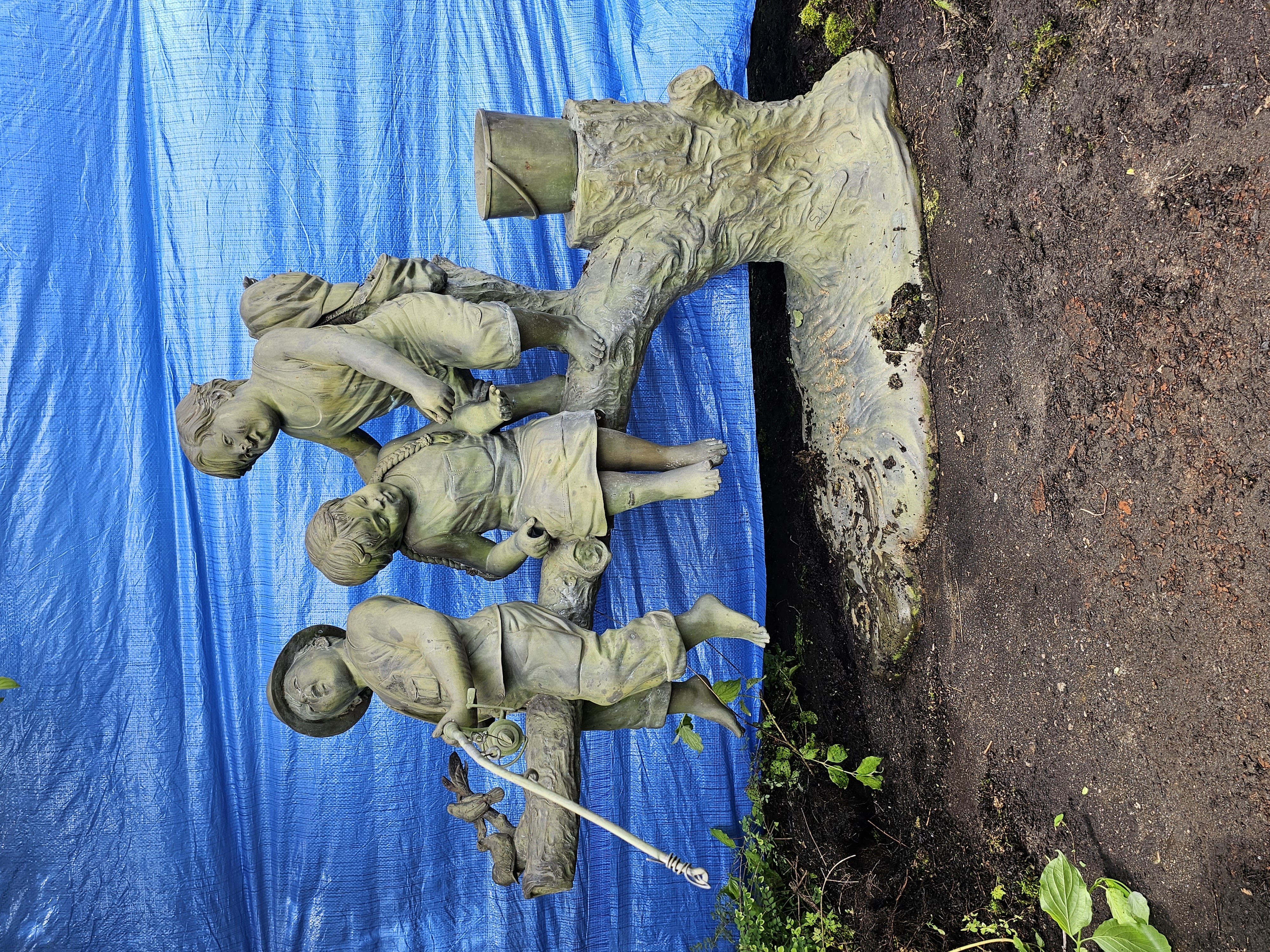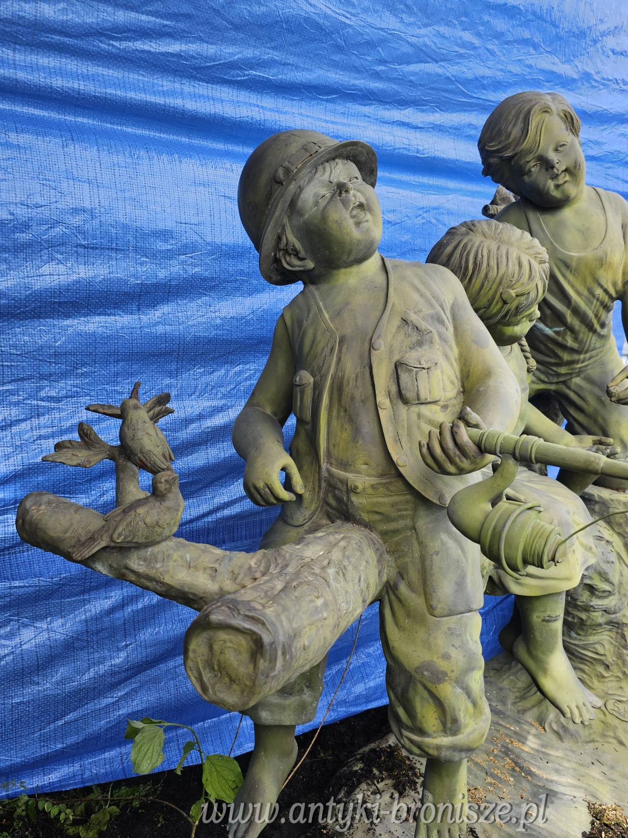 Przedstawiamy urokliwą fontannę „Dziecięca opowieść” — trójka dzieci na drzewie z radością łowi ryby, wprowadzając w ogród atmosferę radości, ciepła i beztroskiego szczęścia!