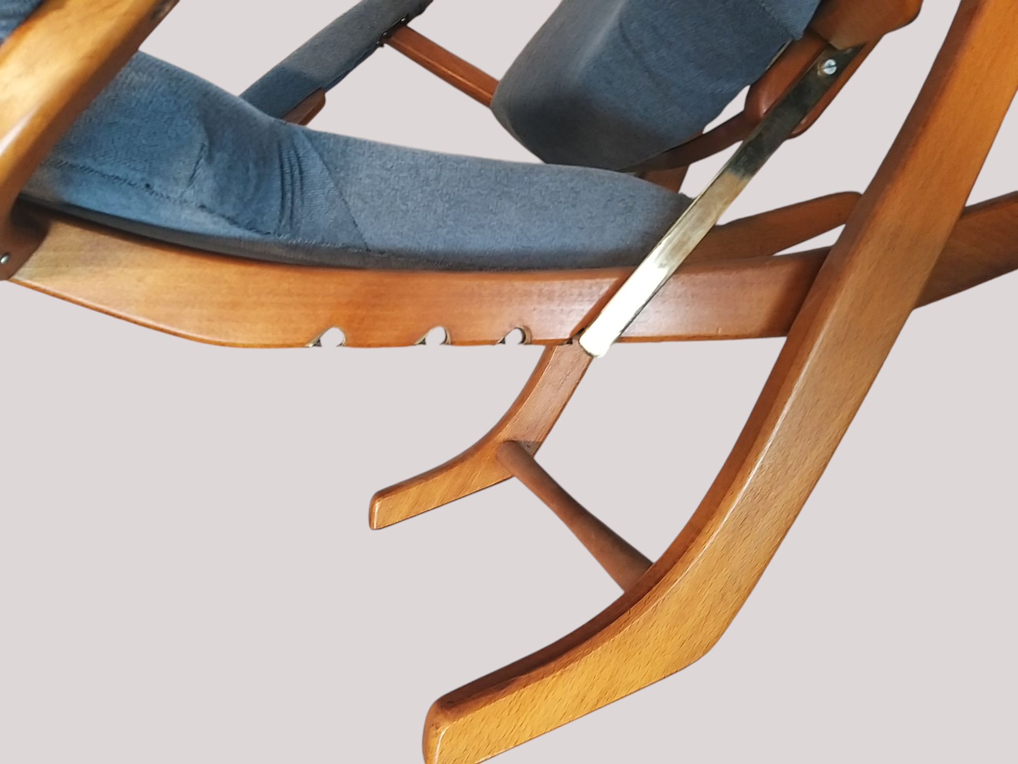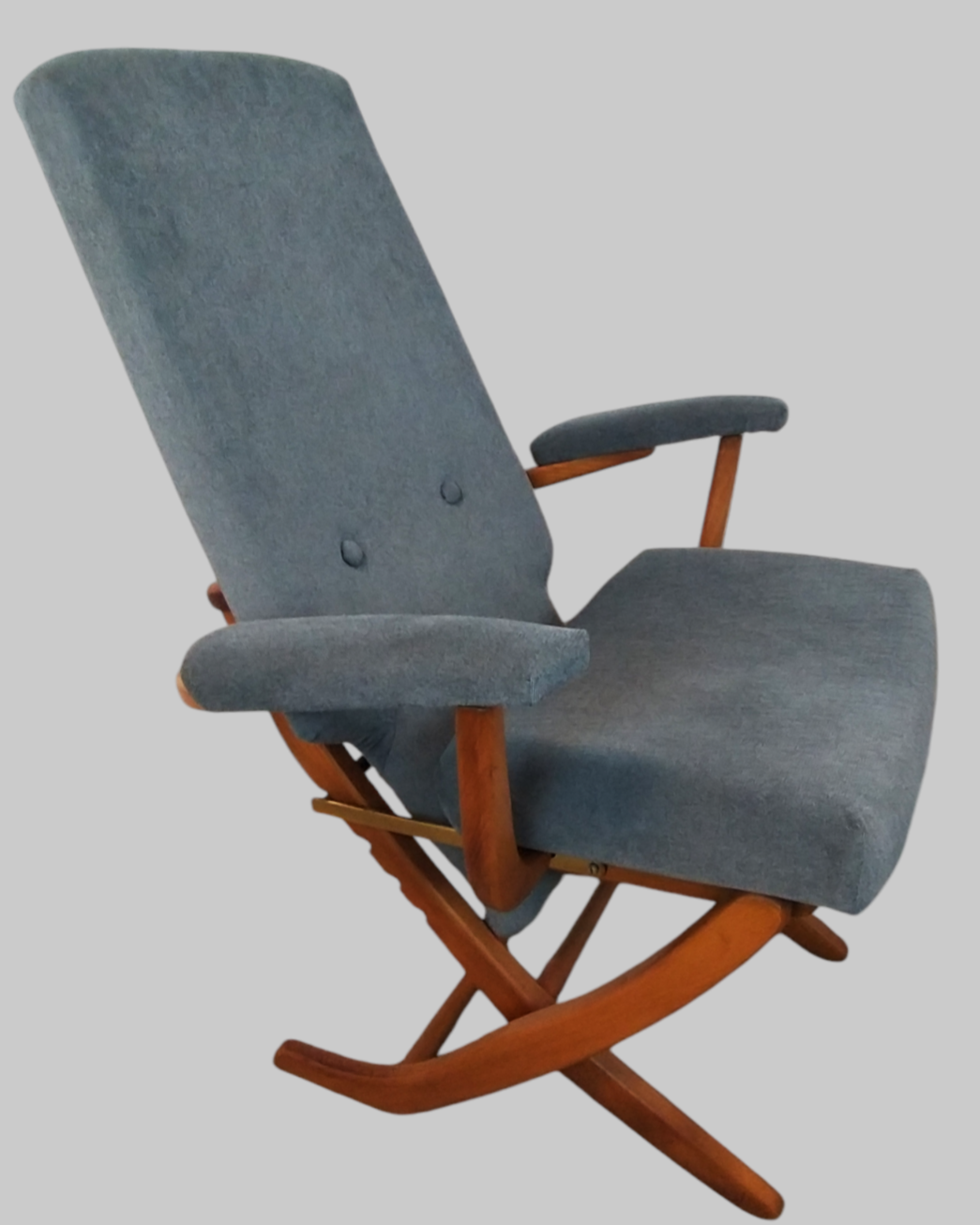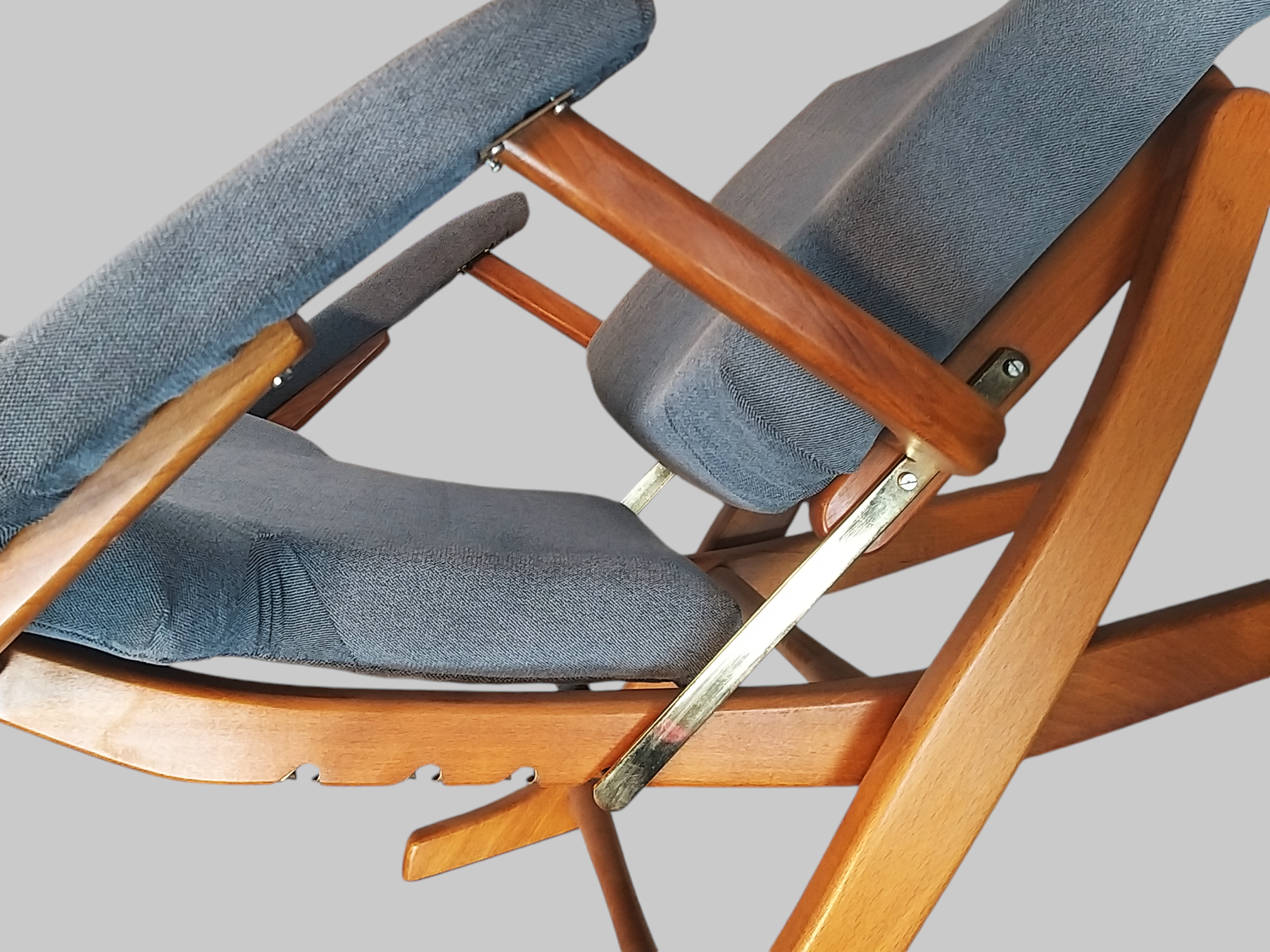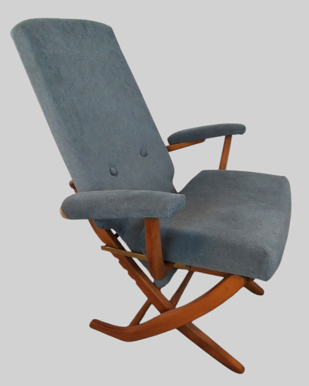 Wspaniały fotel relaksacyjny w skandynawskim stylu wyprodukowany we francuskiej firmie Polyconfort, model Poly-X. Regulowany z czteropozycyjnym metalowym systemem, można ustawić go w pozycji siedzącej, półleżącej i leżącej. Konstrukcja z drewna bukowego, nogi krzyżują się w kształcie litery X, tapicerka nowa, szara. Interesujący design z połowy XXw, niezwykle wygodny, praktyczny w bardzo dobrym stanie. Wymiary: 95x65x75 cm