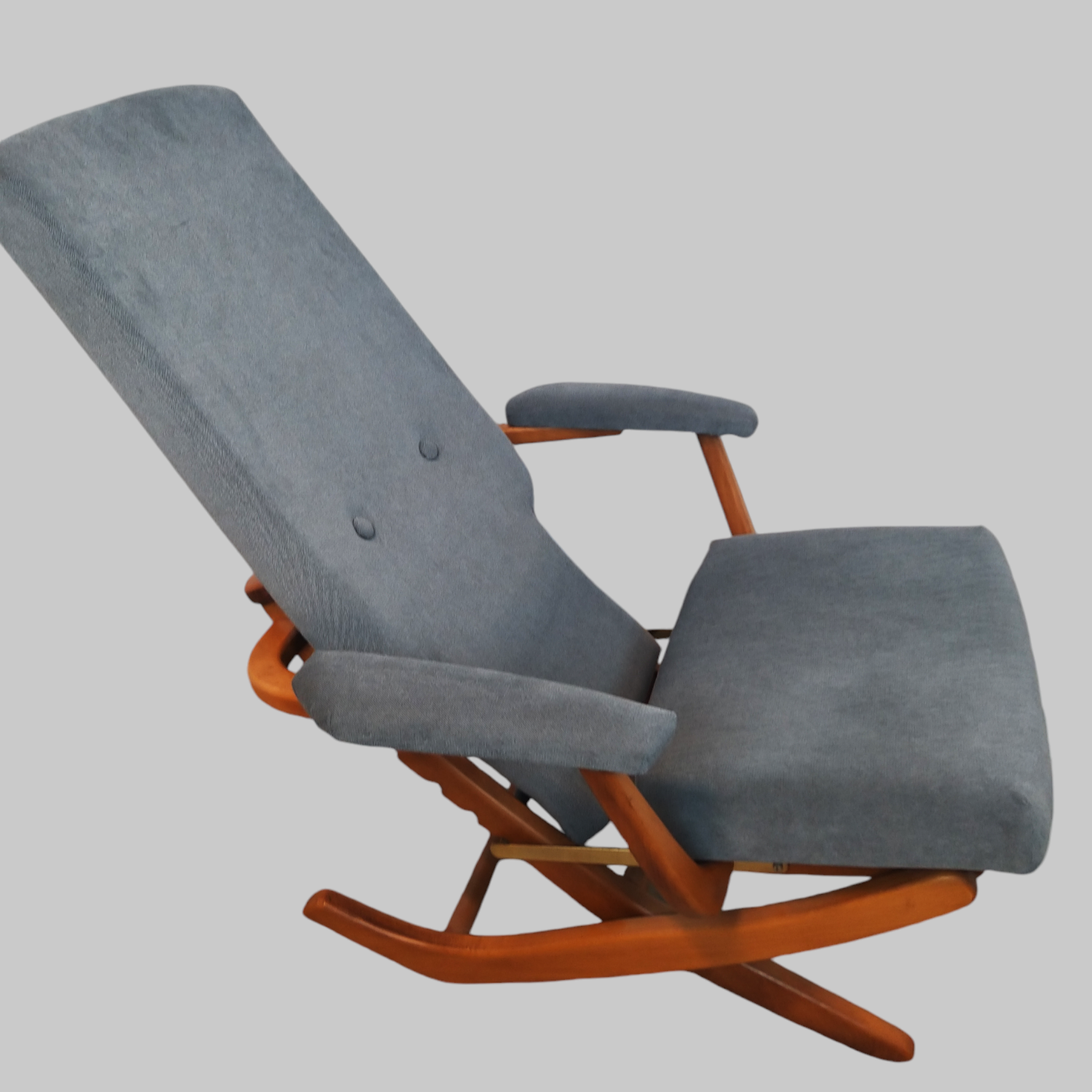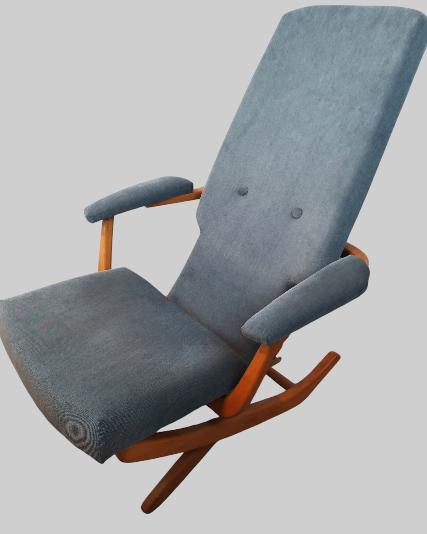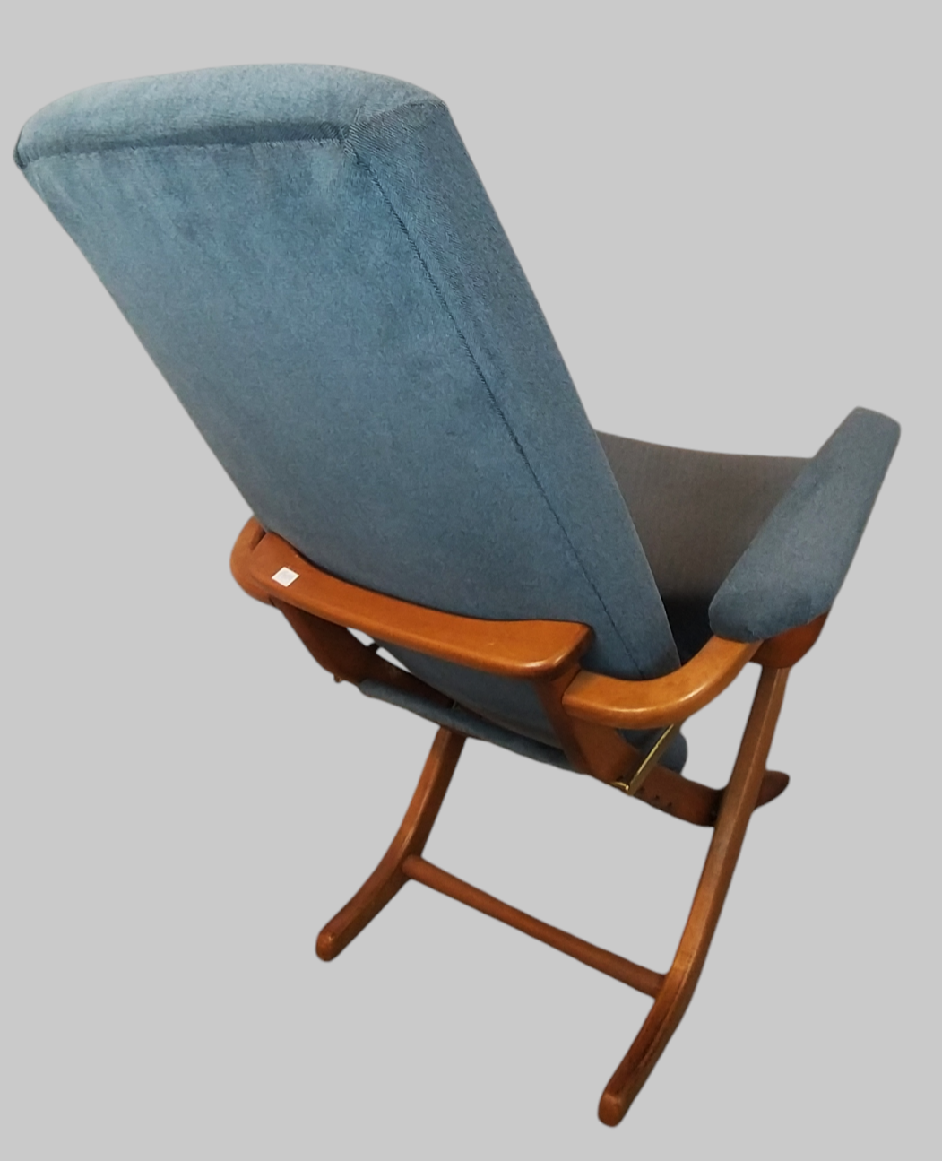 Wspaniały fotel relaksacyjny w skandynawskim stylu wyprodukowany we francuskiej firmie Polyconfort, model Poly-X. Regulowany z czteropozycyjnym metalowym systemem, można ustawić go w pozycji siedzącej, półleżącej i leżącej. Konstrukcja z drewna bukowego, nogi krzyżują się w kształcie litery X, tapicerka nowa, szara. Interesujący design z połowy XXw, niezwykle wygodny, praktyczny w bardzo dobrym stanie. Wymiary: 95x65x75 cm