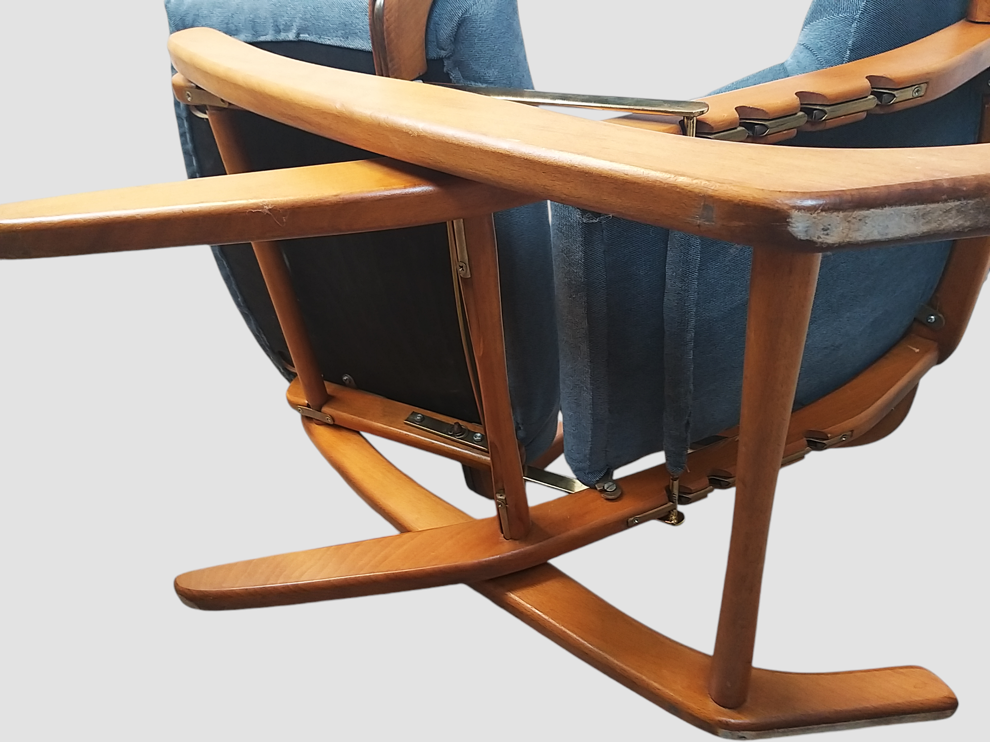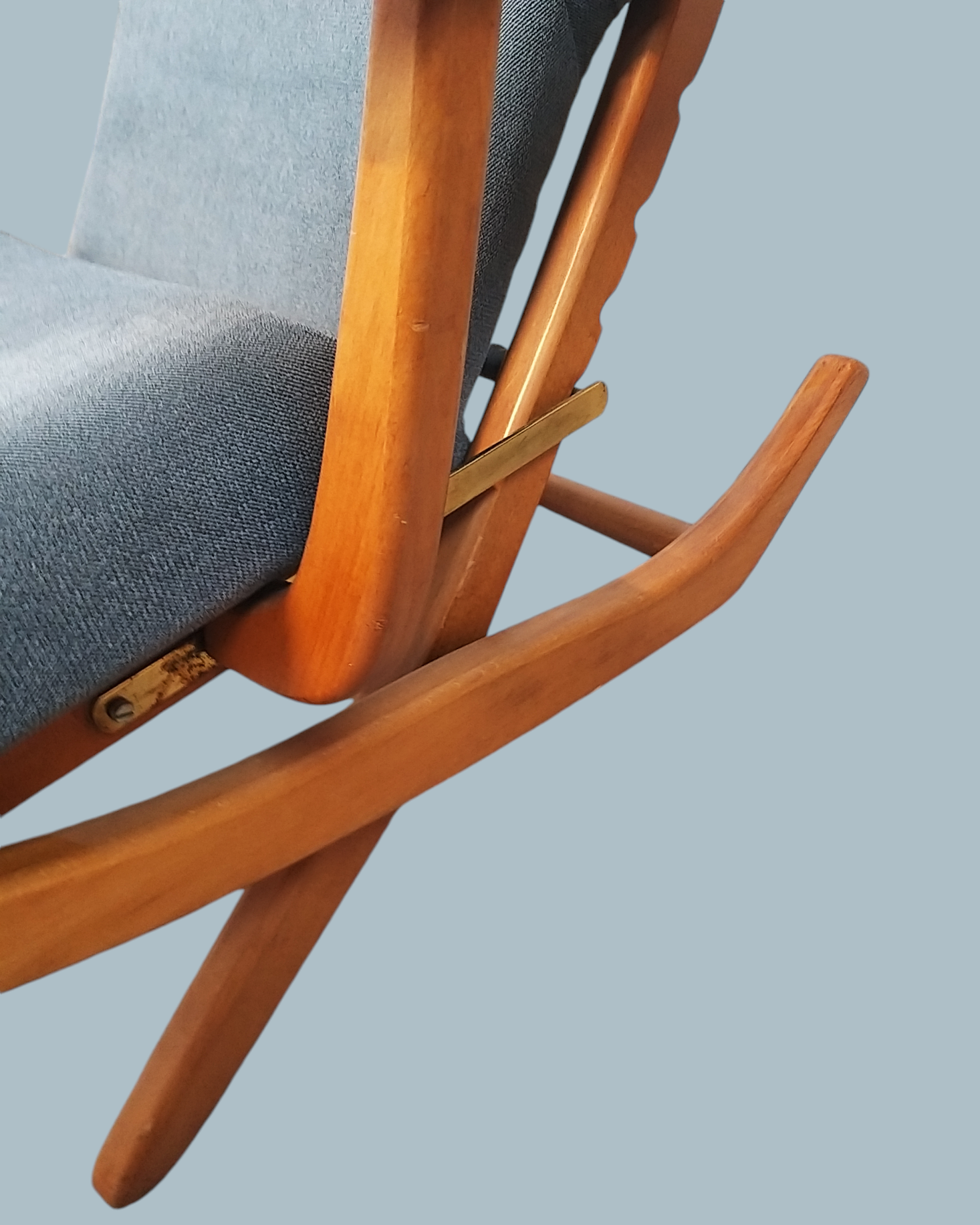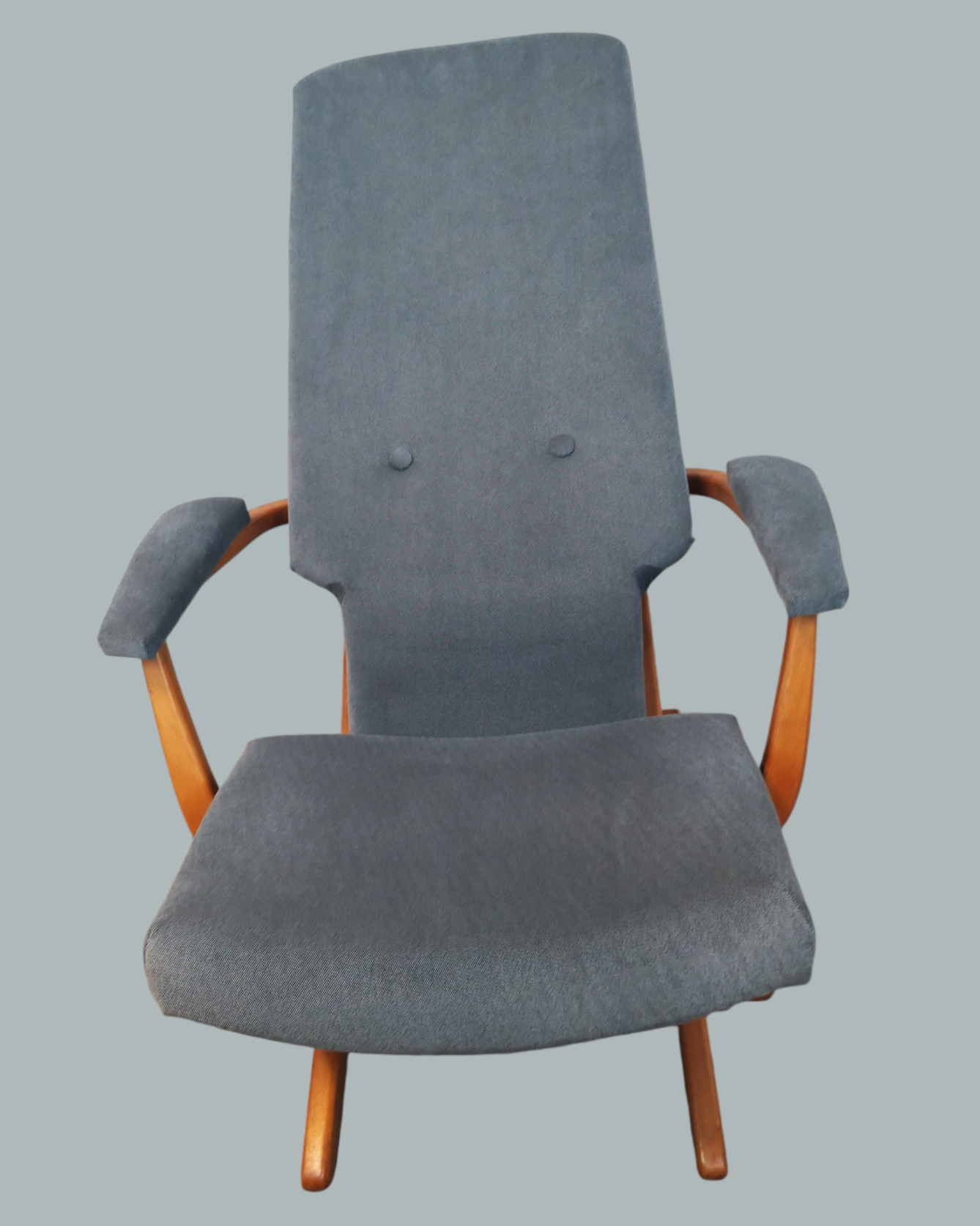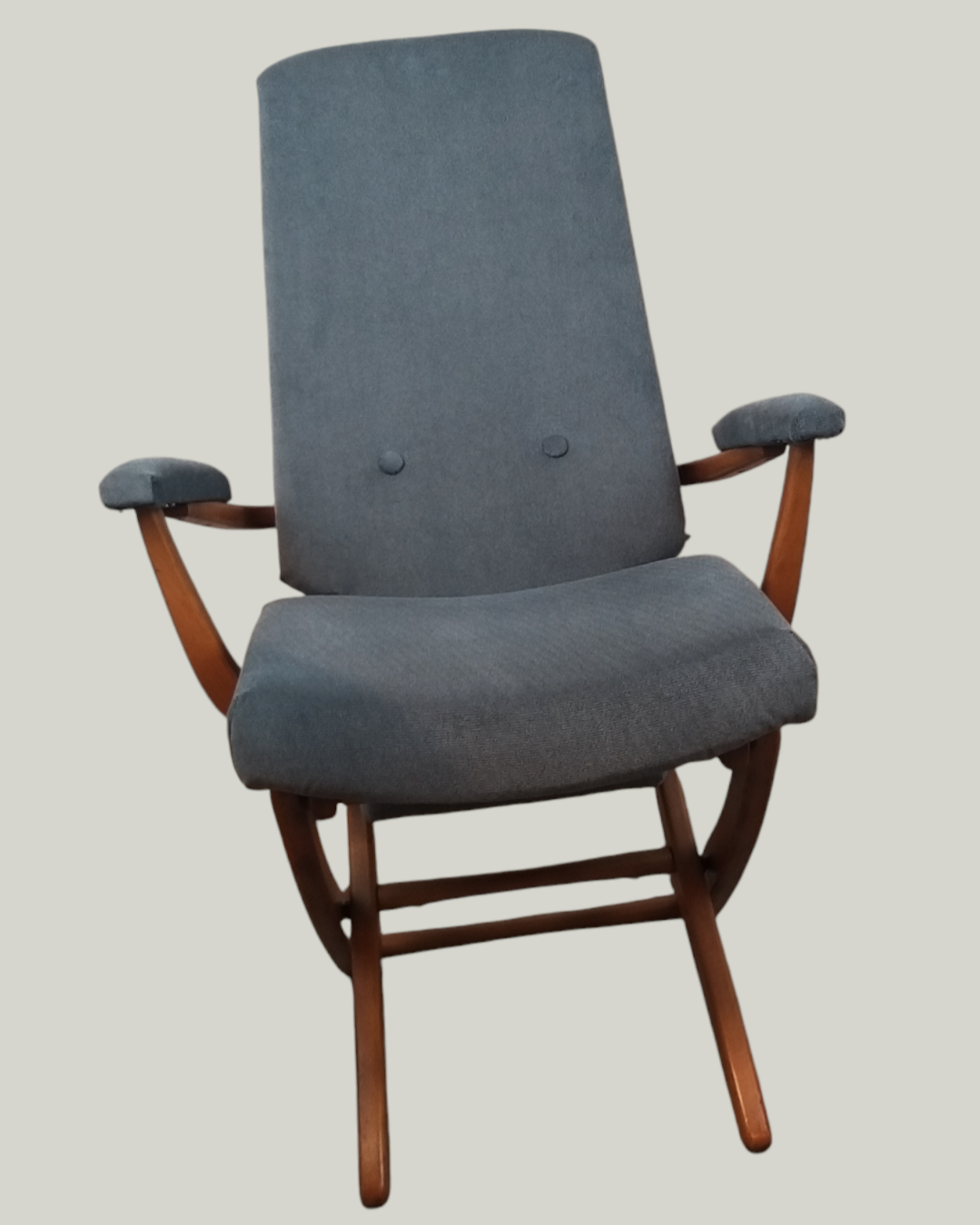 Wspaniały fotel relaksacyjny w skandynawskim stylu wyprodukowany we francuskiej firmie Polyconfort, model Poly-X. Regulowany z czteropozycyjnym metalowym systemem, można ustawić go w pozycji siedzącej, półleżącej i leżącej. Konstrukcja z drewna bukowego, nogi krzyżują się w kształcie litery X, tapicerka nowa, szara. Interesujący design z połowy XXw, niezwykle wygodny, praktyczny w bardzo dobrym stanie. Wymiary: 95x65x75 cm