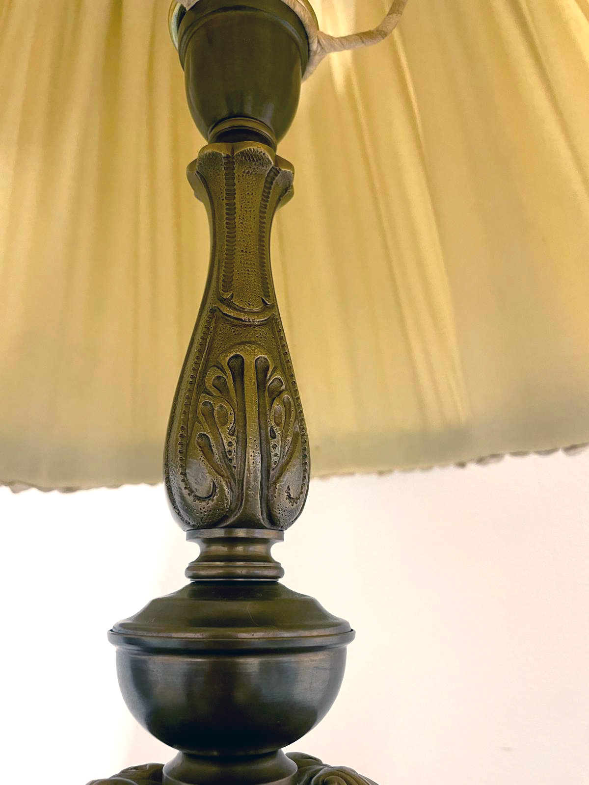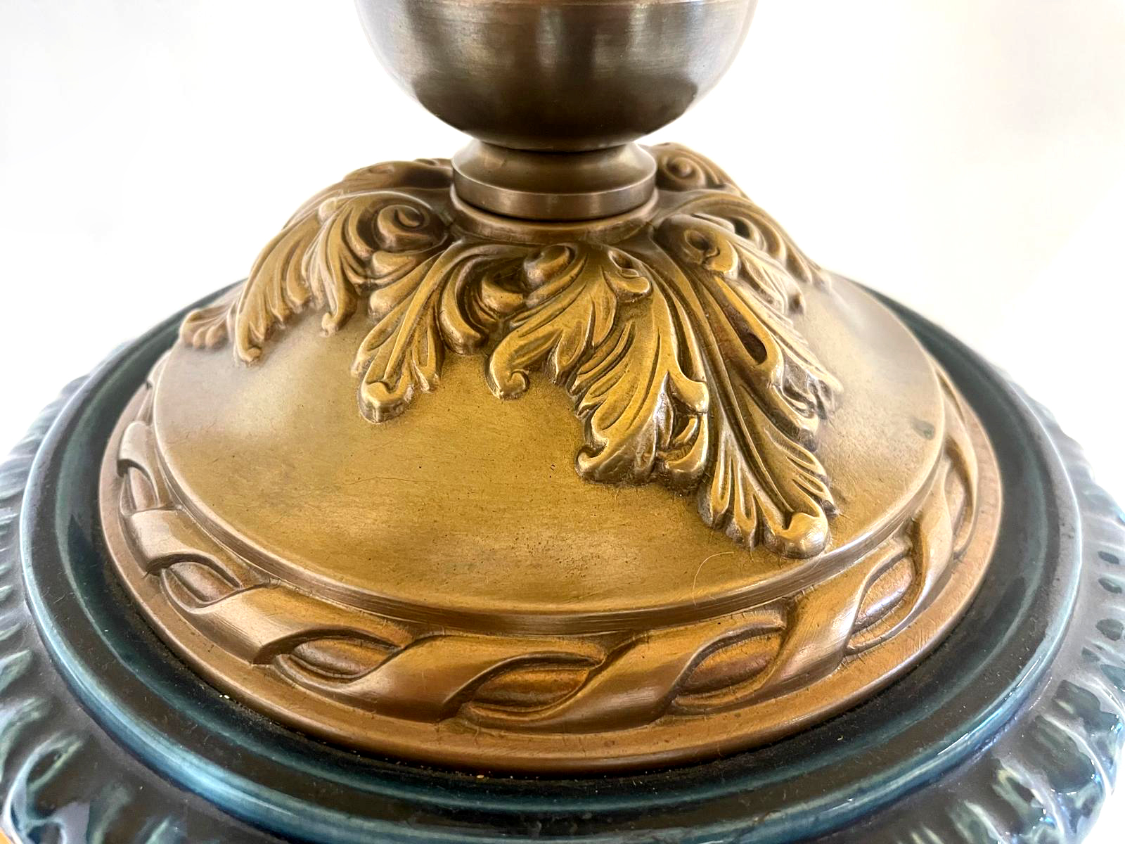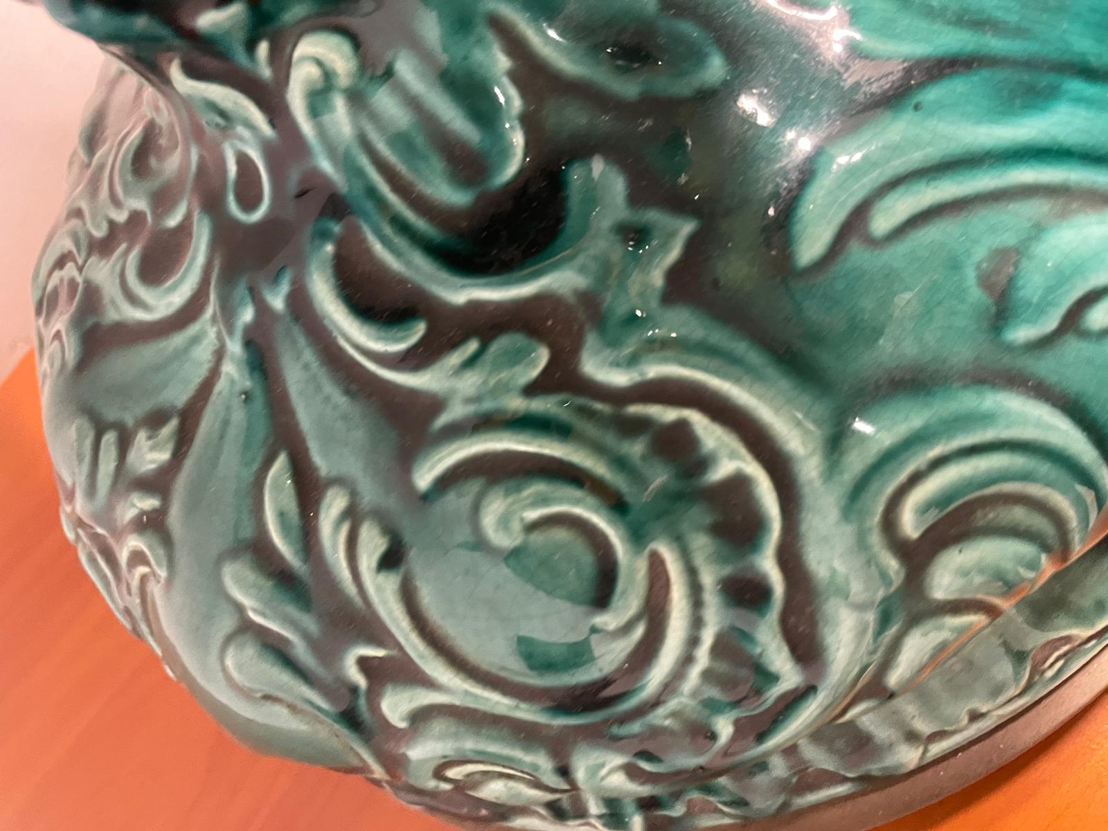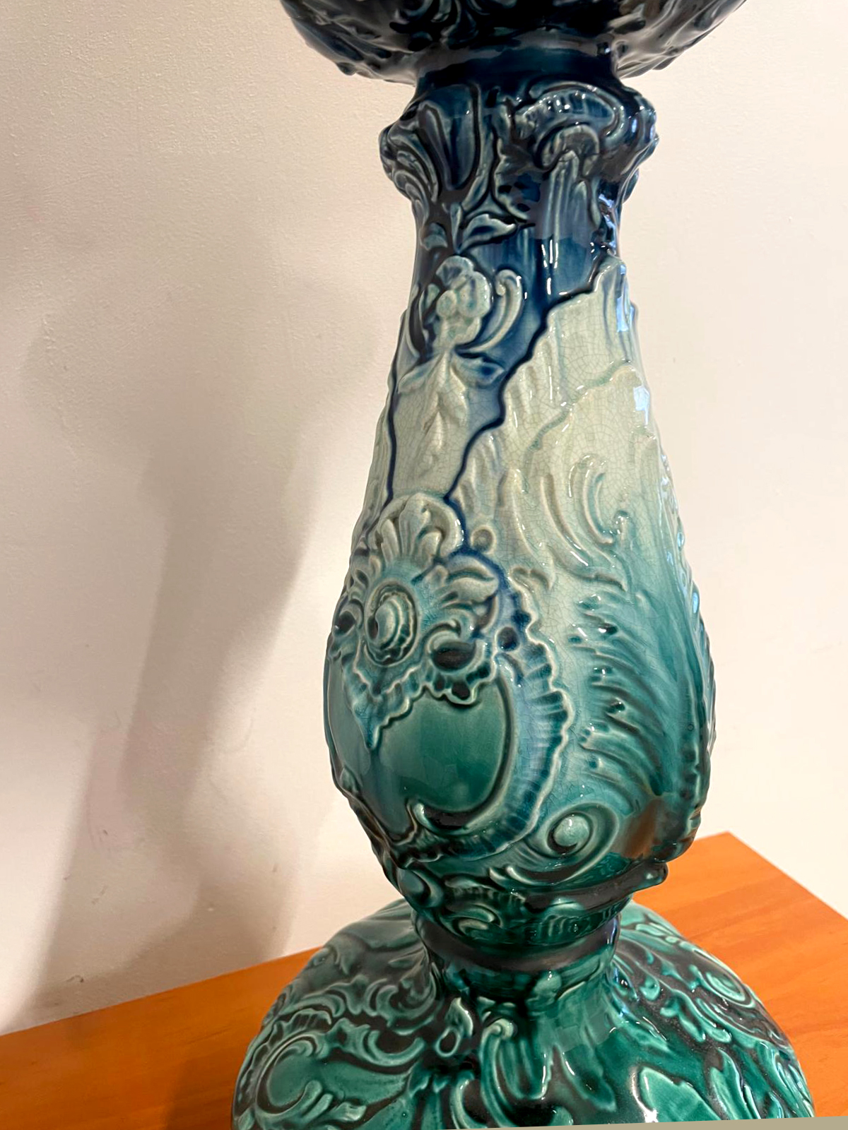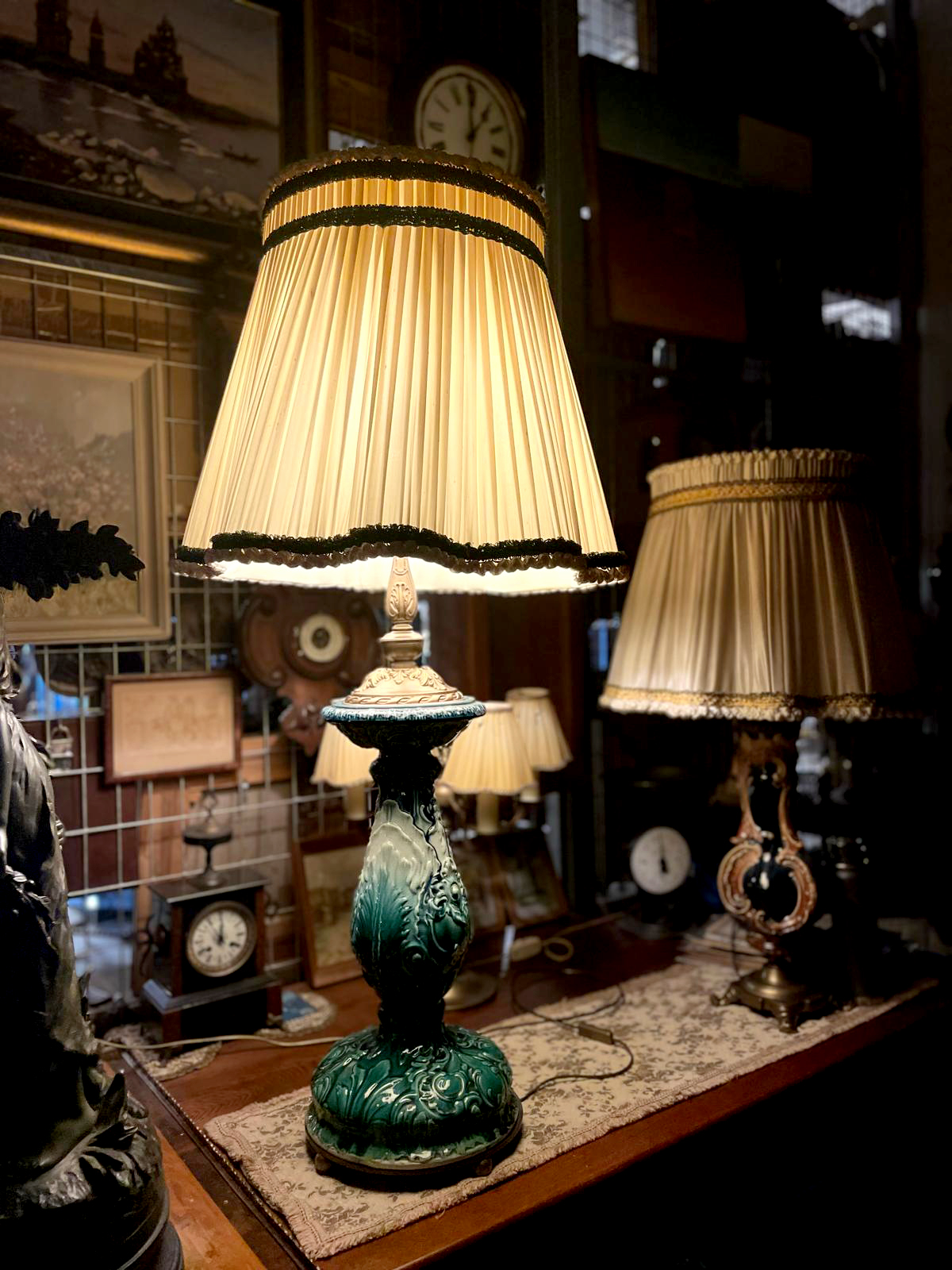 Elegancka lampa stołowa wykonana z majoliki, pochodząca z Francji. Podstawa oraz trzon lampy ozdobione są bogatym, wypukłym ornamentem roślinnym. Lampa została przerobiona z wersji naftowej na elektryczną. Zachowując przy tym swój oryginalny wygląd.