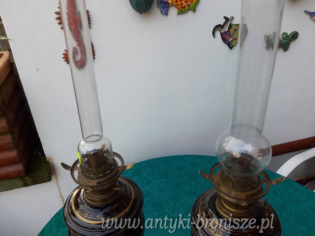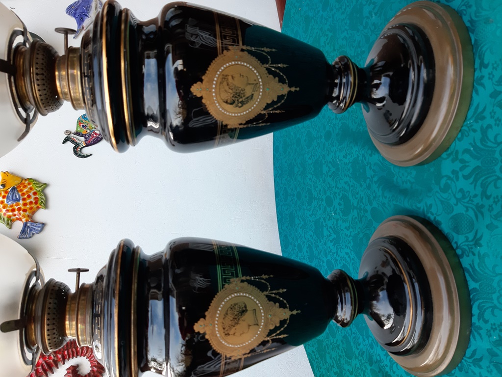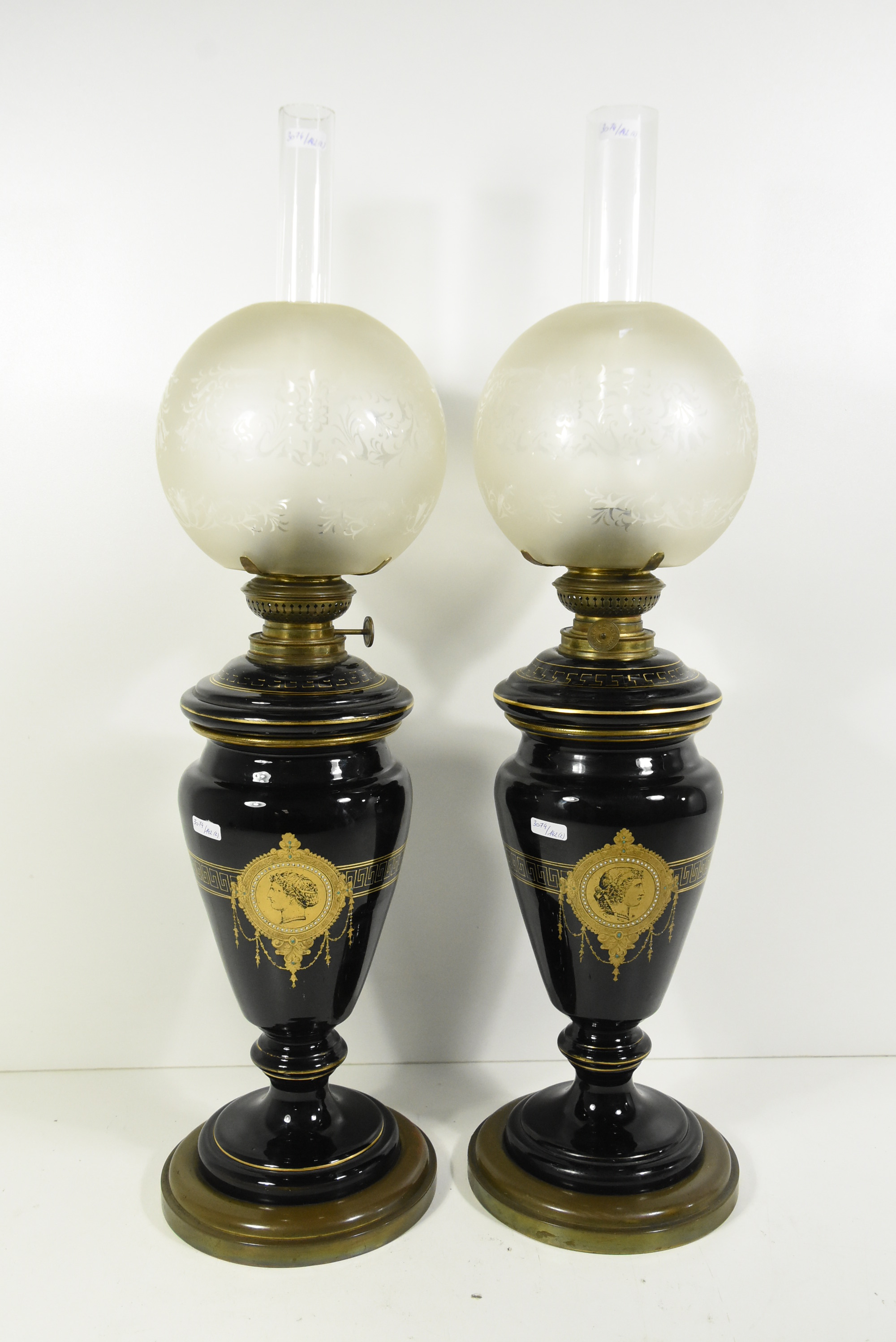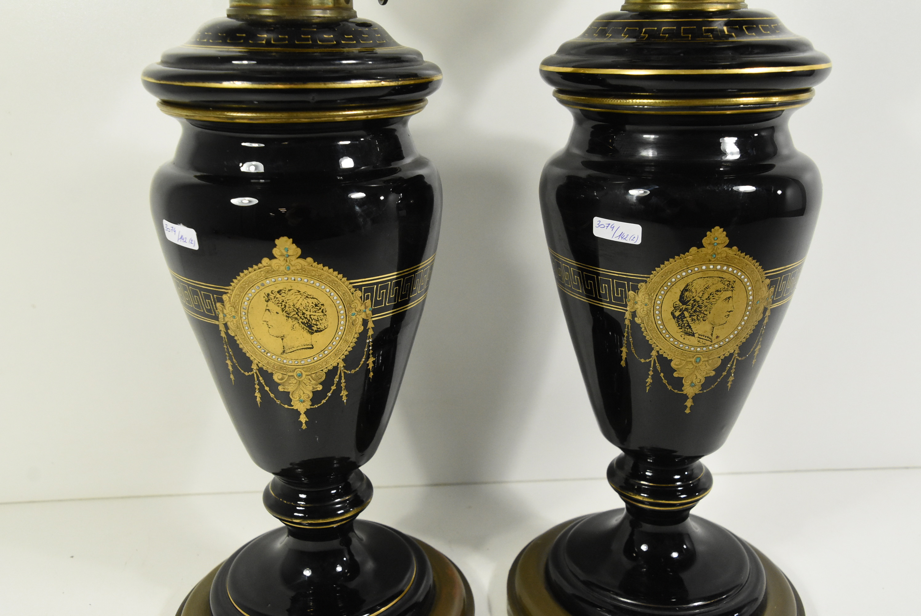 Poz. 6824 - Imponujaca para lamp naftowych (2 szt.) z matowymi abażurami, szklanymi kominkami. Czarne szklane korpusy ze złotymi portretami oraz freskiem w stylu antycznym, złocenia na obrzeżach - H: 68cm, Europa Zachodnia XIX/XX w