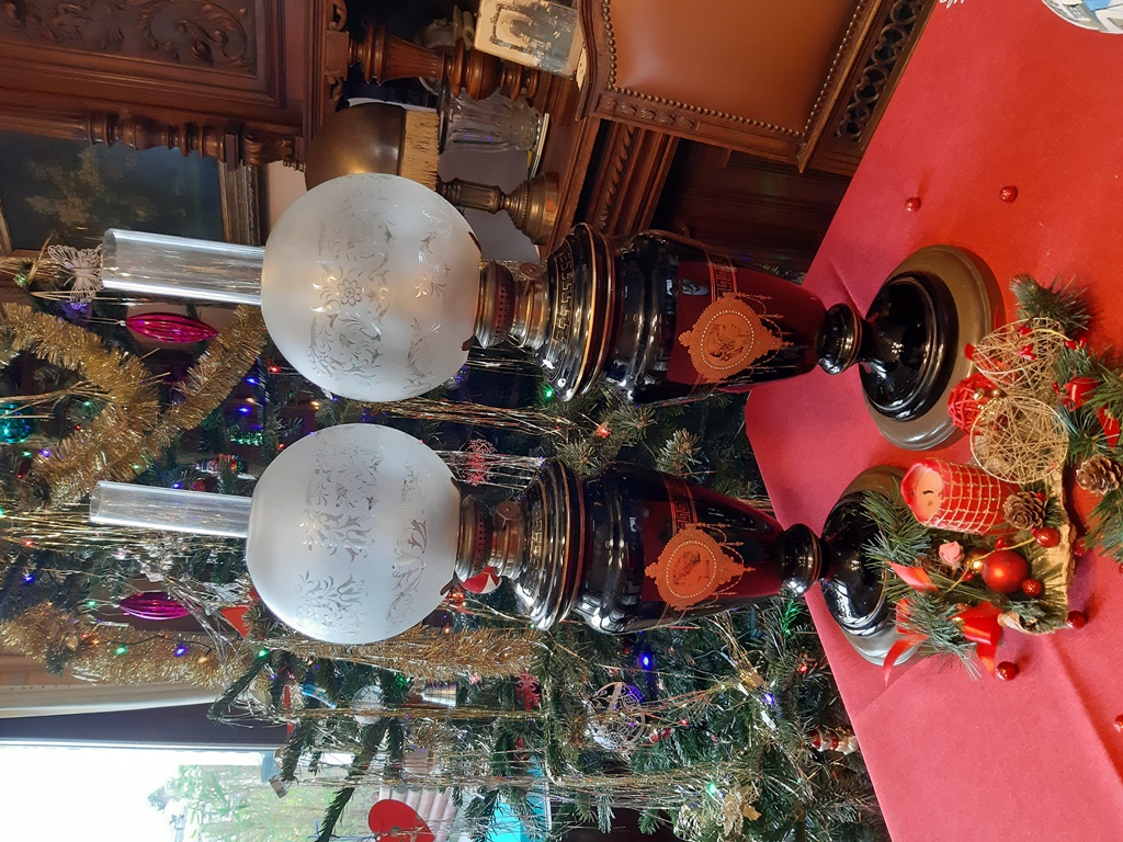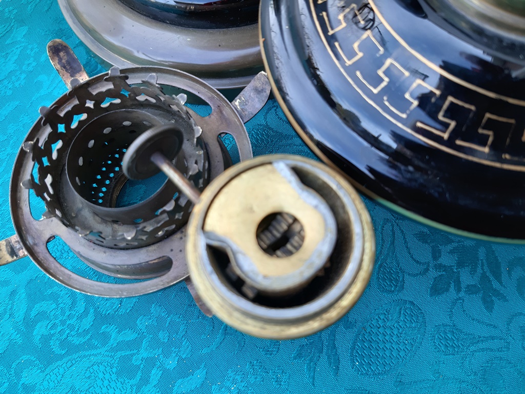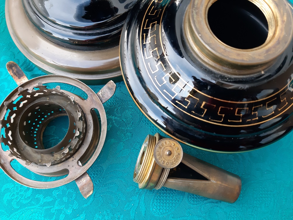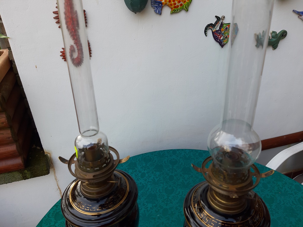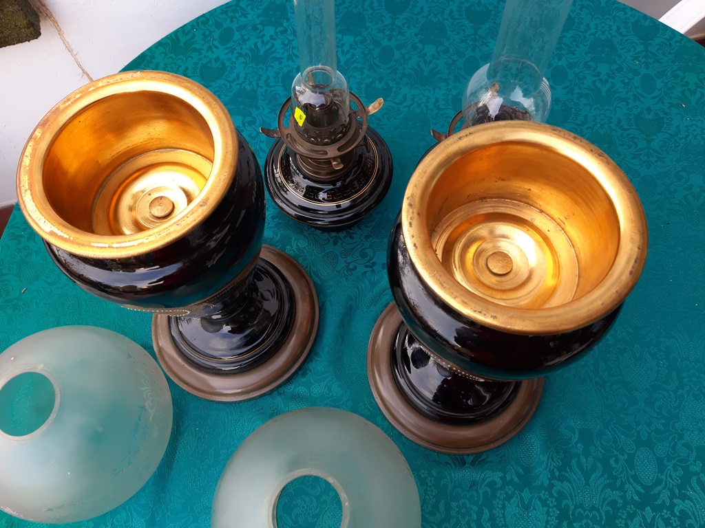 Poz. 6824 - Imponujaca para lamp naftowych (2 szt.) z matowymi abażurami, szklanymi kominkami. Czarne szklane korpusy ze złotymi portretami oraz freskiem w stylu antycznym, złocenia na obrzeżach - H: 68cm, Europa Zachodnia XIX/XX w