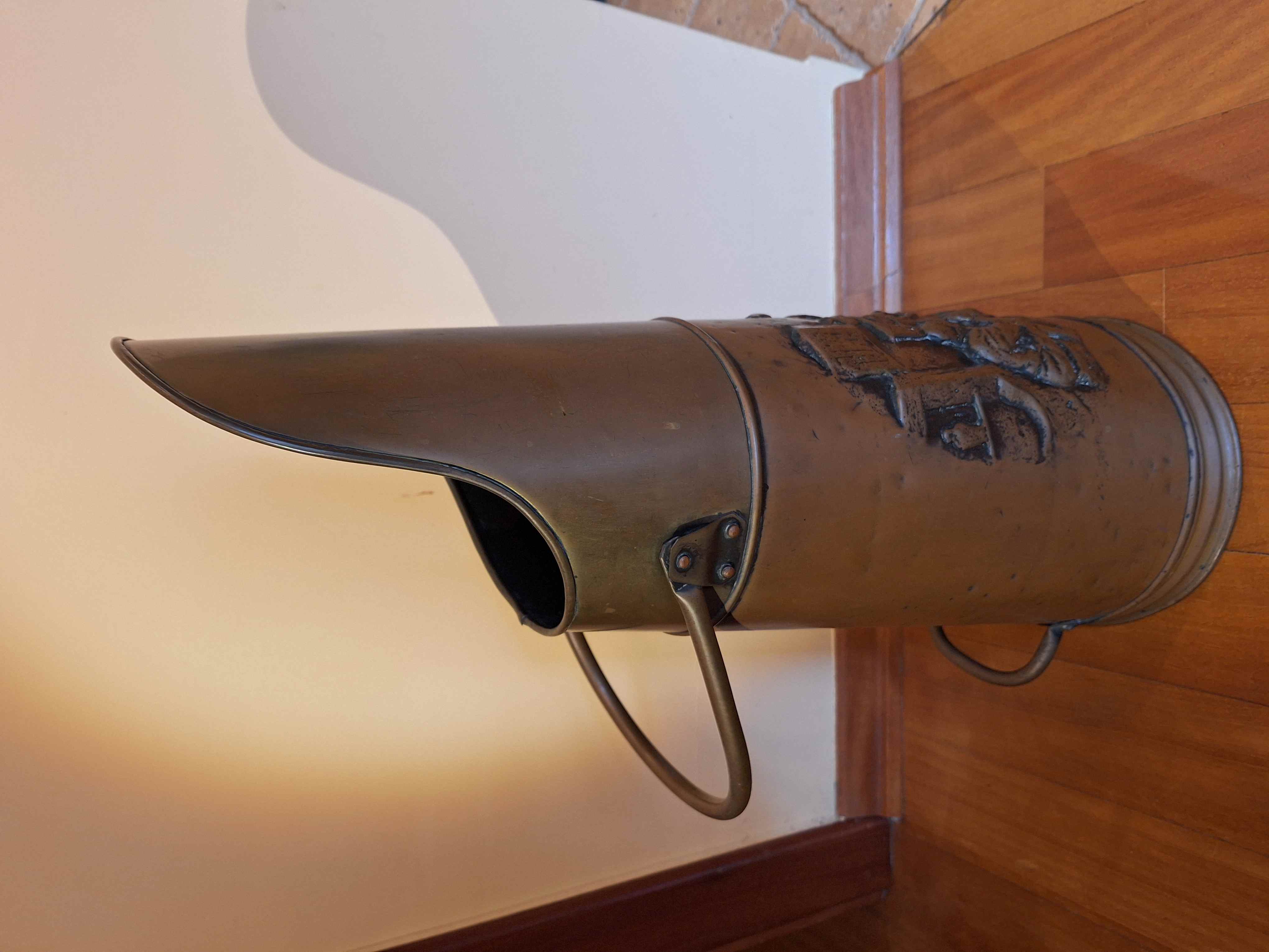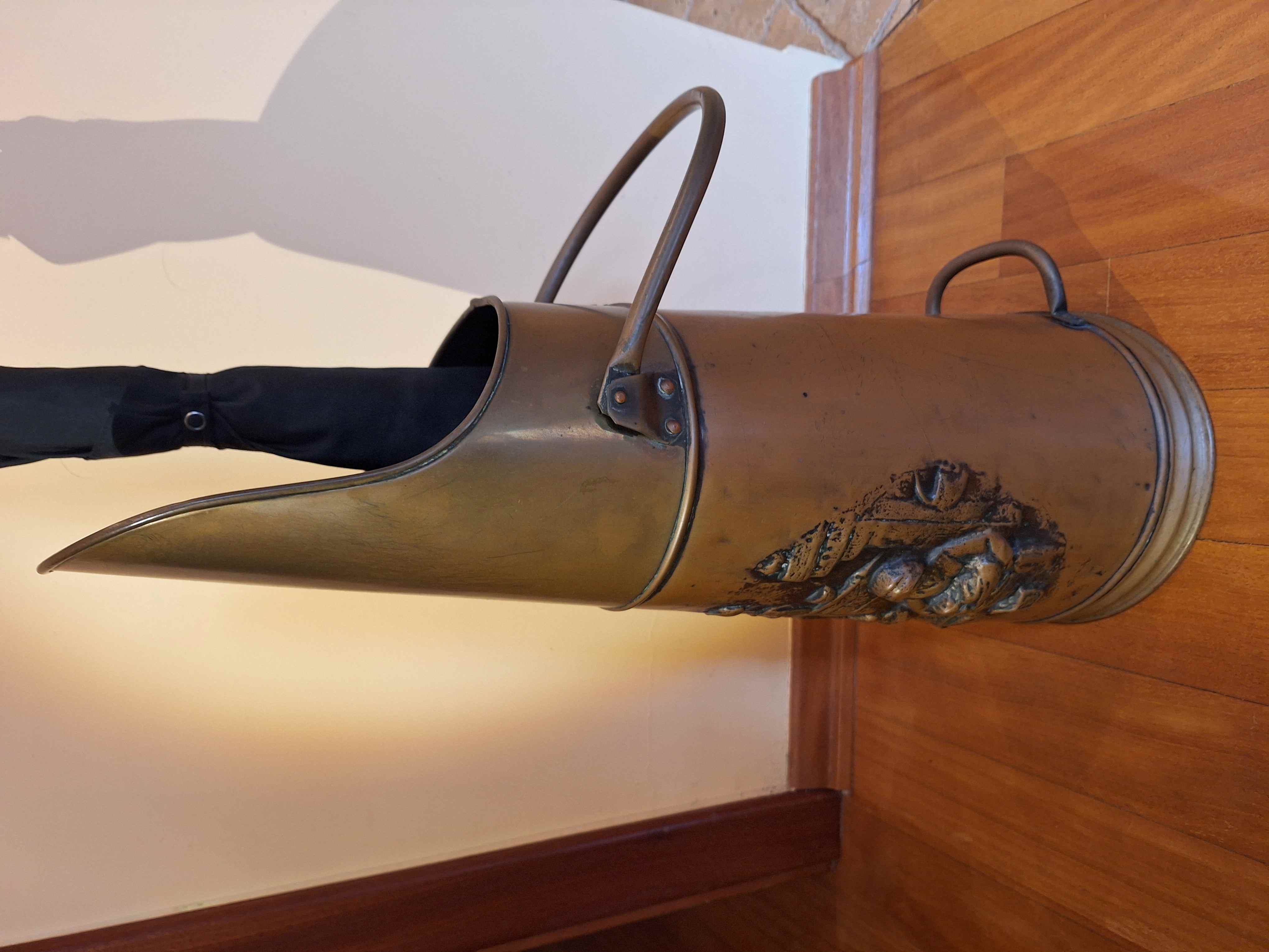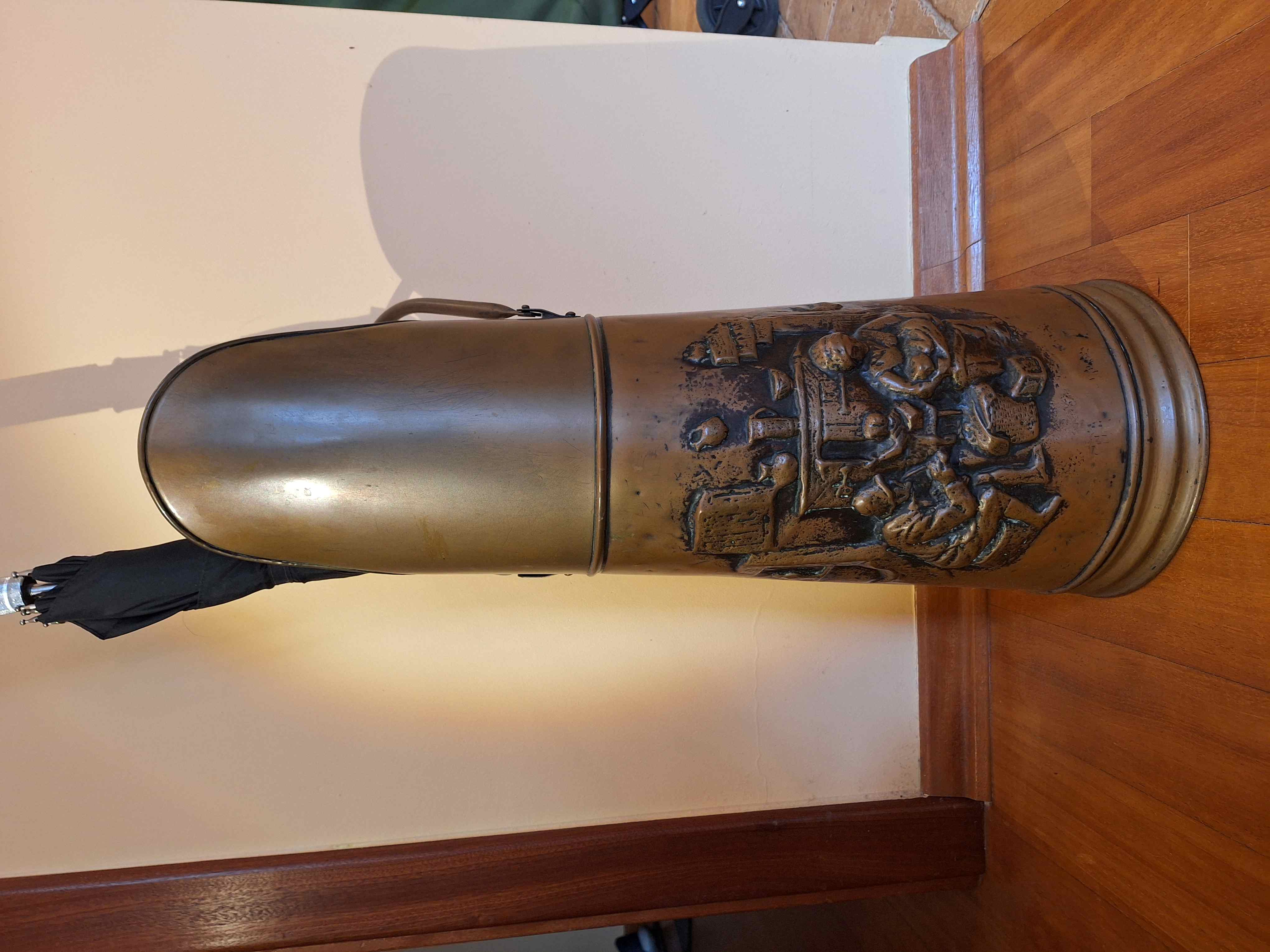 2770 - Parasolnica miedziana z gleboko tloczona plaskorzezba "Scena w kuchni", z dolnym uchwytem i z raczka // H:60 cm, dia podstawy 21,5cm