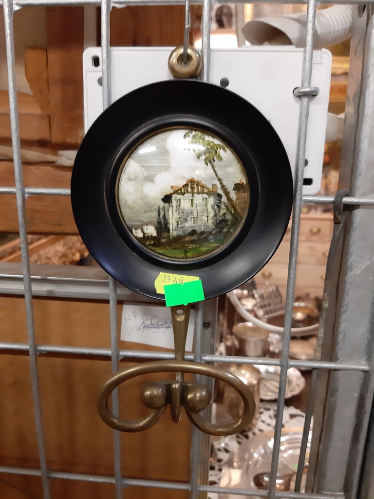 2739 - Wieszak z brazu z aplikacja w formie okraglego, wypuklego obrazka (emalia) - H:20cm, dia 11cm