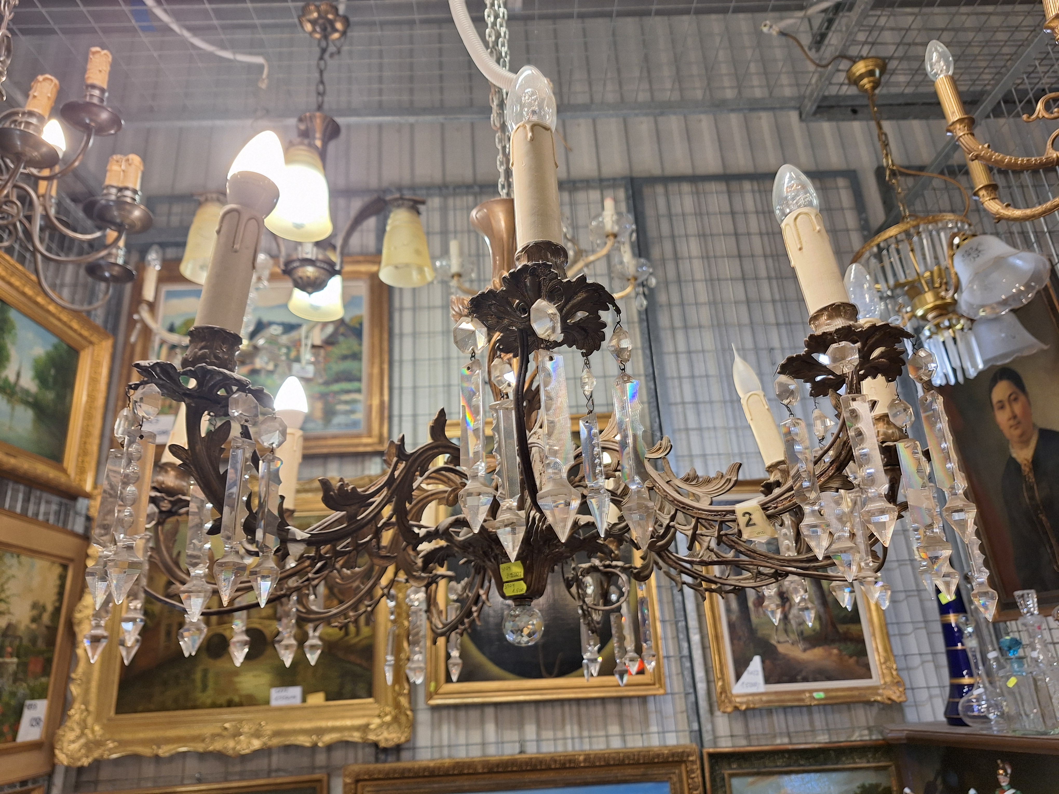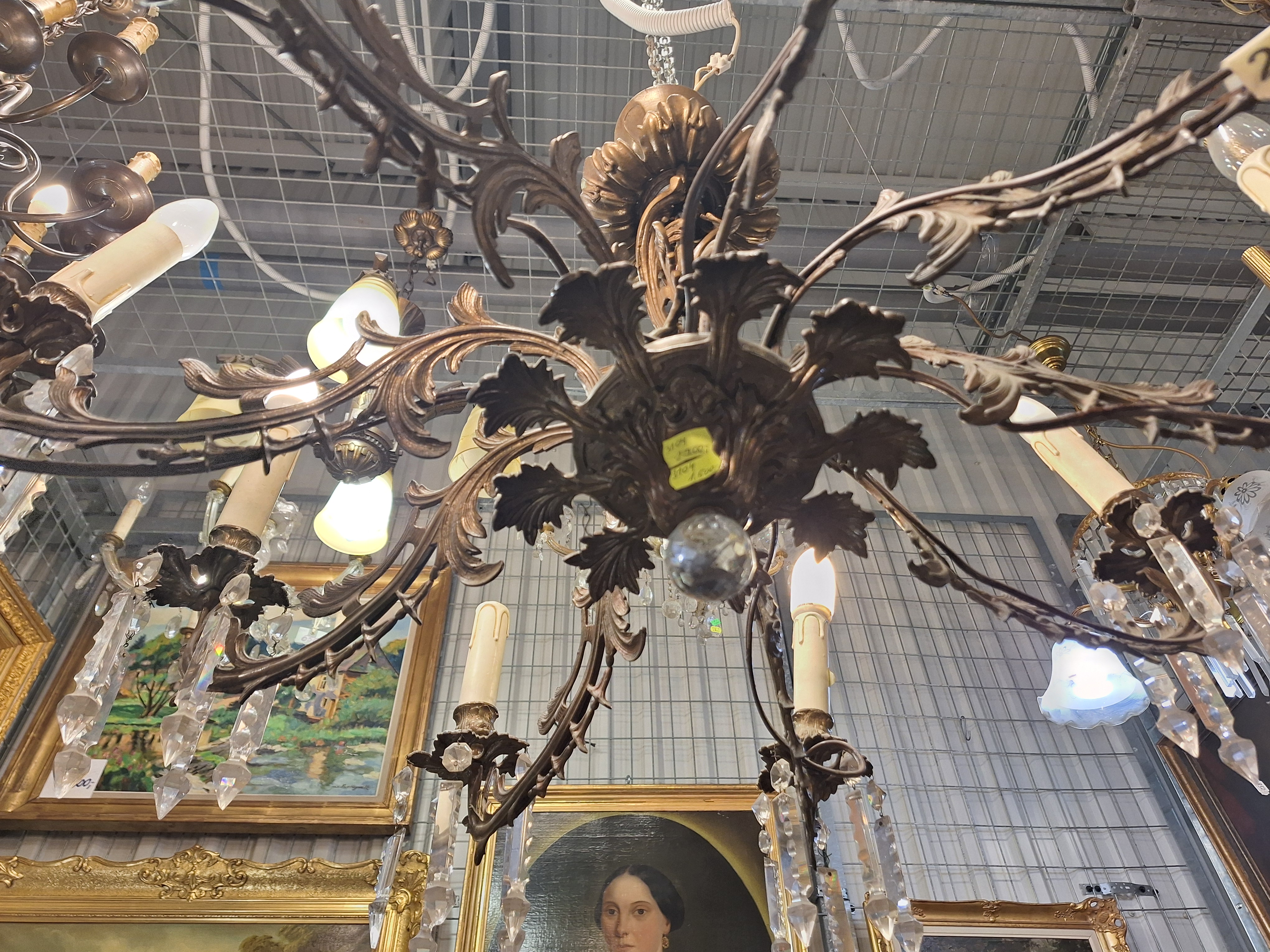 3104 - Zyrandol z brazu 8-ramienny, z lezkami i wisiorkami szlifowanych krysztalkow, z krysztalowa kula od spodu
