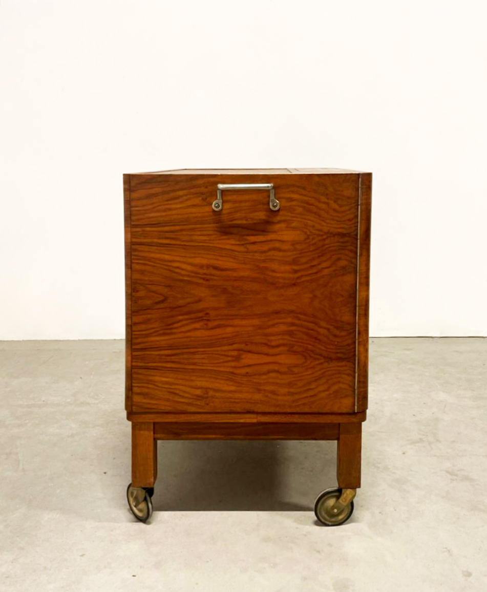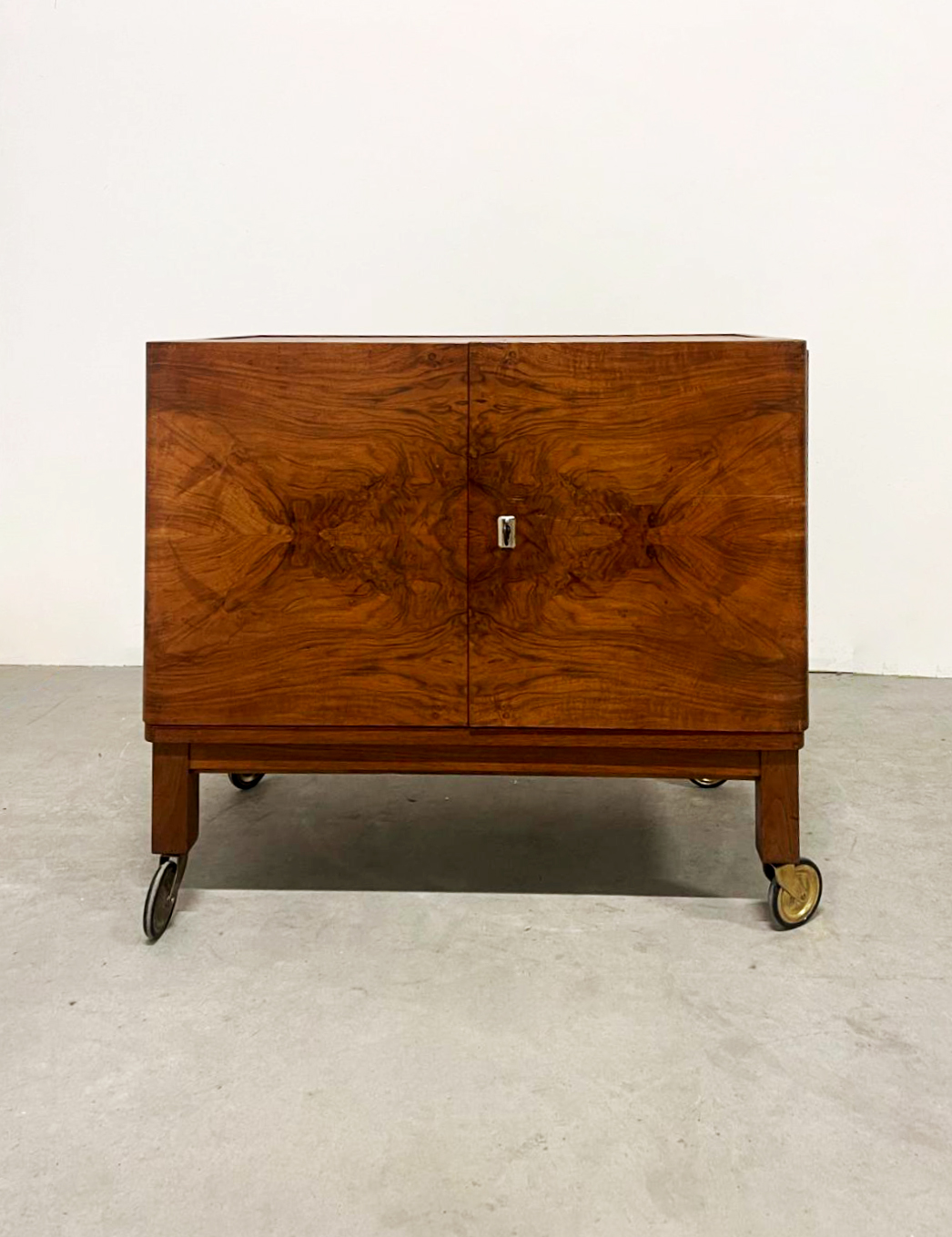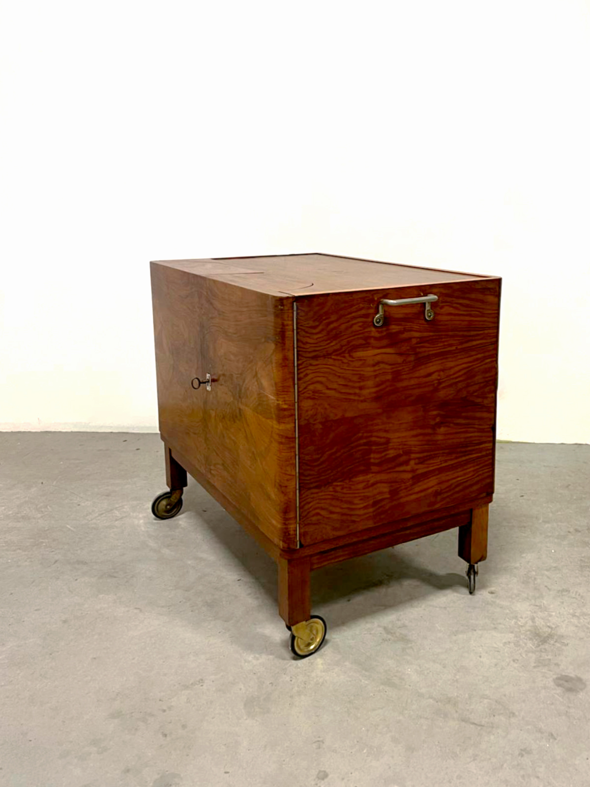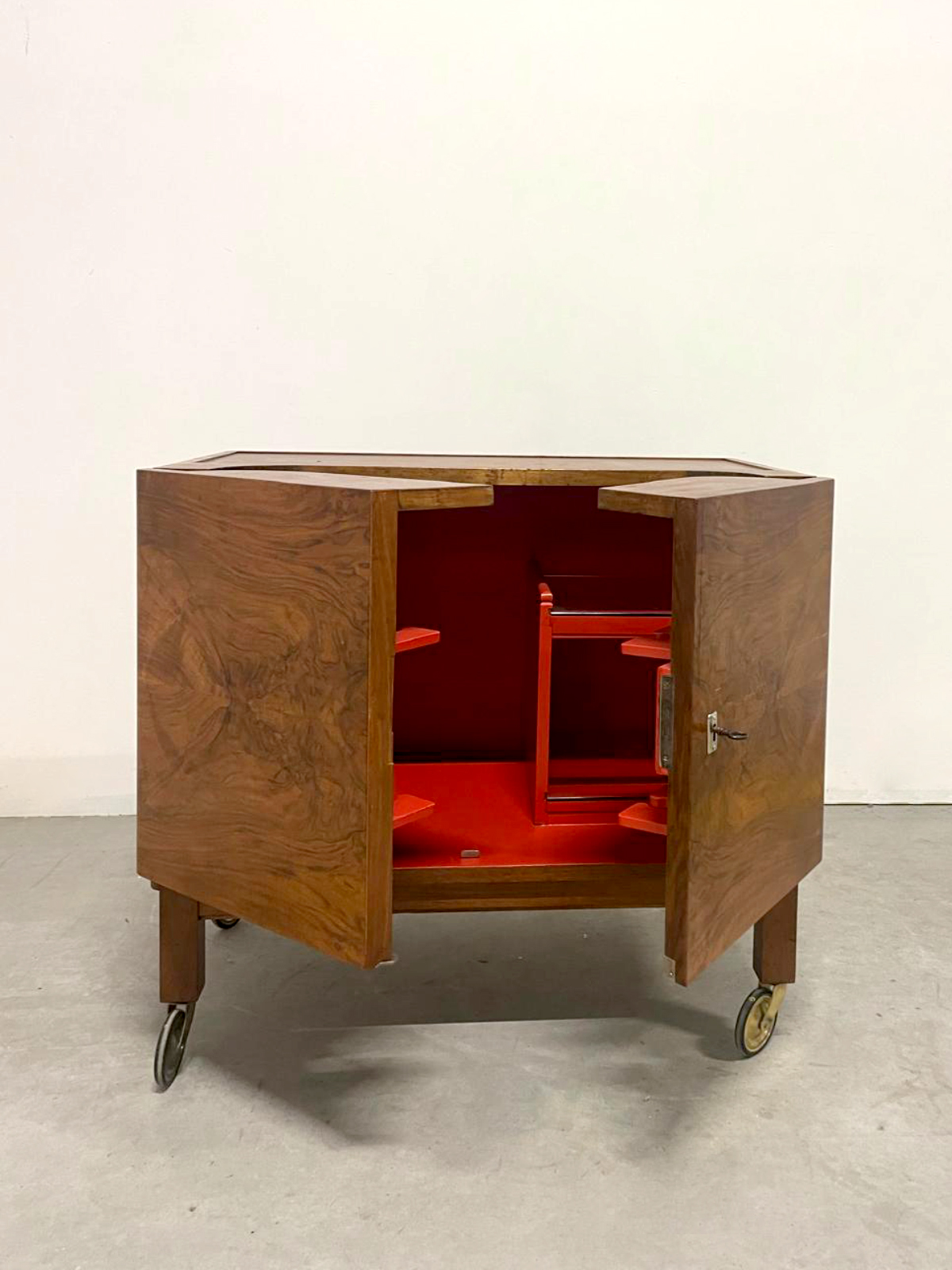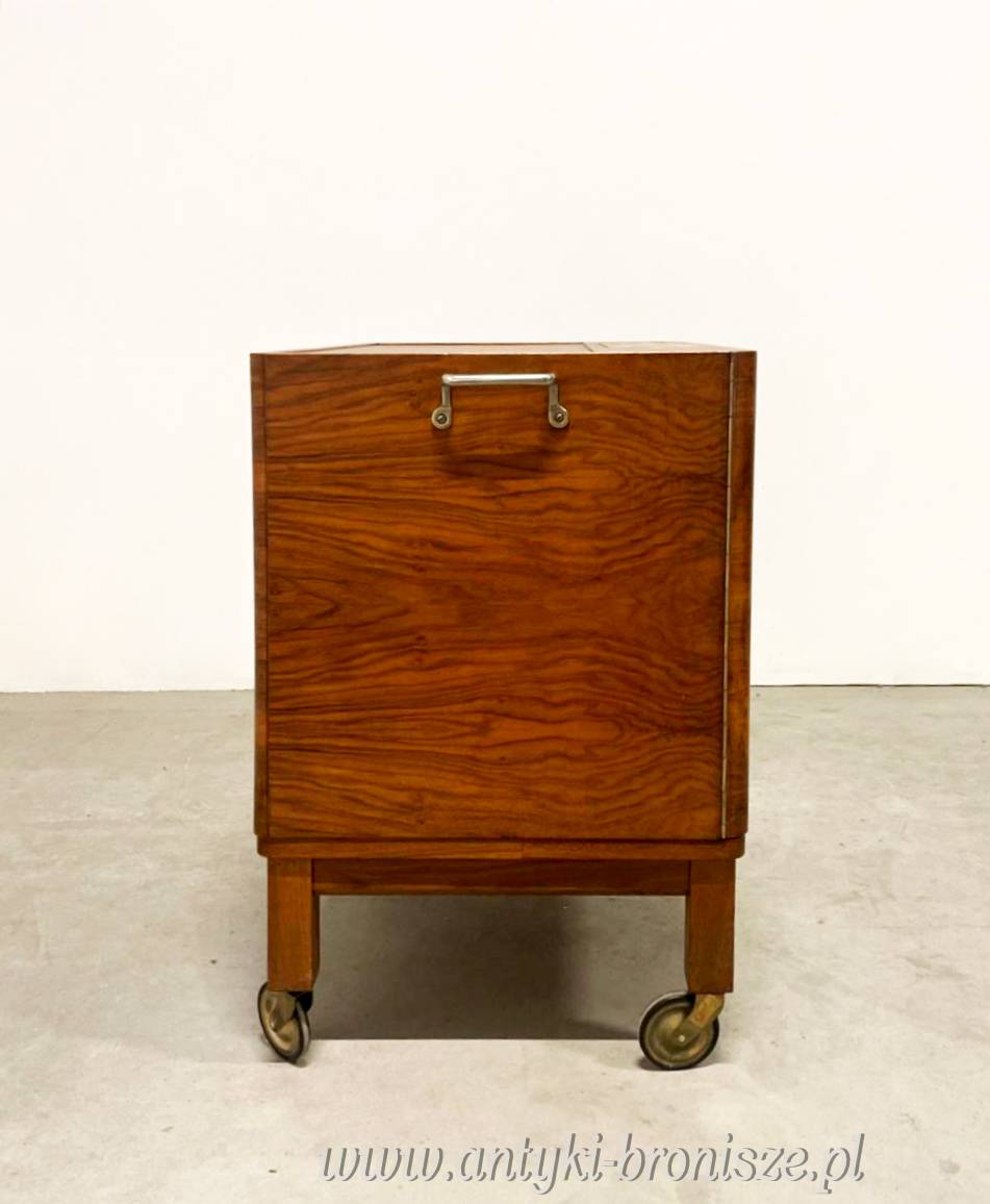 Elegancki barek w stylu Art. deco. Wyprodukowany w Polsce w latach 1930-40. Konstrukcja mebel jest wykonany z orzecha, a dodatki ze szkła oraz ze stali chromowanej.