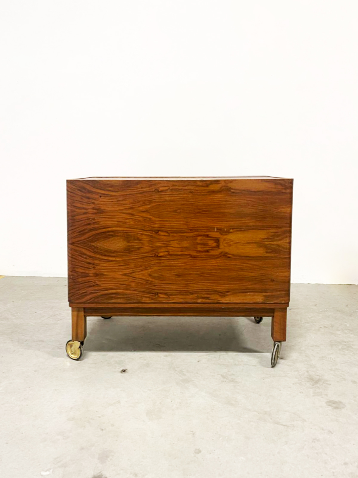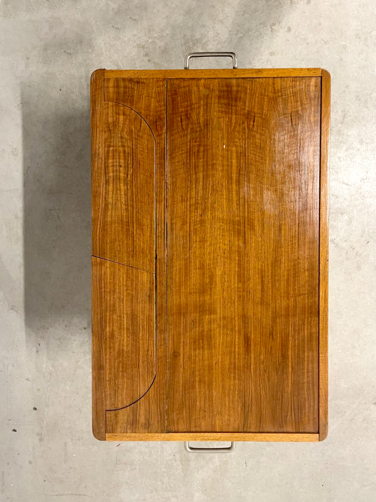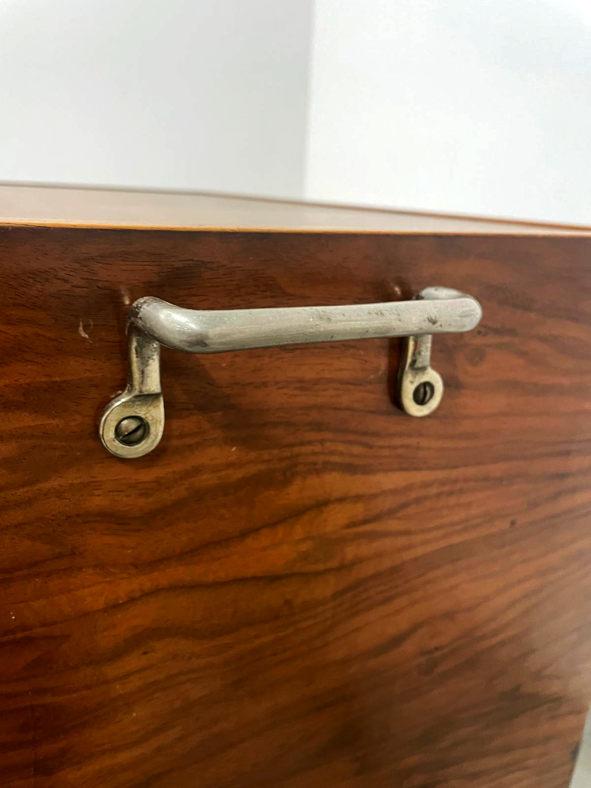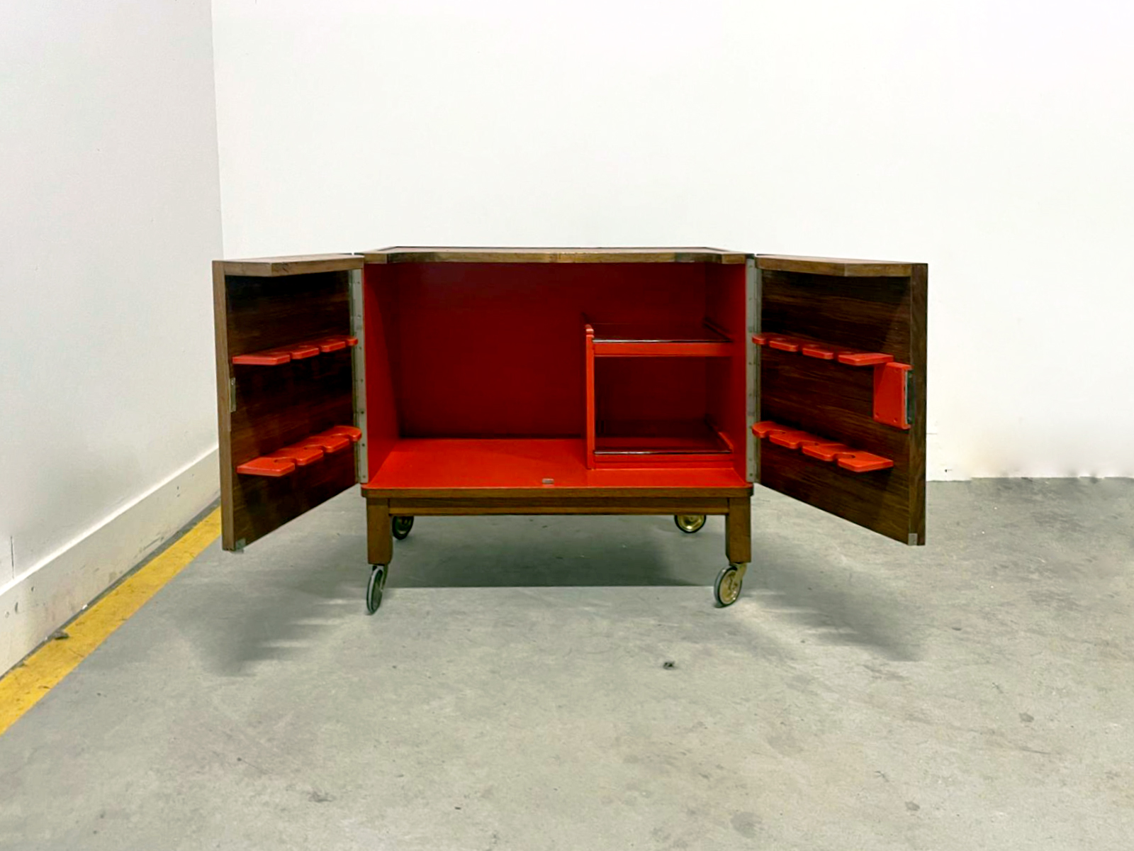 Elegancki barek w stylu Art. deco. Wyprodukowany w Polsce w latach 1930-40. Konstrukcja mebel jest wykonany z orzecha, a dodatki ze szkła oraz ze stali chromowanej.
