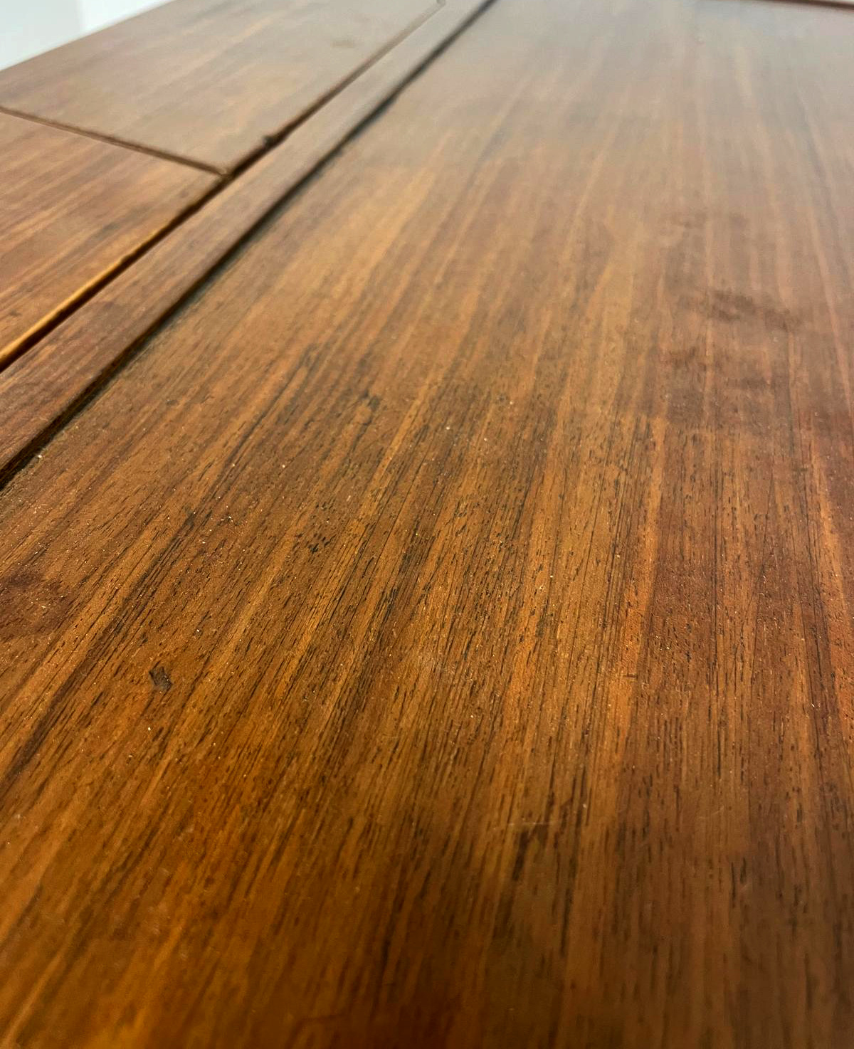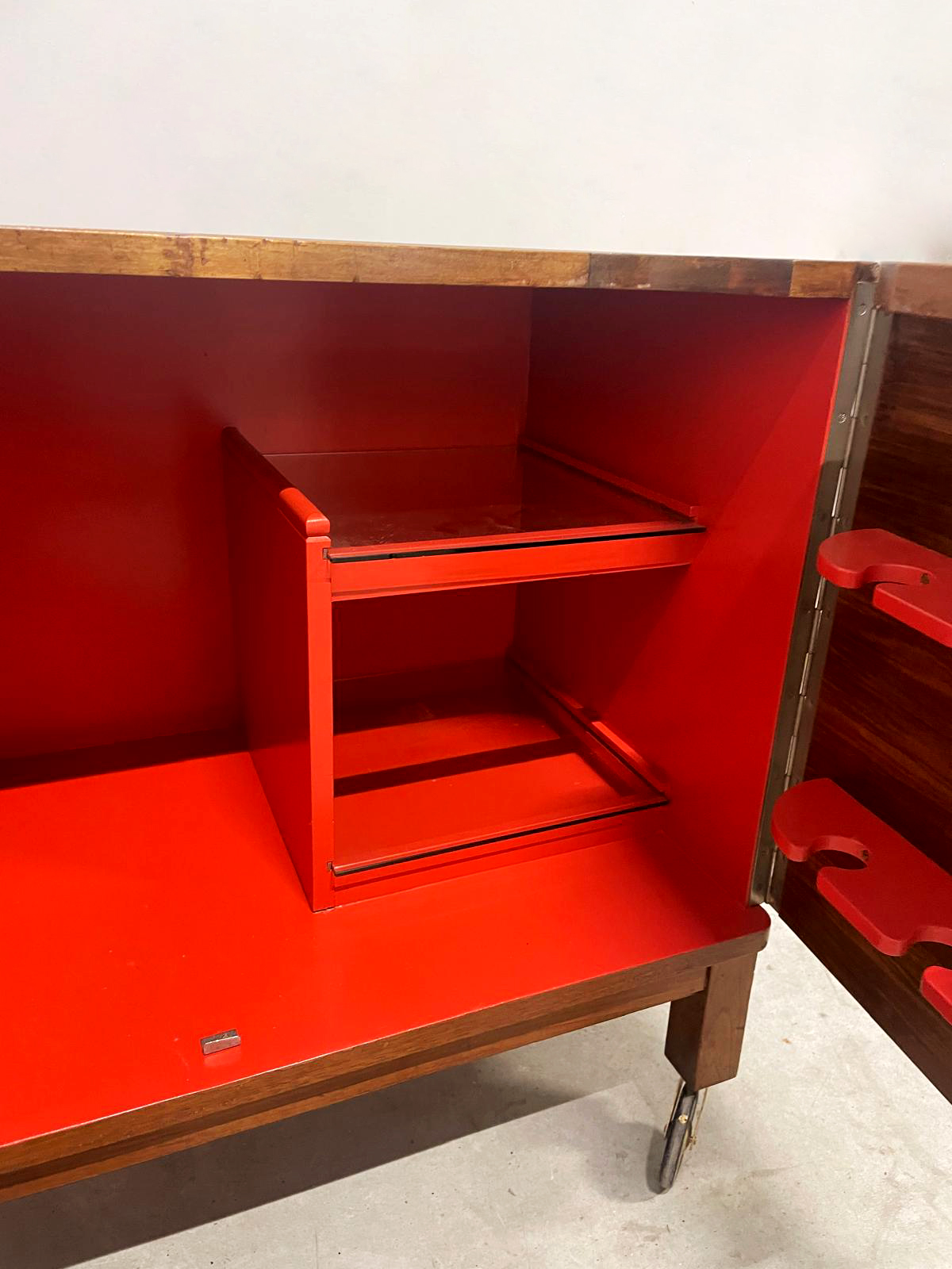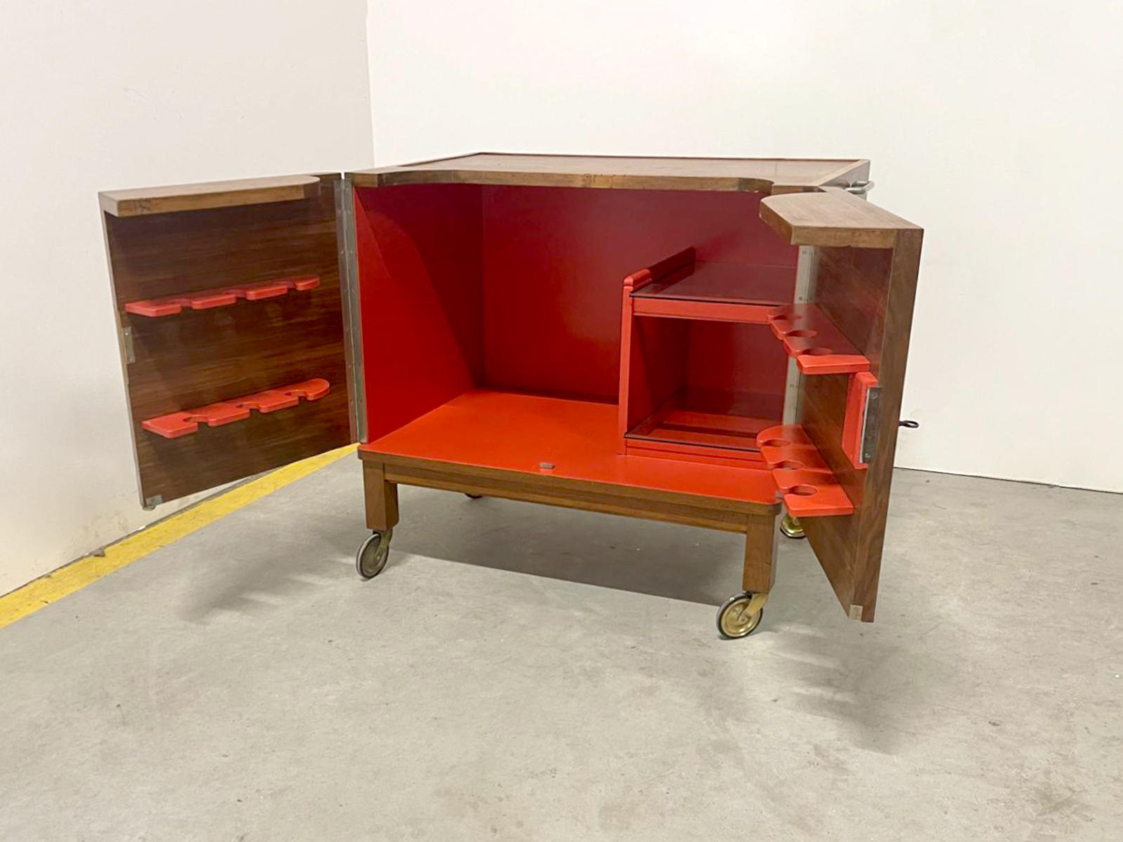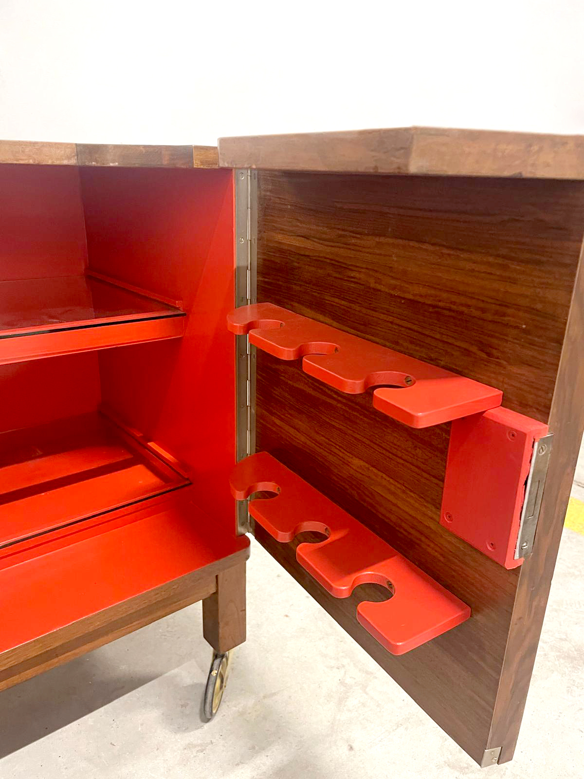Barek jest niewysoką szafką o prostych bokach. Szafka jest zamykana dwuskrzydłowo. Nóżki zakończone są kółkami. Na węższych bokach znajdują się metalowe uchwyty. Skrzydła drzwiowe barku są głębokie i wyposażone w pary półek do zawieszenia kieliszków. Wnętrze barku jest pomalowane na czerwono.