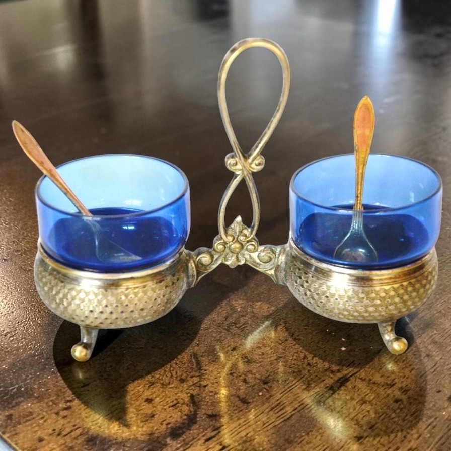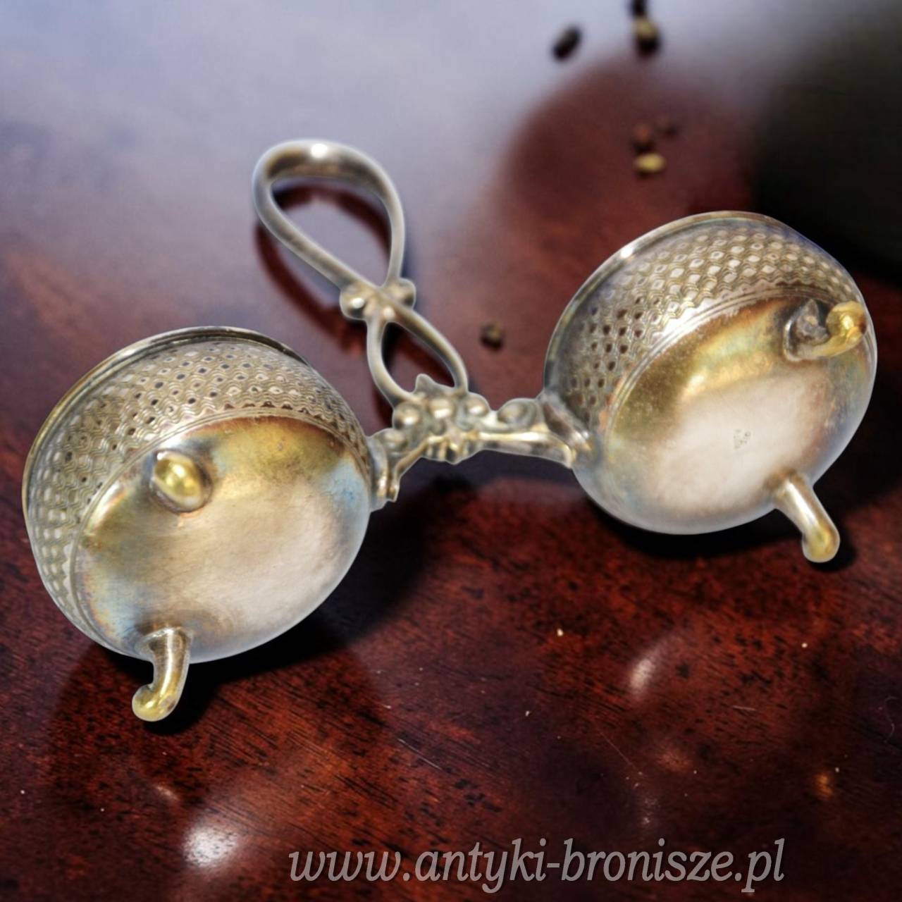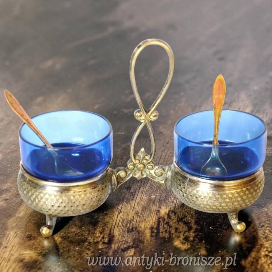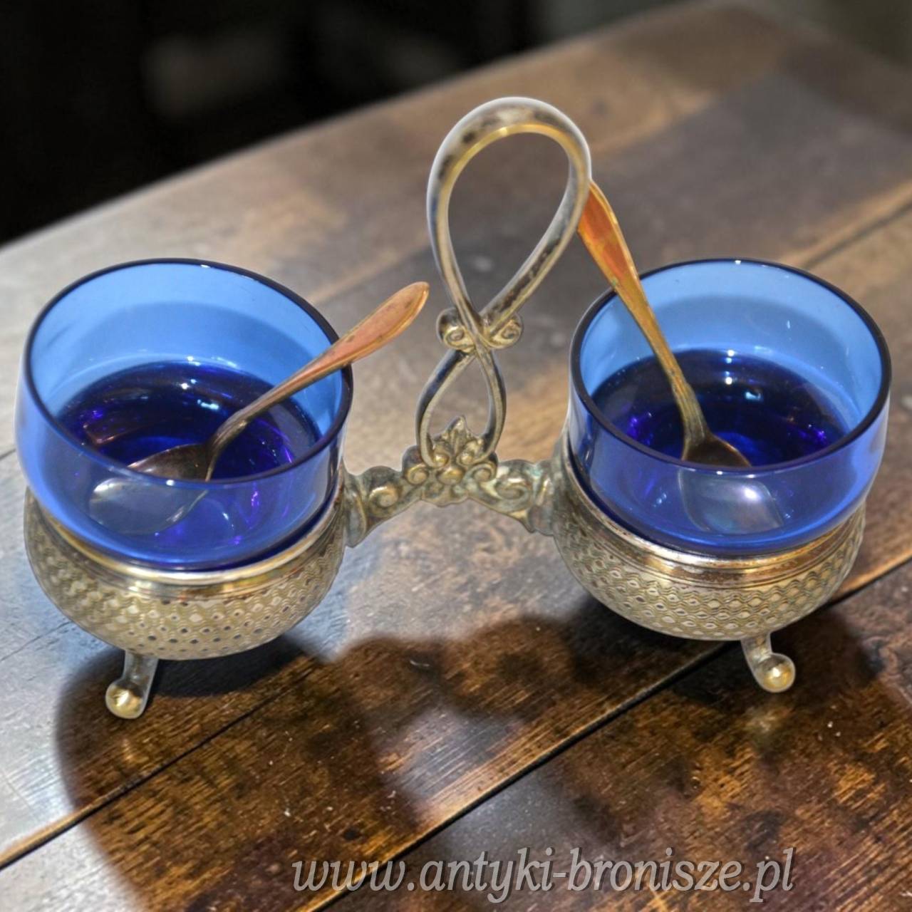 finezyjny kabaret do przypraw sygnowany znakiem słynnej niemieckiej wytwórni platerów Württembergische Metallwarenfabrik, WMF lata międzywojenne. Bardzo ładny dwukomorowy projekt dwa giloszowane koszyki na wygiętych nóżkach połączone dekoracyjnym uchwytem. W gratisie dokładam dwa szklane wkłady w kolorze kobaltowym i dwie łyżeczki sygnowane GAB. Wymiary :szerokość maksymalnie 13cm, wysokość maksymalnie 10cm szklane wkłady wys.4cm, średnica 4cm stan bardzo dobry, produkt pokryty naturalną patyną nie czyszczony. Nietuzinkowy, utrzymana w eleganckim stylu, wiekowy, światowej marki,