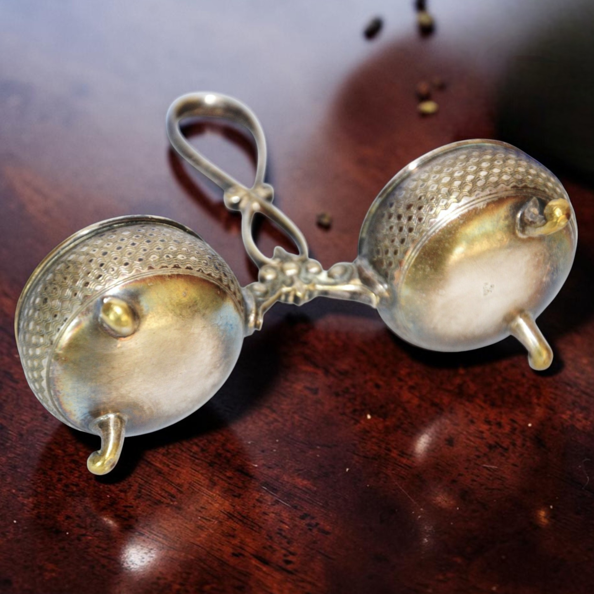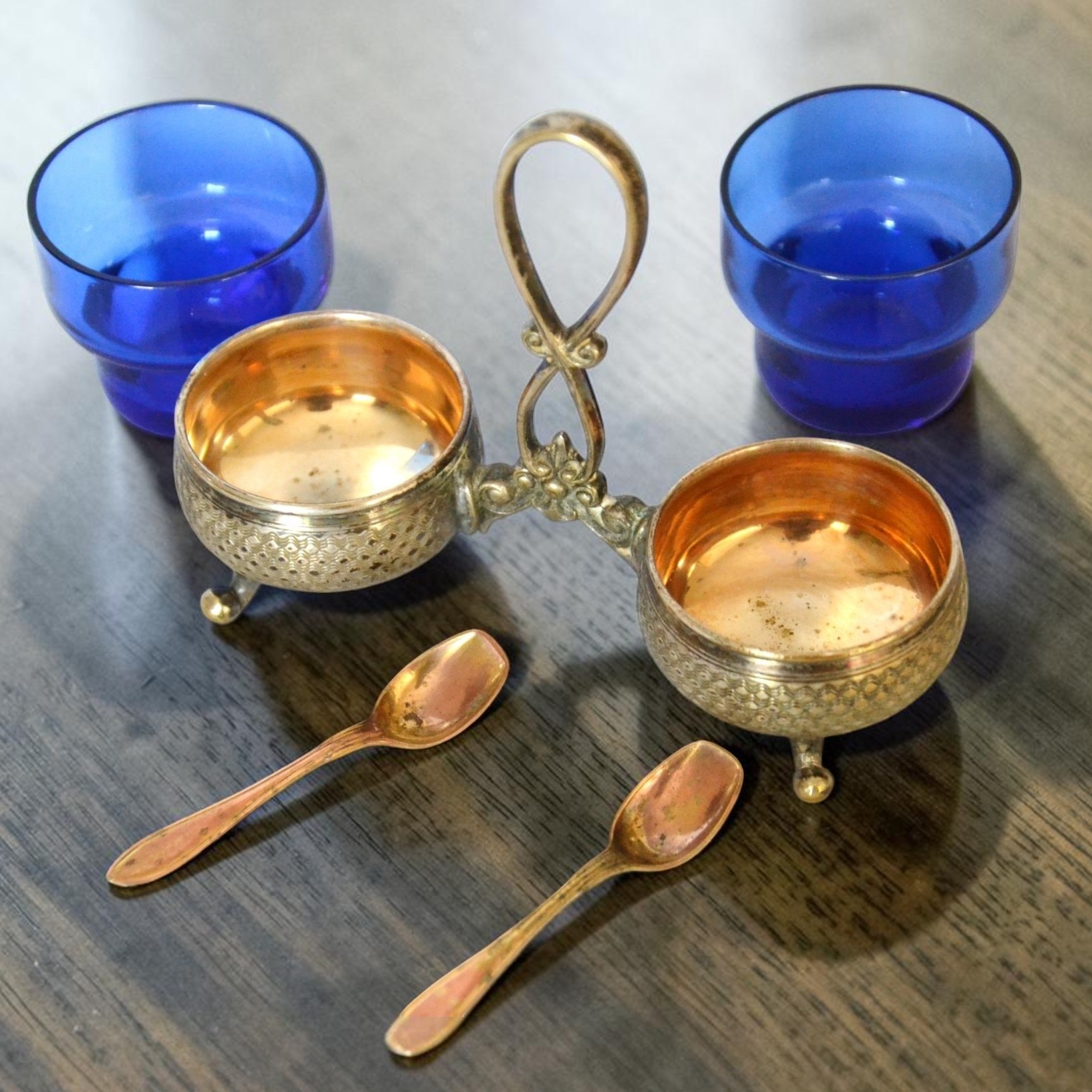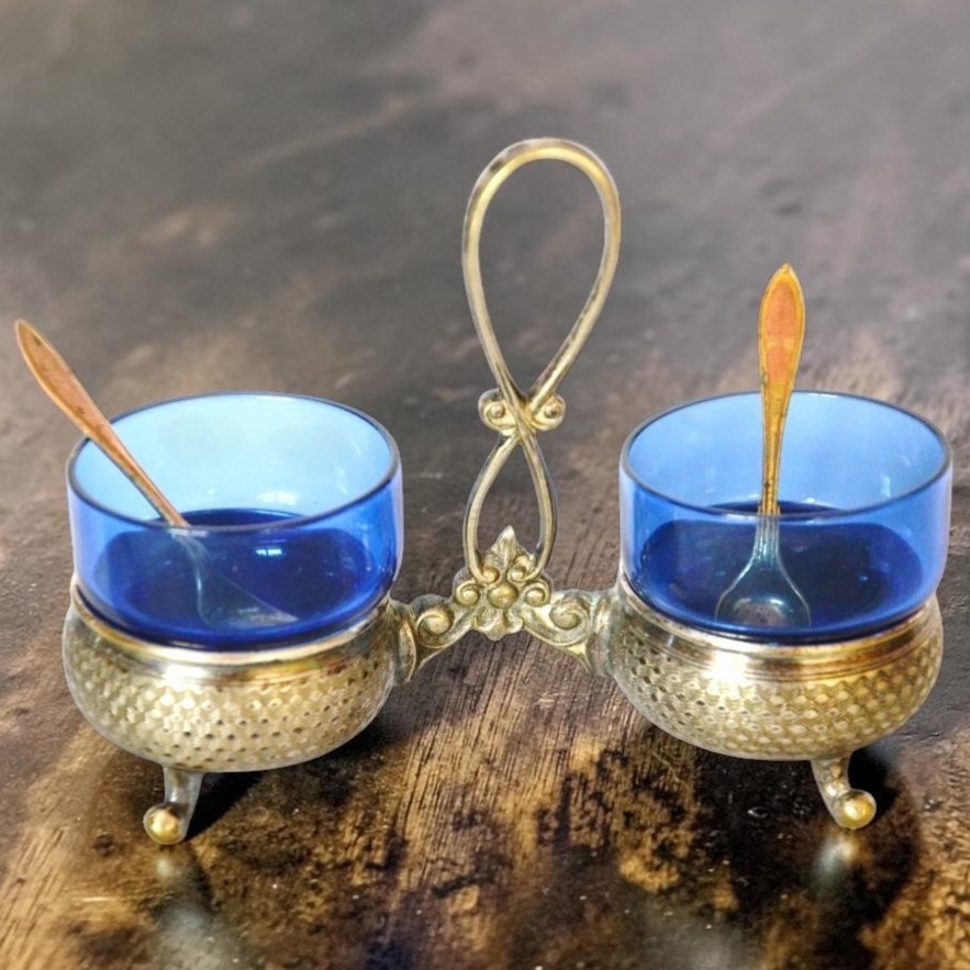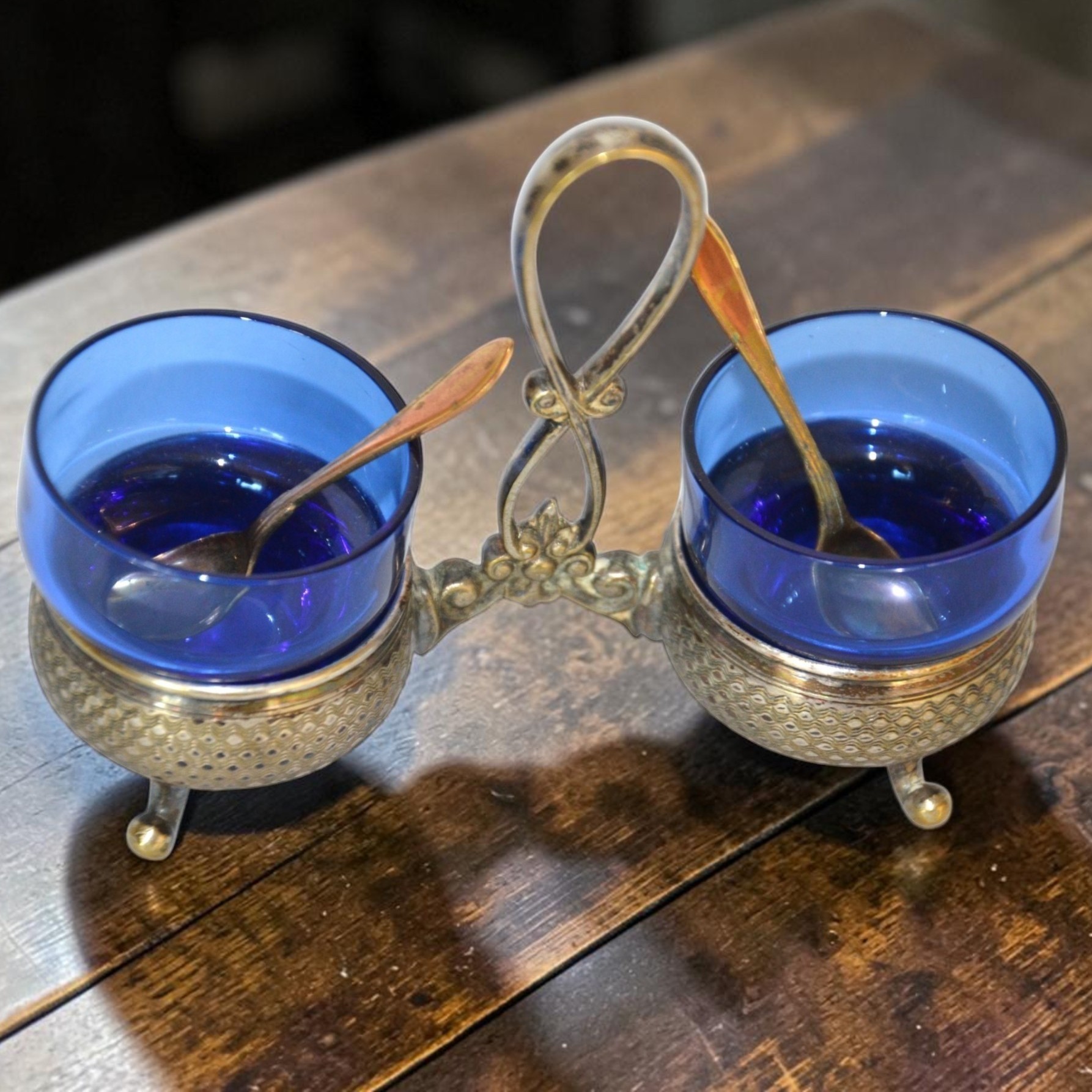 finezyjny kabaret do przypraw sygnowany znakiem słynnej niemieckiej wytwórni platerów Württembergische Metallwarenfabrik, WMF lata międzywojenne. Bardzo ładny dwukomorowy projekt dwa giloszowane koszyki na wygiętych nóżkach połączone dekoracyjnym uchwytem. W gratisie dokładam dwa szklane wkłady w kolorze kobaltowym i dwie łyżeczki sygnowane GAB. Wymiary :szerokość maksymalnie 13cm, wysokość maksymalnie 10cm szklane wkłady wys.4cm, średnica 4cm stan bardzo dobry, produkt pokryty naturalną patyną nie czyszczony. Nietuzinkowy, utrzymana w eleganckim stylu, wiekowy, światowej marki,