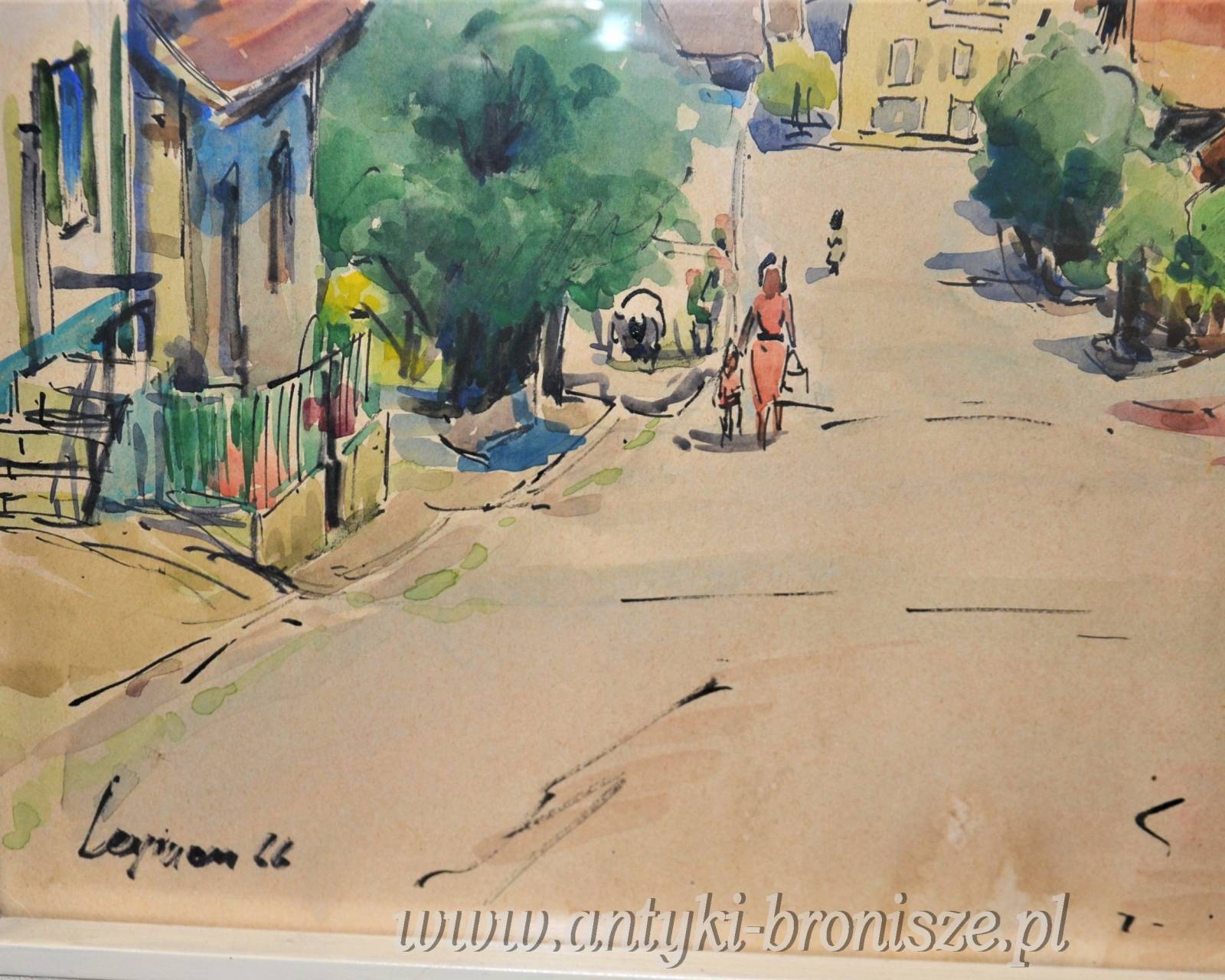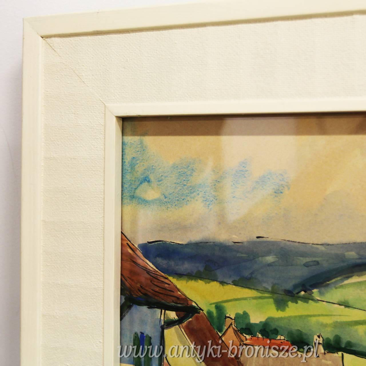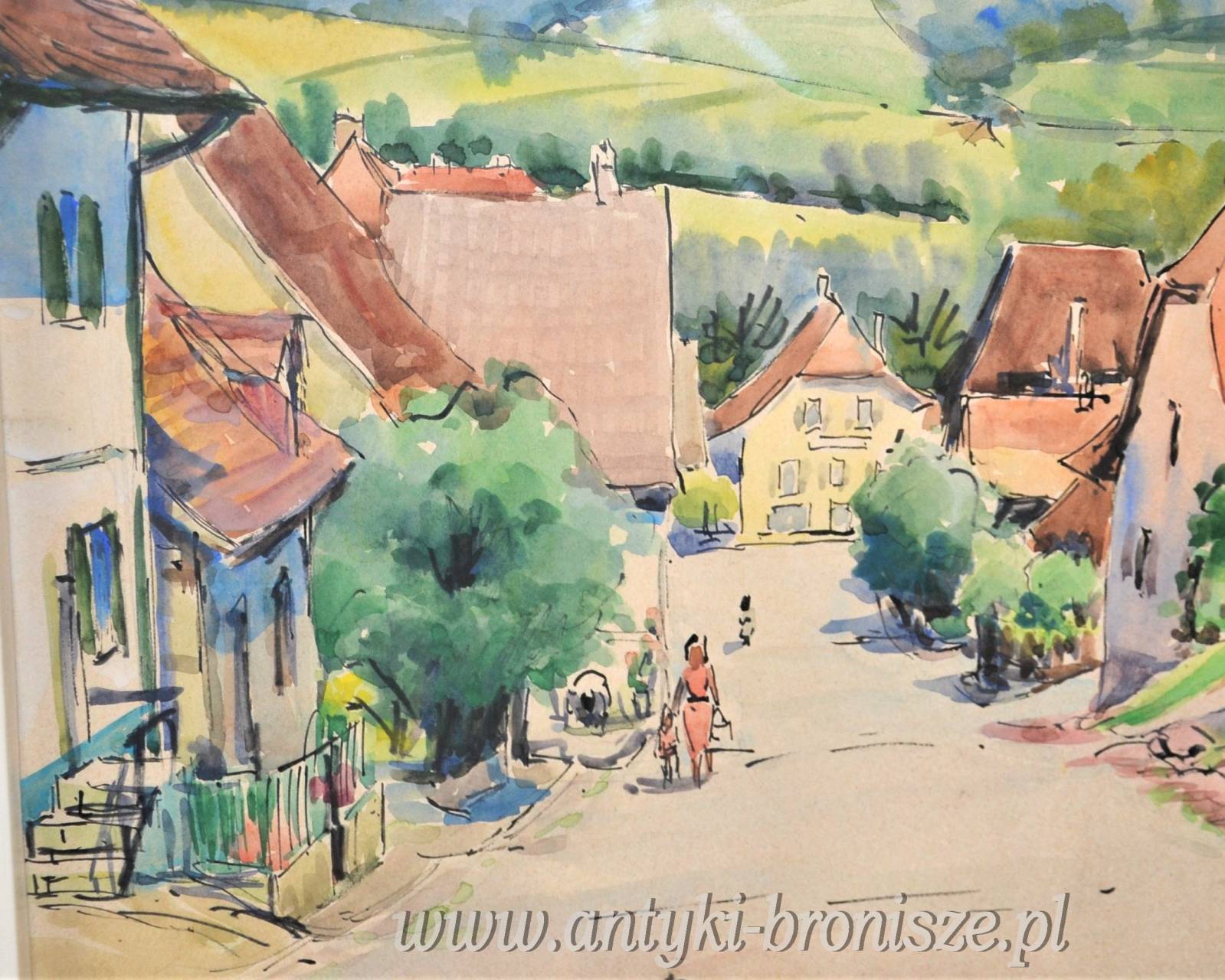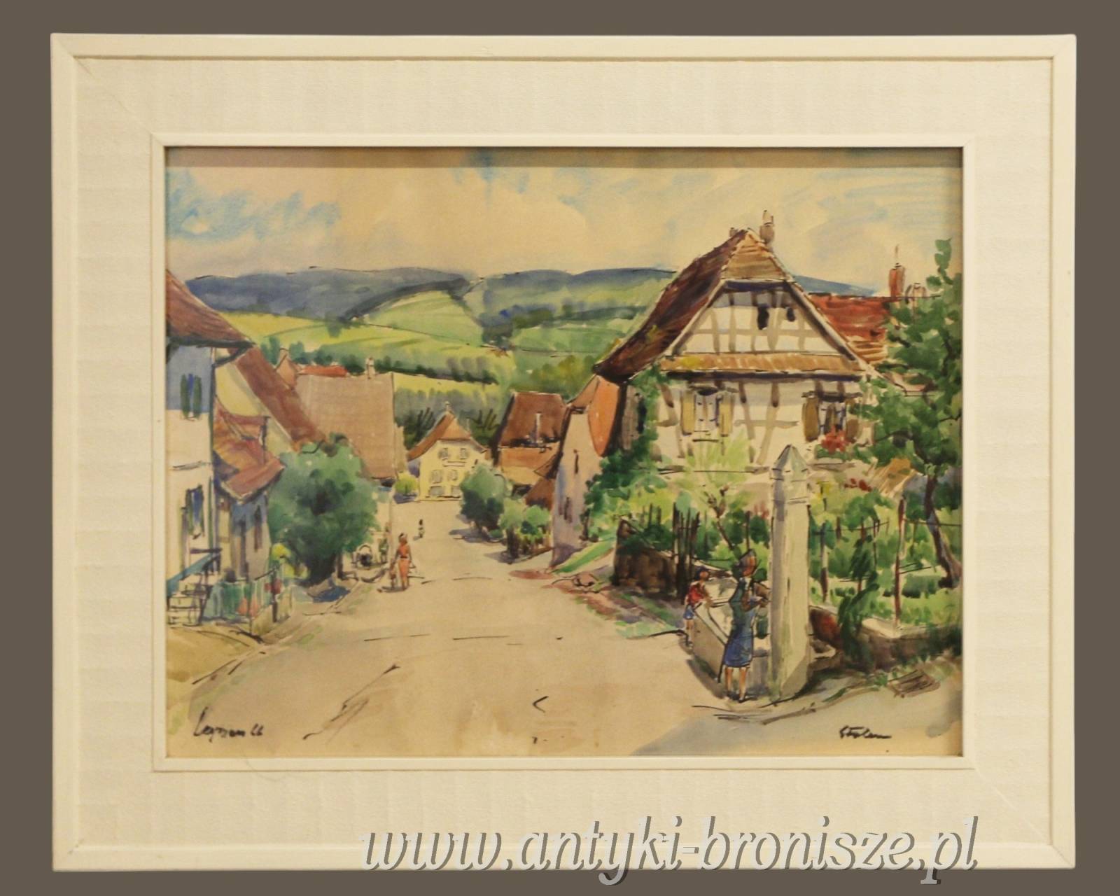 Ładna akwarela za szkłem w białej ramie podpisana nazwa miejsca i nazwisko autora oraz 66r Kolorowe miasteczko w górach wymiar 81/66,5cm w świetle 63/48cm.