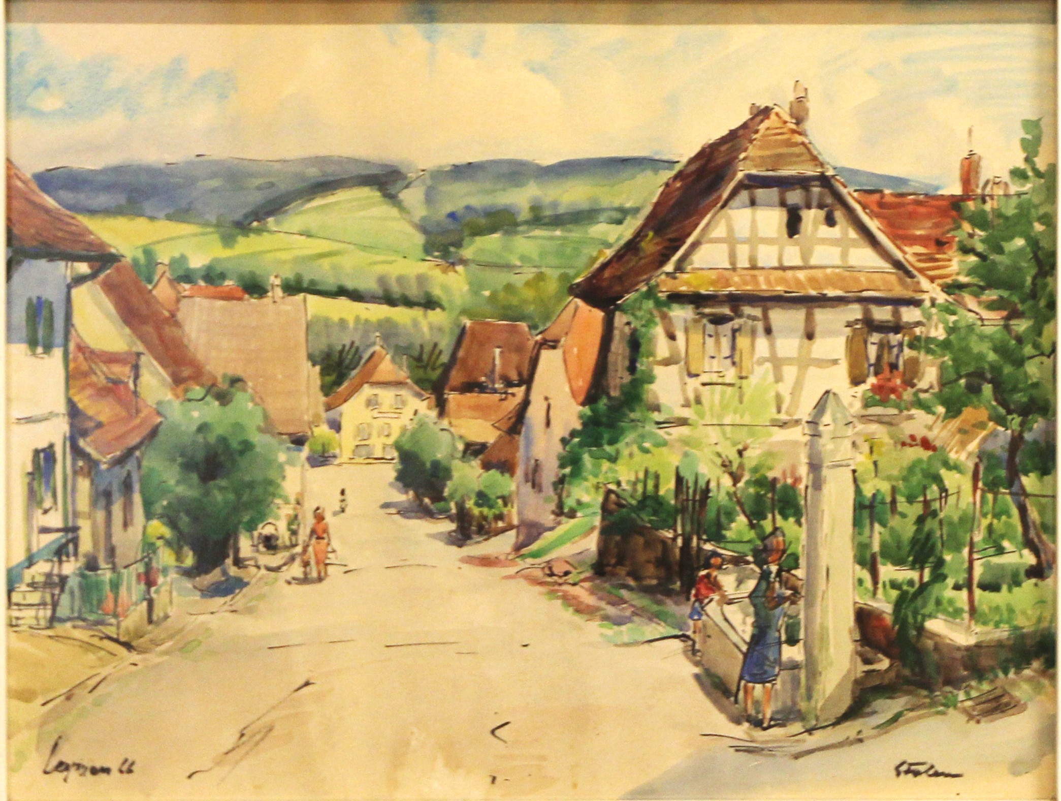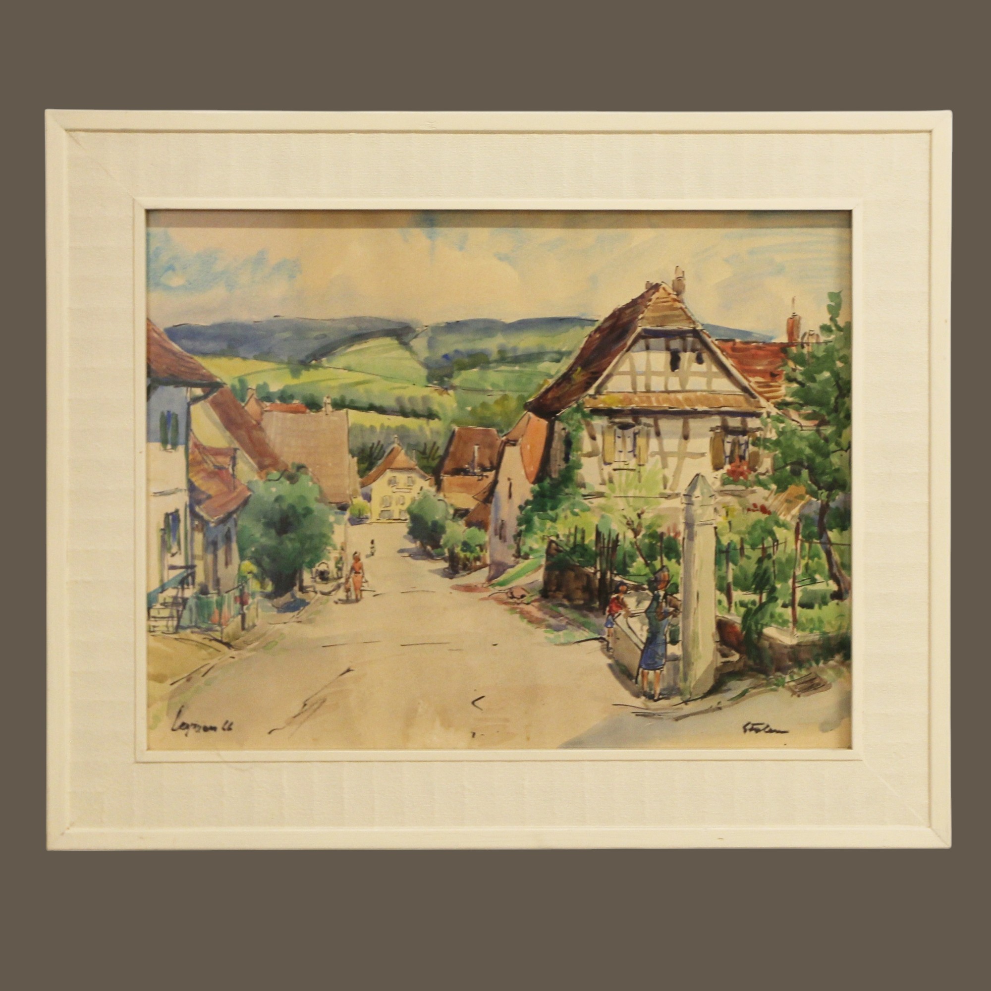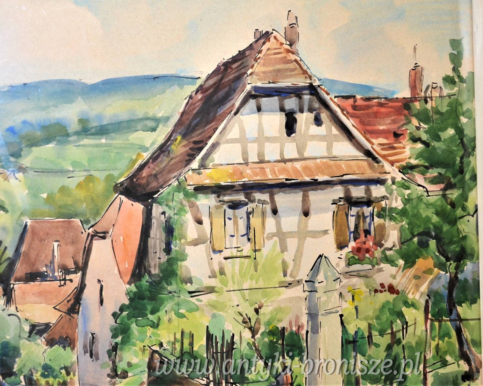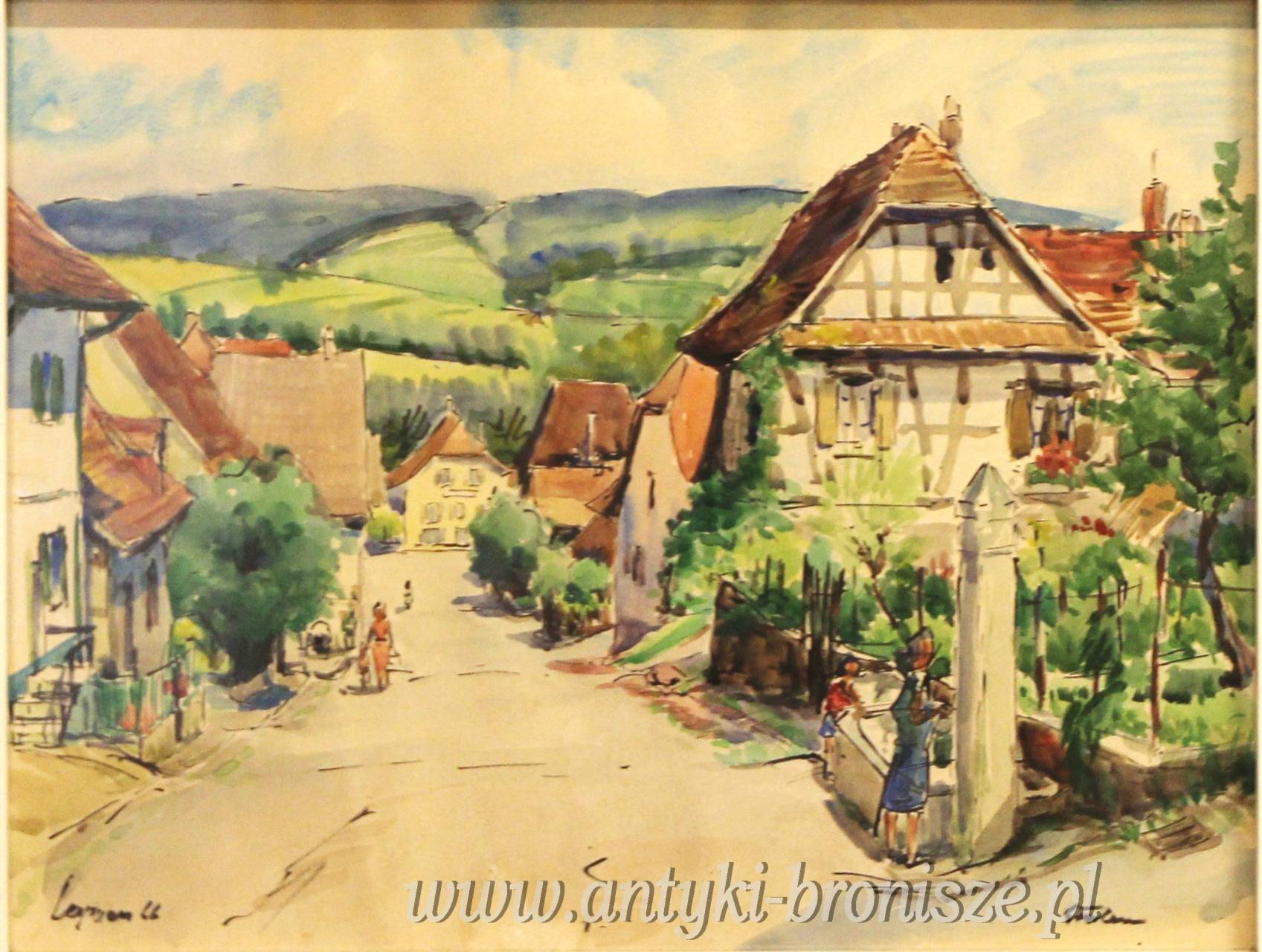 Ładna akwarela za szkłem w białej ramie podpisana nazwa miejsca i nazwisko autora oraz 66r Kolorowe miasteczko w górach wymiar 81/66,5cm w świetle 63/48cm.