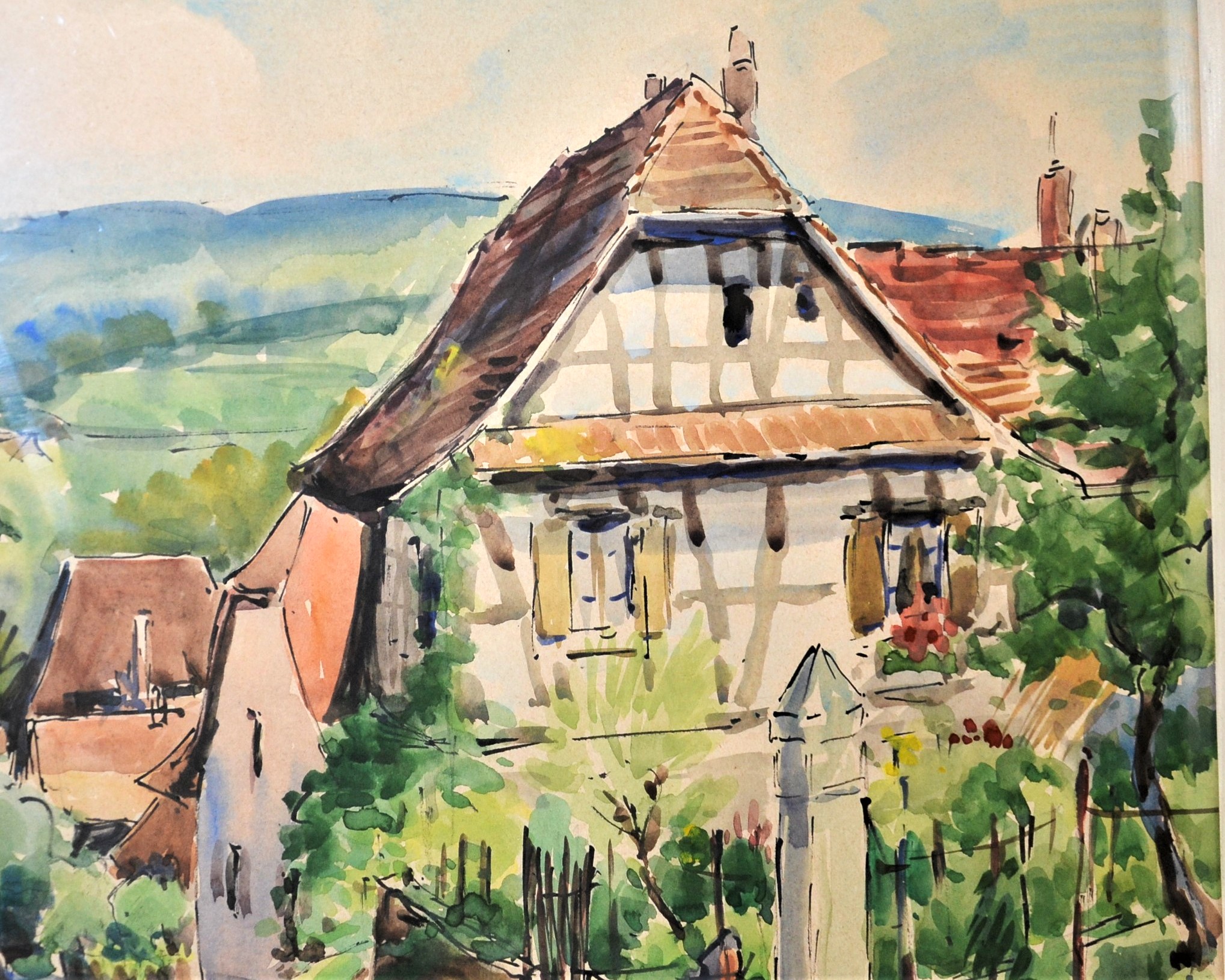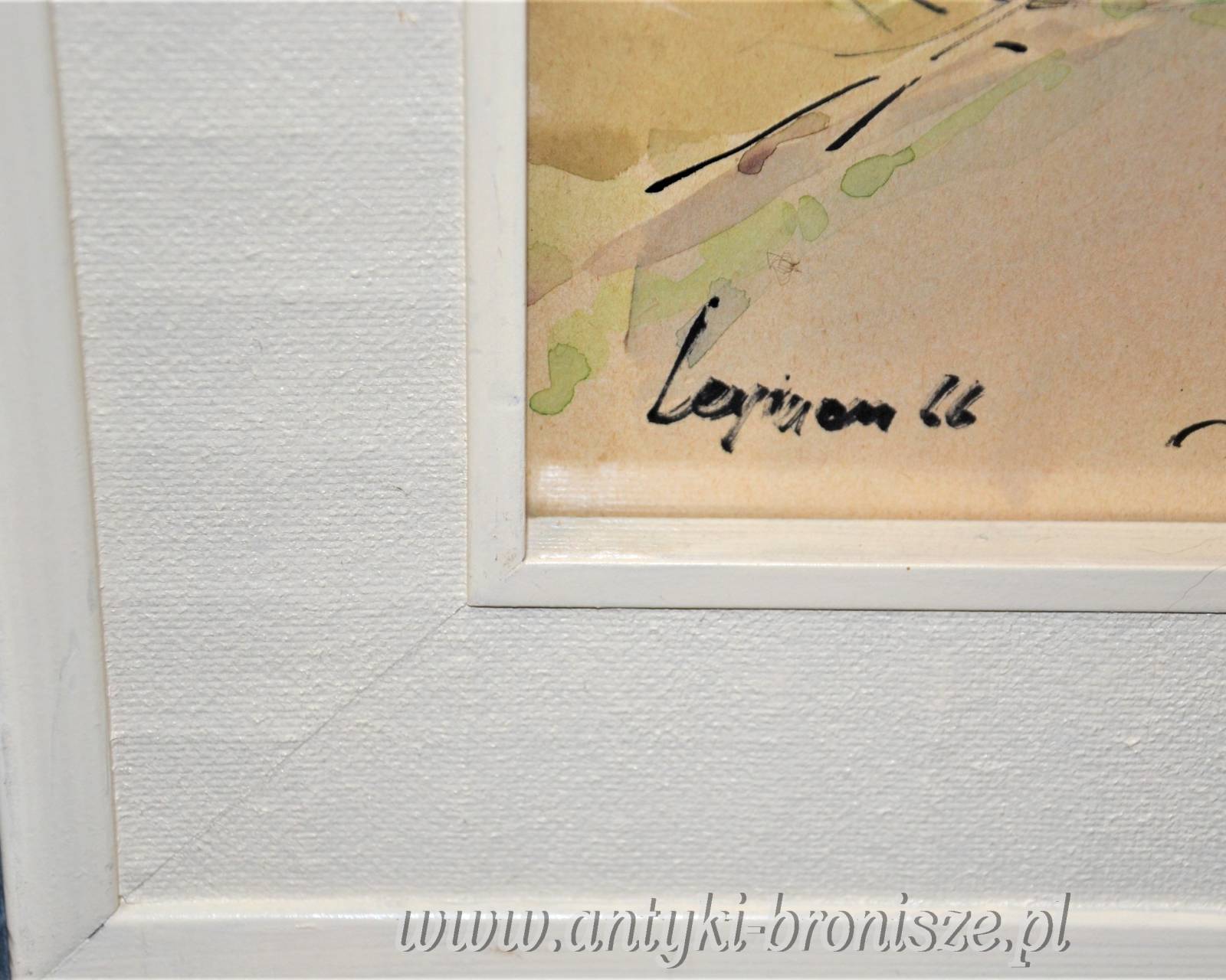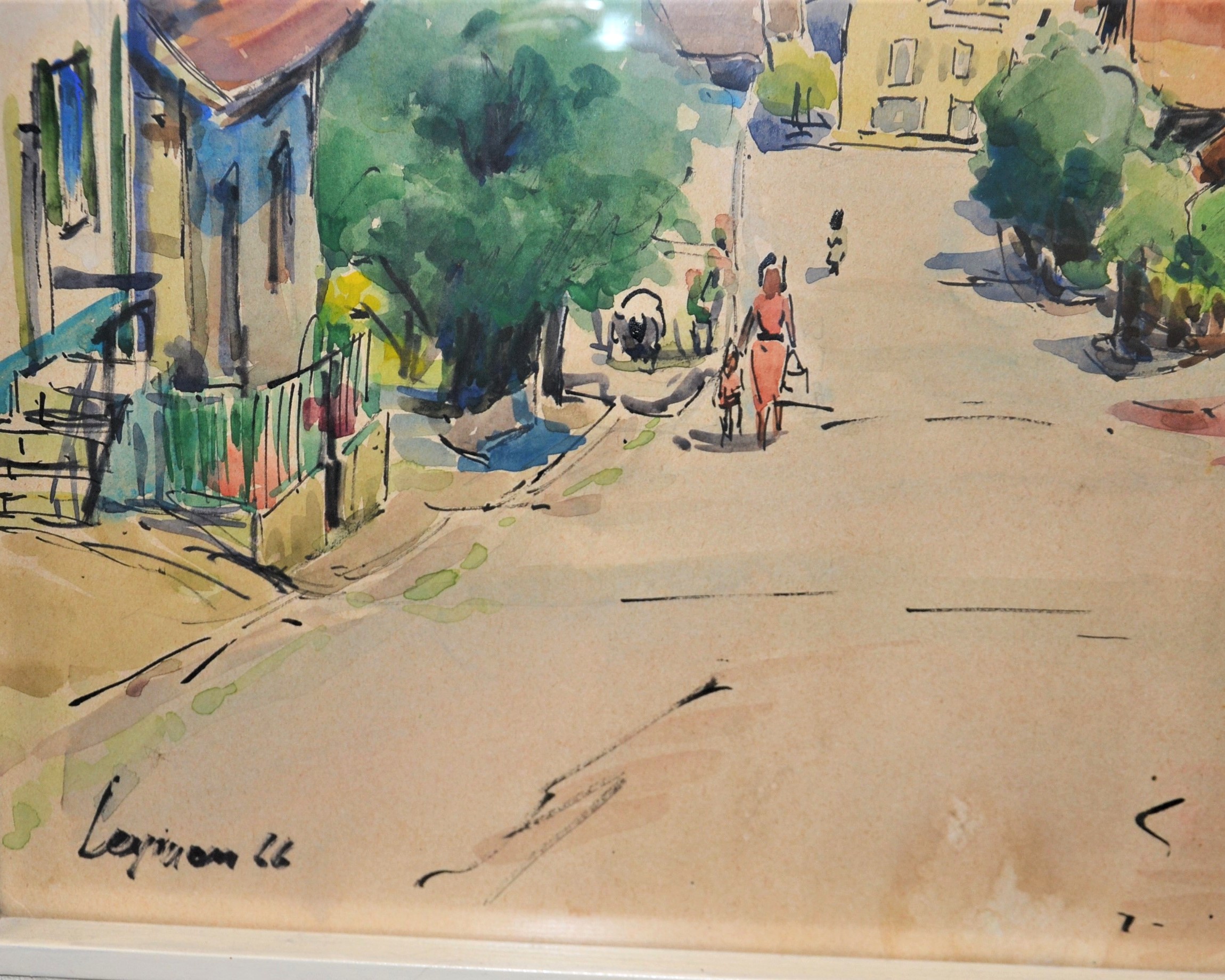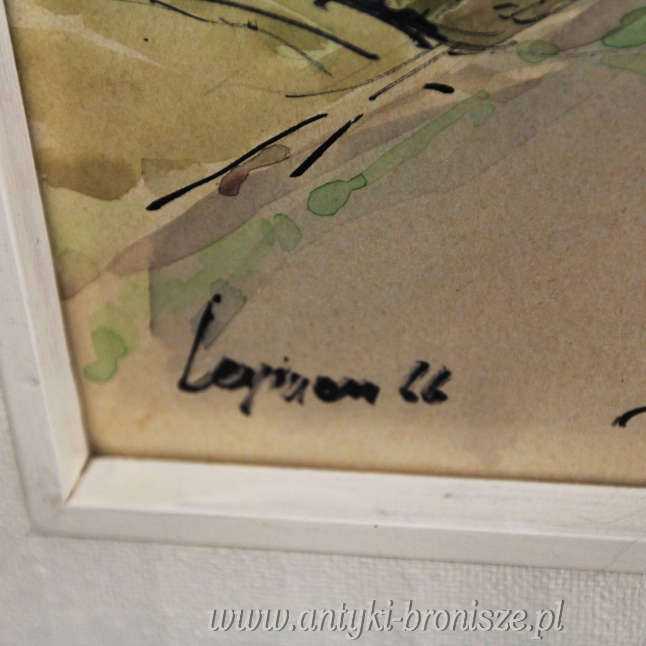 Ładna akwarela za szkłem w białej ramie podpisana nazwa miejsca i nazwisko autora oraz 66r Kolorowe miasteczko w górach wymiar 81/66,5cm w świetle 63/48cm.