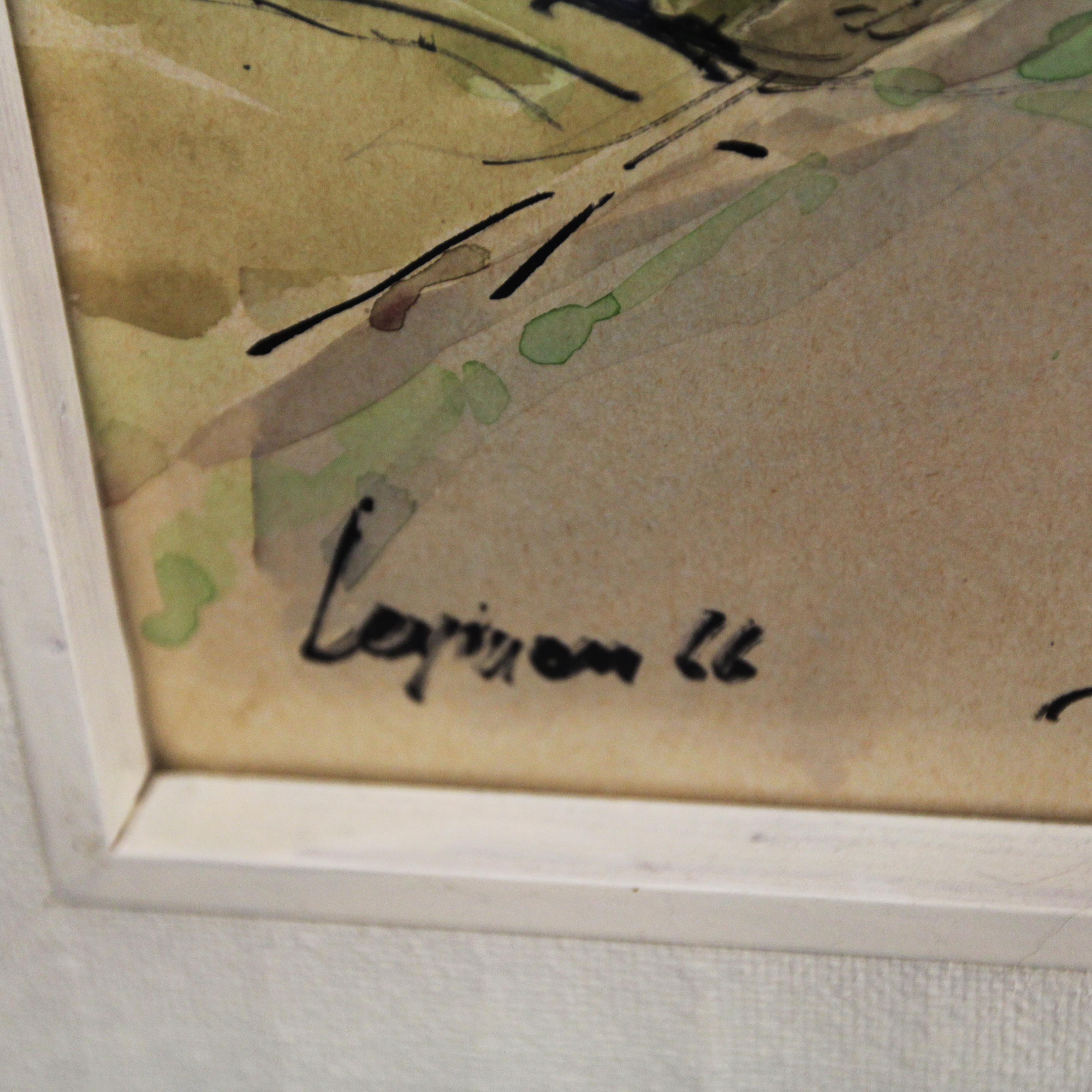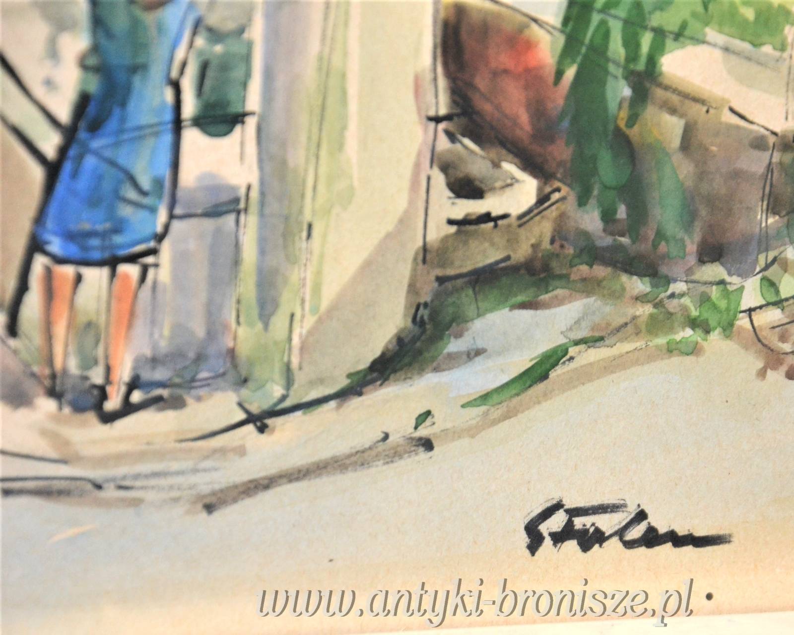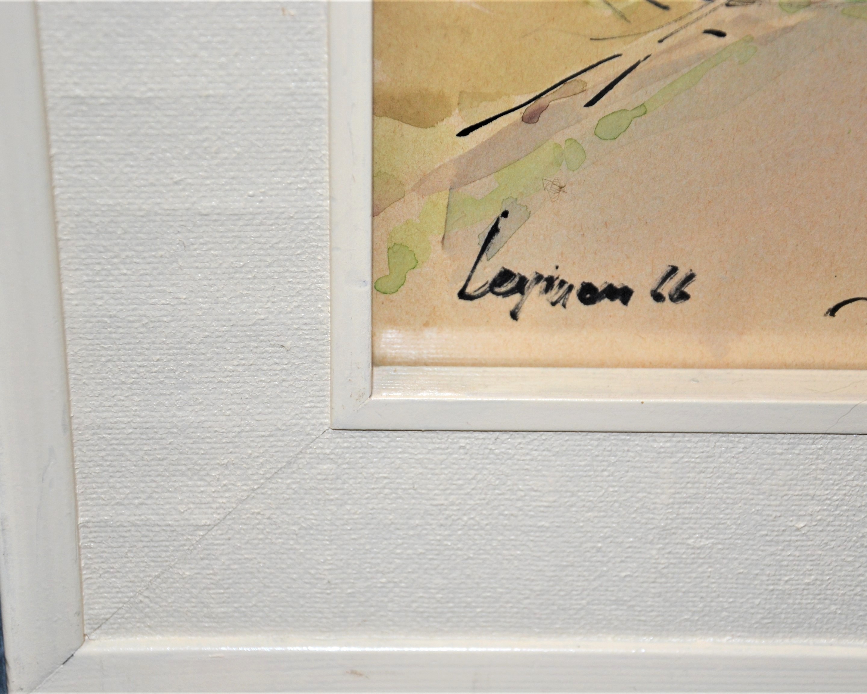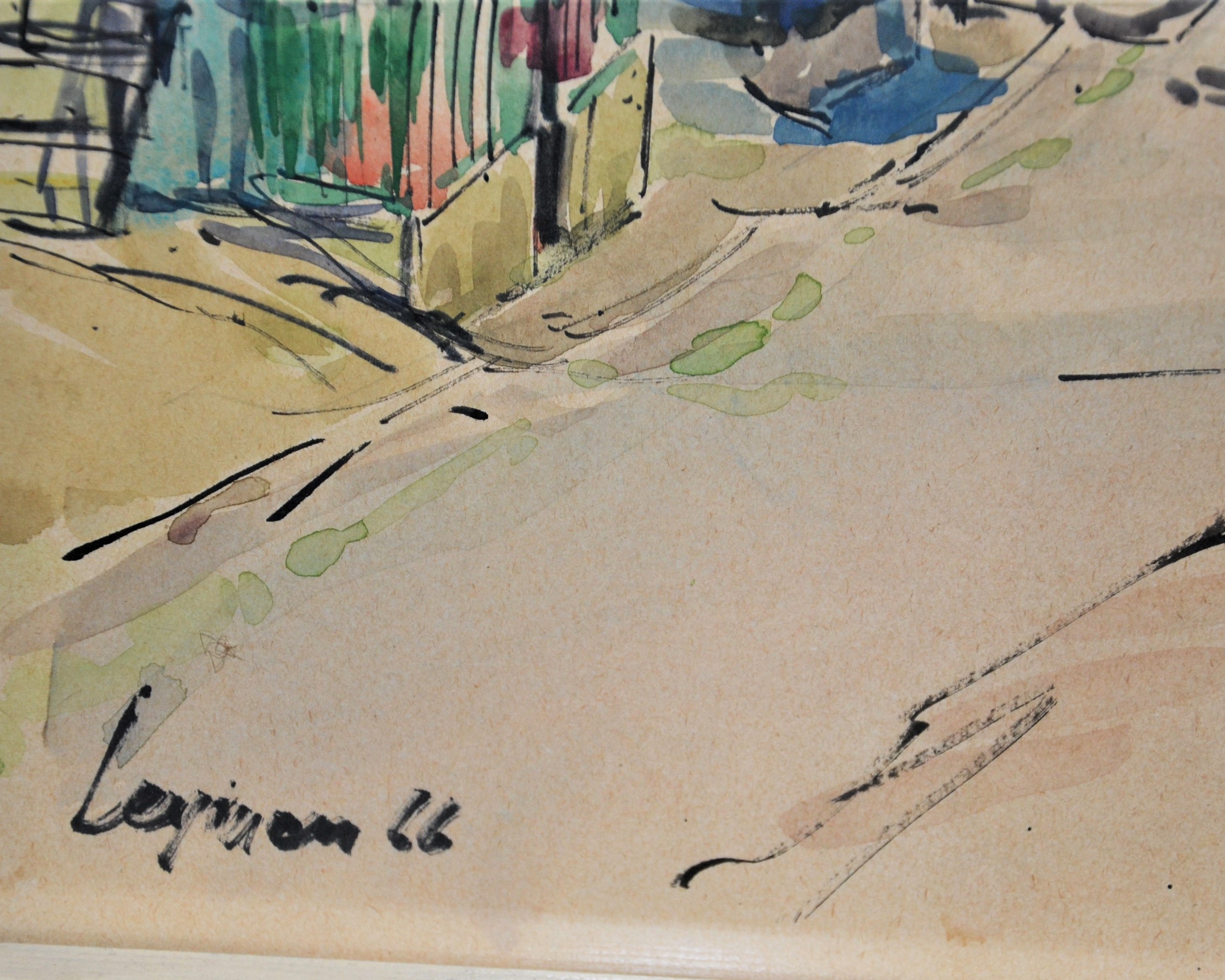 Ładna akwarela za szkłem w białej ramie podpisana nazwa miejsca i nazwisko autora oraz 66r Kolorowe miasteczko w górach wymiar 81/66,5cm w świetle 63/48cm.
