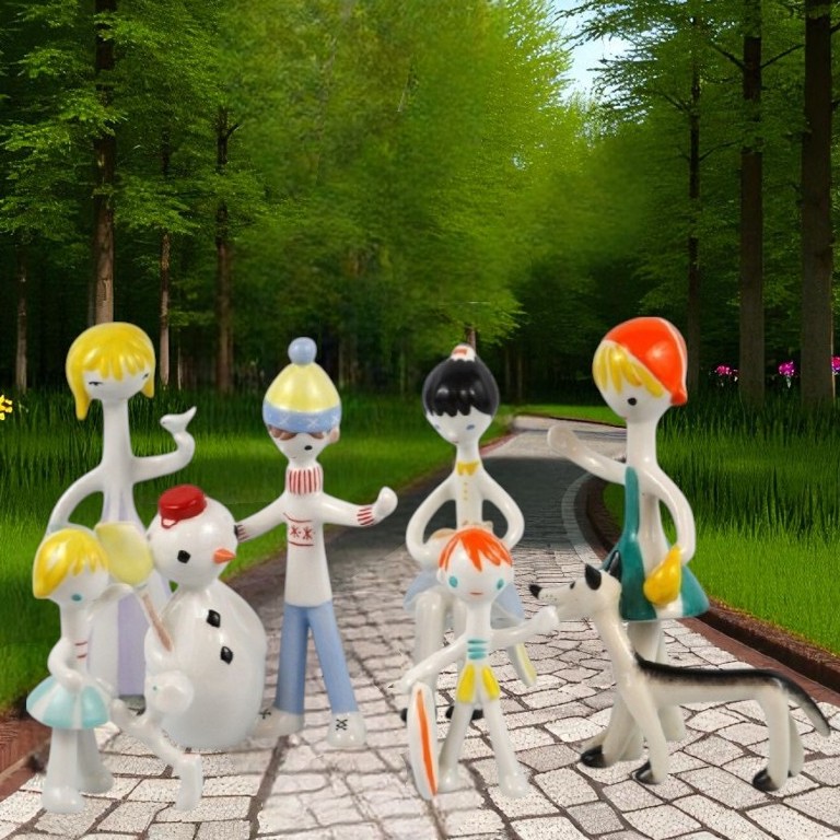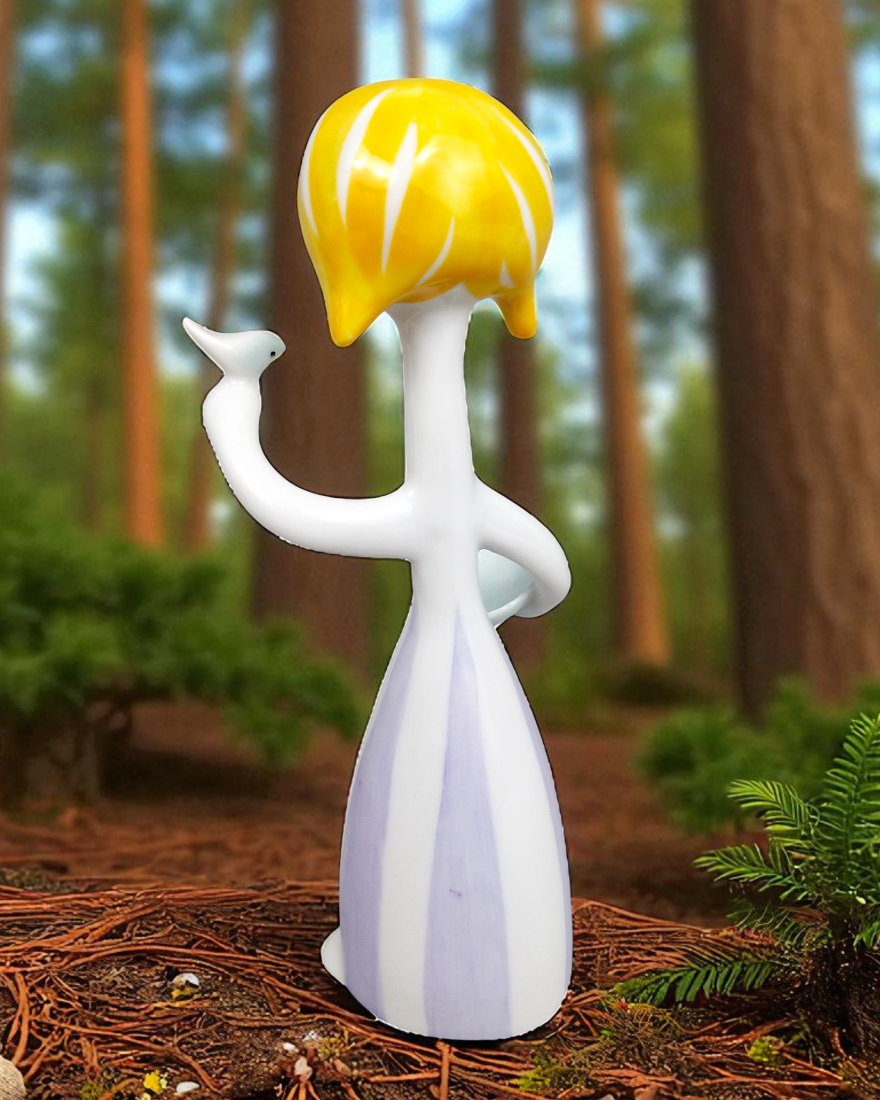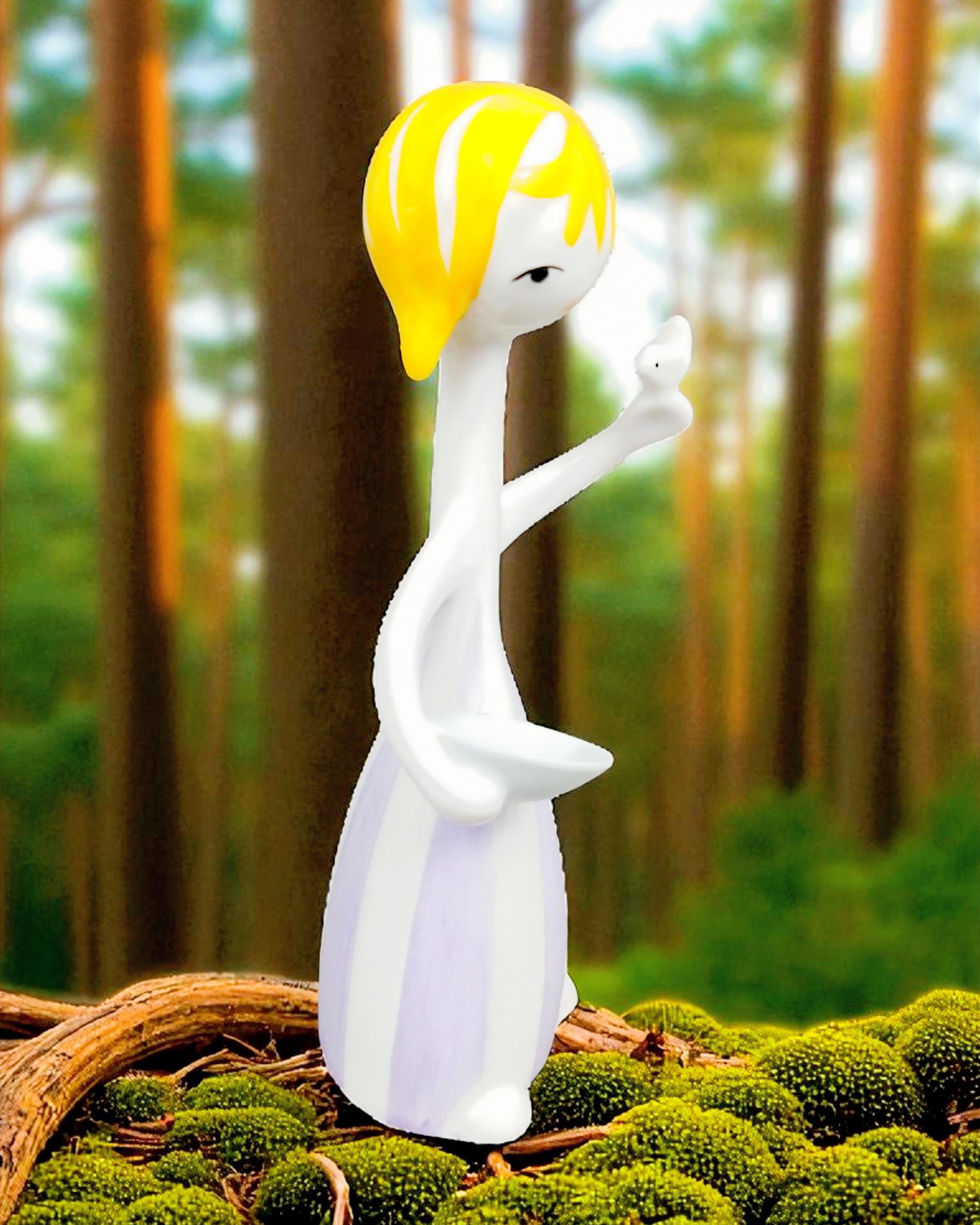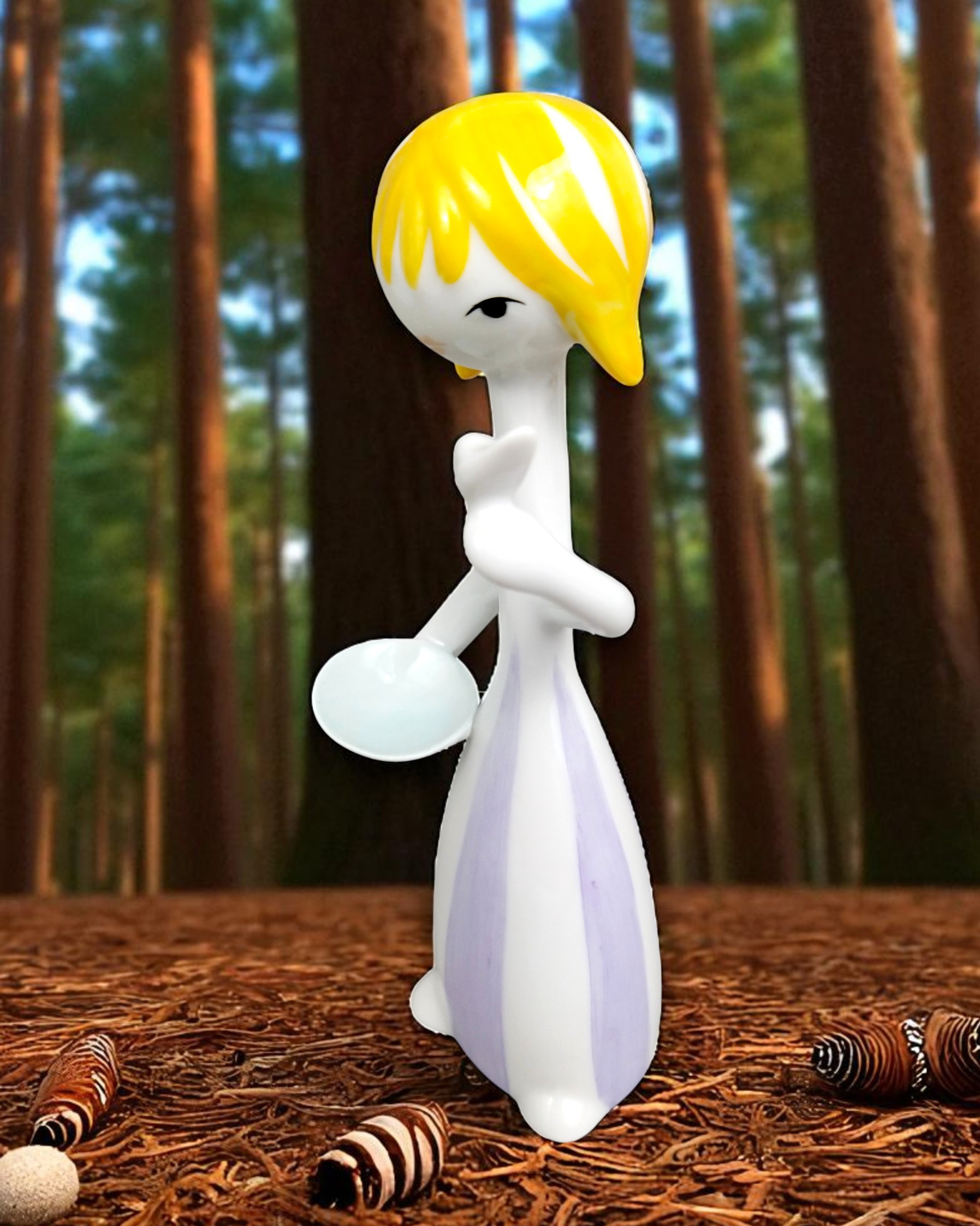 Jedna z serii 8 figurek inspirowanych przedwojennymi kreskówkami włoskiego artysty Sergio Toffolo. W latach 60tych węgierska artystka, ceramiczka Ősz Szabó Antónia, na podstawie rysunków Toffolo, stworzyła porcelanowe modele lalek . Figurki z tej serii produkowały największe węgierskie wytwórnie porcelany od w połowie XXw . Wspaniałe wzornictwo, modernistyczne kształty, dekoracje a'la picasso, interesująca tematyka.wys.14 cm stan bardzo dobry minimalne ślady użytkowania, na rancie miseczki wyczuwalna ostrość, (wada produkcyjna - patrz fotografia w zbliżeniu)