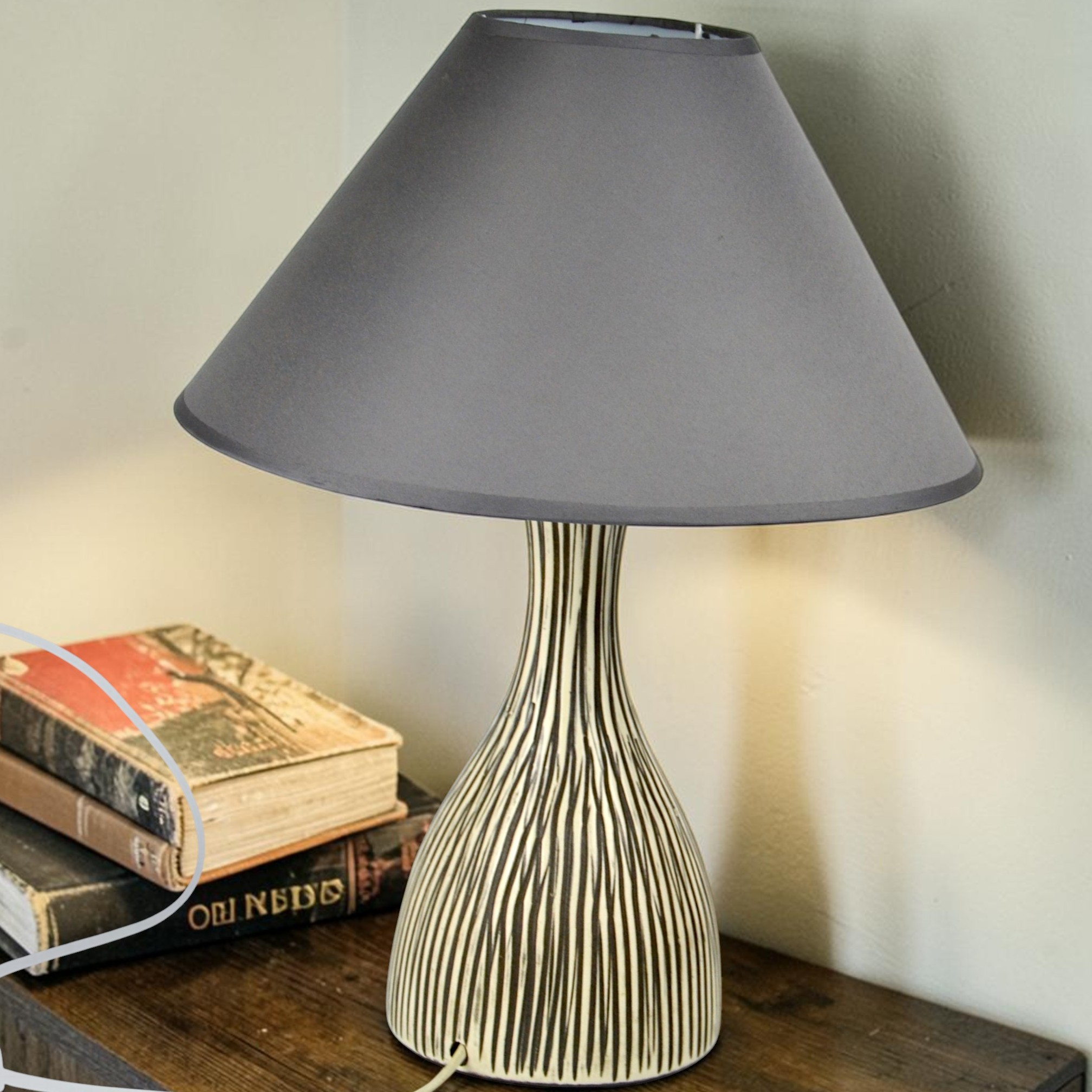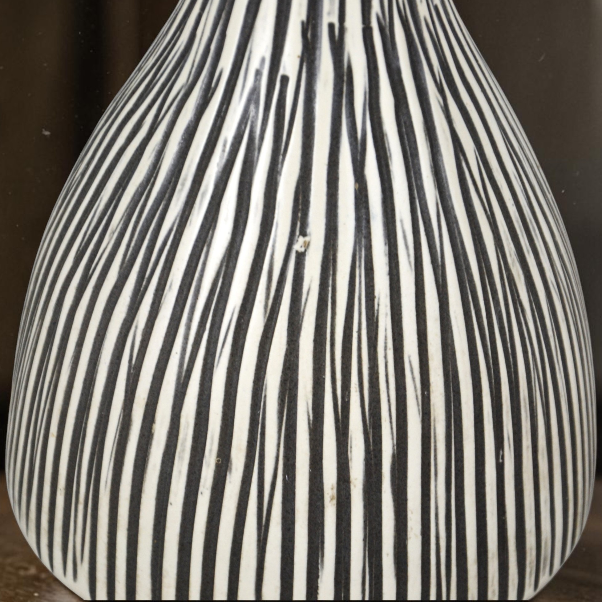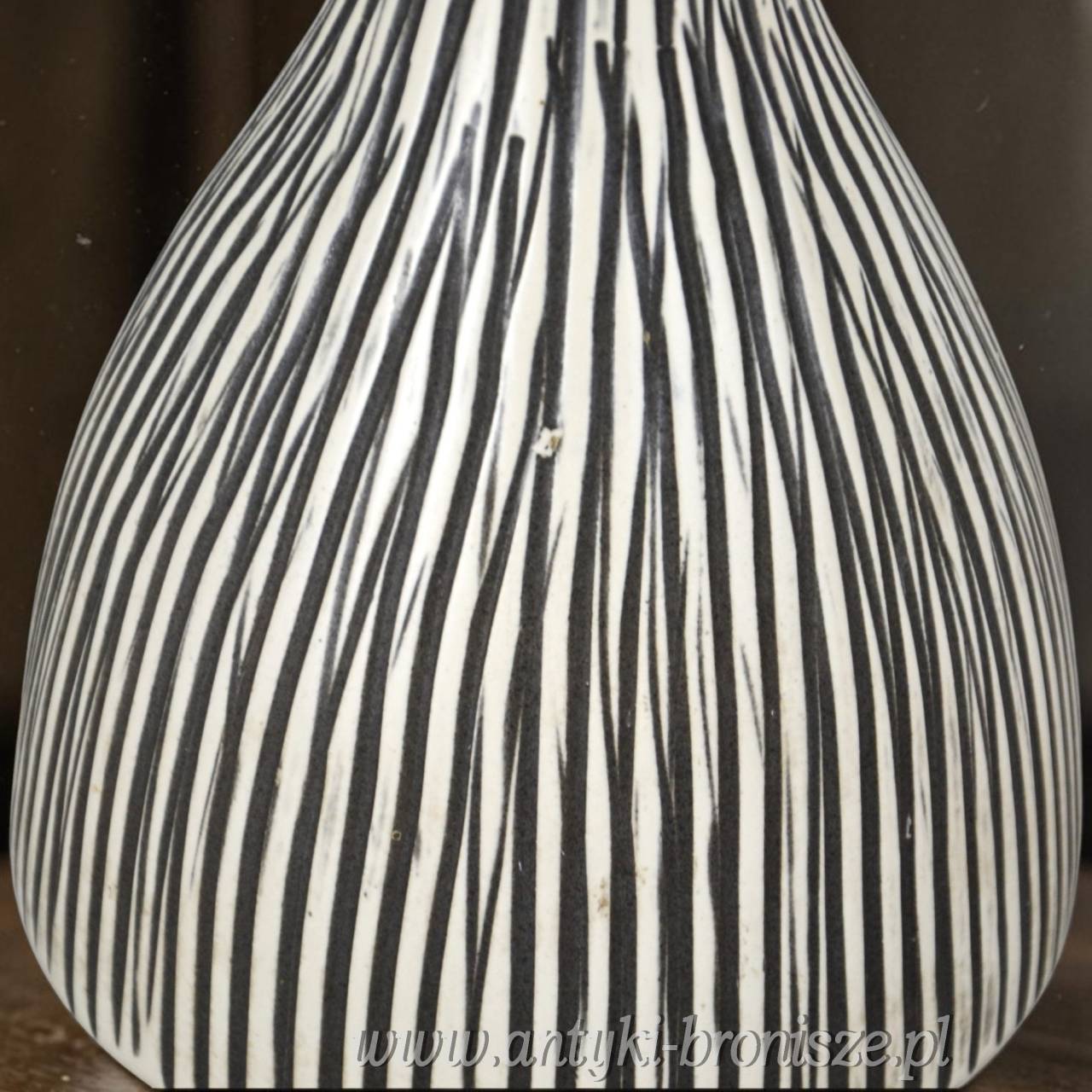 Modernistyczna wydłużona forma, pasiasty żłobiony wzór, kremowo szara kolorystyka.
