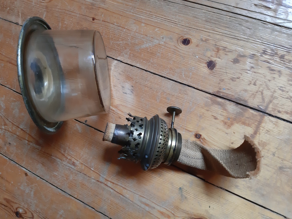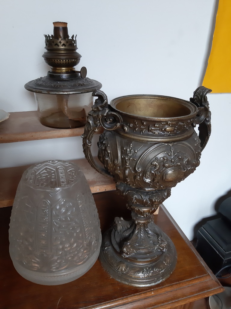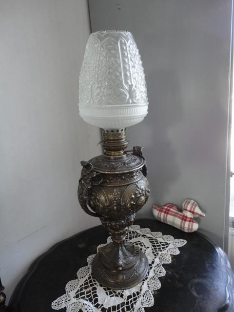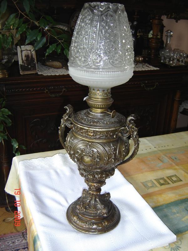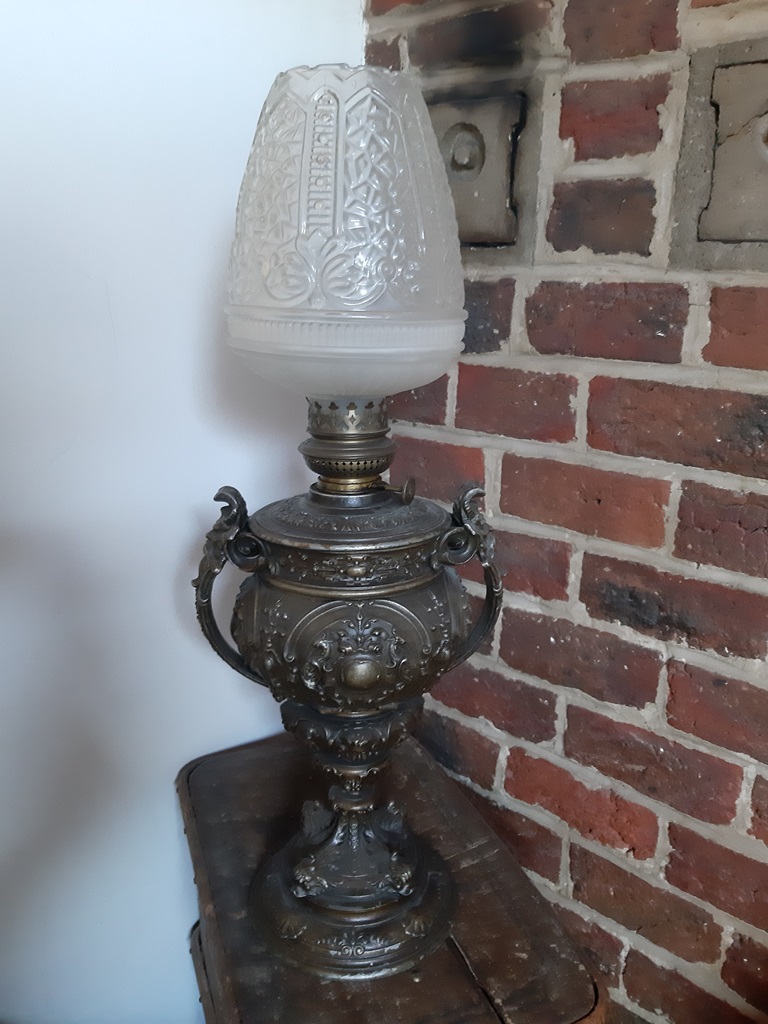 Lampa naftowa z brazu, pieknie rzezbiona ze szklanym kloszem, knot OK - H: 62 cm