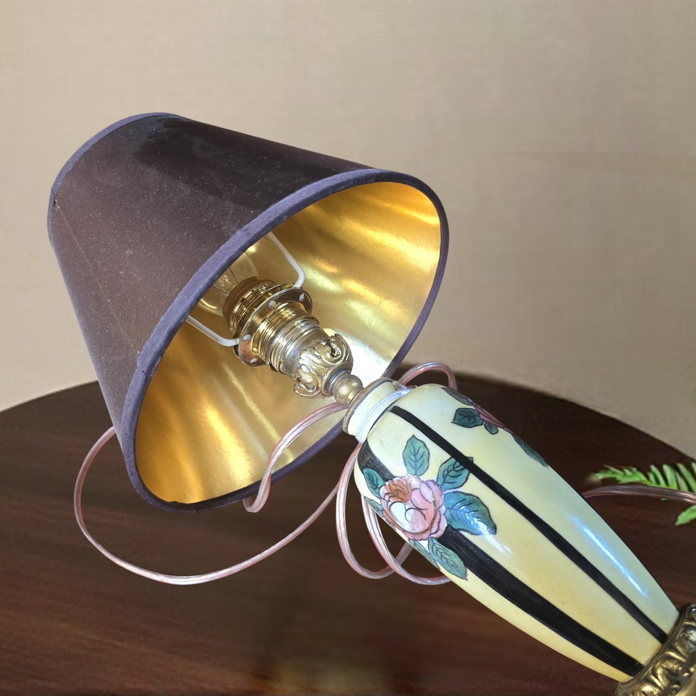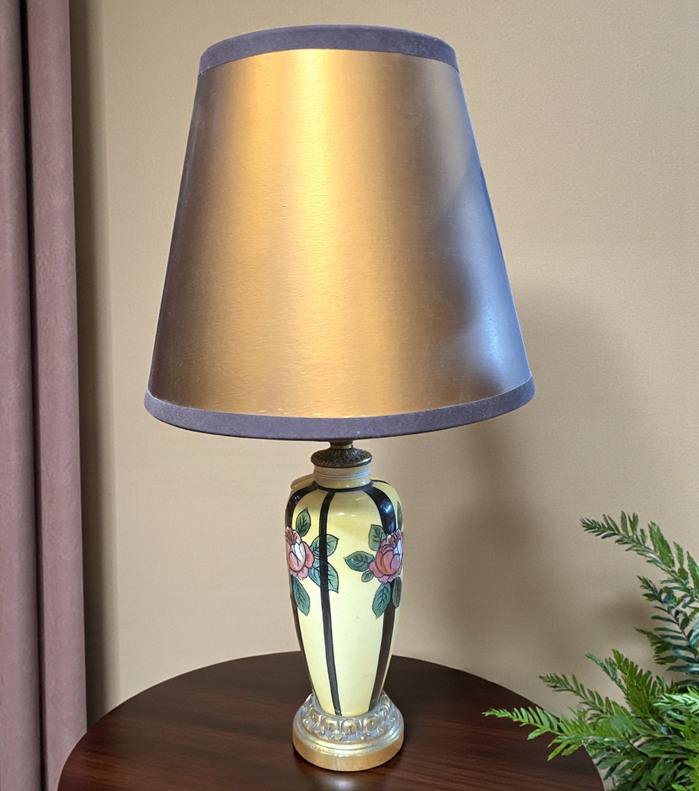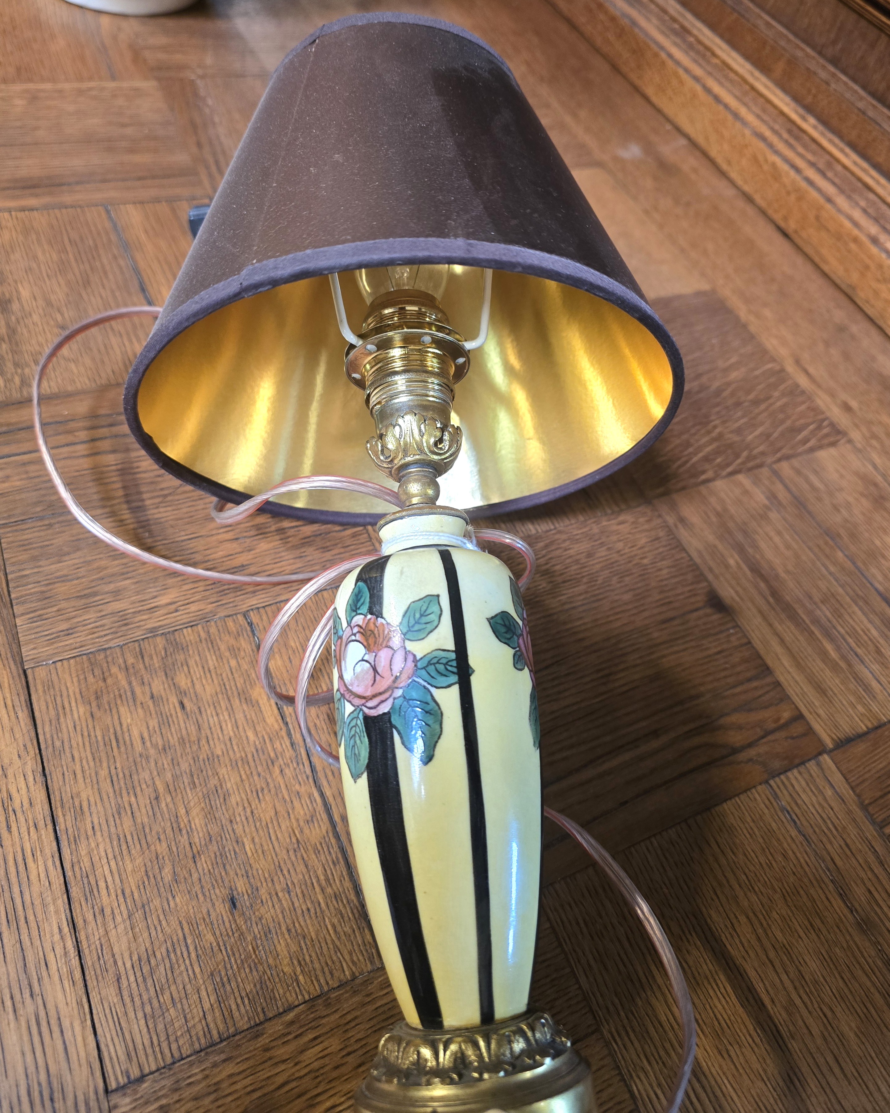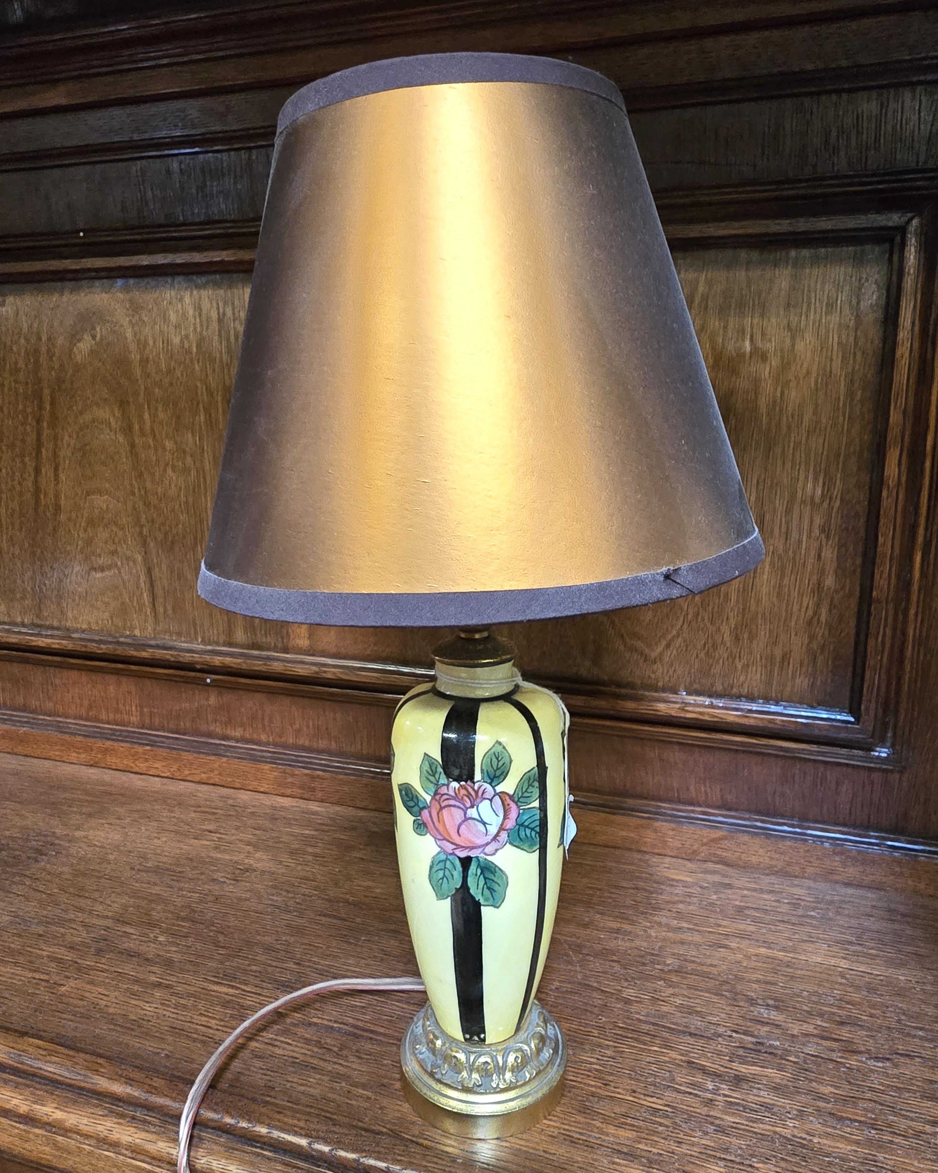 Lampka nocna inspirowana wzornictwem Art Deco, wyrób z lat 20/30 belgijskiej wytwórni Boch Frères Keramis z La Louvièr. Projektant przypuszczalnie Charles Catteau. Wykonana z ceramiki w kremowo/żółtym kolorze pokrytej czarnymi geometrycznymi detalami i różowym motywem kwiatowym. Abażur stożkowy, z zewnątrz kolor złoty brąz , wewnątrz złoty, podstawka z brązu.
