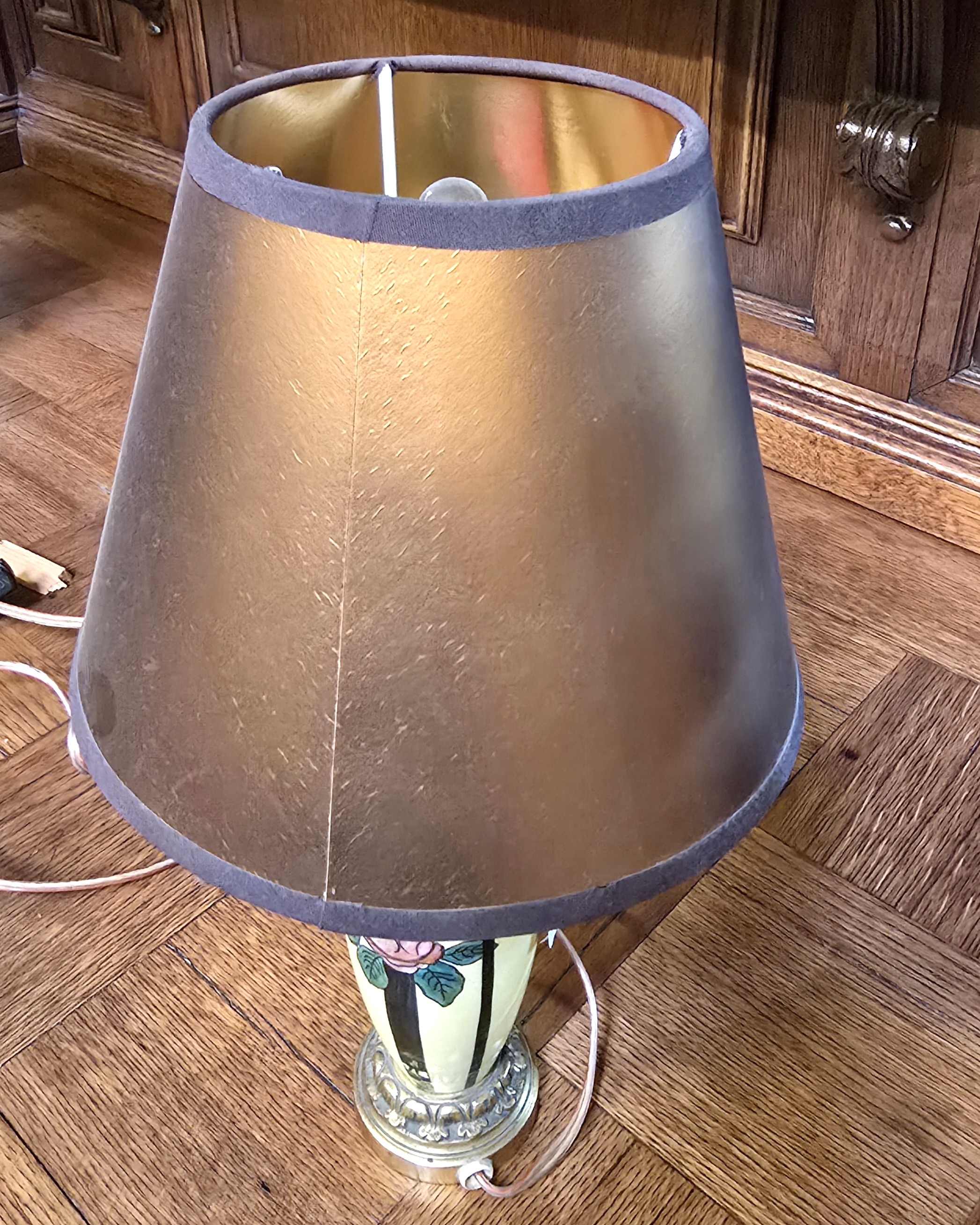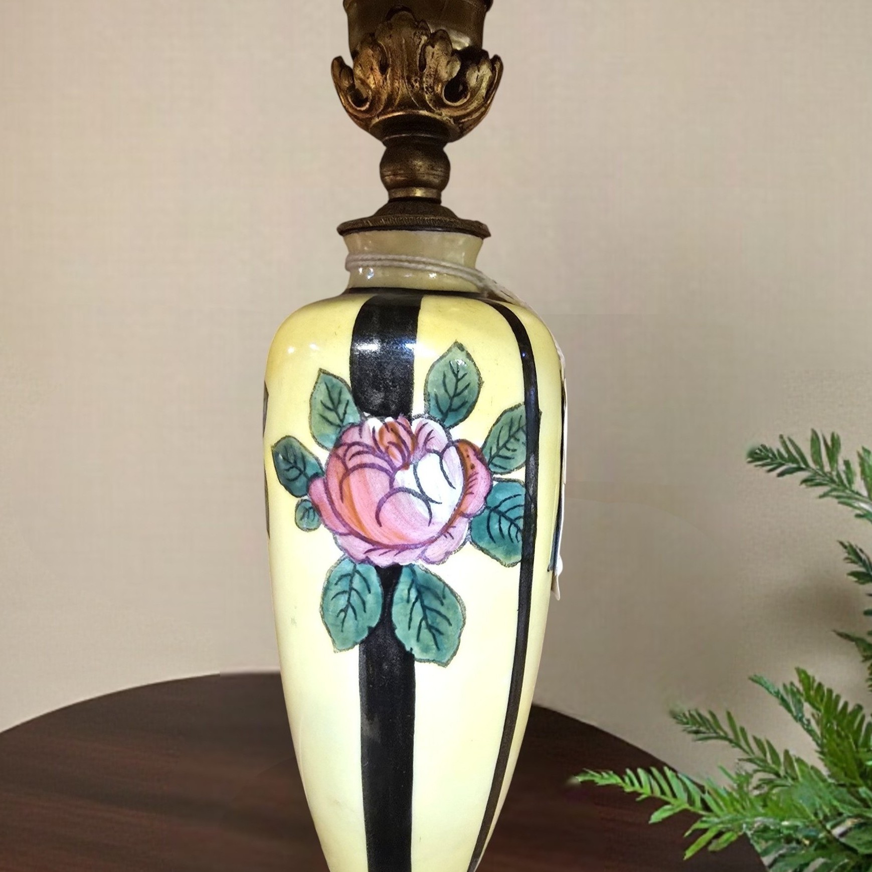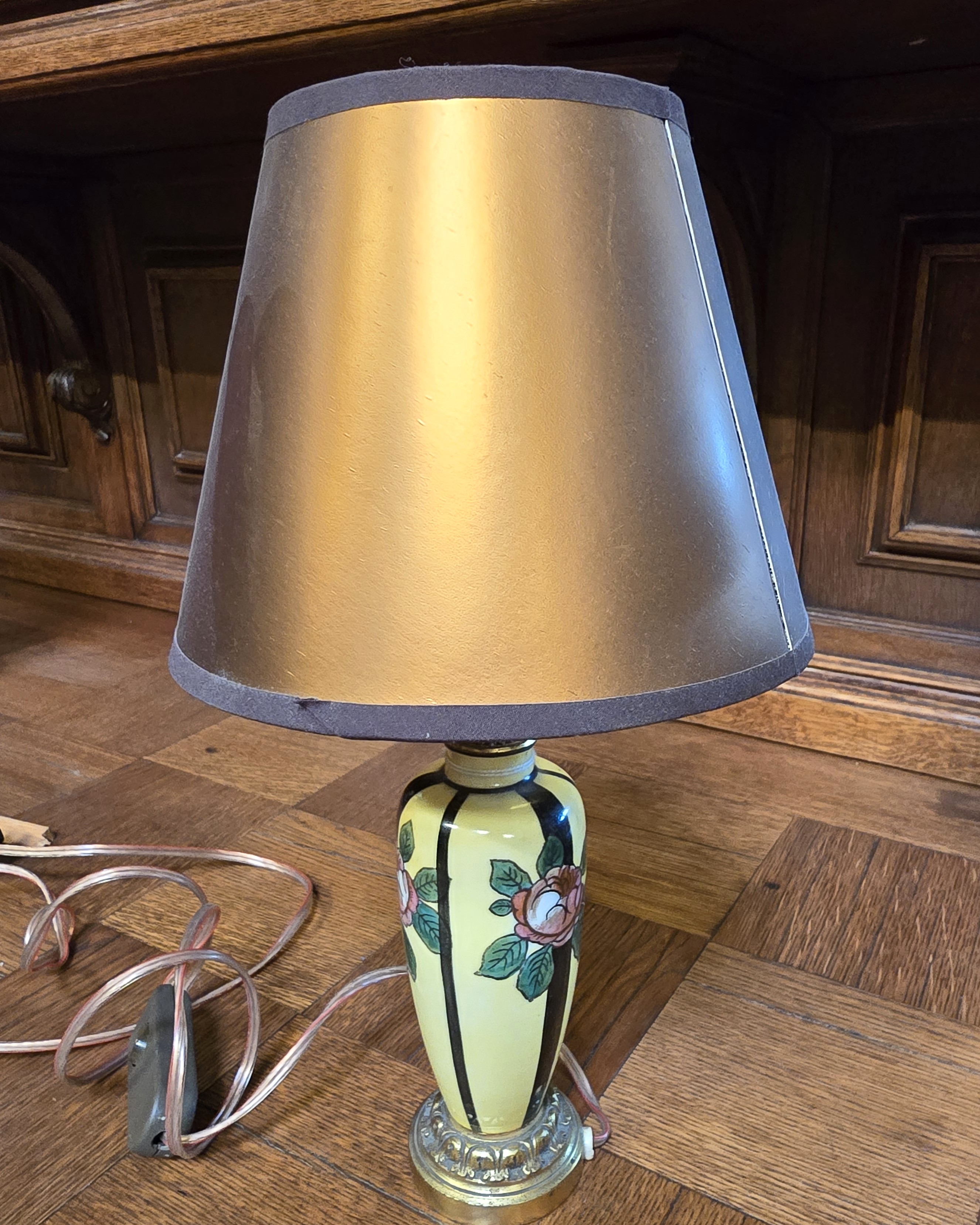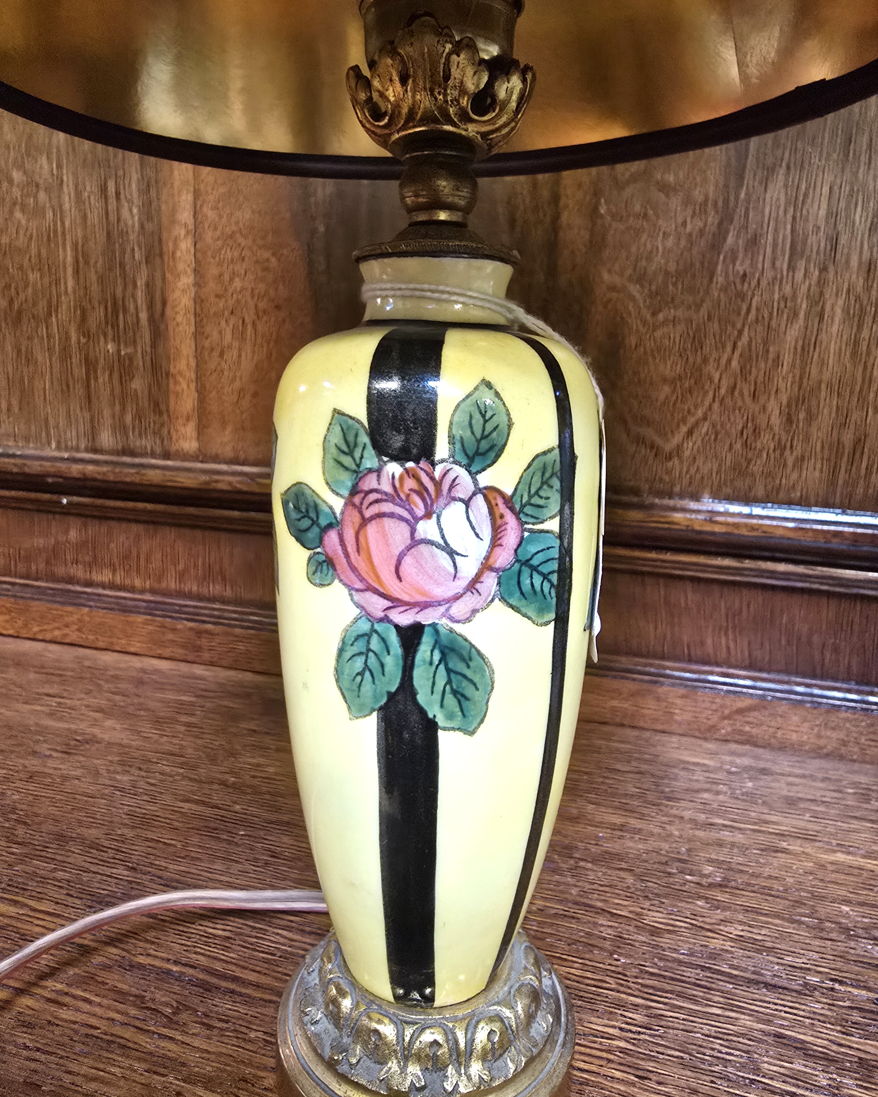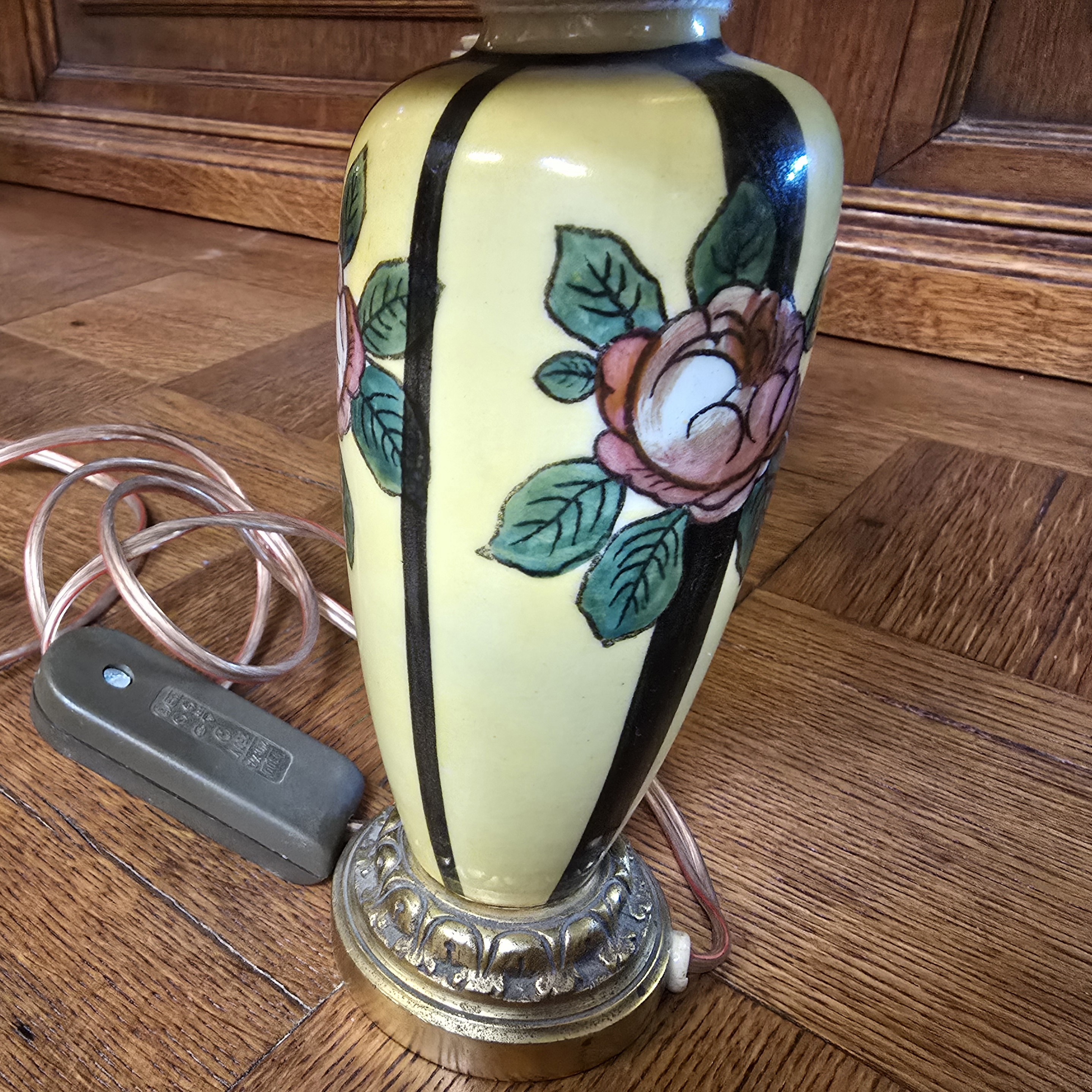Lampka nocna inspirowana wzornictwem Art Deco, wyrób z lat 20/30 belgijskiej wytwórni Boch Frères Keramis z La Louvièr. Projektant przypuszczalnie Charles Catteau. Wykonana z ceramiki w kremowo/żółtym kolorze pokrytej czarnymi geometrycznymi detalami i różowym motywem kwiatowym. Abażur stożkowy, z zewnątrz kolor złoty brąz , wewnątrz złoty, podstawka z brązu.