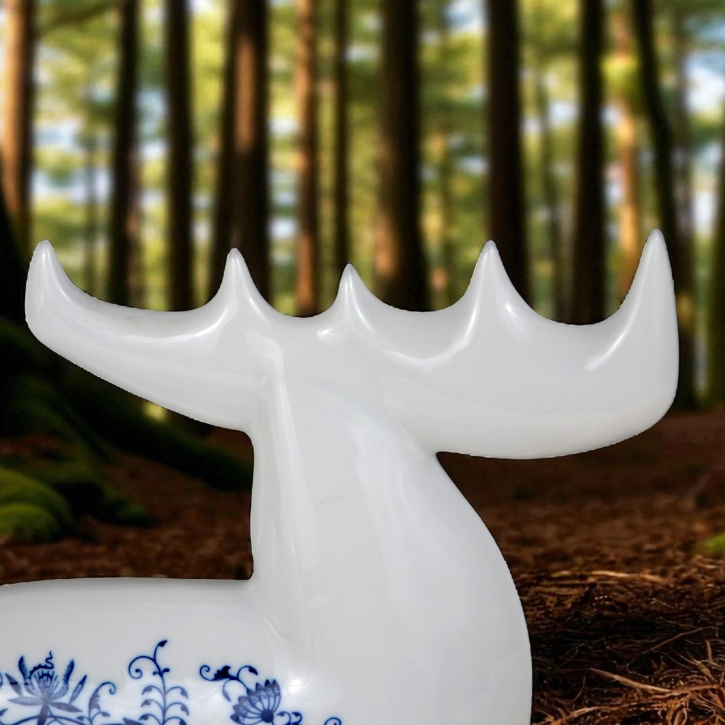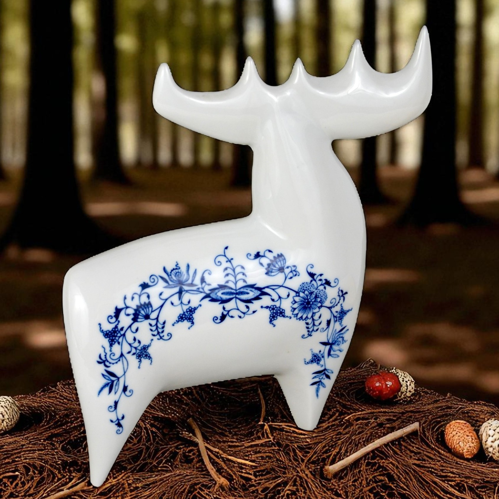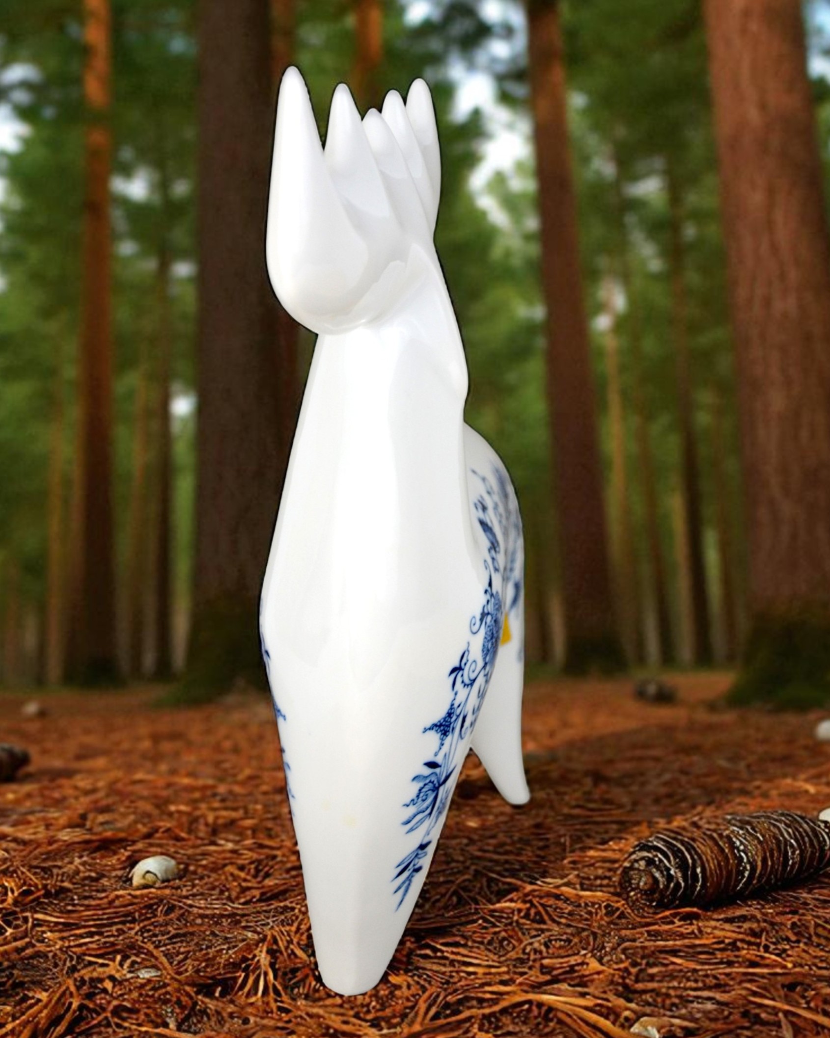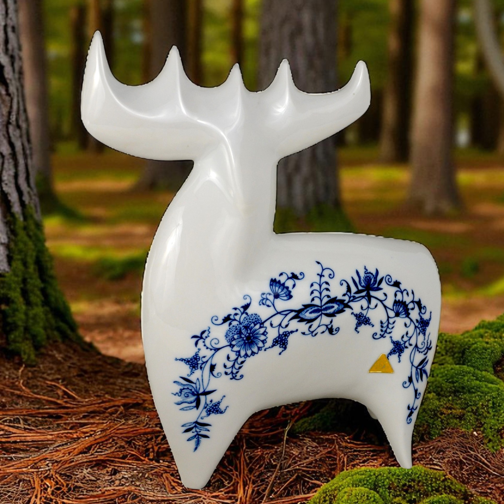 Łoś z kolekcji figurek w stylu brukselskim, zaprojektowany w latach 60 przez Vladimira Davida. Bardzo ładna, modernistyczna forma o charakterystycznych obłych kształtach. Gładka biała malatura ozdobiona kobaltowym wzorem cebulowym. Egzemplarz w dużym rozmiarze wys.26cm szer.23 cm gł.8cm. Stan bardzo ładny, minimalne ślady użytkowania Oryginalna, gustowna figurka, porcelana wysokiej jakości, słynnego projektanta renomowana wytwórnia. Praktycznie nie do zdobycia. Designerów, kolekcjonerów i znawców tematu zachęcam do zakupu.