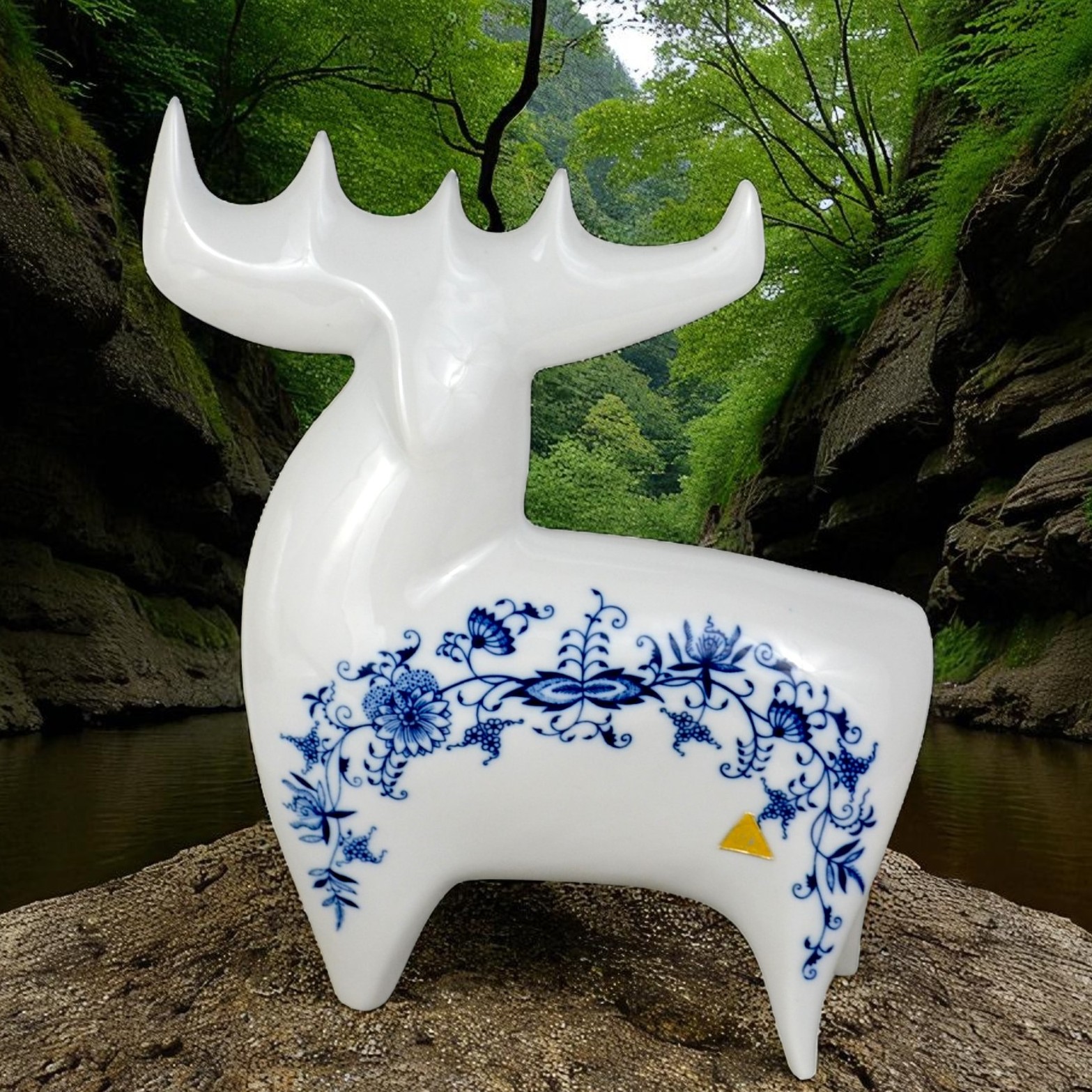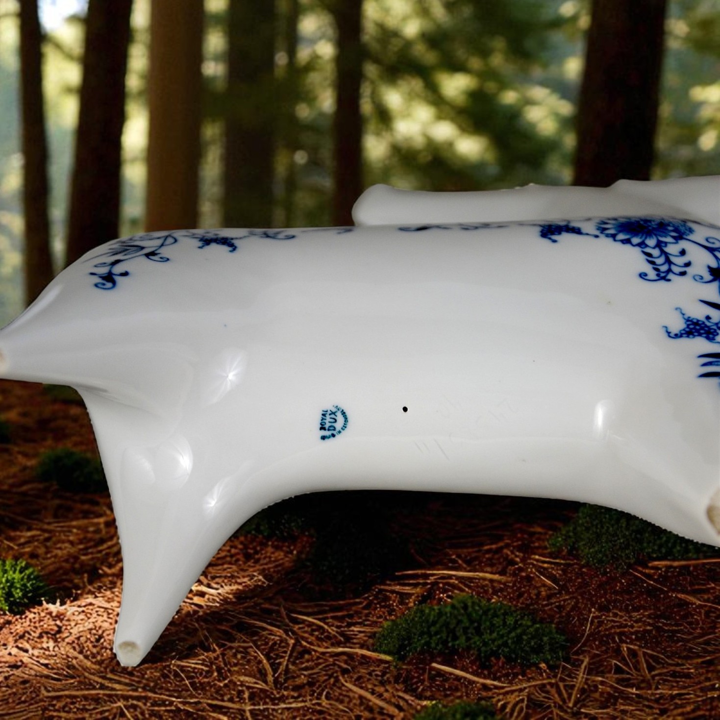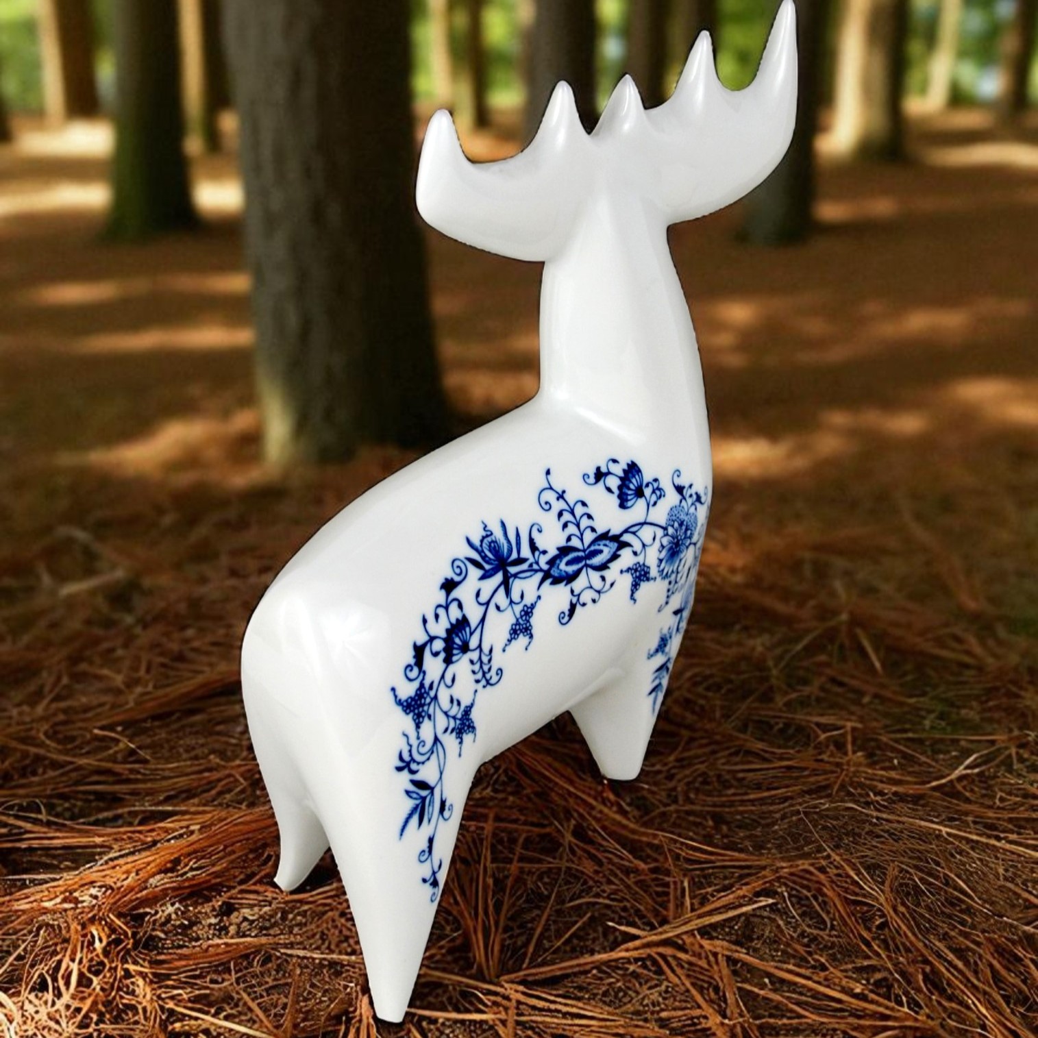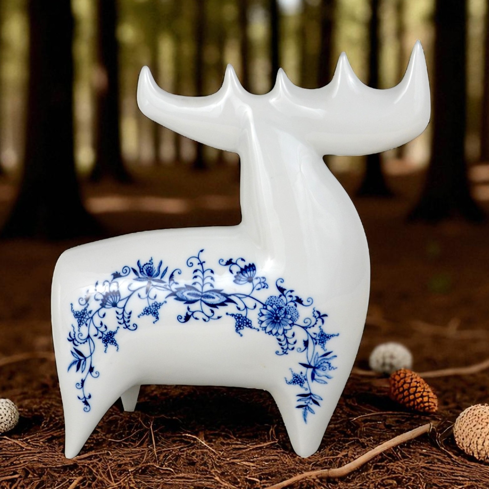 Łoś z kolekcji figurek w stylu brukselskim, zaprojektowany w latach 60 przez Vladimira Davida. Bardzo ładna, modernistyczna forma o charakterystycznych obłych kształtach. Gładka biała malatura ozdobiona kobaltowym wzorem cebulowym. Egzemplarz w dużym rozmiarze wys.26cm szer.23 cm gł.8cm. Stan bardzo ładny, minimalne ślady użytkowania Oryginalna, gustowna figurka, porcelana wysokiej jakości, słynnego projektanta renomowana wytwórnia. Praktycznie nie do zdobycia. Designerów, kolekcjonerów i znawców tematu zachęcam do zakupu.