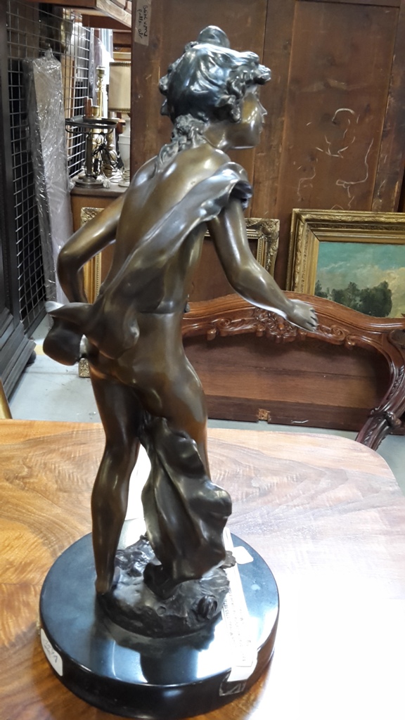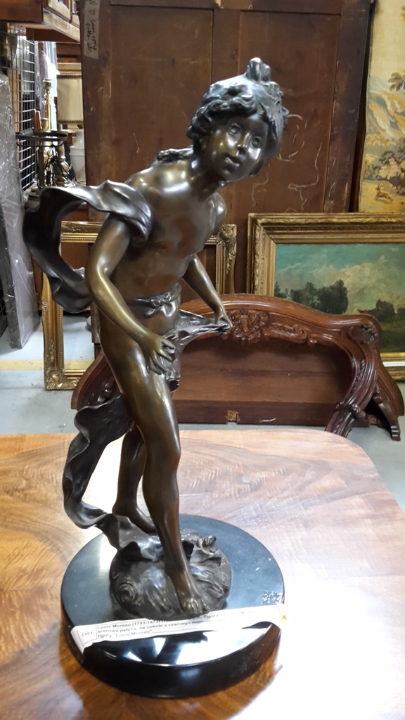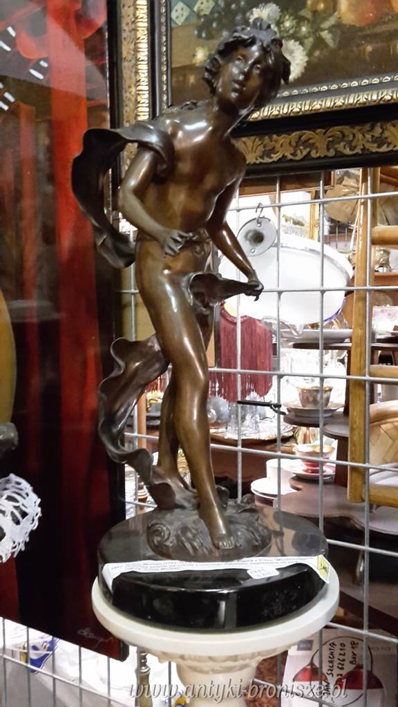 1891 - Louis Moreau (1793-1873) rzeźbiarz z Dijon- Figura z brązu "Młodzieniec" z brązowa patyna, na cokole z czarnego marmuru, sygnowana na podstawie figury "Louis Moreau". H:48 cm.