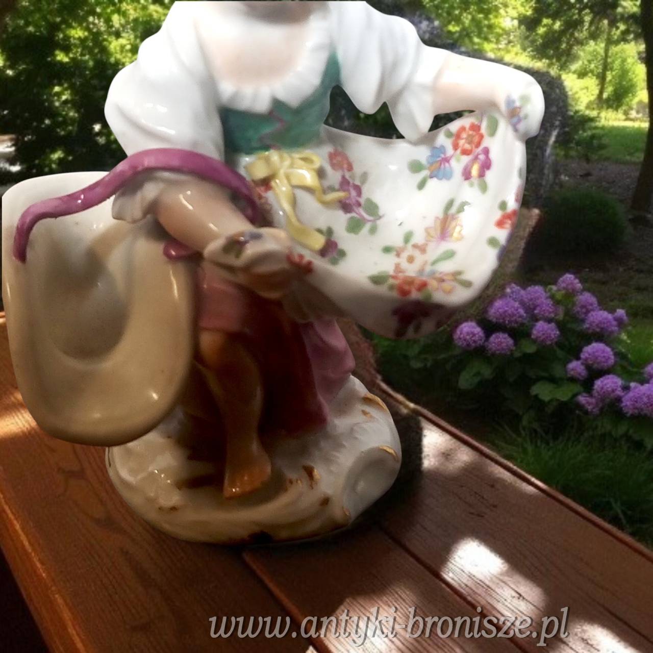 Kolorowa XVIII wieczna figurka fabryki porcelany Miśnia. Młoda kobieta ( ogrodniczka), o subtelnych rysach, w tradycyjnym stroju, przyklęka na kolano, kapelusz ma przewieszony przez ramię, w rękach trzyma rozłożony fartuch.