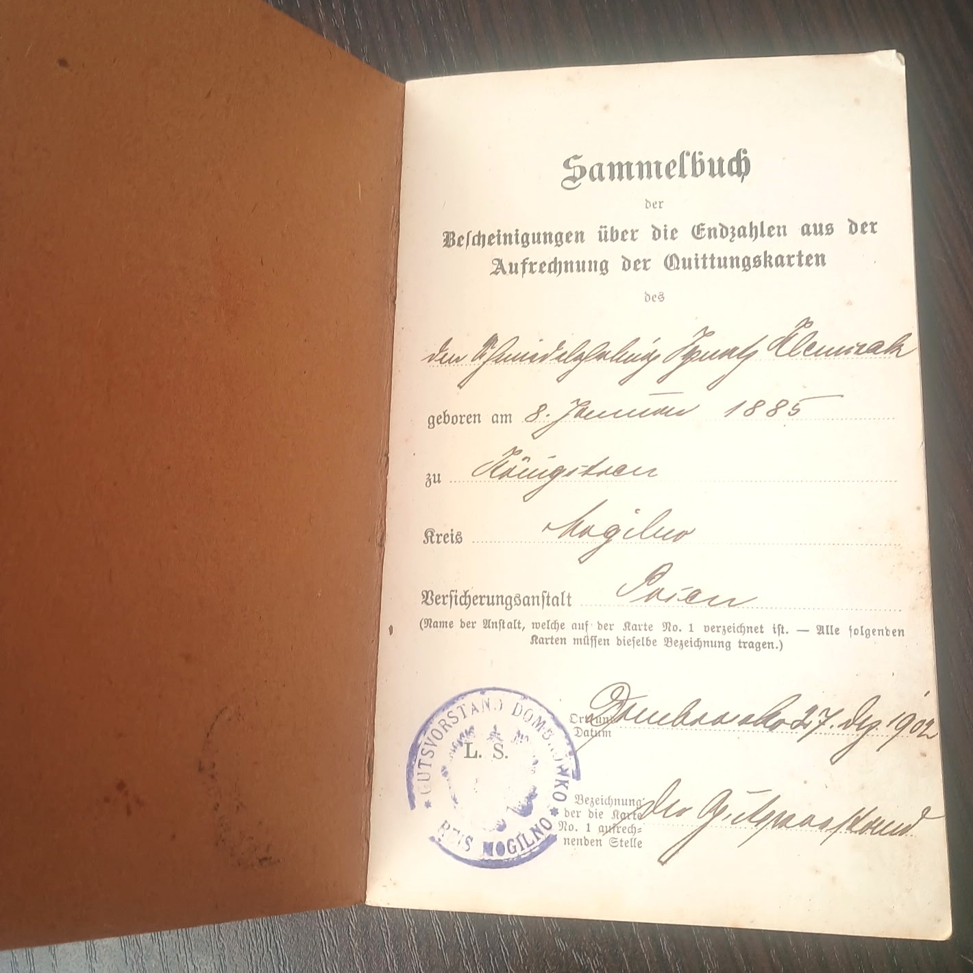 Wydana w 1912 roku przez Stempel wskazuje na "KORSTAND DOMOW DIS MOGILNO" (prawdopodobnie Powiatowy Zarząd Domów Mienia w Mogilnie), co sugeruje lokalną administrację odpowiedzialną za ubezpieczenia.