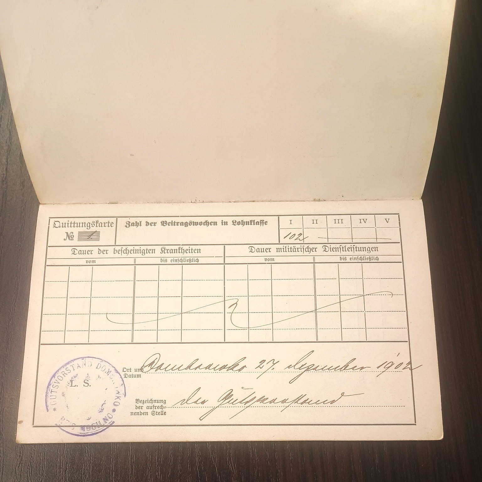 “System ubezpieczeń społecznych w Niemczech, zapoczątkowany przez Otto von Bismarcka, został wprowadzony w 1889 roku i obejmował ubezpieczenie na wypadek inwalidztwa i starości. Książeczki takie były wydawane ubezpieczonym, a wewnątrz znajdowały się miejsca na wpisy składek.