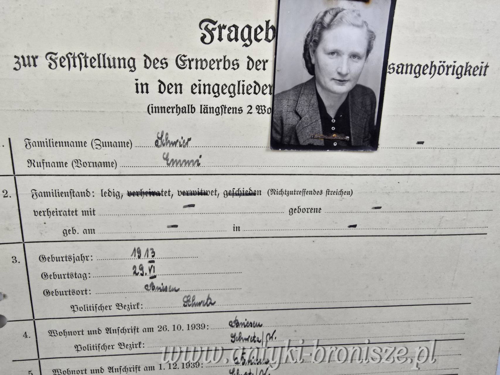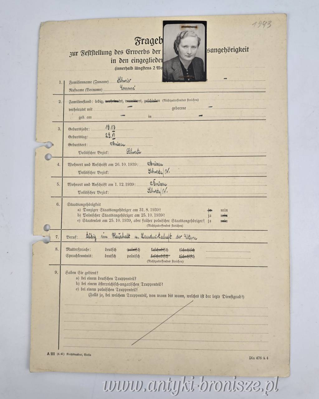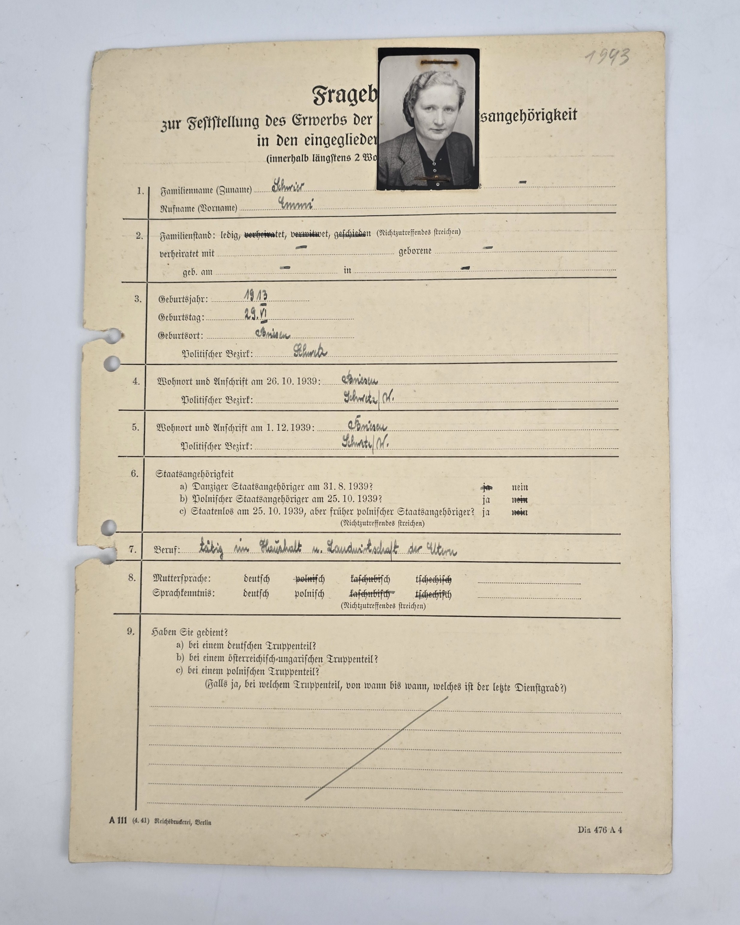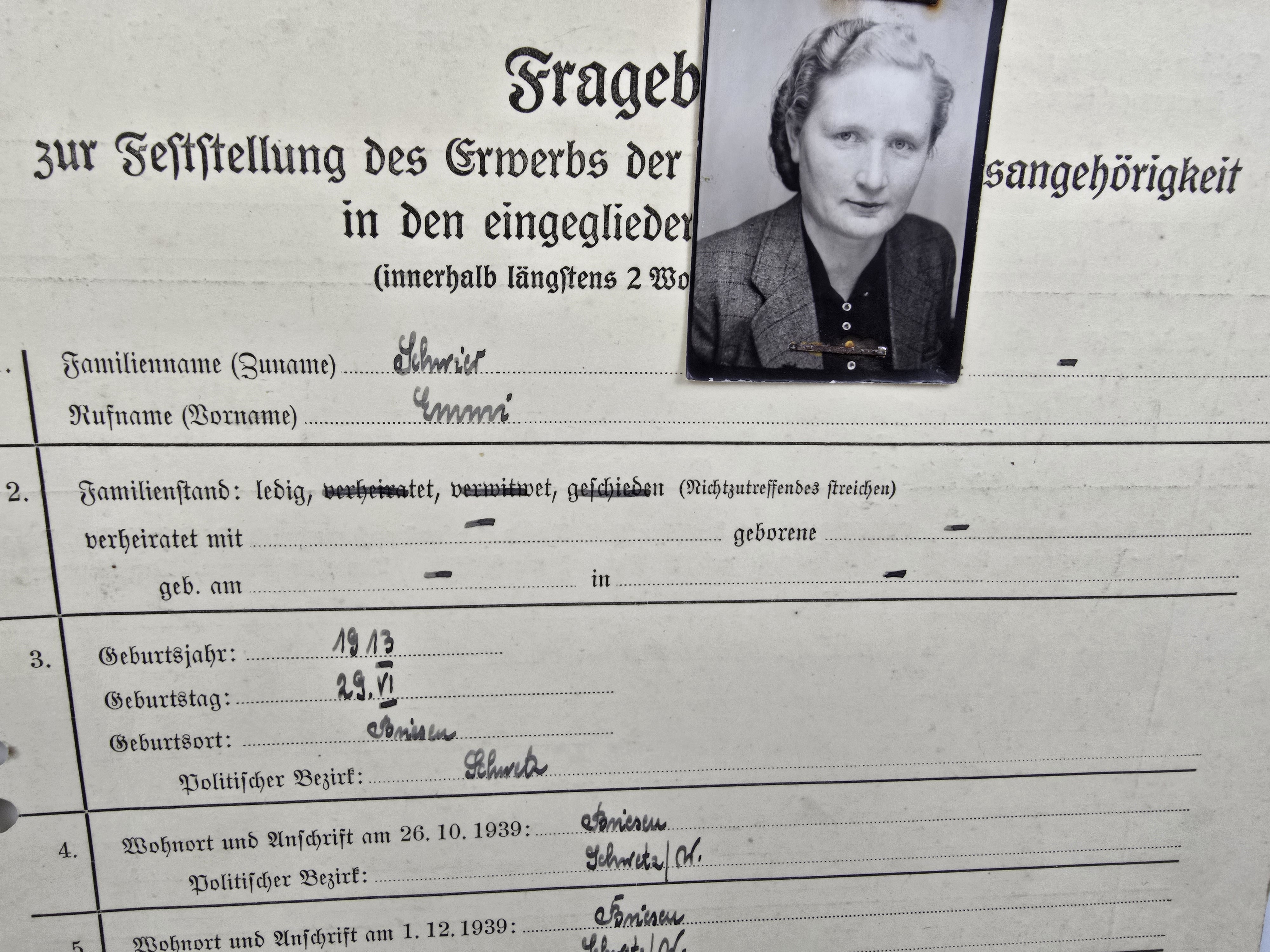 formularz z 1943 roku z fotografią, służył do gromadzenia danych o osobach ubiegających się o wpis na Deutsche Volksliste (Niemiecką Listę Narodową) na terenach okupowanych.