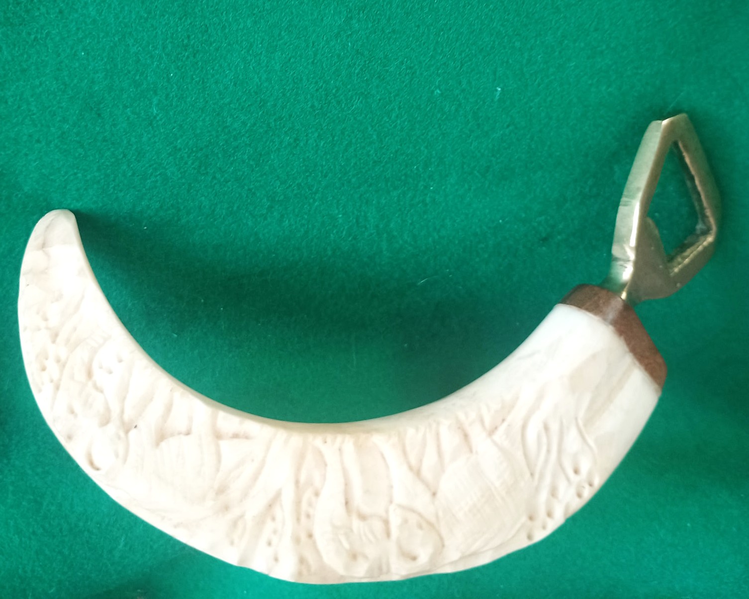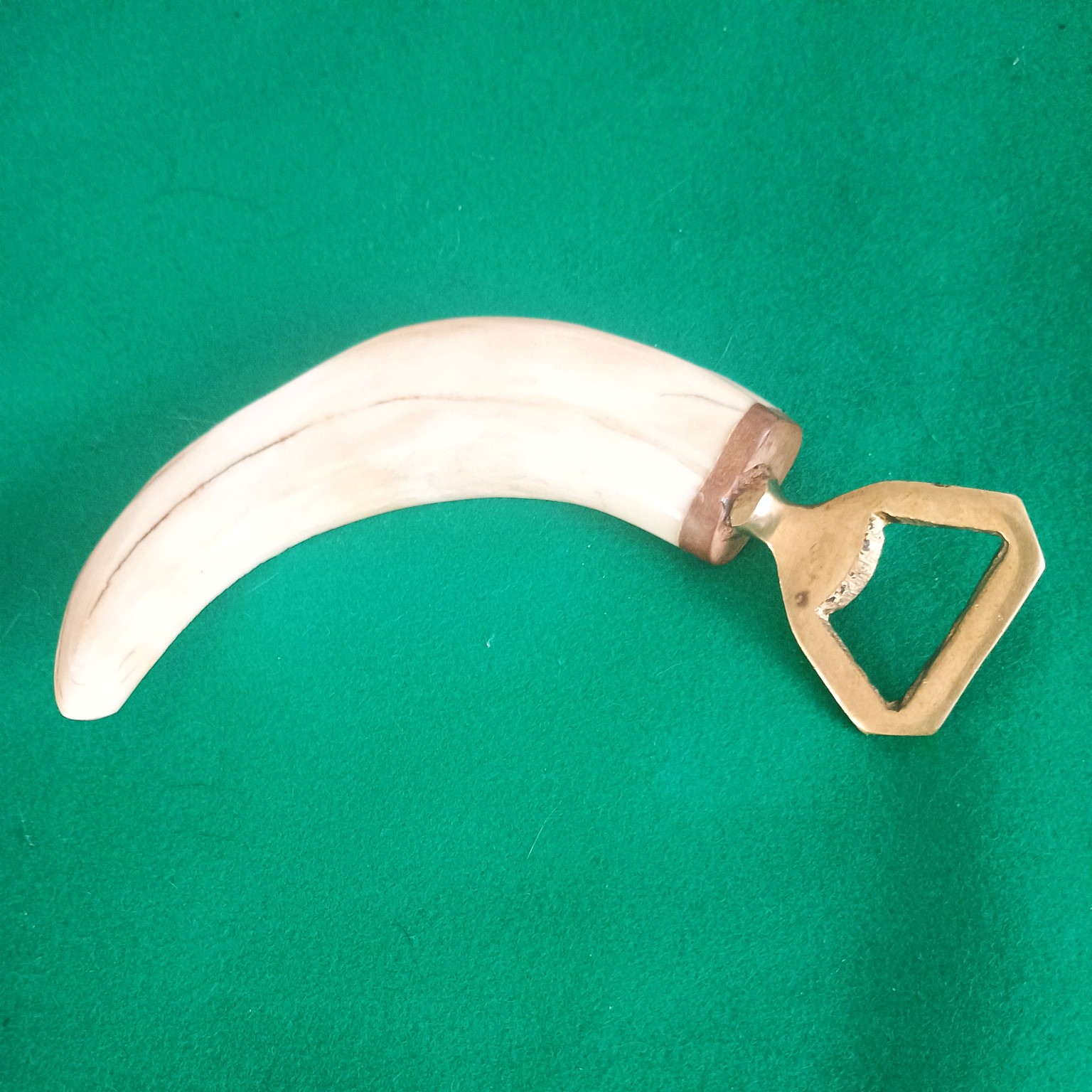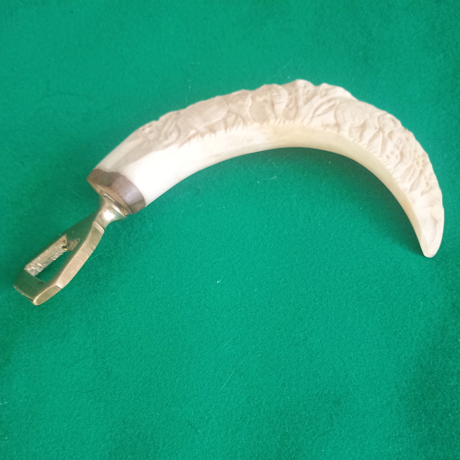 Interesujący zabytkowy otwieracz prawdopodobnie z Zimbabwe. Wykonany przez rzemieślnika z kła guźca . Z jednej strony ozdobiony rzeźbą z motywami słoni, otwieracz mosiężny. Dł. 14,5cm