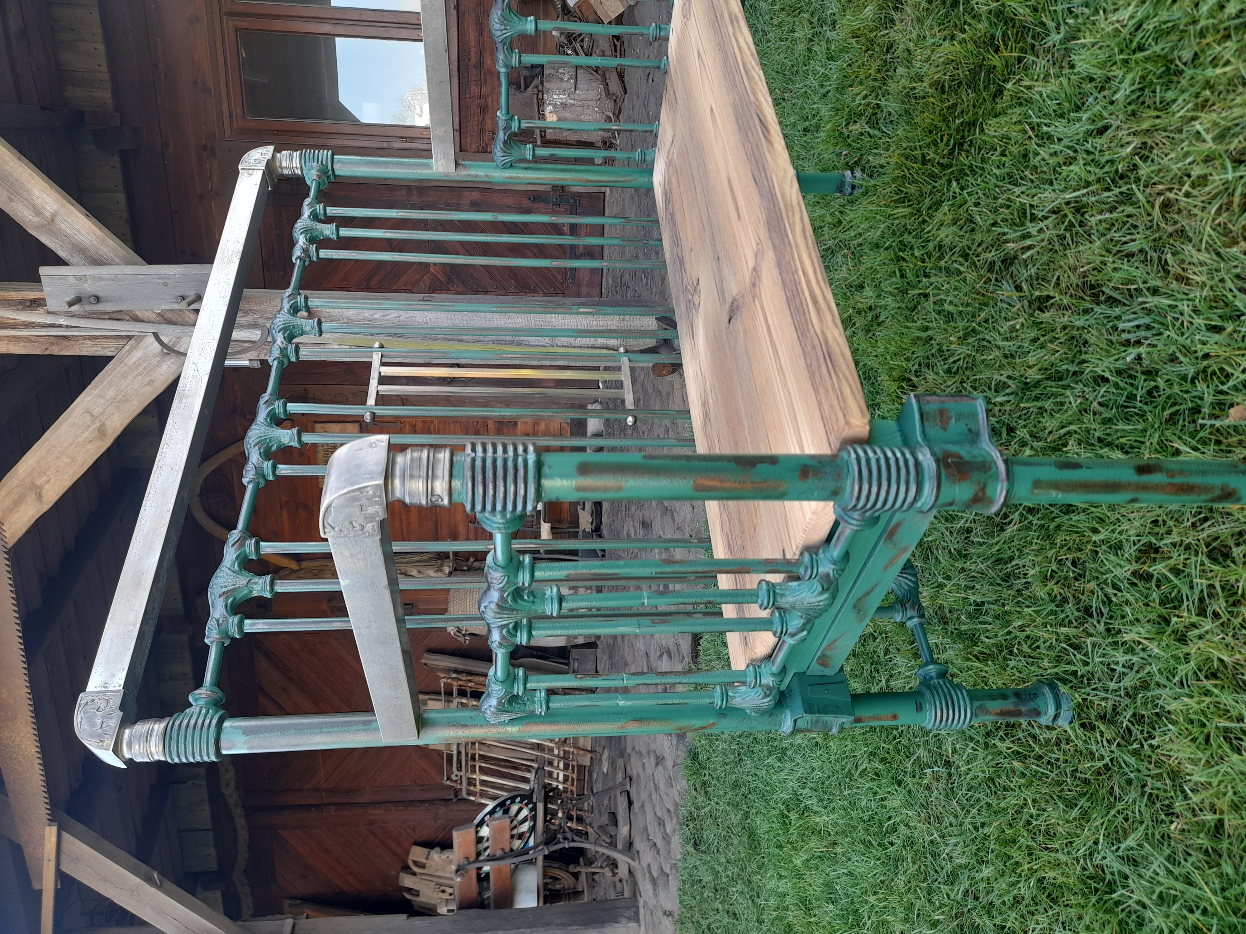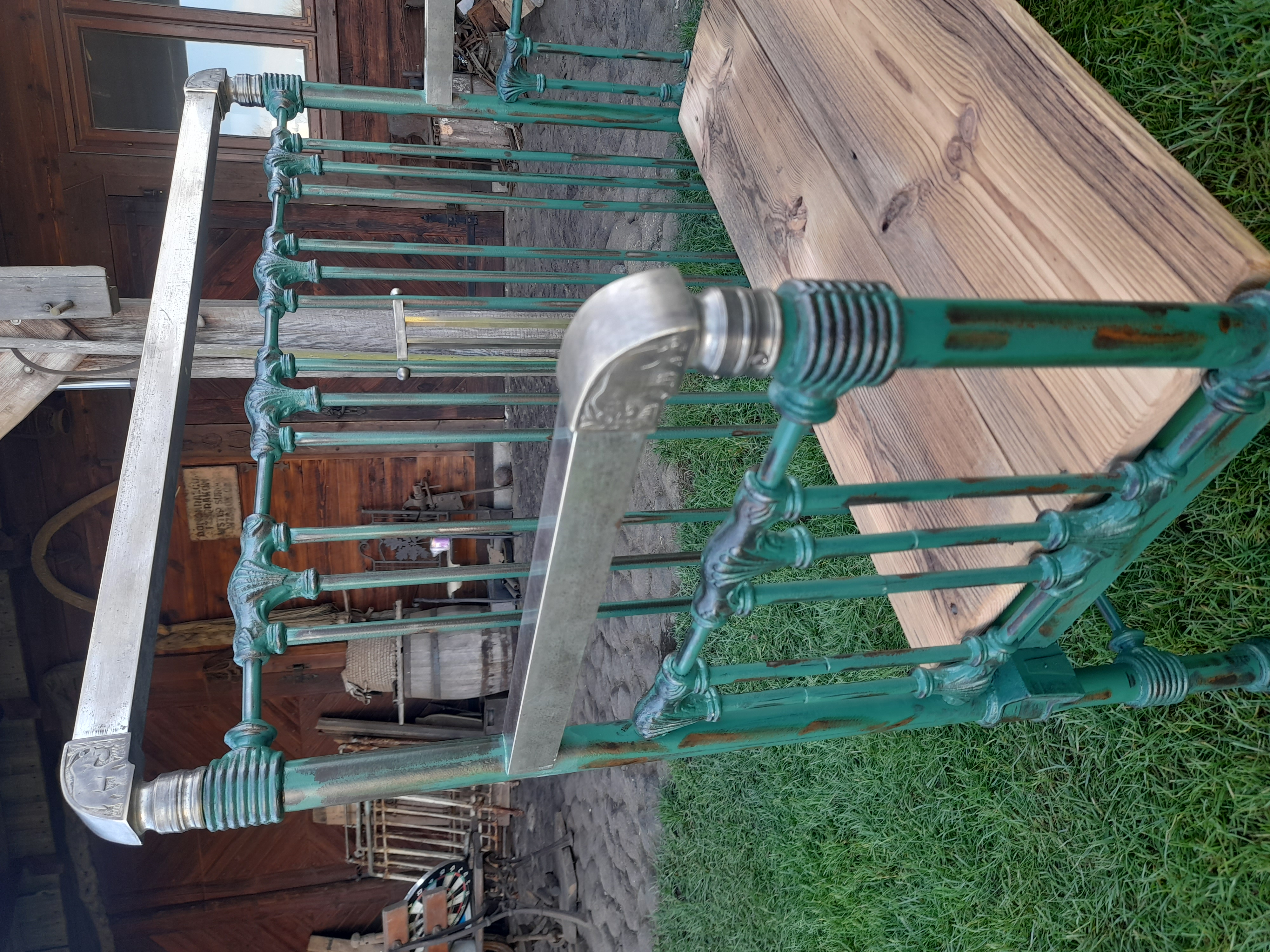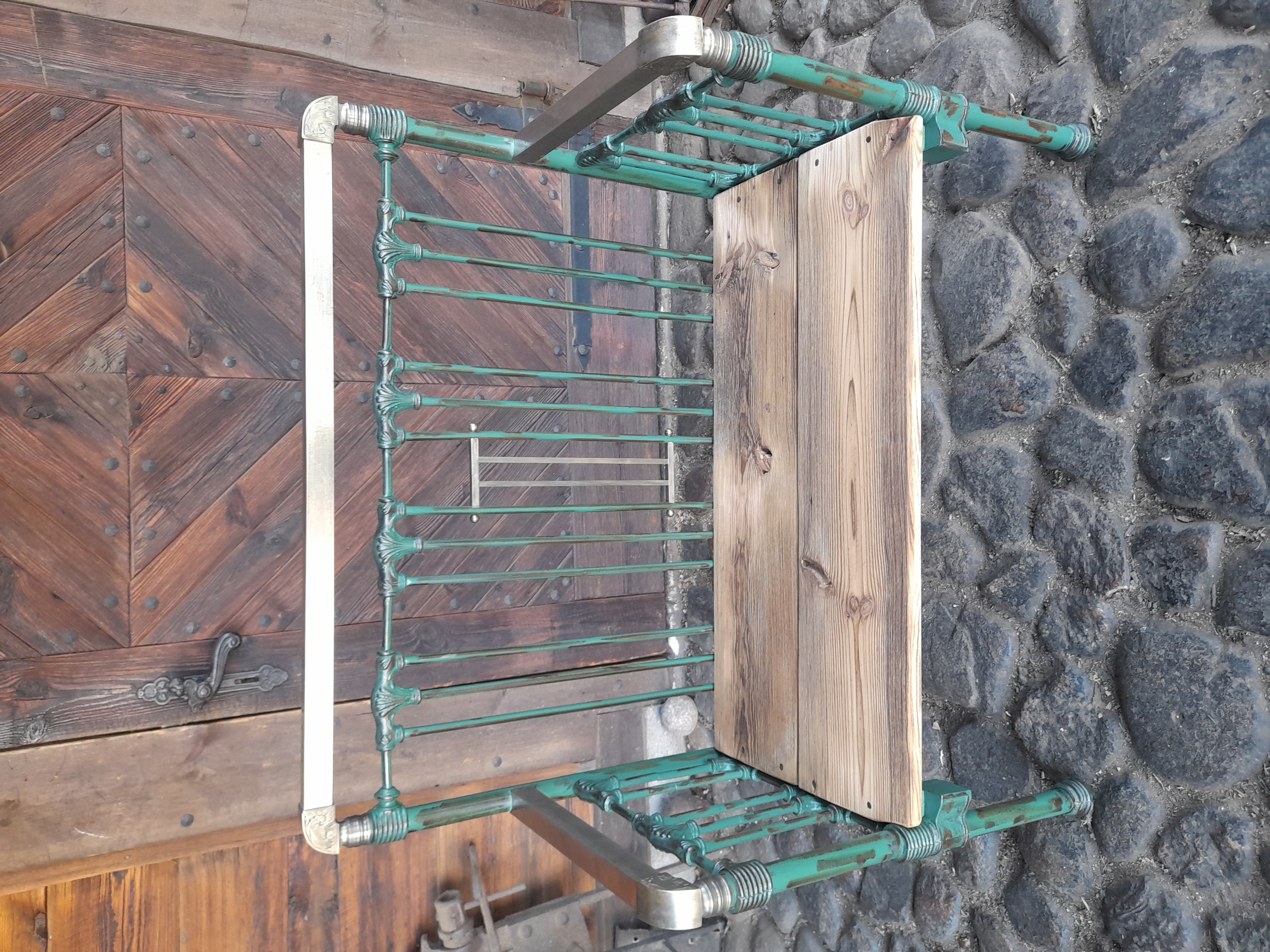 Urocza ławka w której elementy metalowe zostały oczyszczone z rdzy I w całości polakierowana lakierem bezbarwnym.