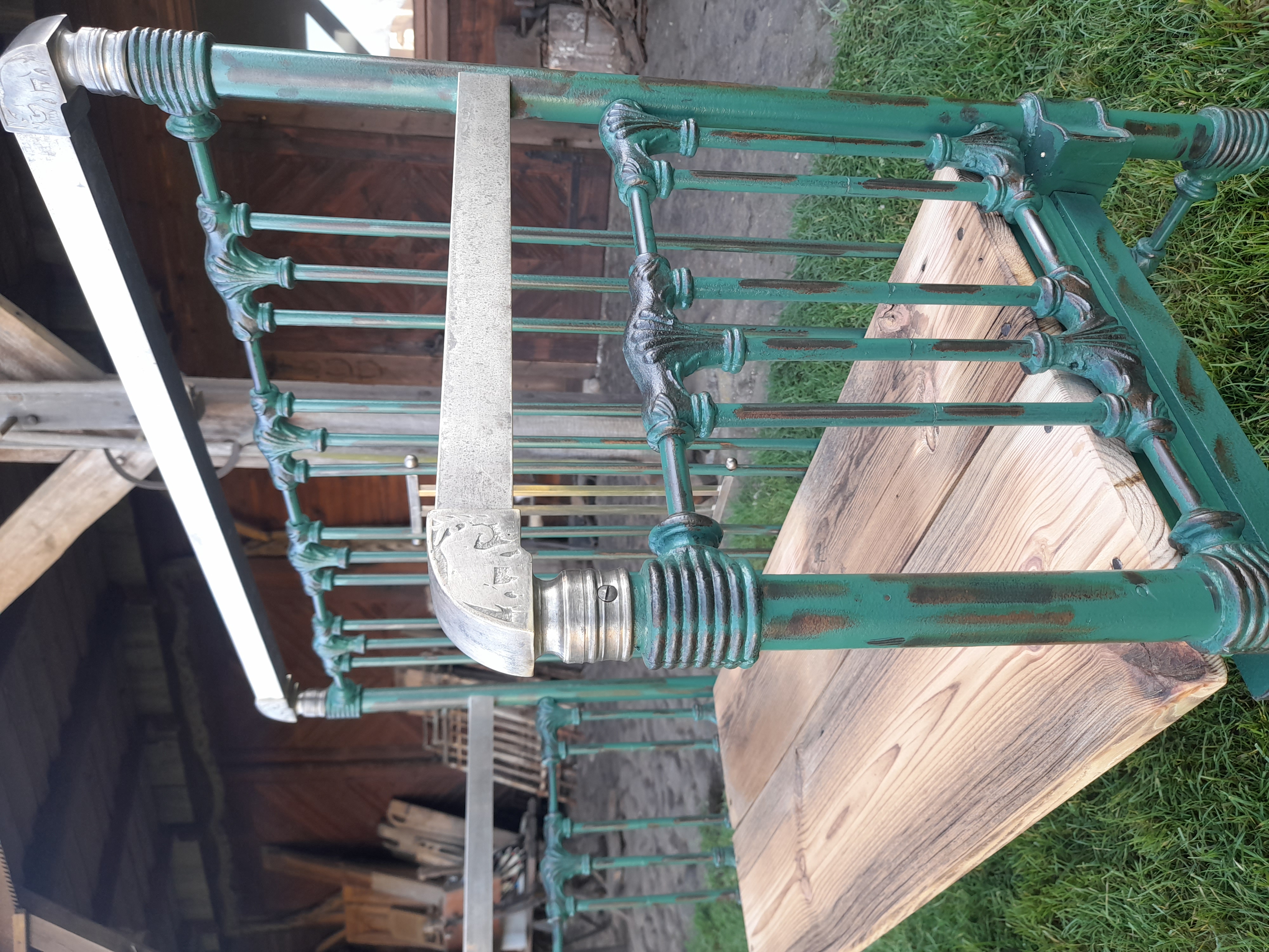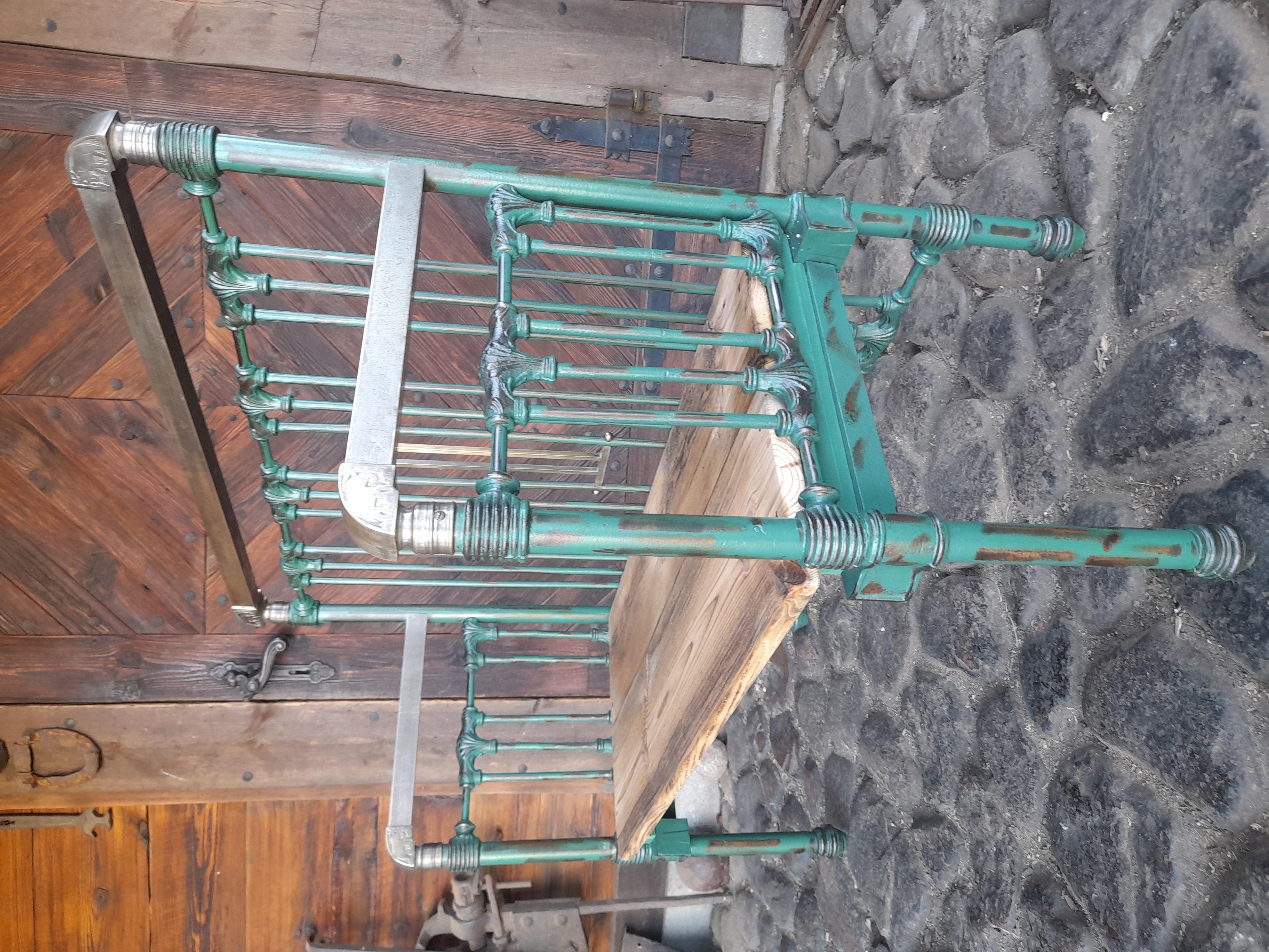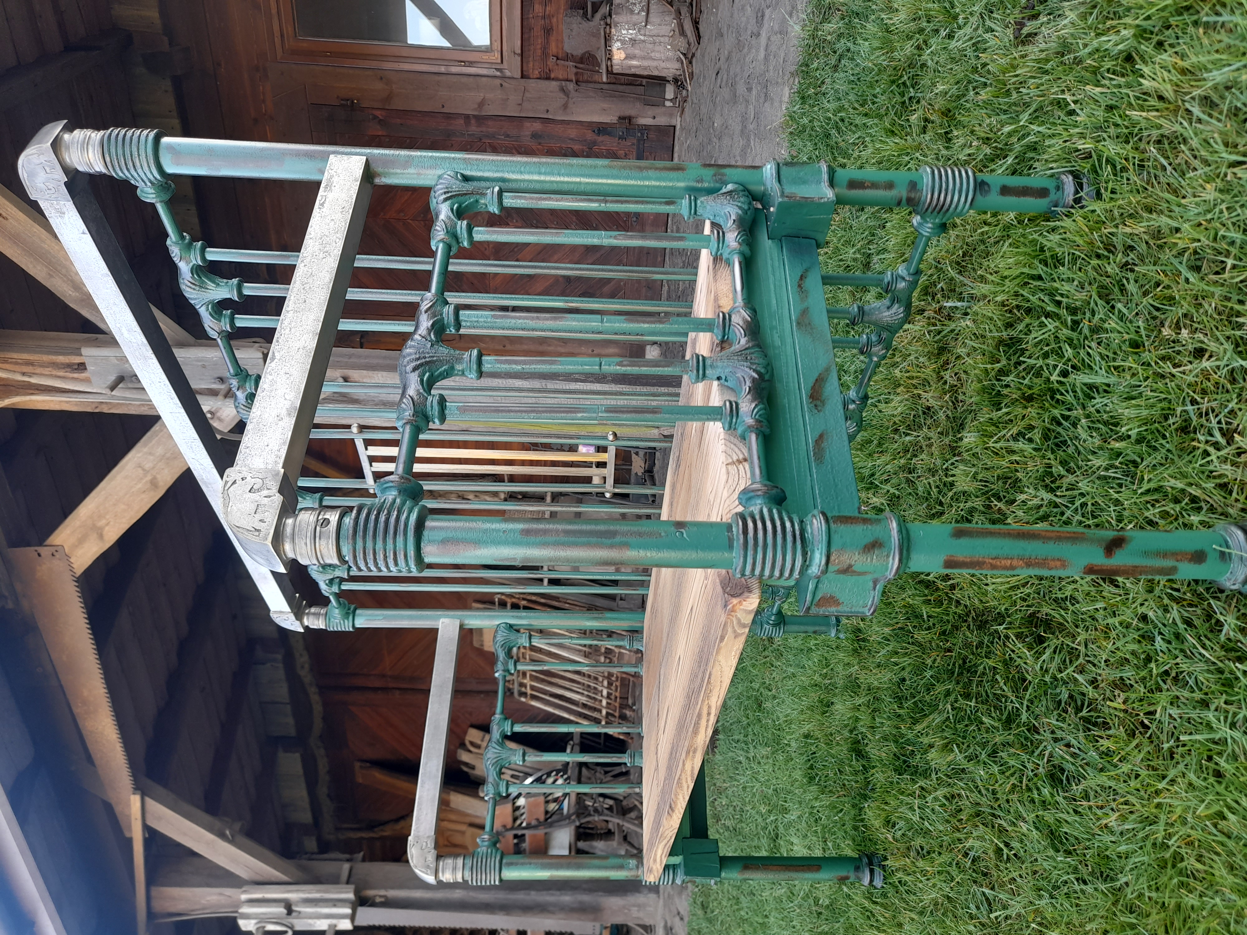 Urocza ławka w której elementy metalowe zostały oczyszczone z rdzy I w całości polakierowana lakierem bezbarwnym.